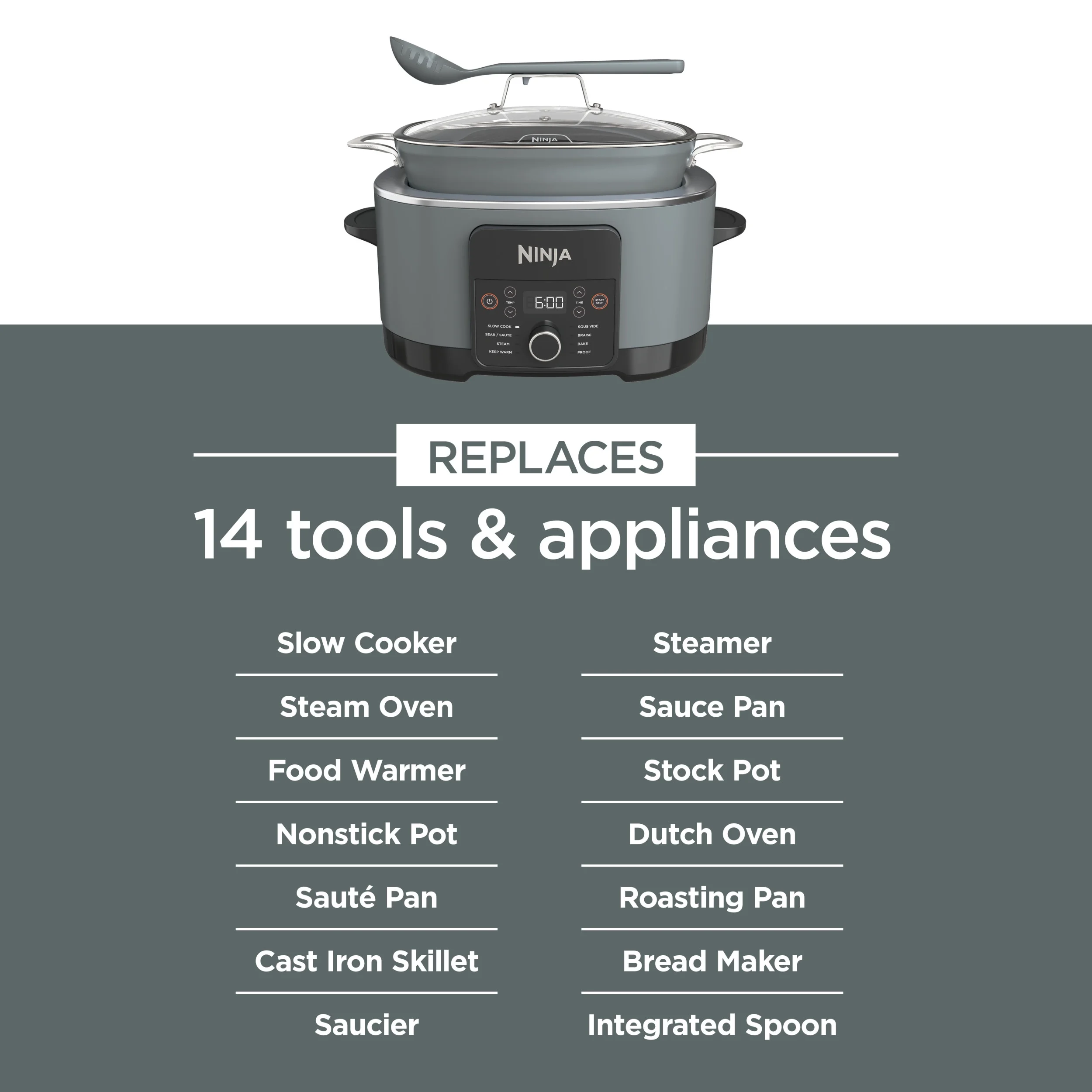 - REPLACES 14 COOKING TOOLS & APPLIANCES: This cooker replaces the need for a slow cooker, steam oven, food warmer, nonstick pot, saut�� pan, cast iron skillet, saucier, steamer, saucepan, stock pot, Dutch oven, roasting pan, bread maker, and utensil.