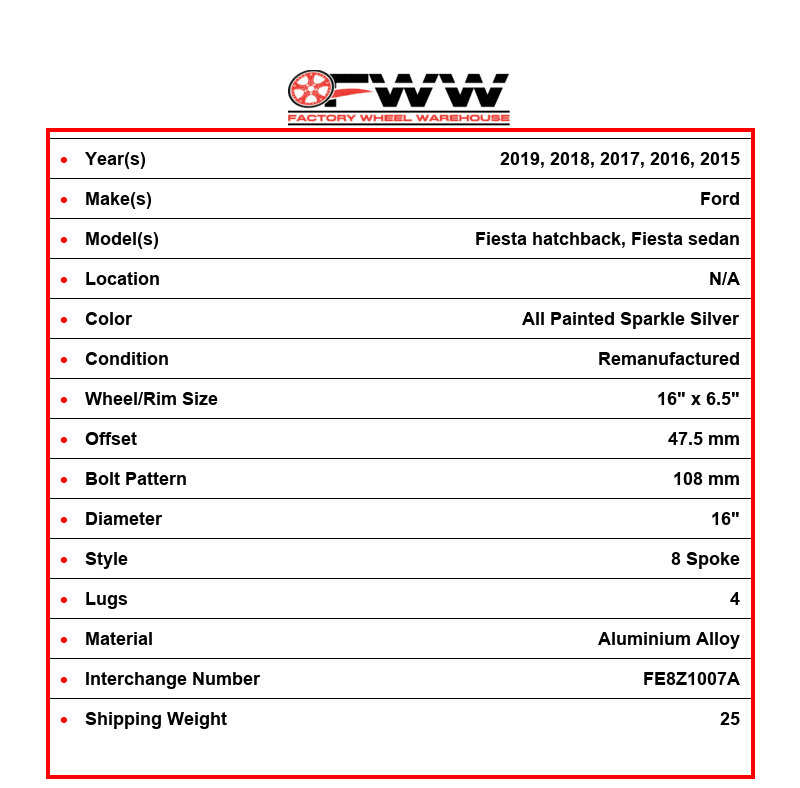 This Factory OEM FORD Aluminium Alloy 8 SPOKE wheel comes stock on 2019, 2018, 2017, 2016, 2015 FORD FIESTA SEDAN, FIESTA HATCHBACK. The OEM part number(s) for the rim are 560-10008, FE8Z1007A. This is a 4 lug wheel with a 16 inch diameter, width of 6.5 inch and an offset of 47.5 mm. The finish on the wheel is ALL PAINTED SPARKLE SILVER.