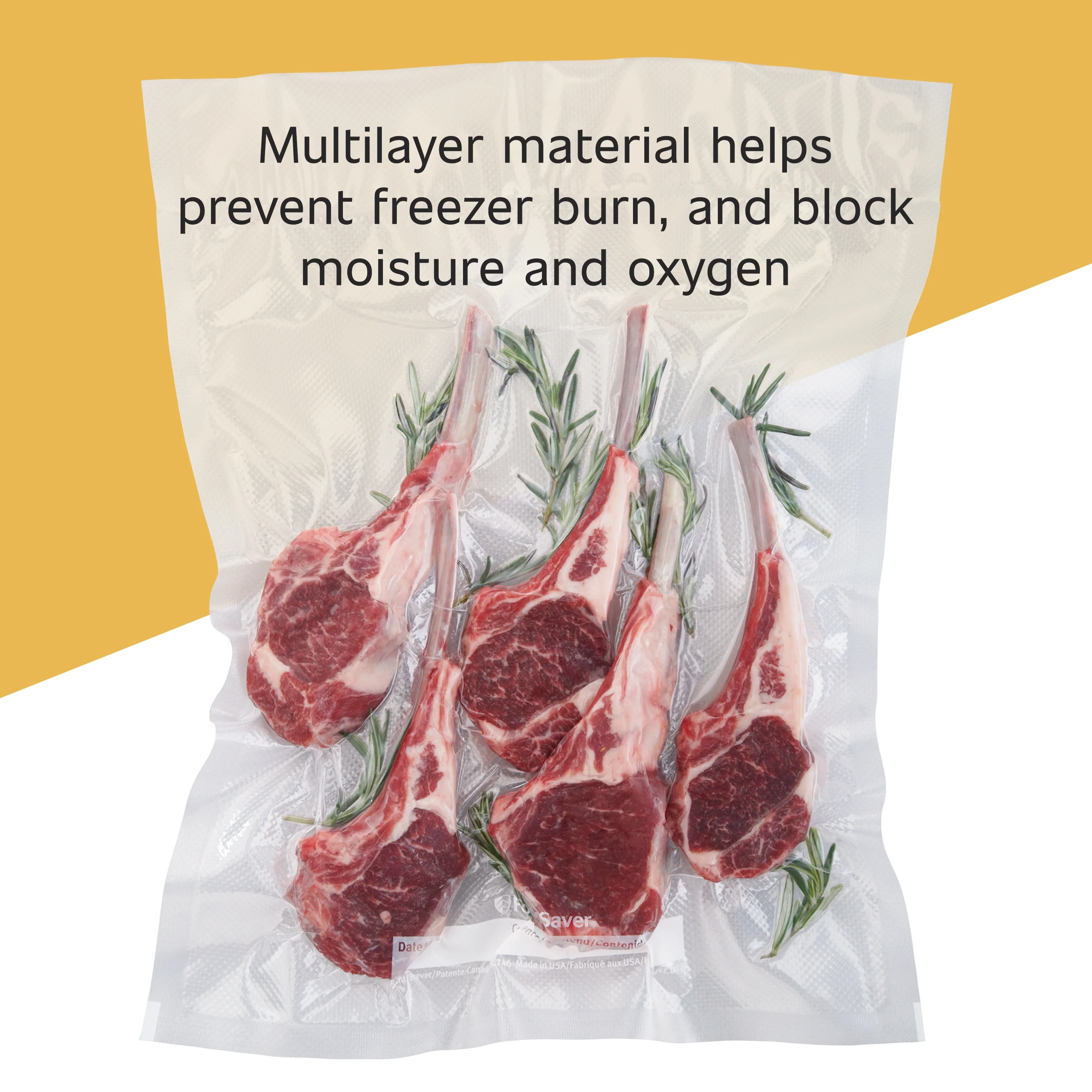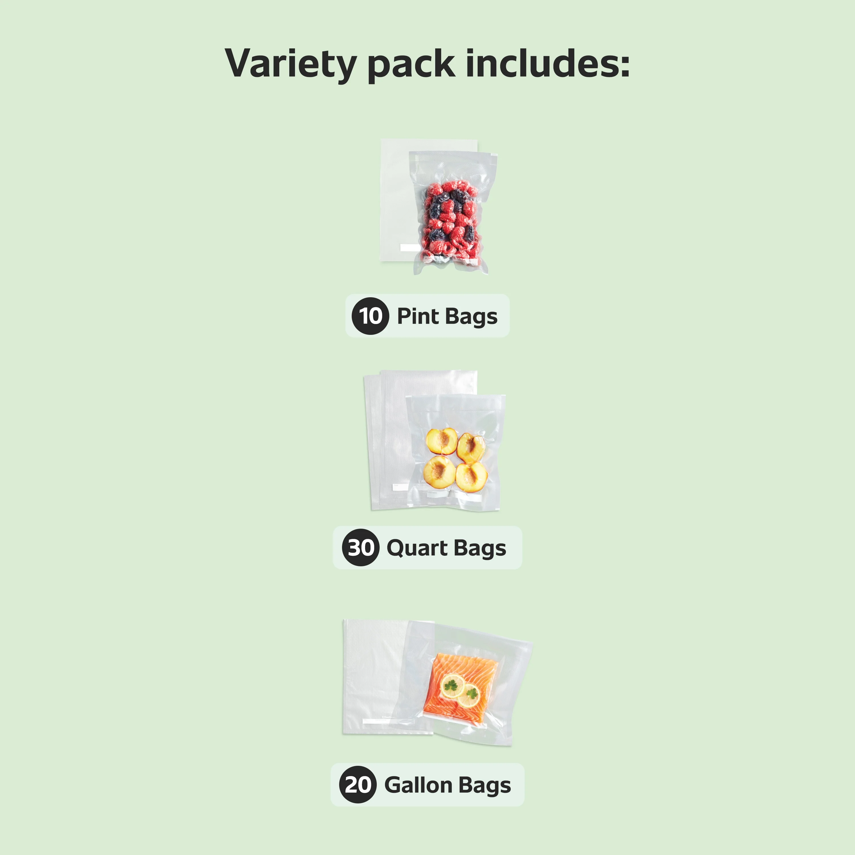 - INCLUDES: One 11" x 8' roll, two 1-quart vacuum seal bags, and two 1- quart vacuum seal zipper bags