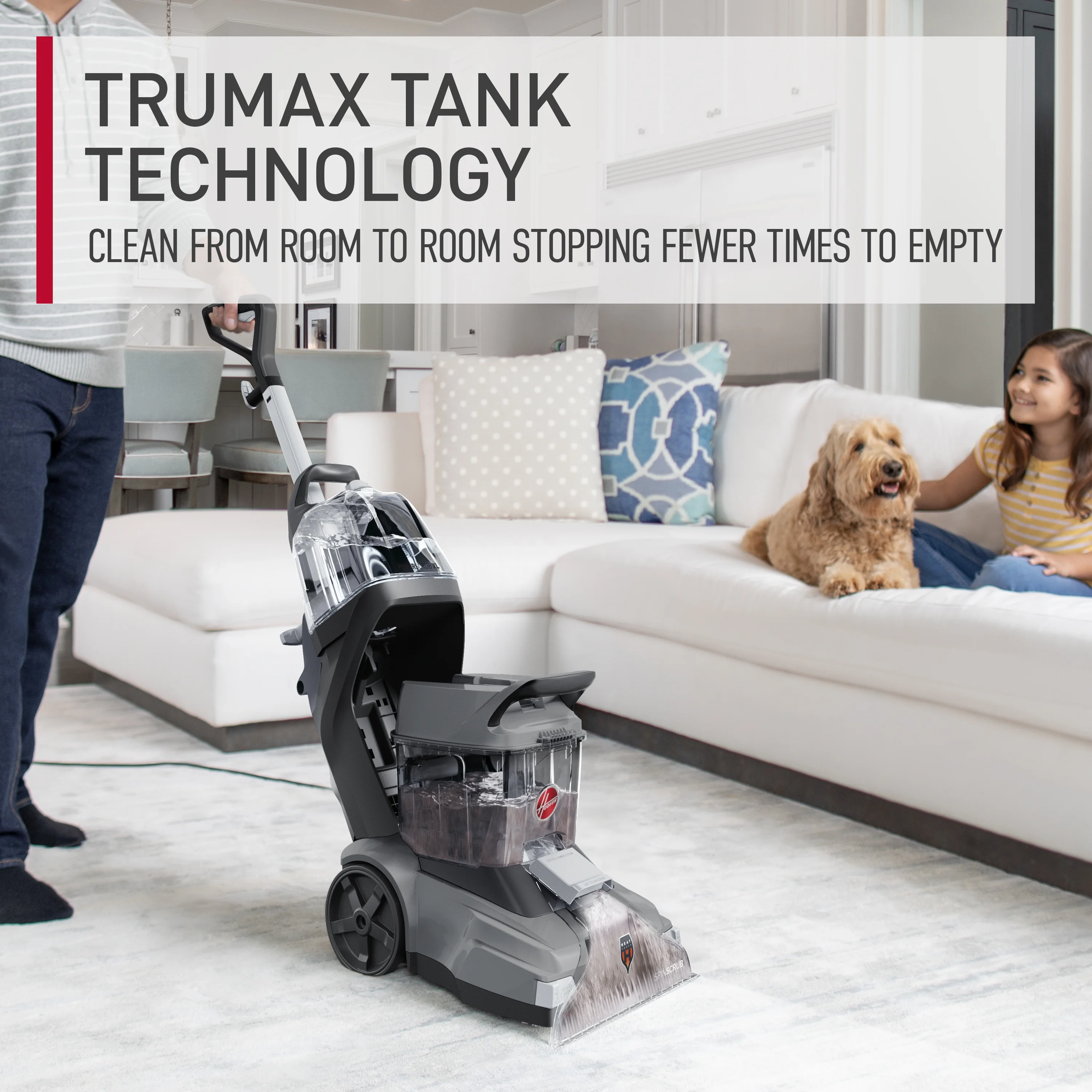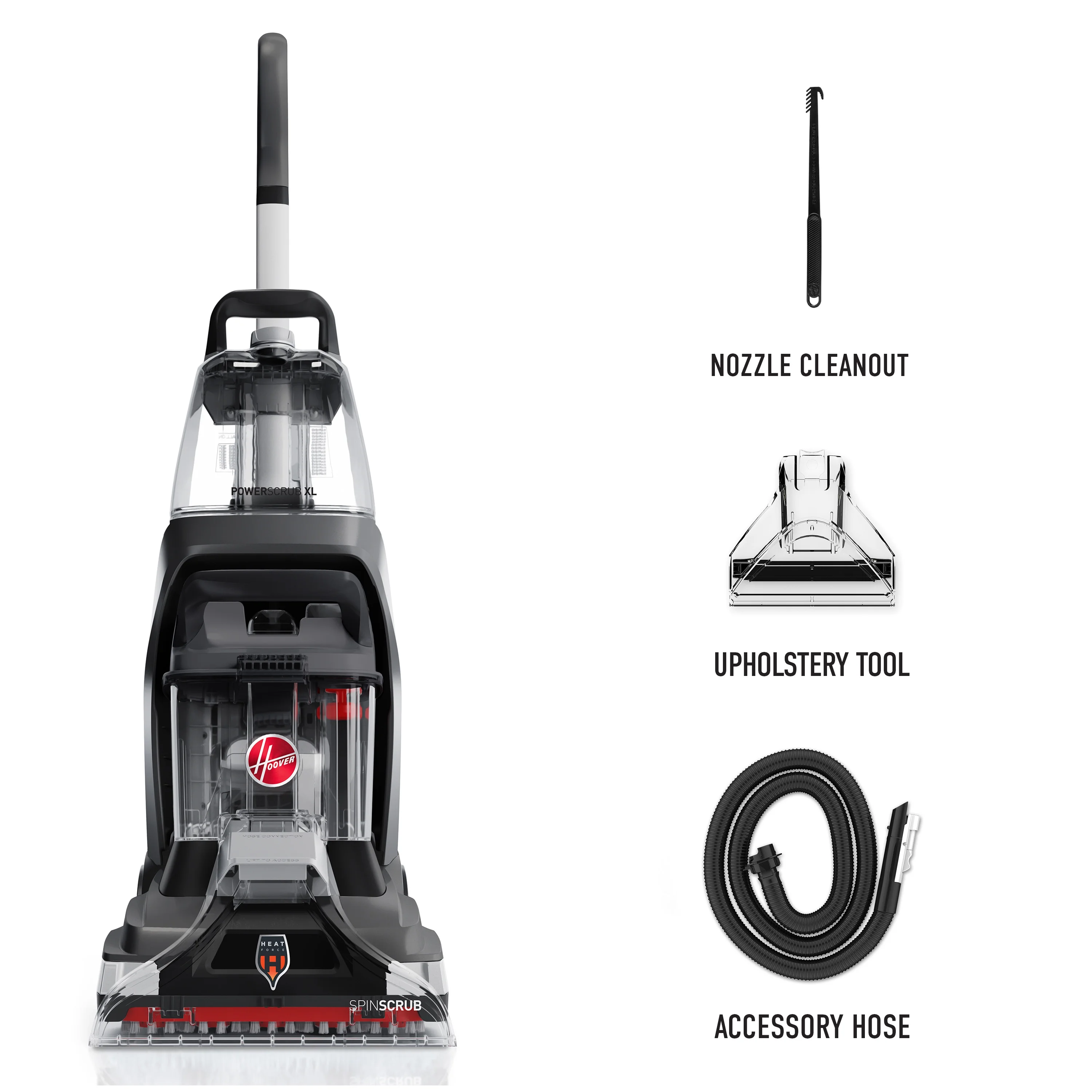 The Hoover PowerScrub XL+ Carpet Cleaner powerfully tackles deep, set-in stains and renews your carpets for a complete, whole home clean. Easily remove stains with the combined power of the five counter-rotating SpinScrub brushes and HeatForce faster drying. Our TruMAX? recovery tank helps you clean more without stopping frequently to empty and refill. Plus, PowerScrub XL comes with versatile tools to target stubborn messes beyond your carpets.
