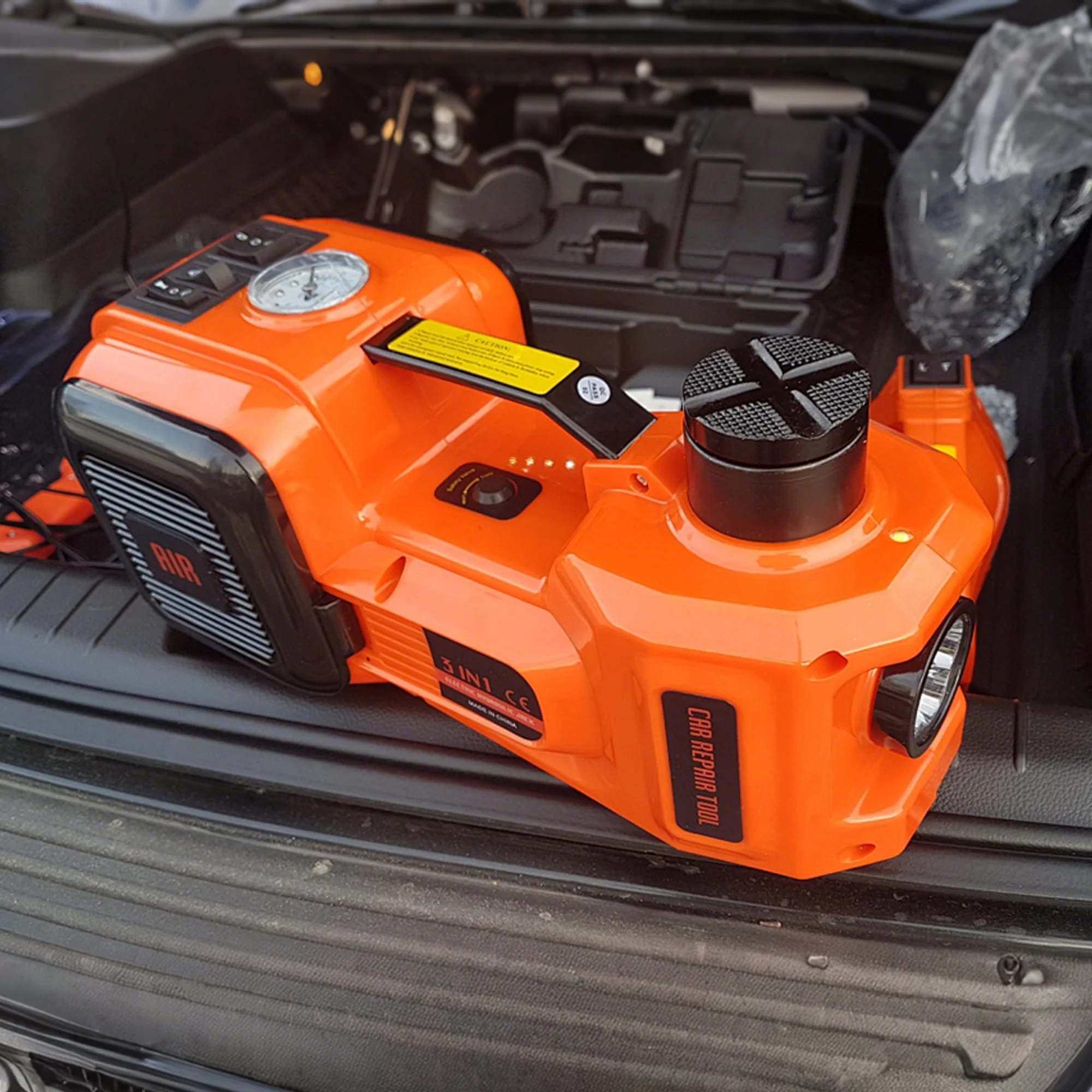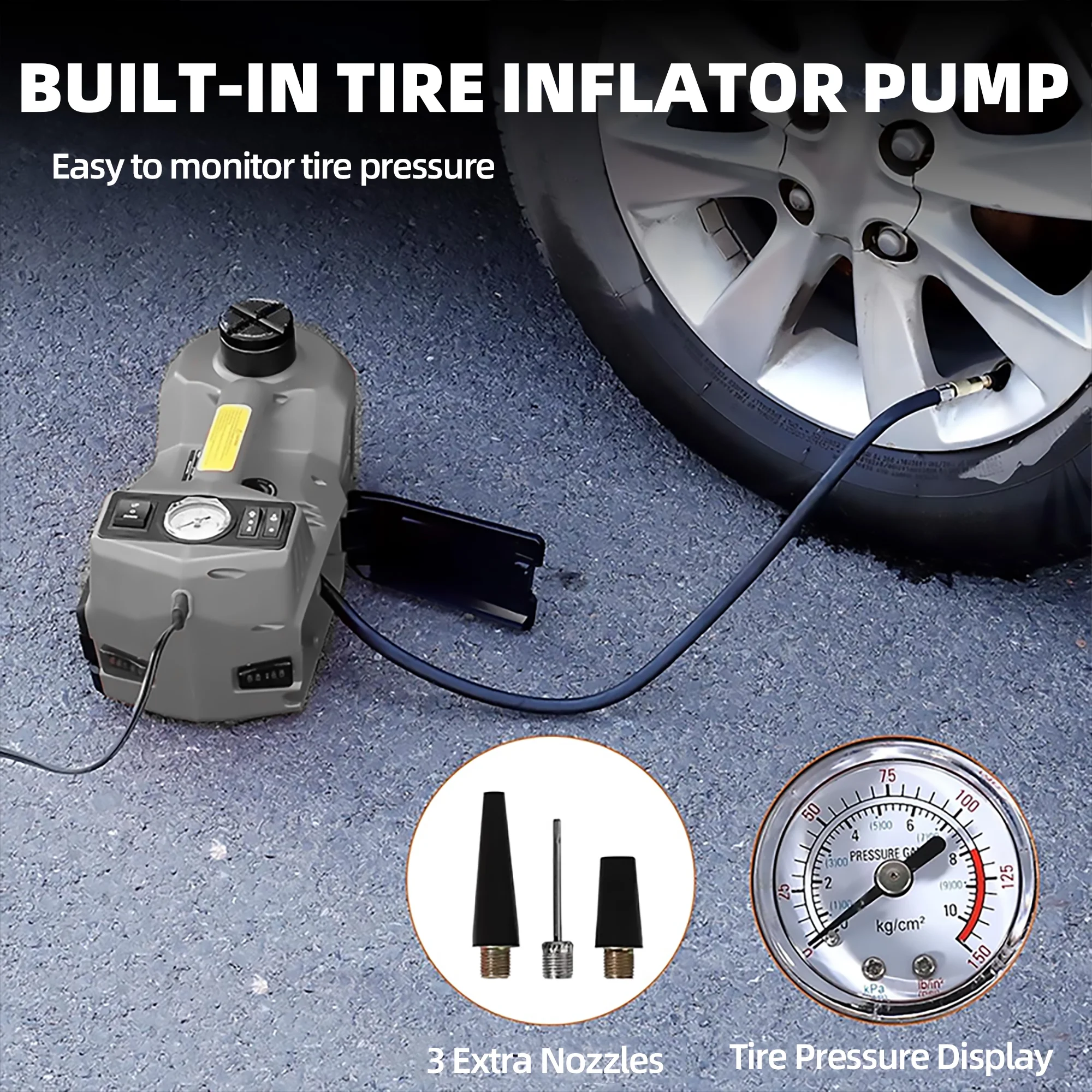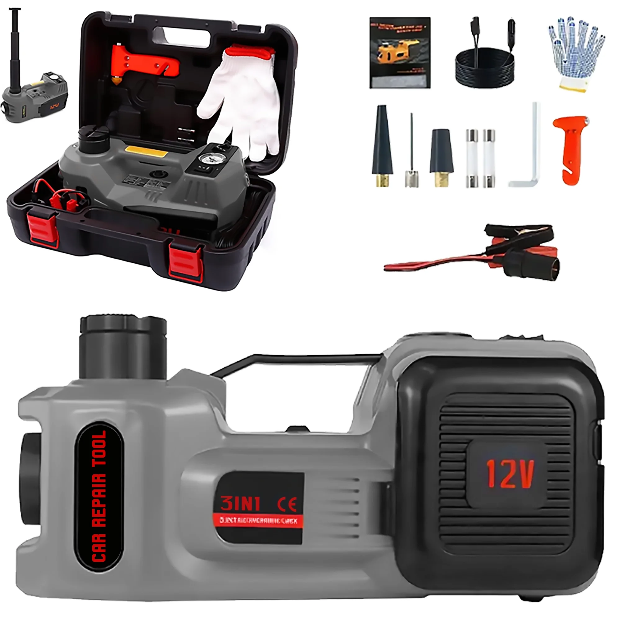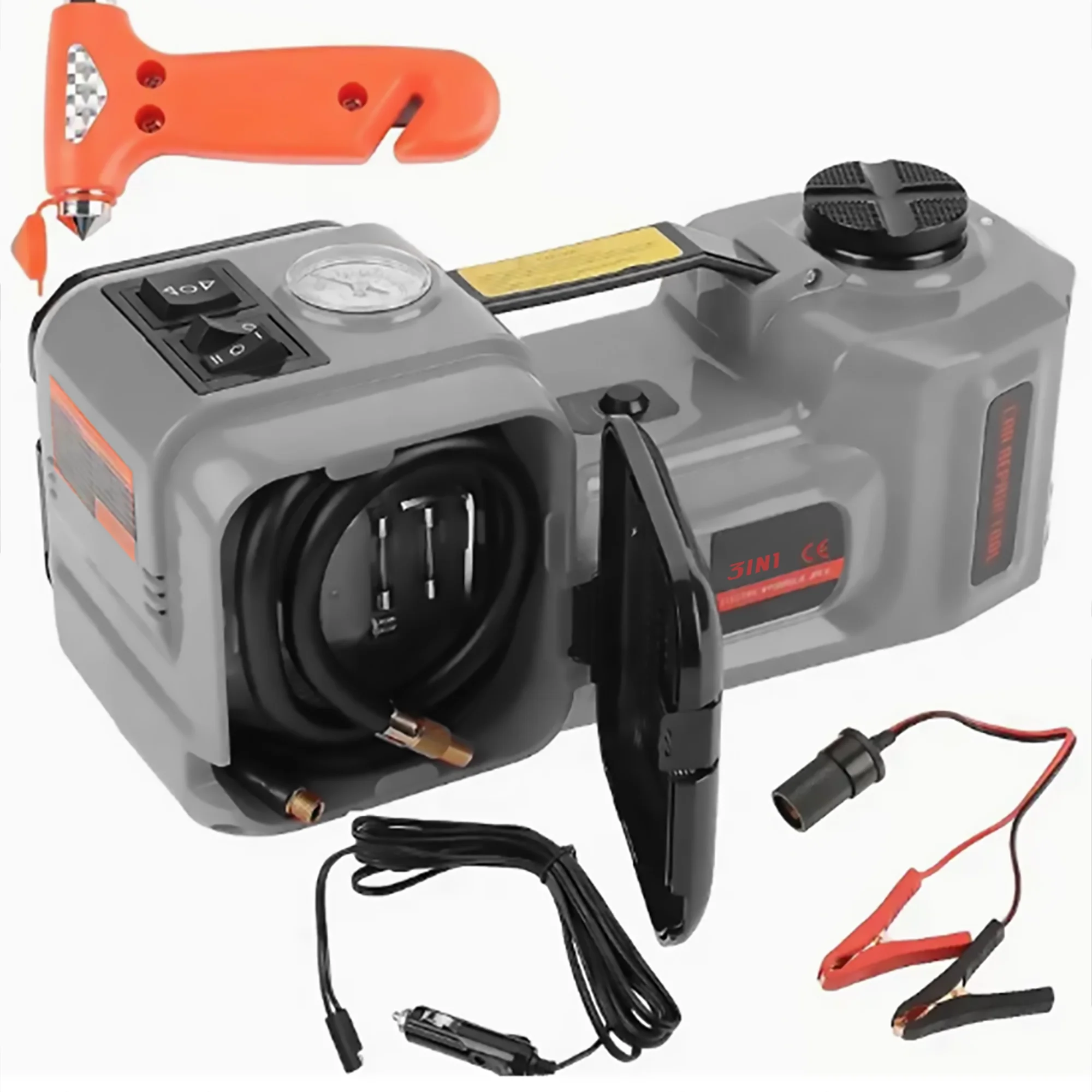 - 3-in-1 functionality includes an electric car jack, air compressor, and emergency hammer.
