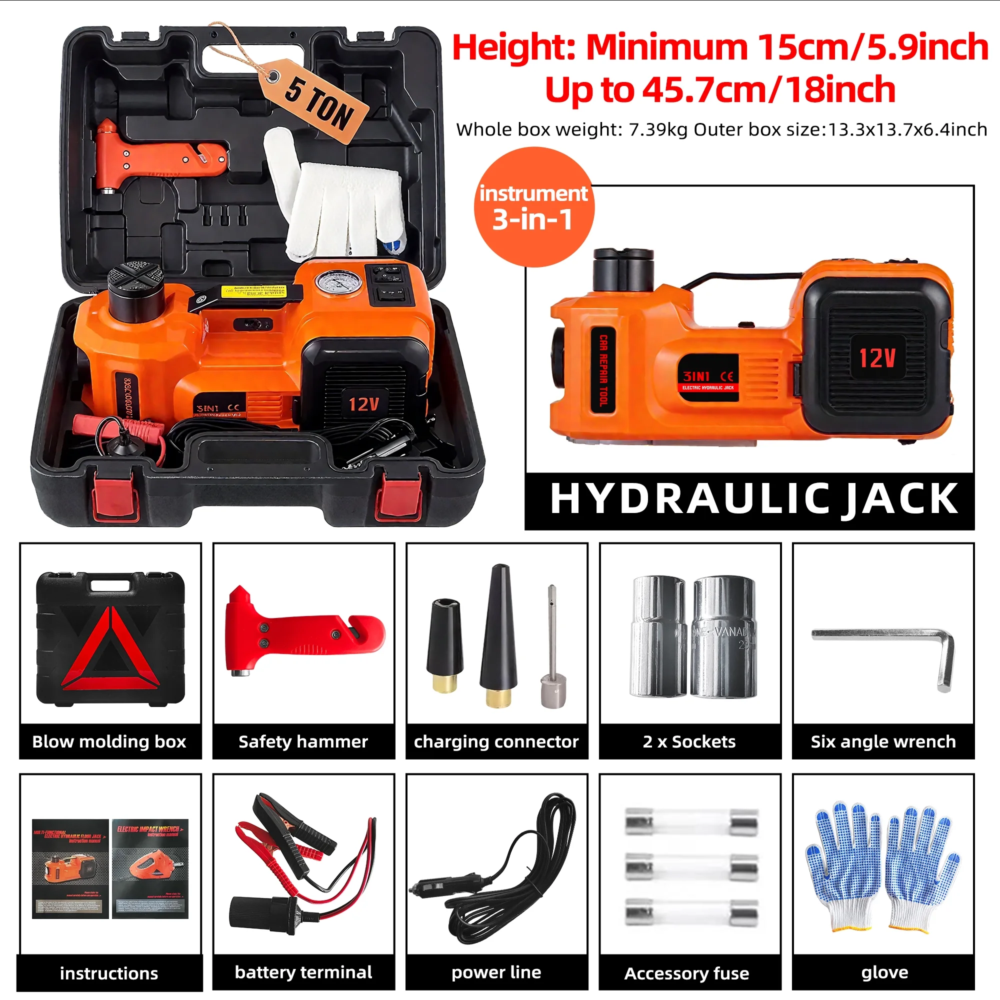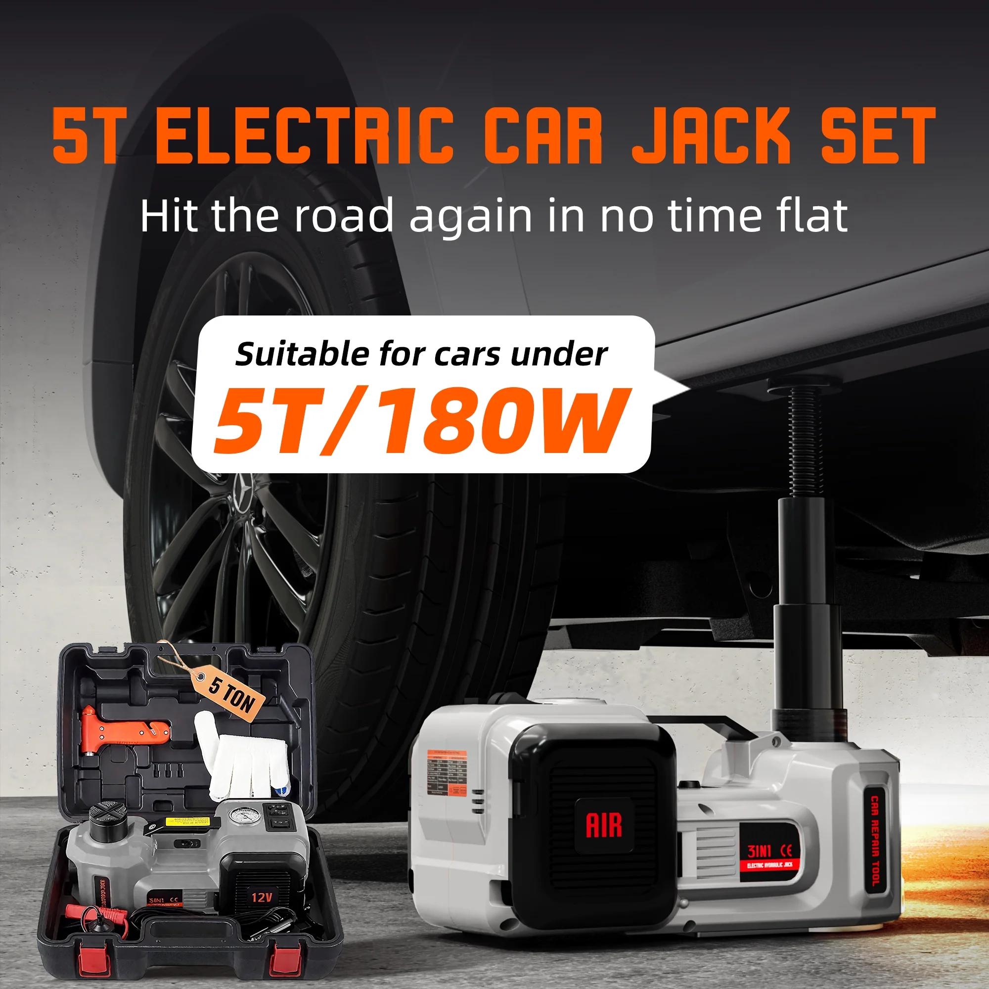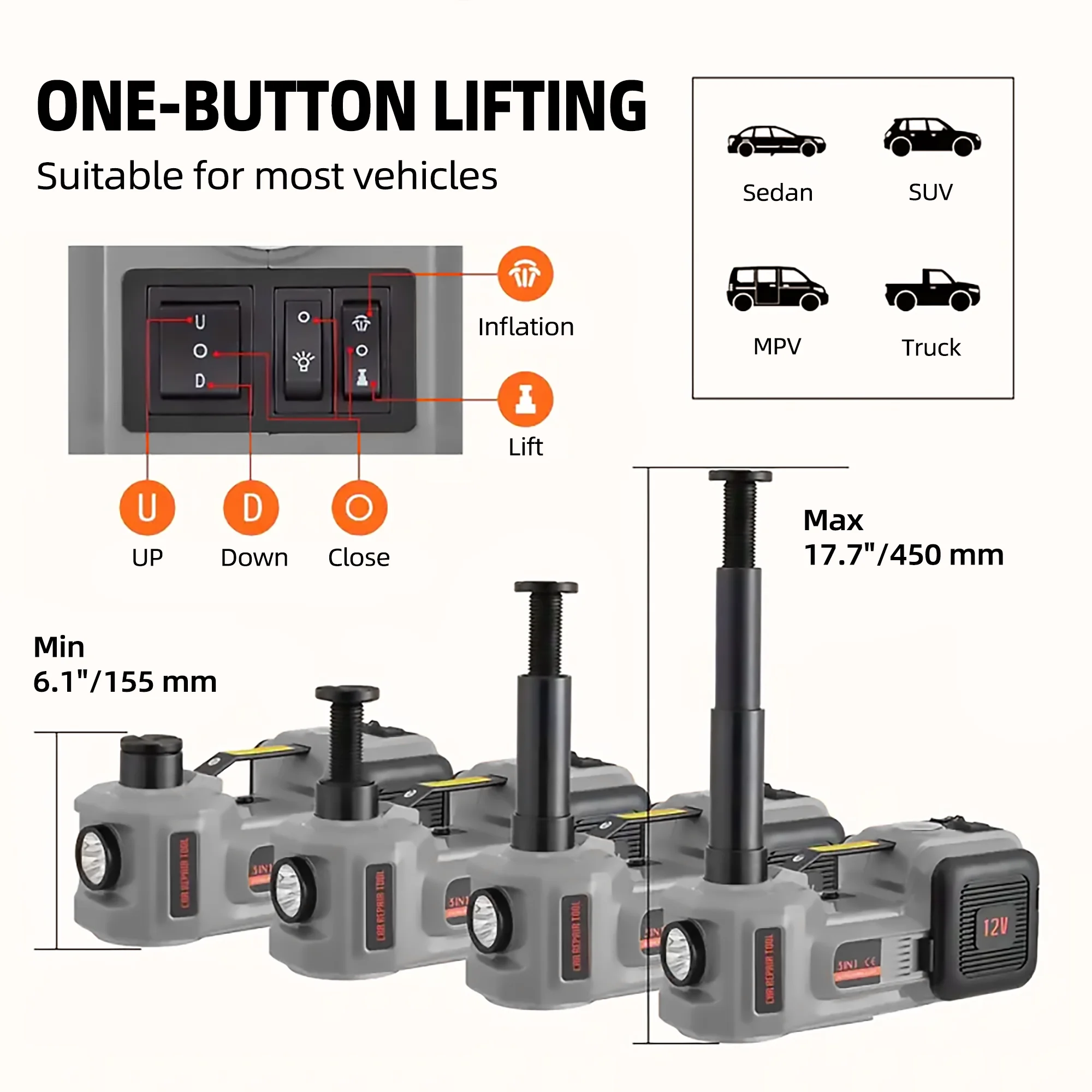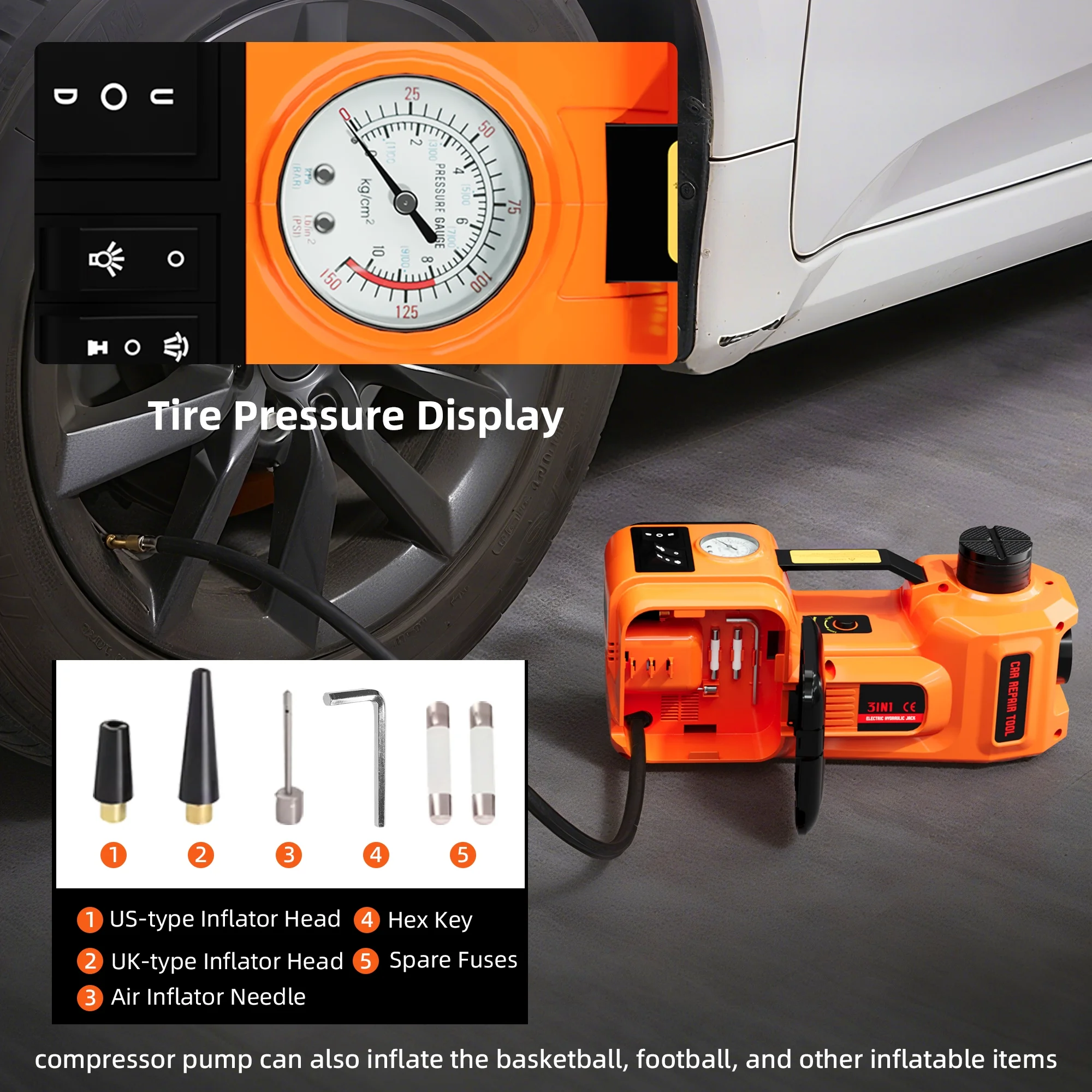 - 3-in-1 functionality includes an electric car jack, air compressor, and emergency hammer.