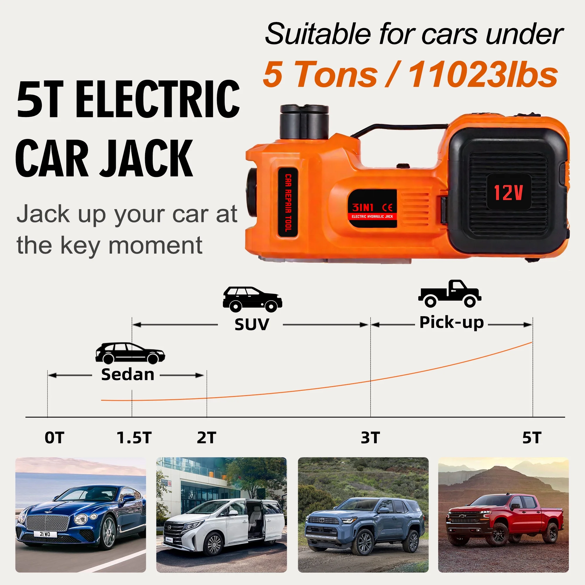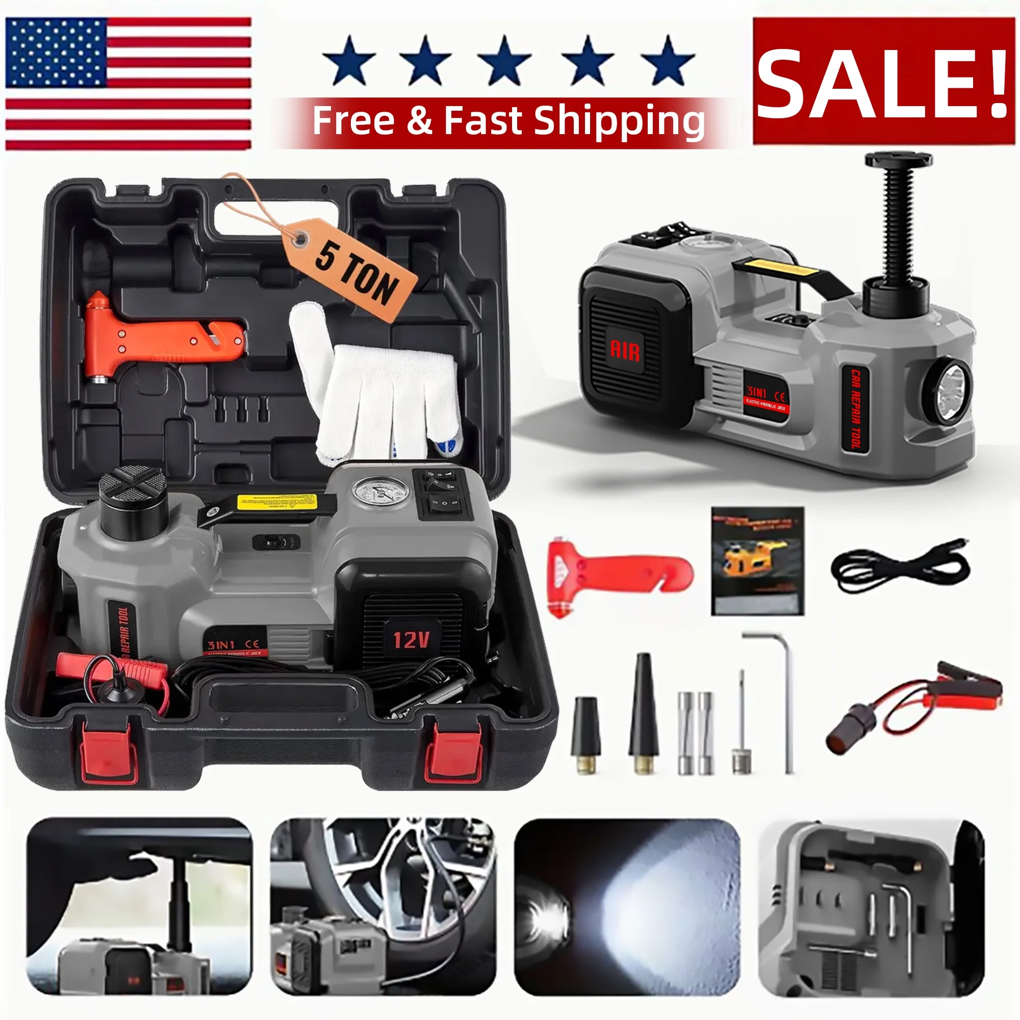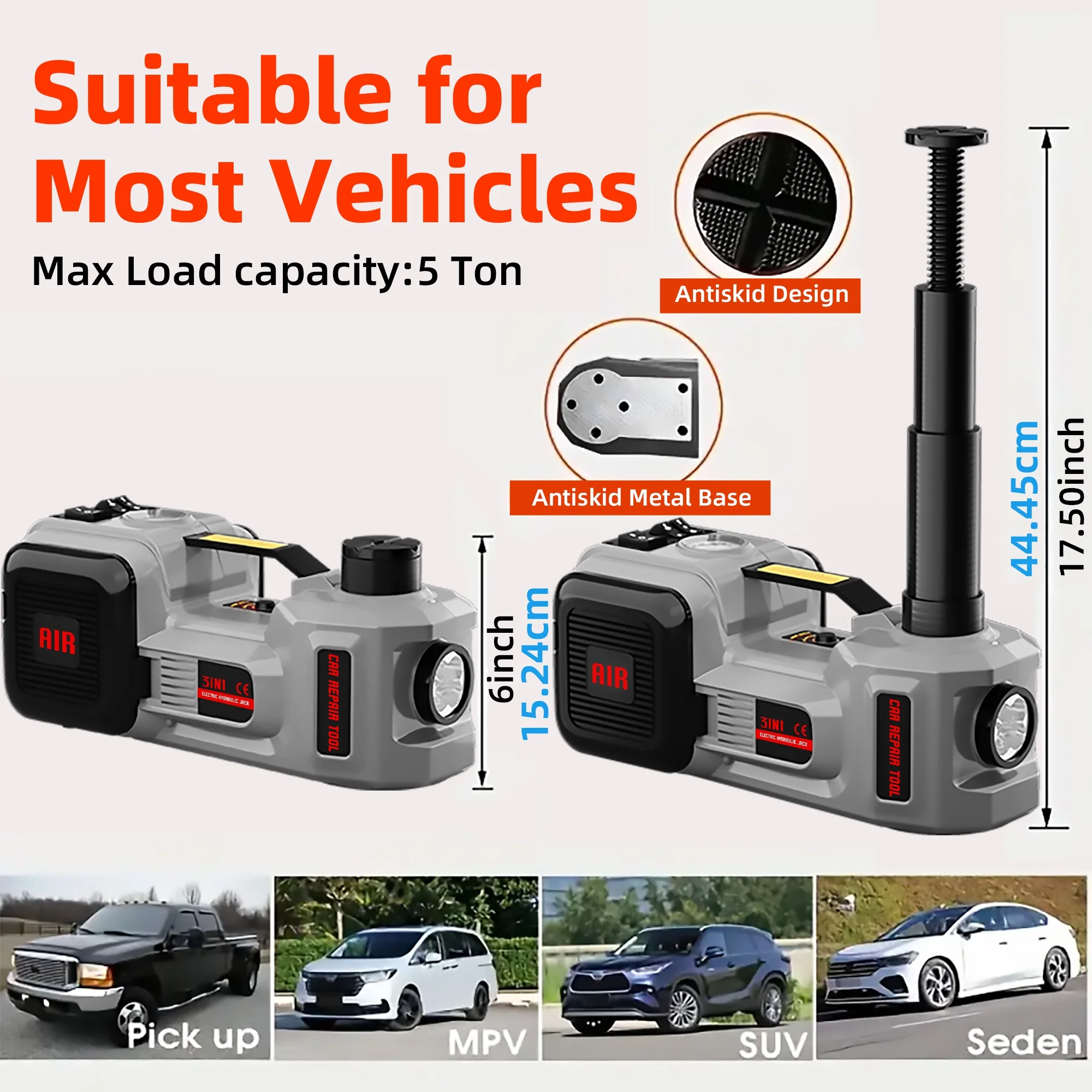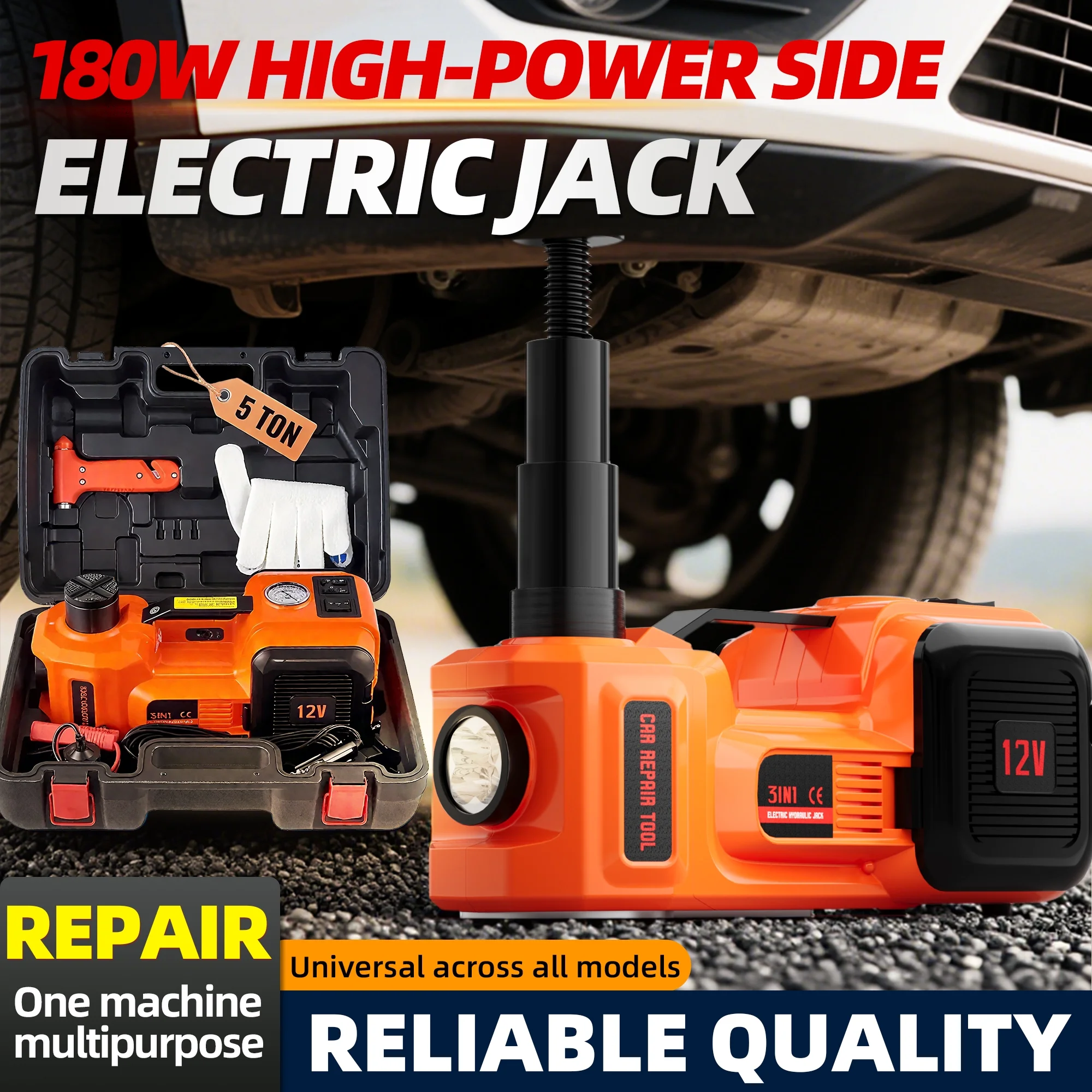 - 3-in-1 functionality includes an electric car jack, air compressor, and emergency hammer.