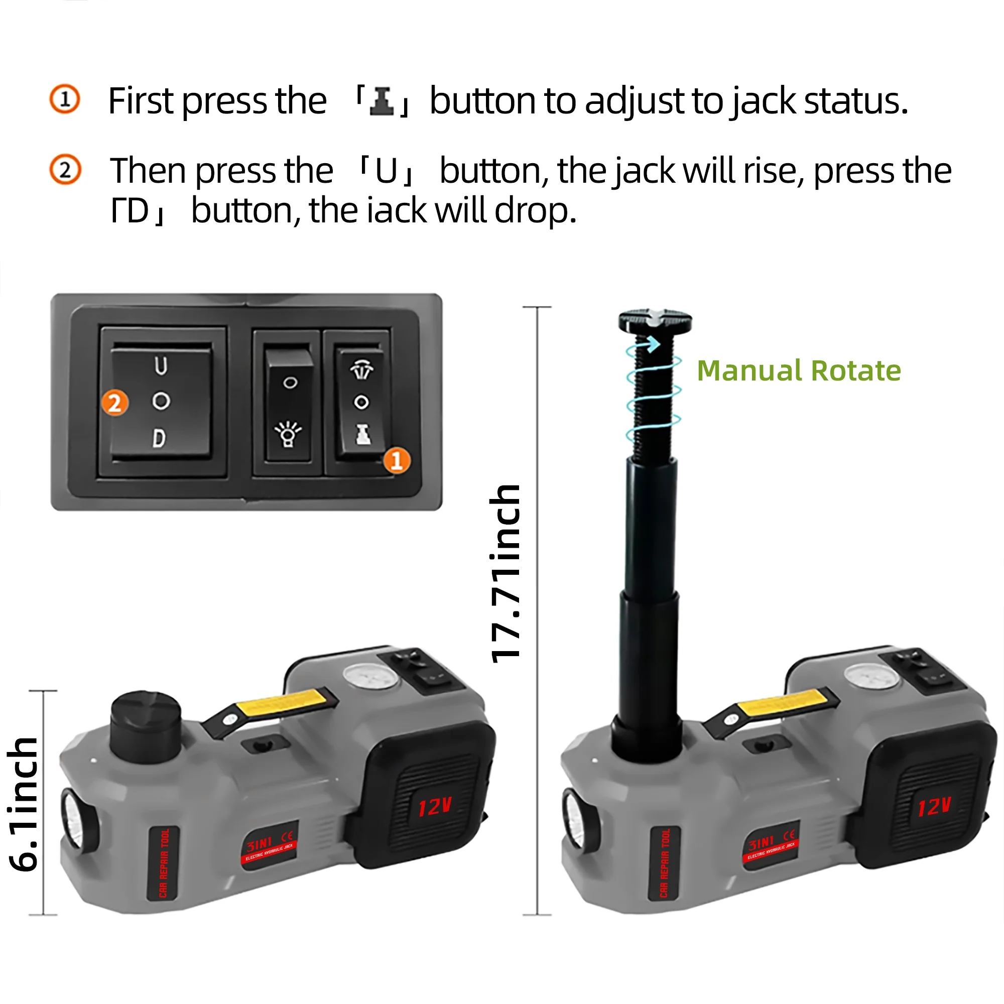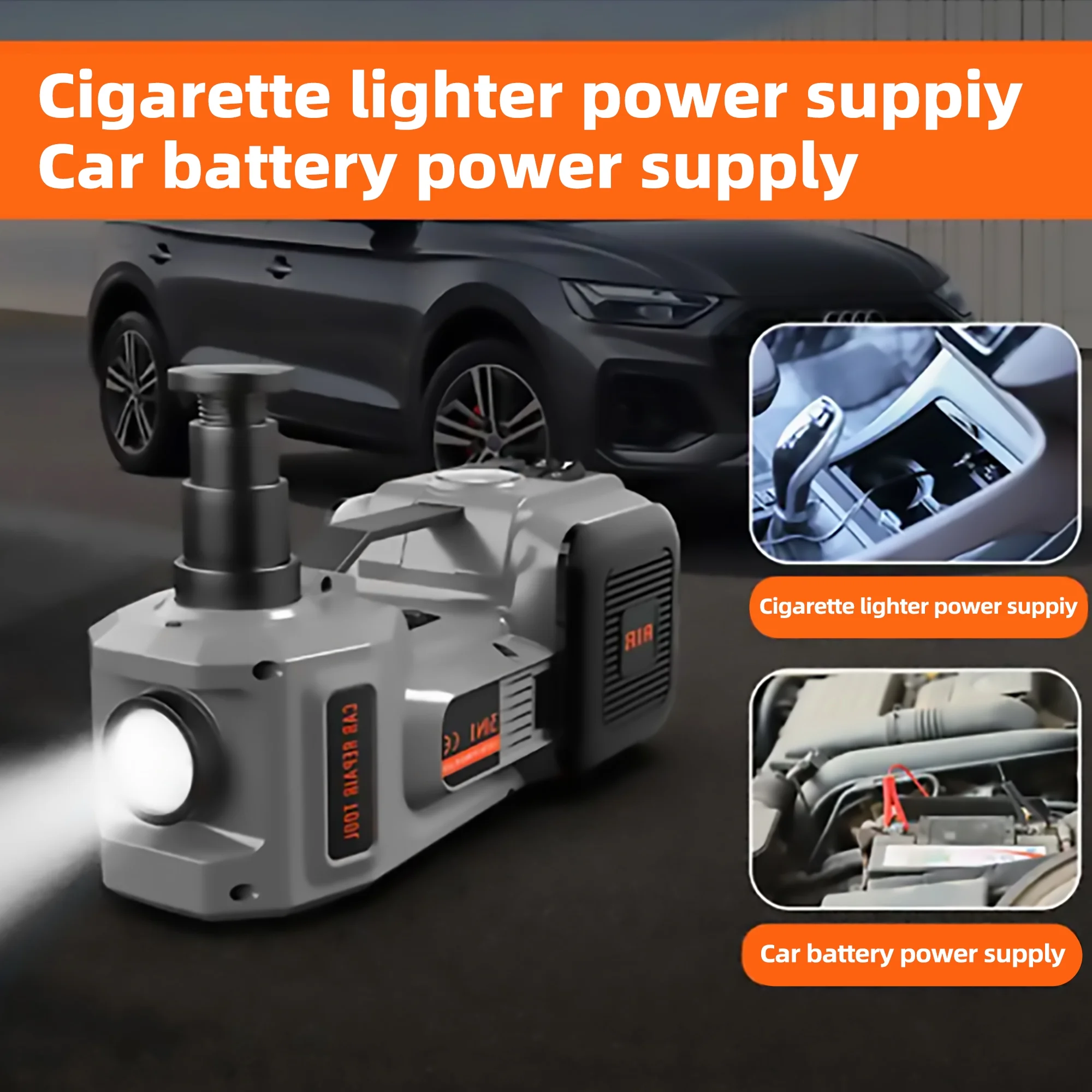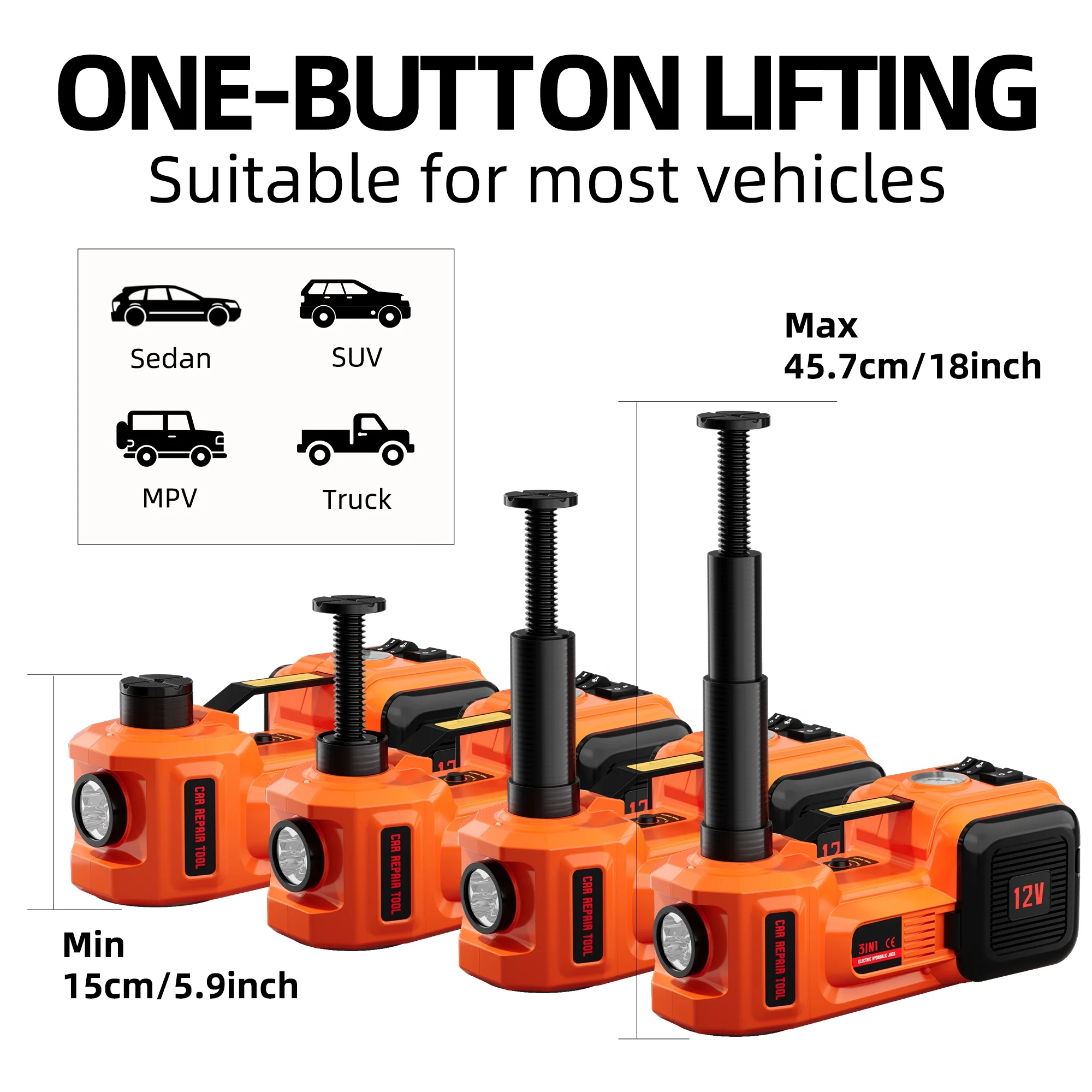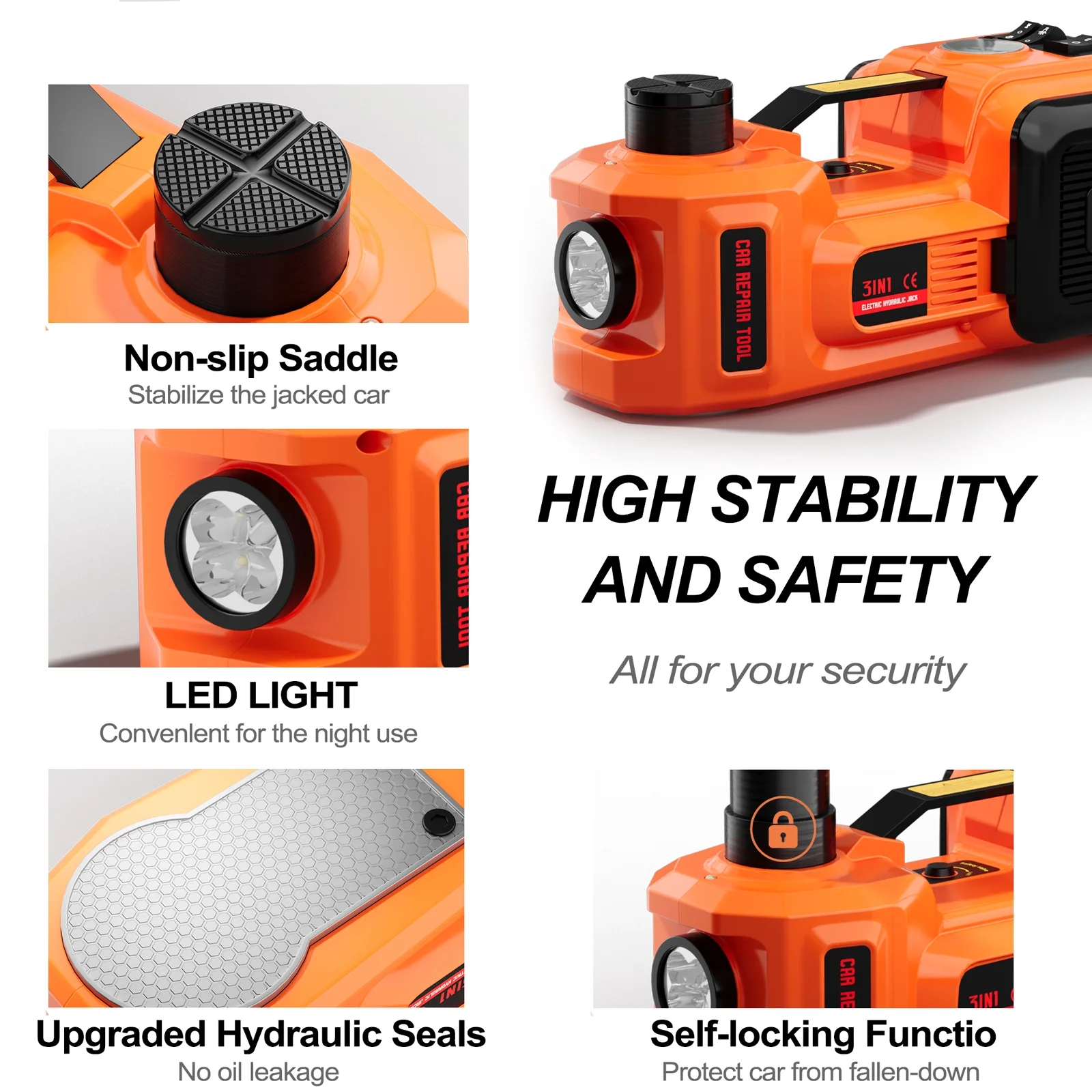 - 3-in-1 functionality includes an electric car jack, air compressor, and emergency hammer.