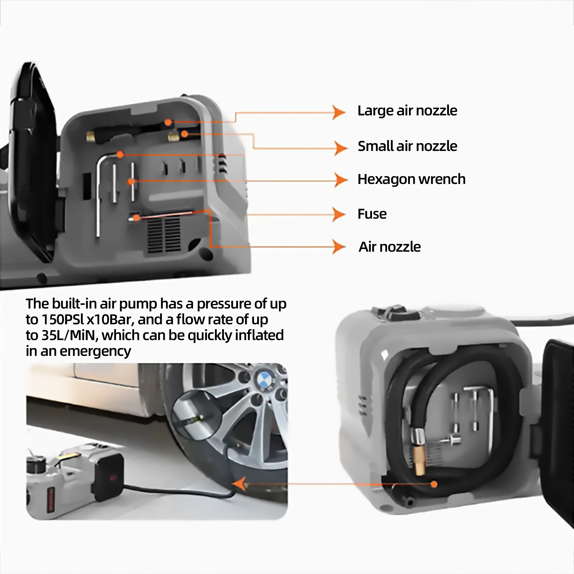 - Built-in tire inflator with pressure display for quick and easy tire maintenance.