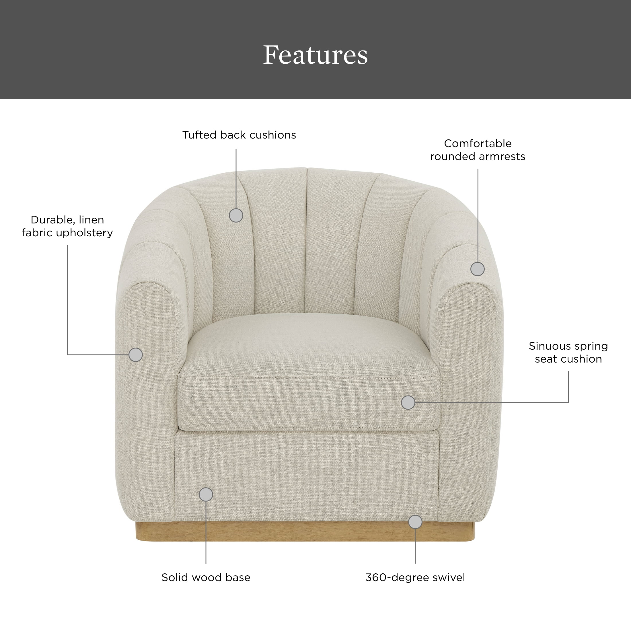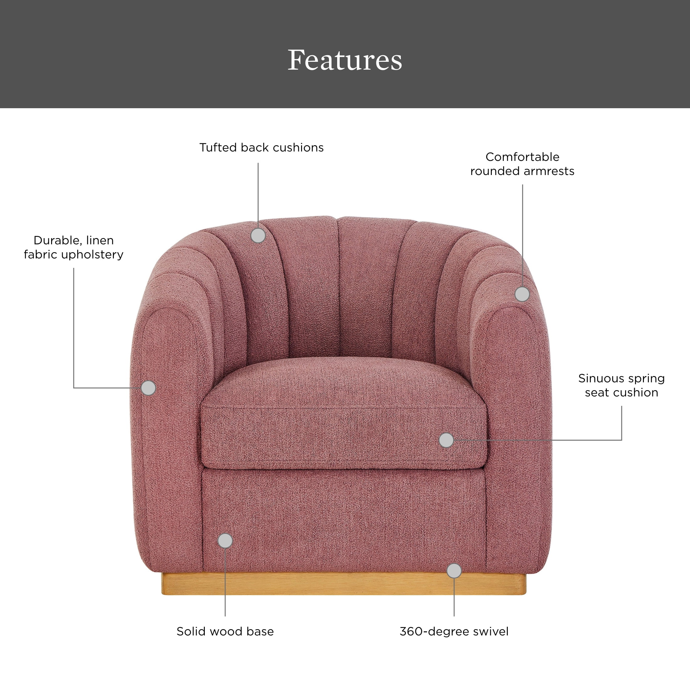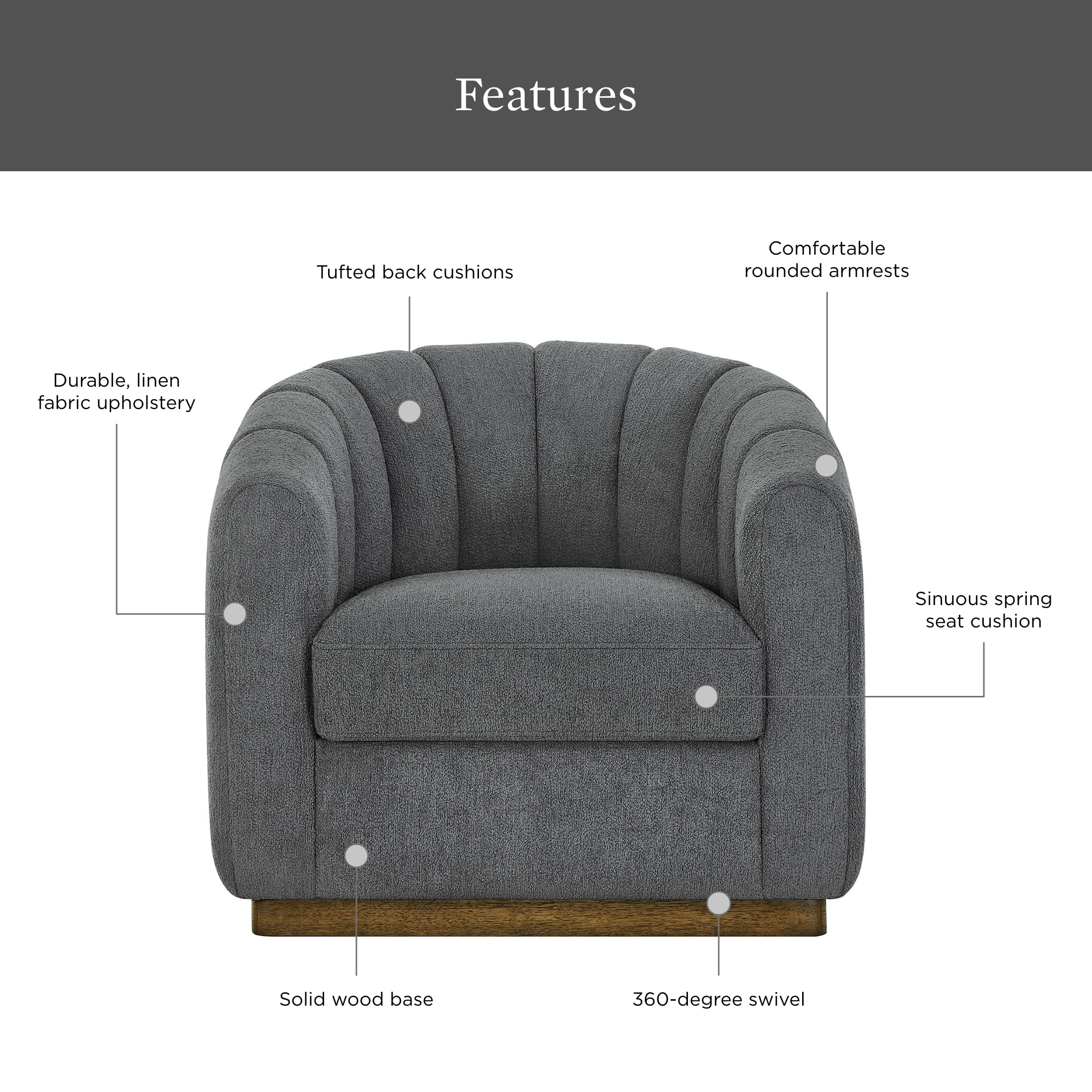 - Comfort Features: Generously padded seat and backrest | Barrel-style back for comfort | Ergonomic 360-degree swivel feature