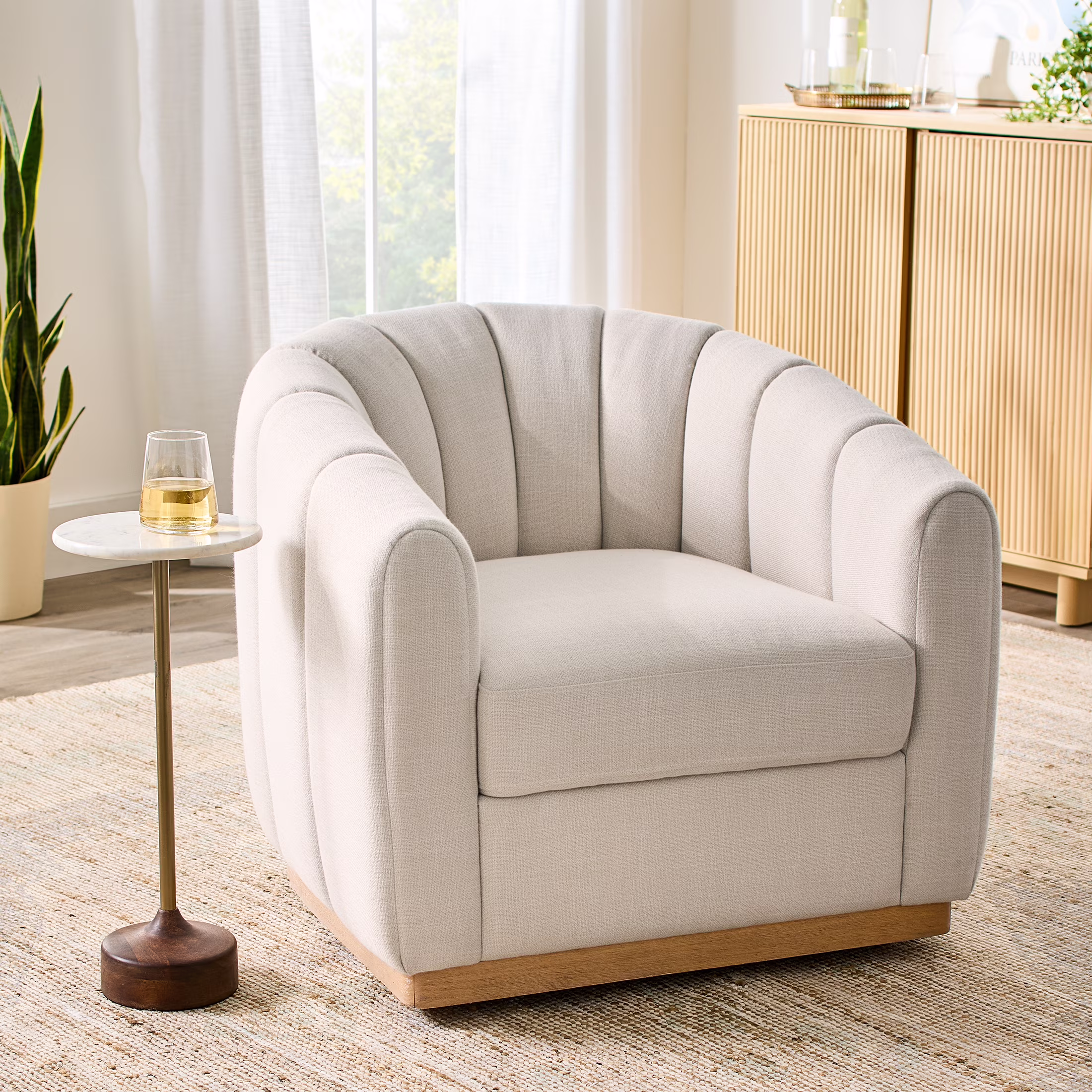 - Materials & Construction: Solid wood base | Polyester foam seat | Sumptuous cream linen fabric
