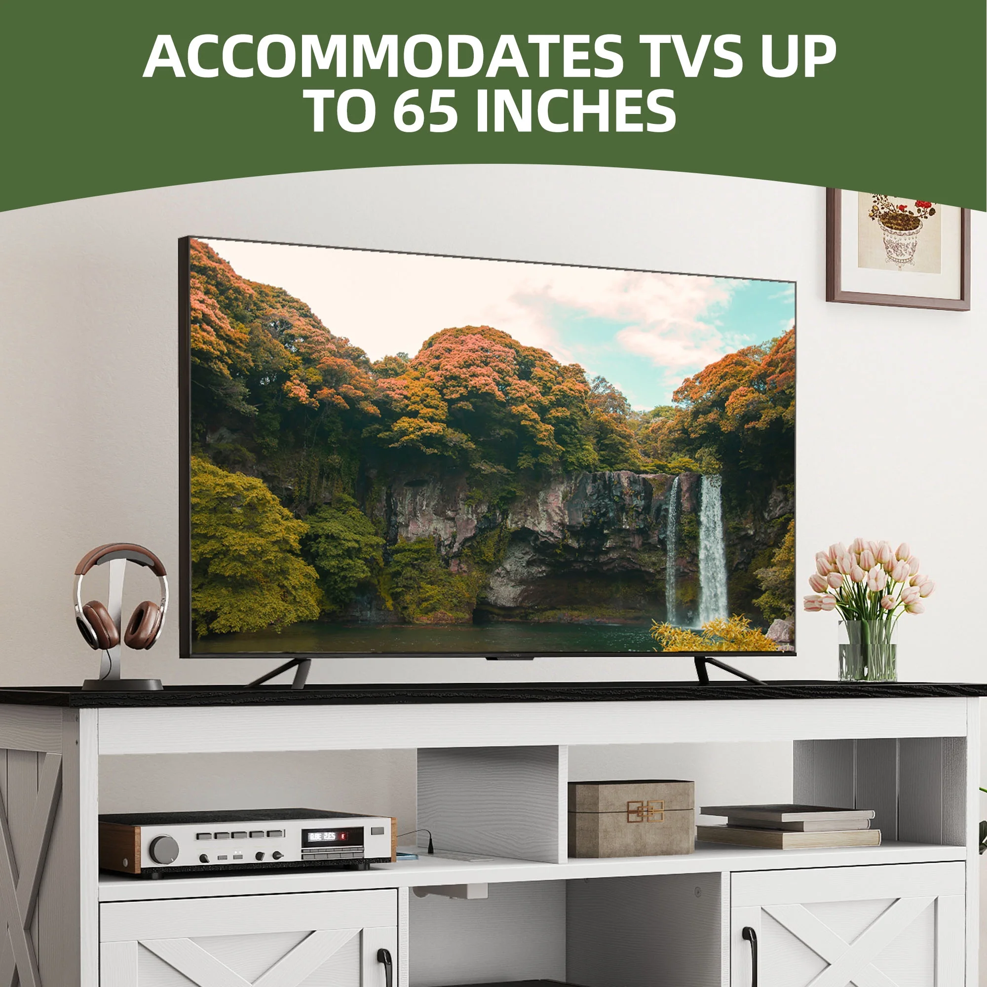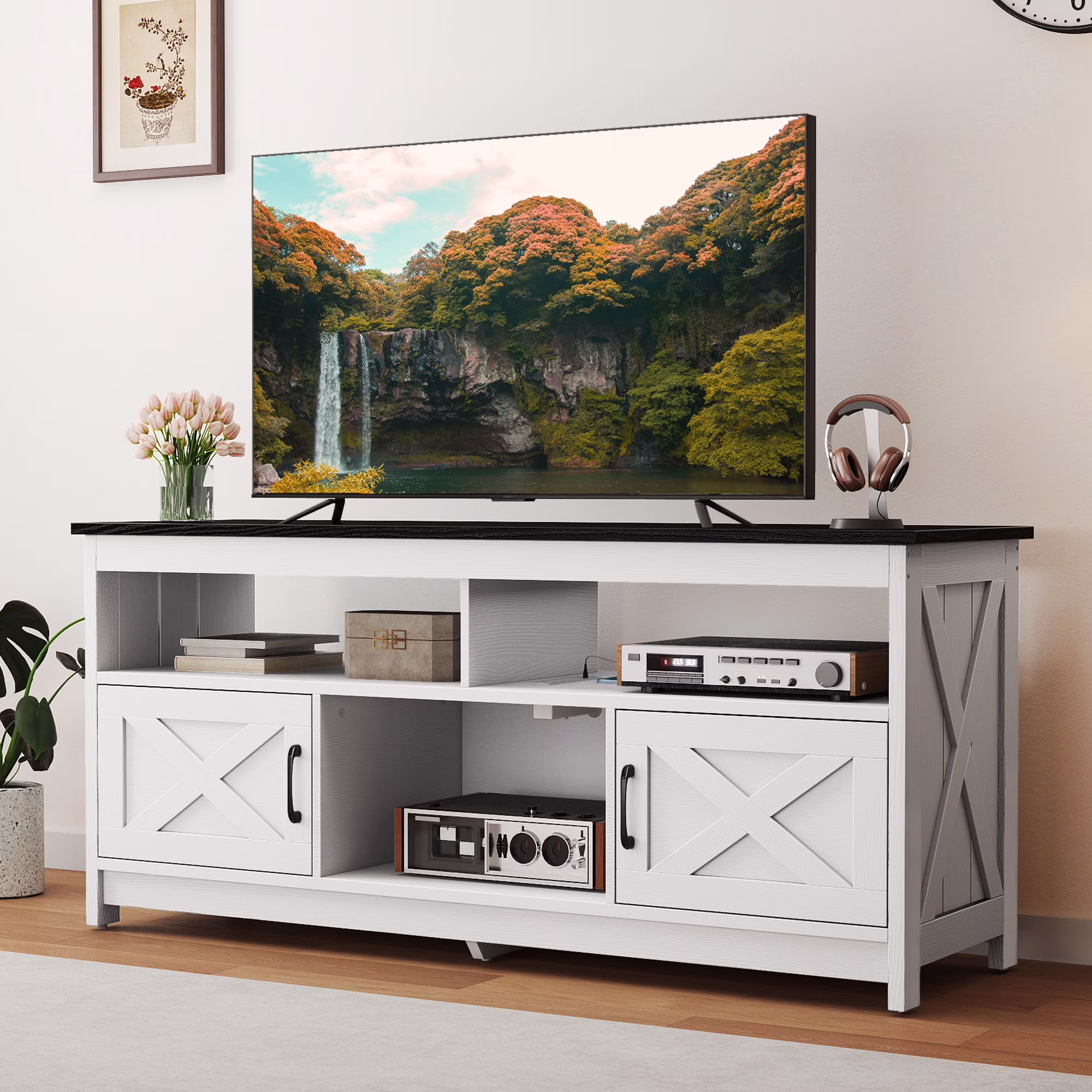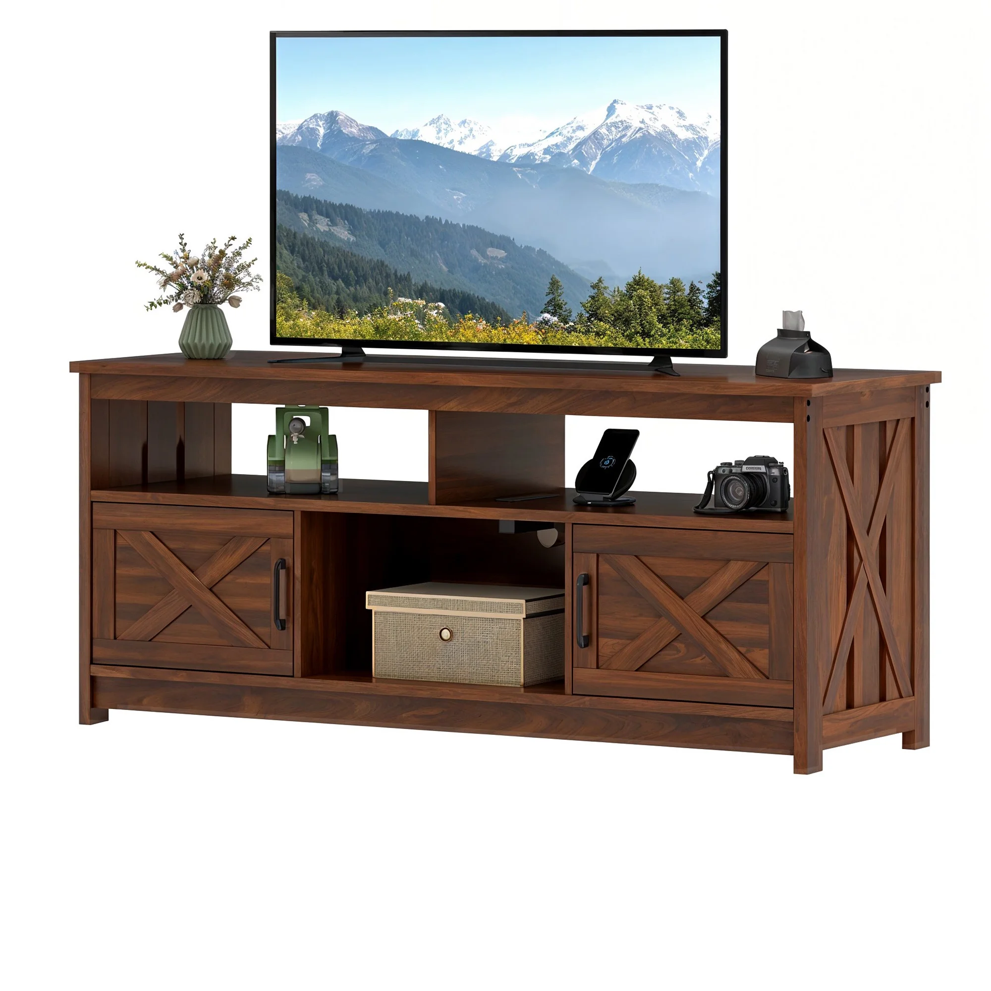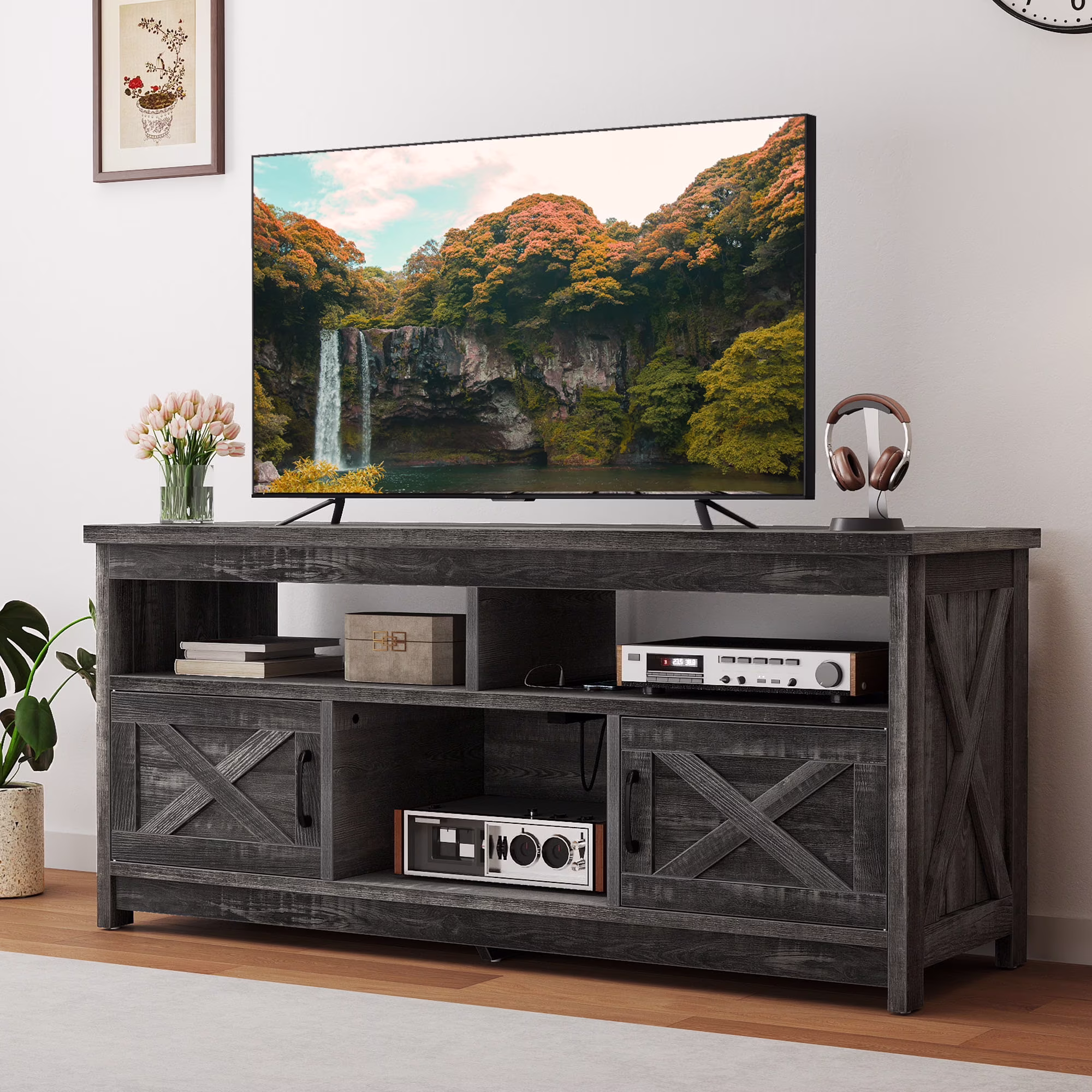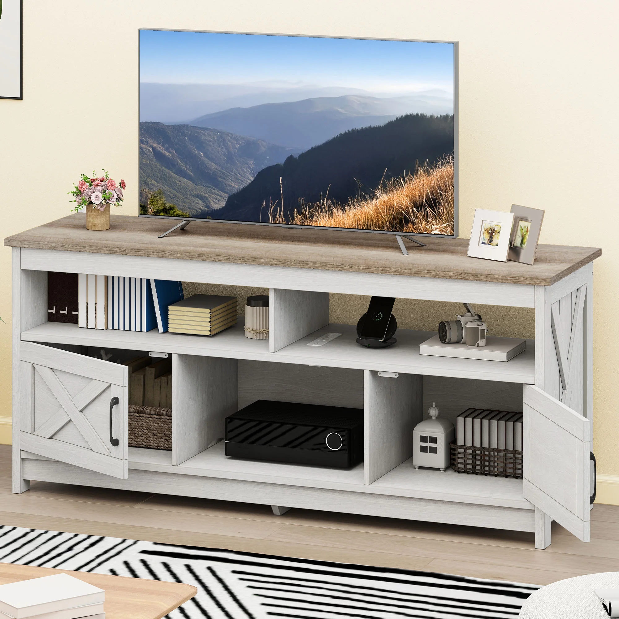 - Multi-Functional Elegance: This 65-inch TV stand isn��t just for your TV. The farmhouse X-shaped barn doors add rustic charm, making it ideal as a coffee bar, storage unit, or entryway cabinet. With easy instructions, assembling is a breeze, even for first-timers.