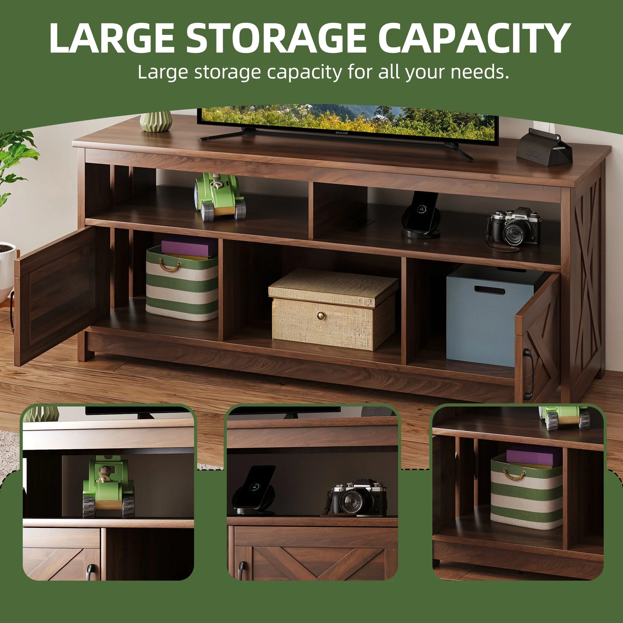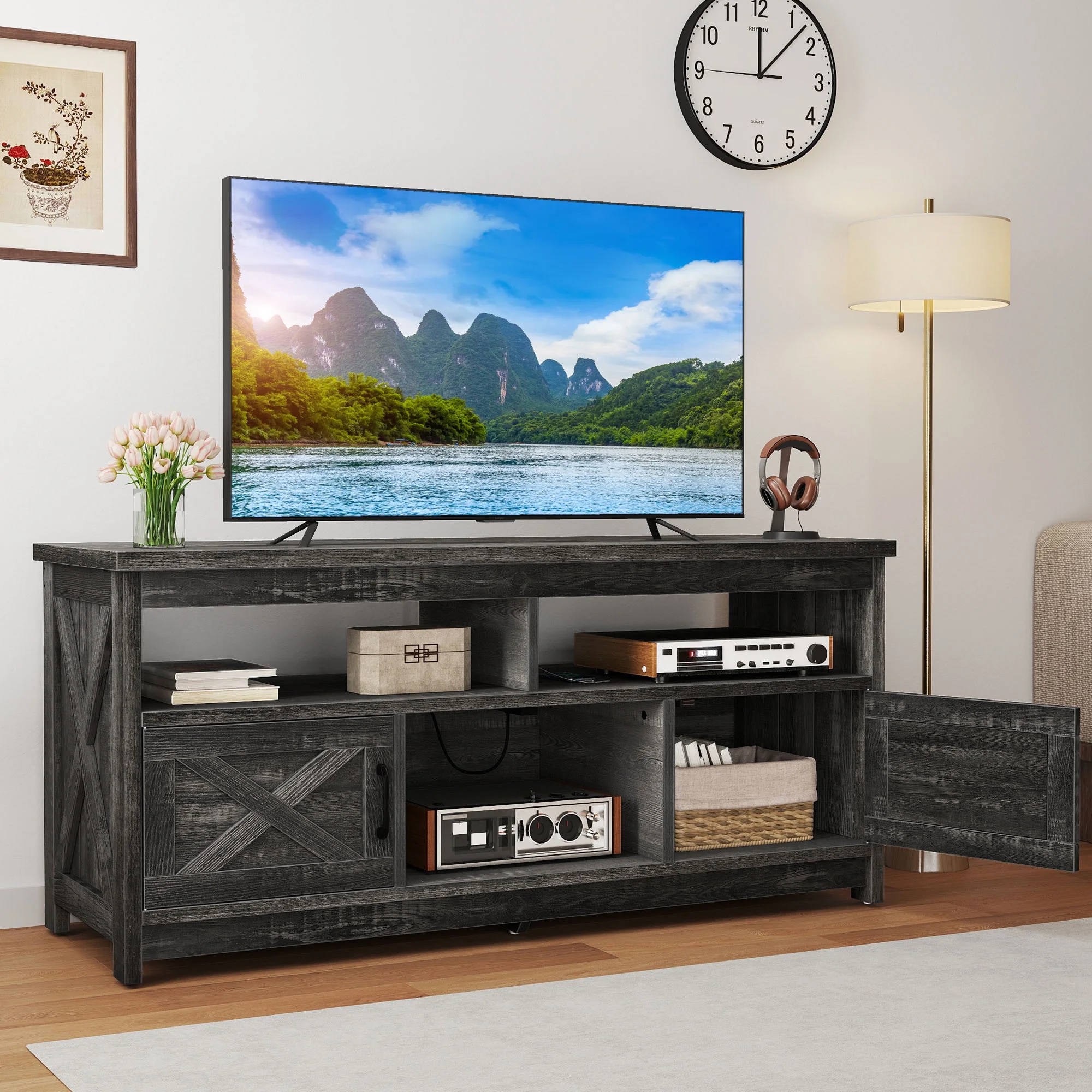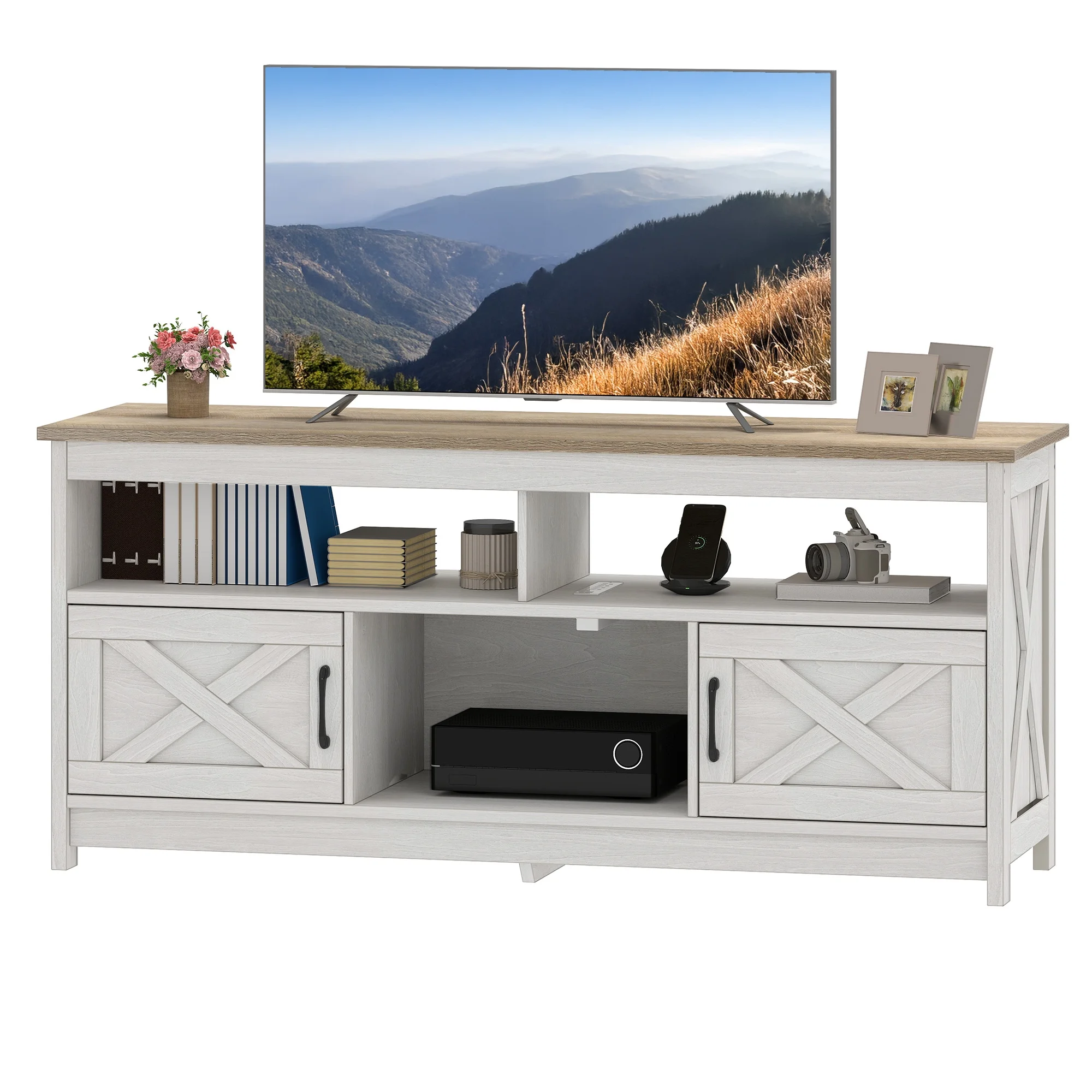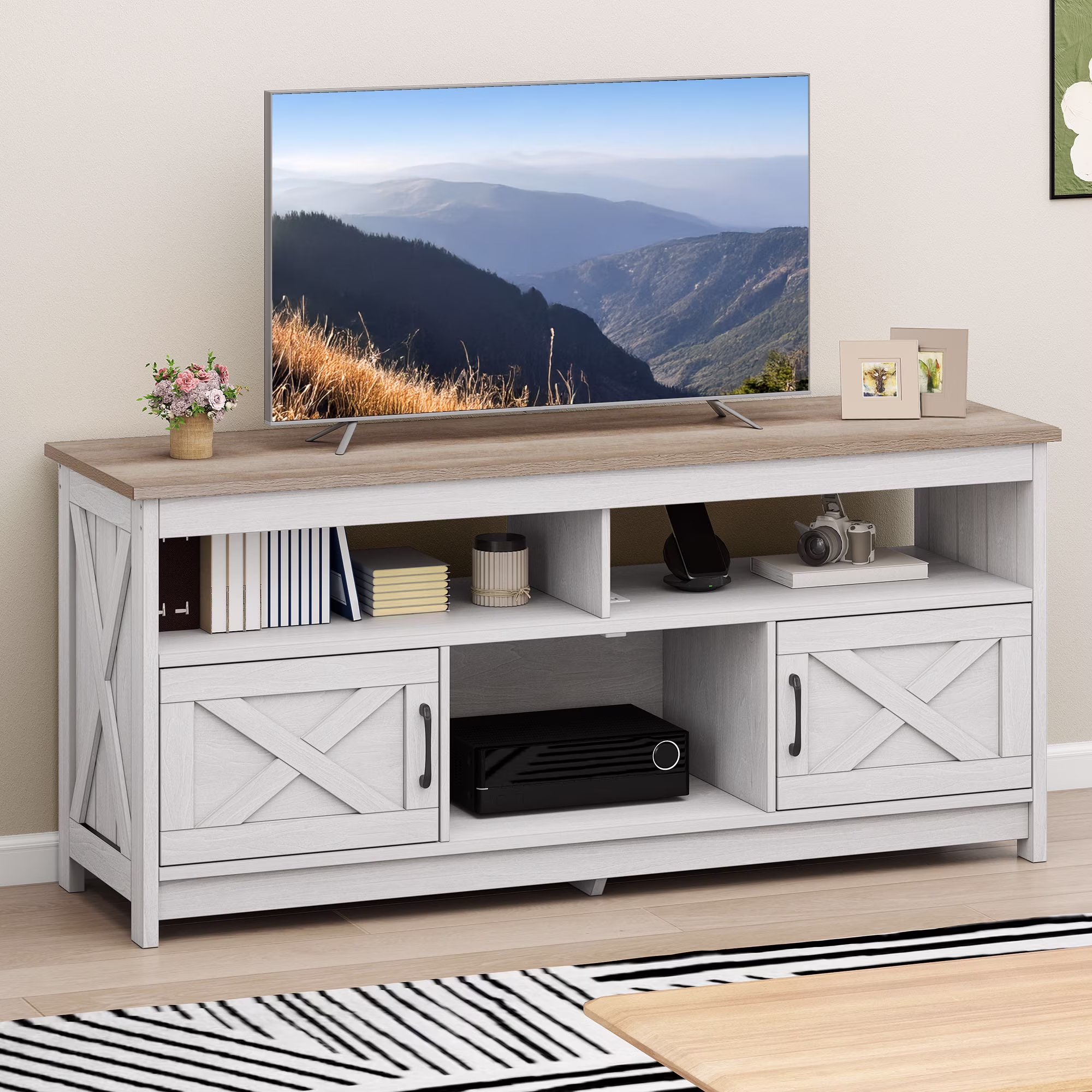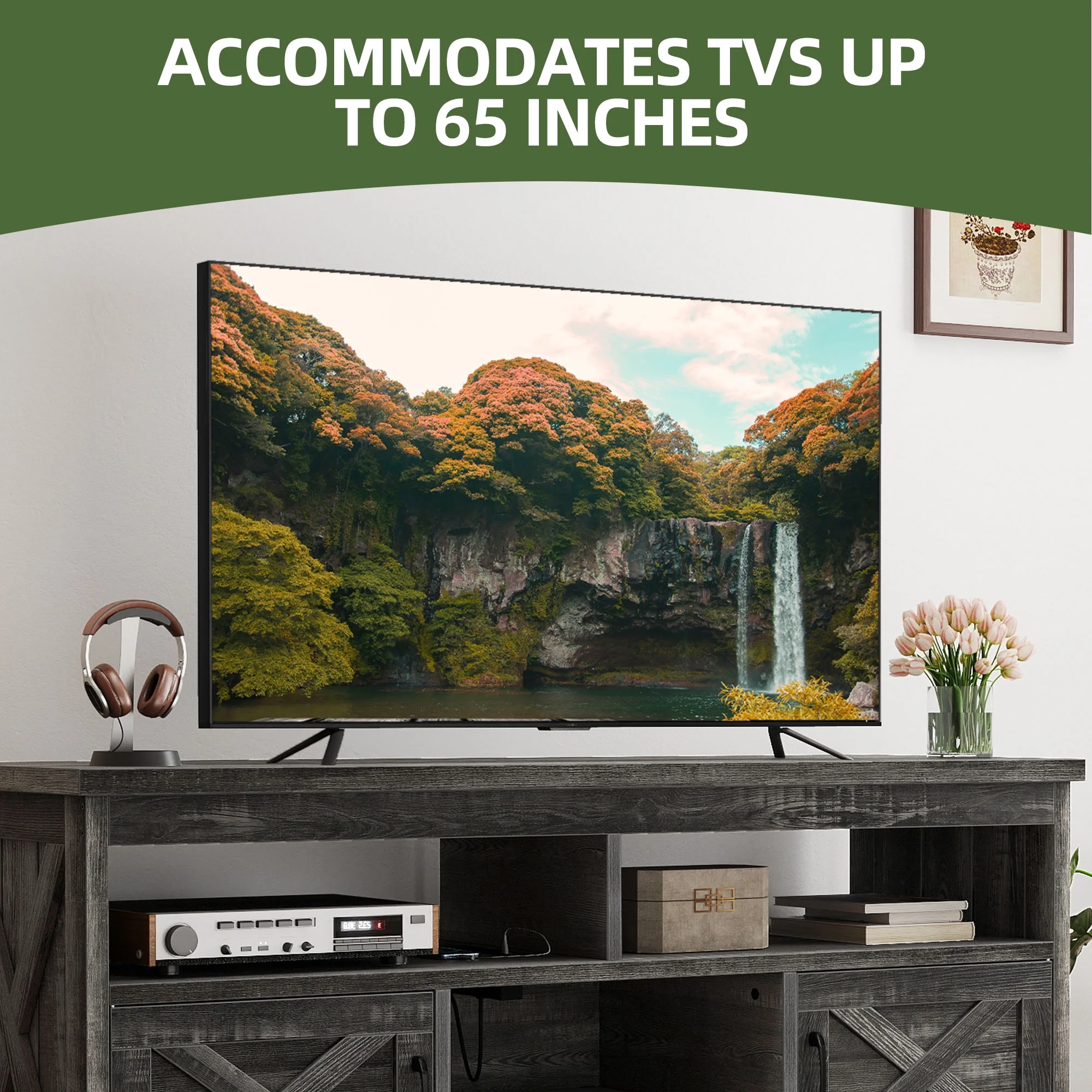 - Multi-Functional Elegance: This 65-inch TV stand isn��t just for your TV. The farmhouse X-shaped barn doors add rustic charm, making it ideal as a coffee bar, storage unit, or entryway cabinet. With easy instructions, assembling is a breeze, even for first-timers.