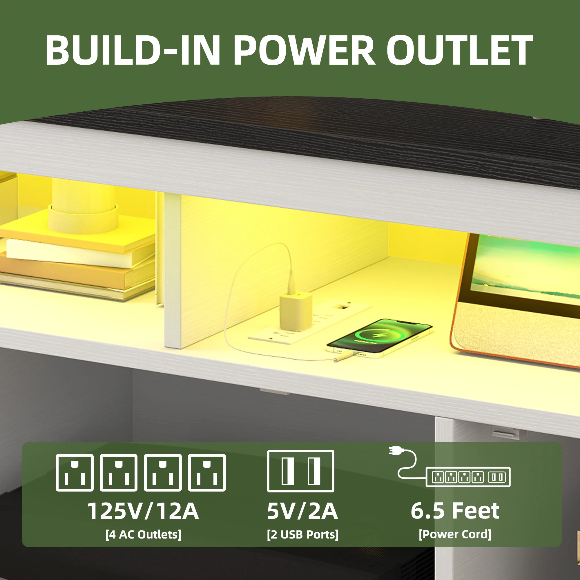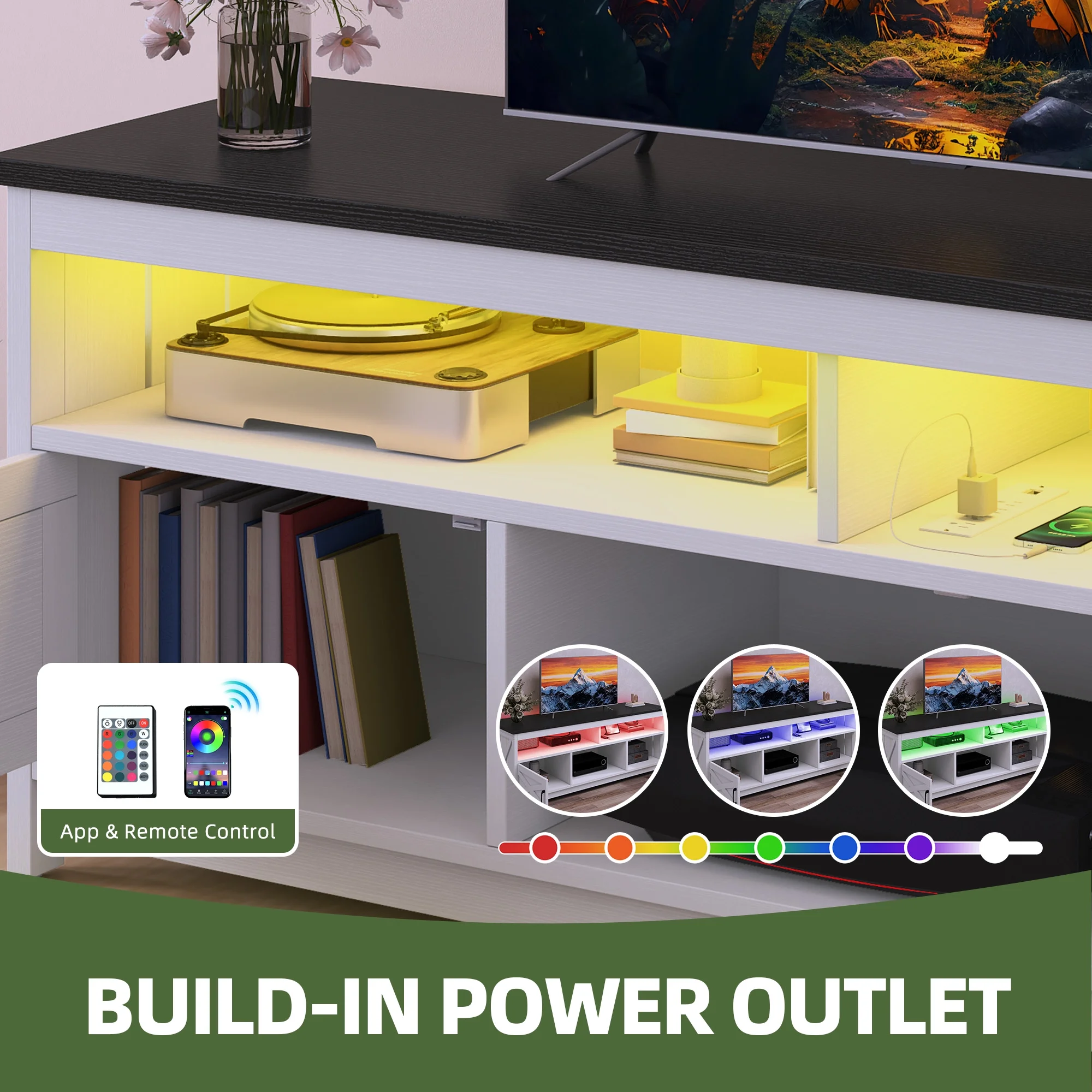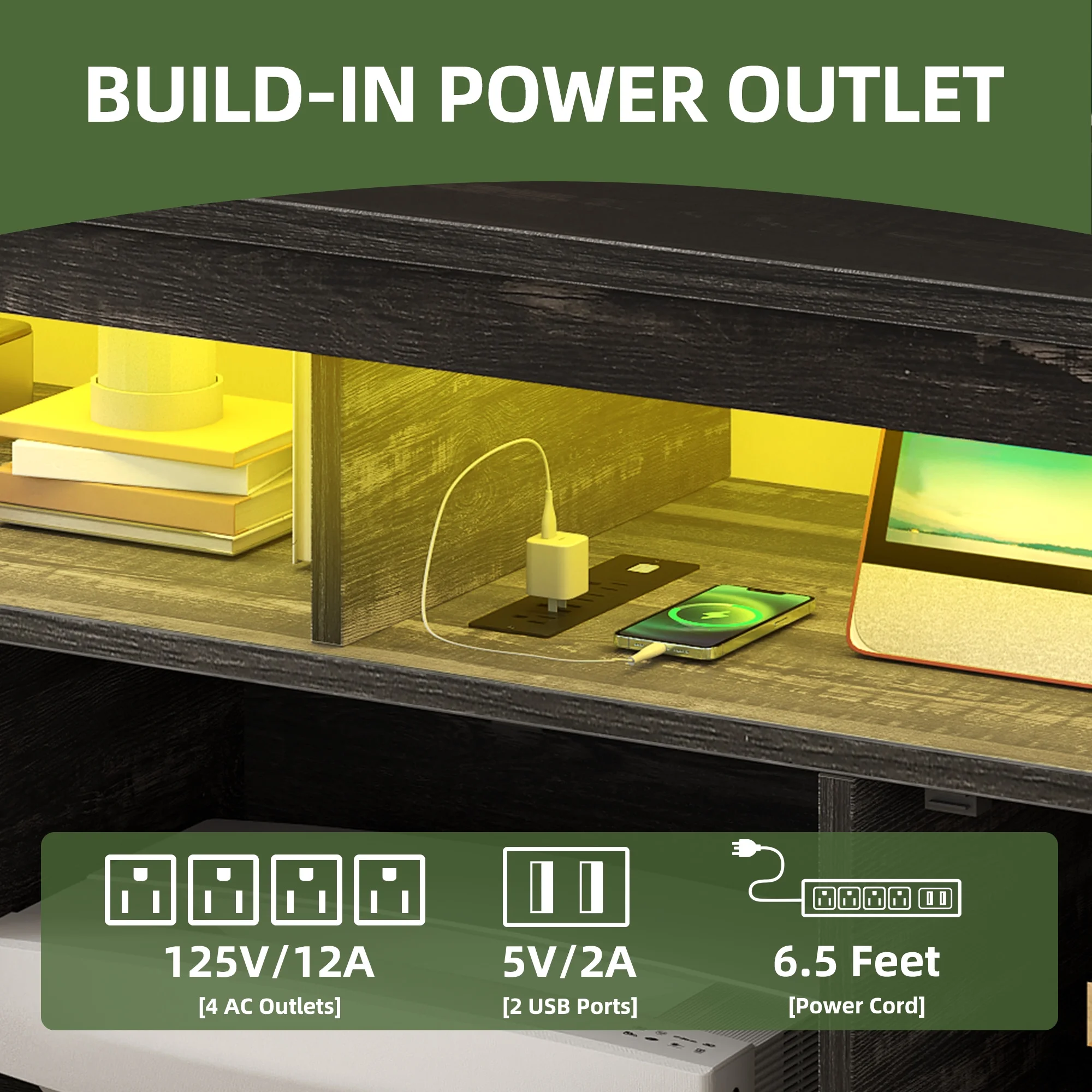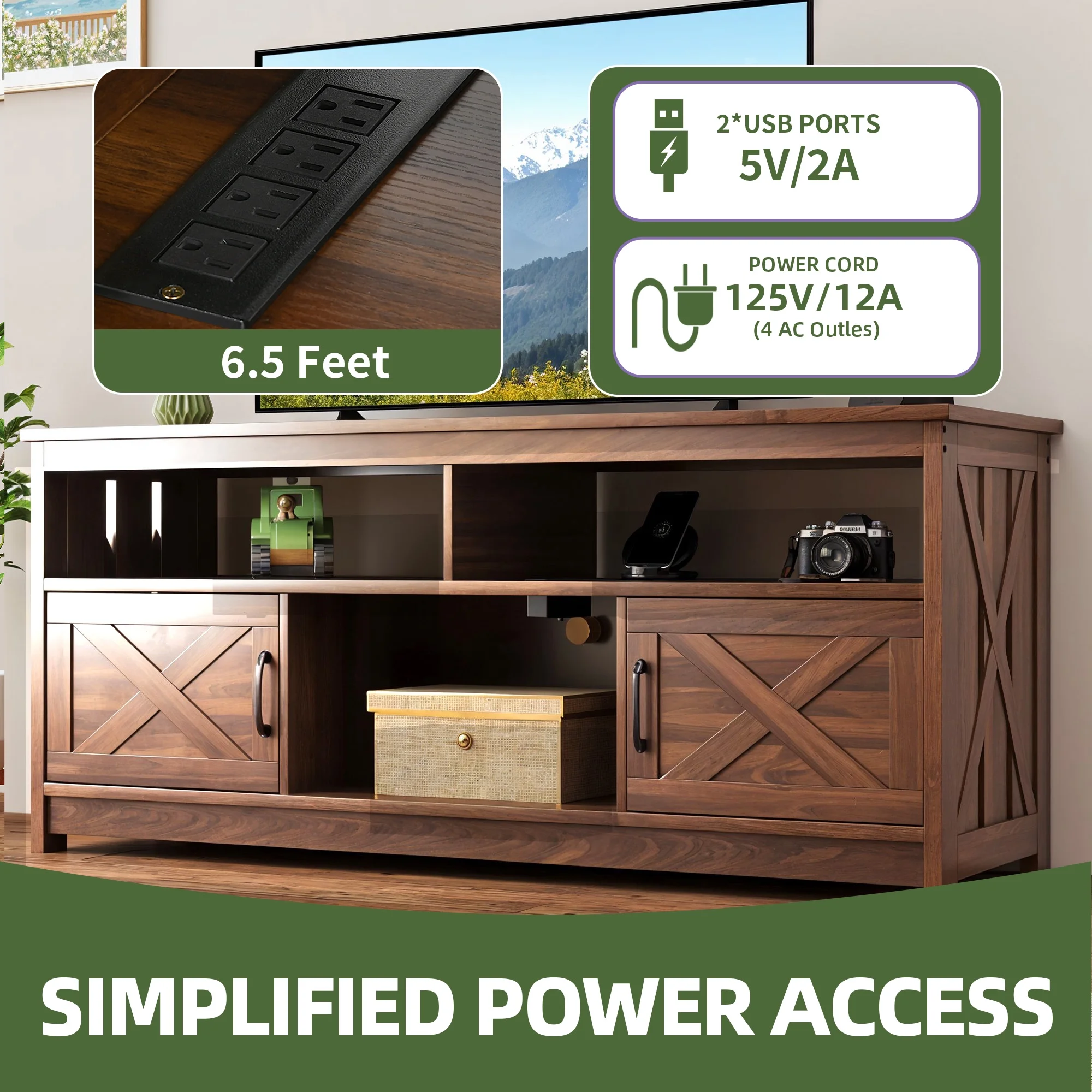 - Stay Powered Up: Say goodbye to outlet overload. With 2 USB ports and 4 standard plug outlets built into the TV stand, charge your TV, Wi-Fi router, DVD player, and more in one spot. No more searching for an outlet when you need it most.