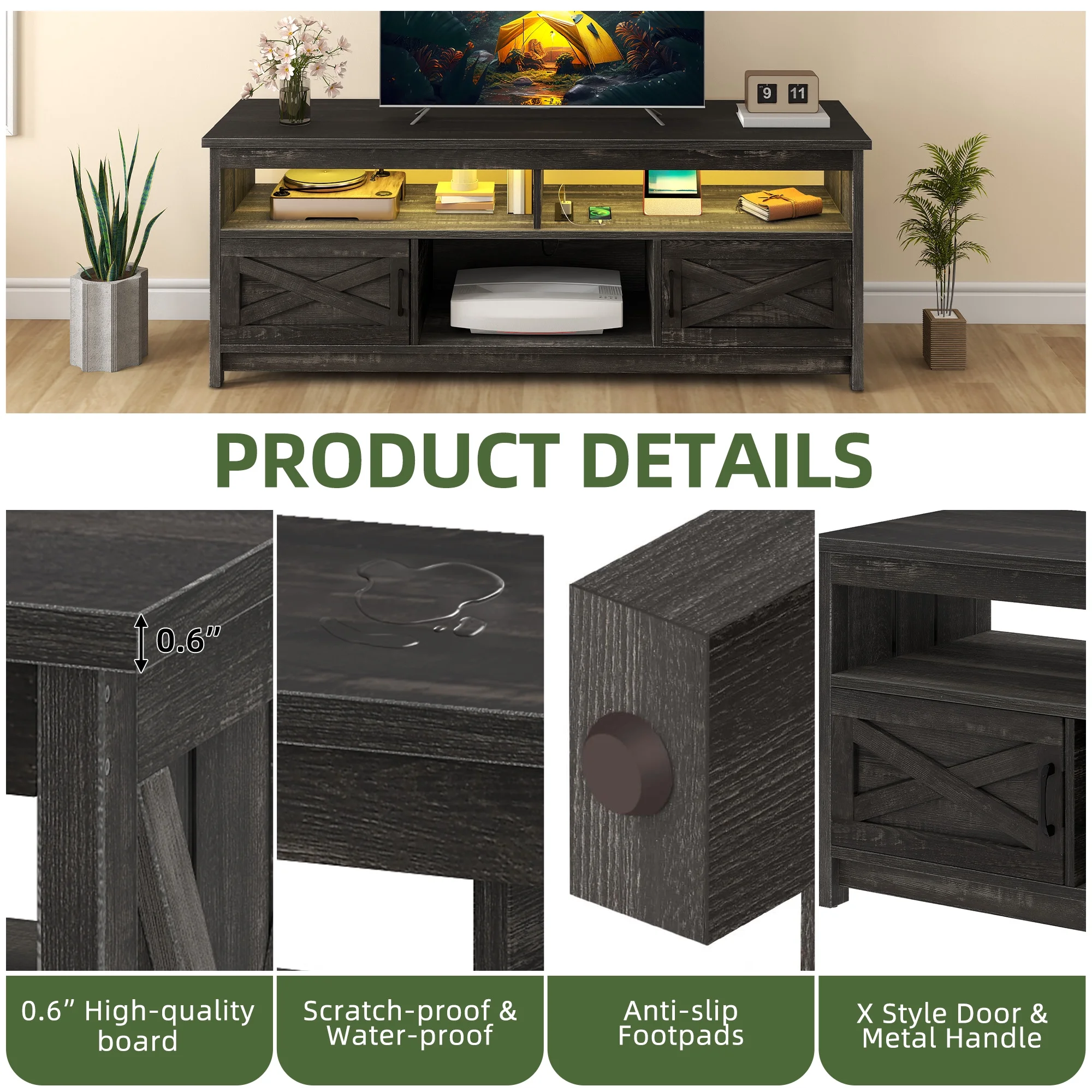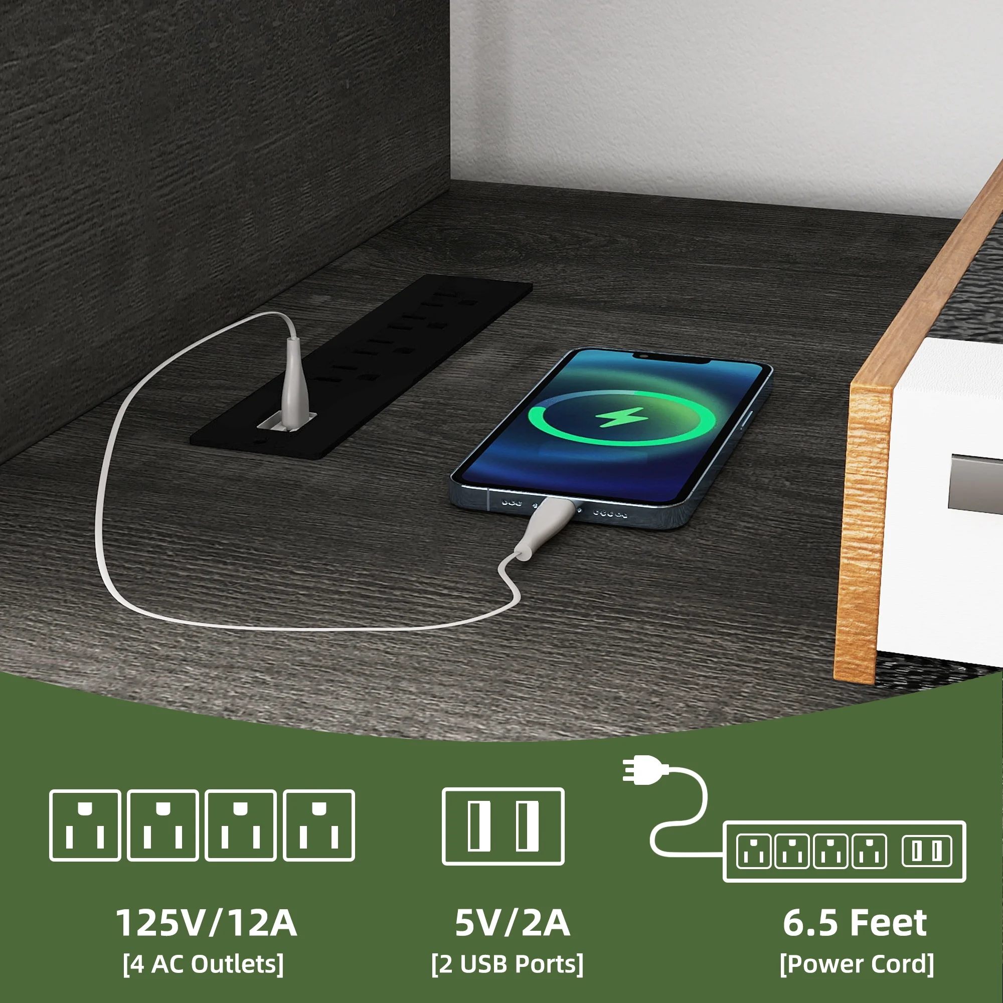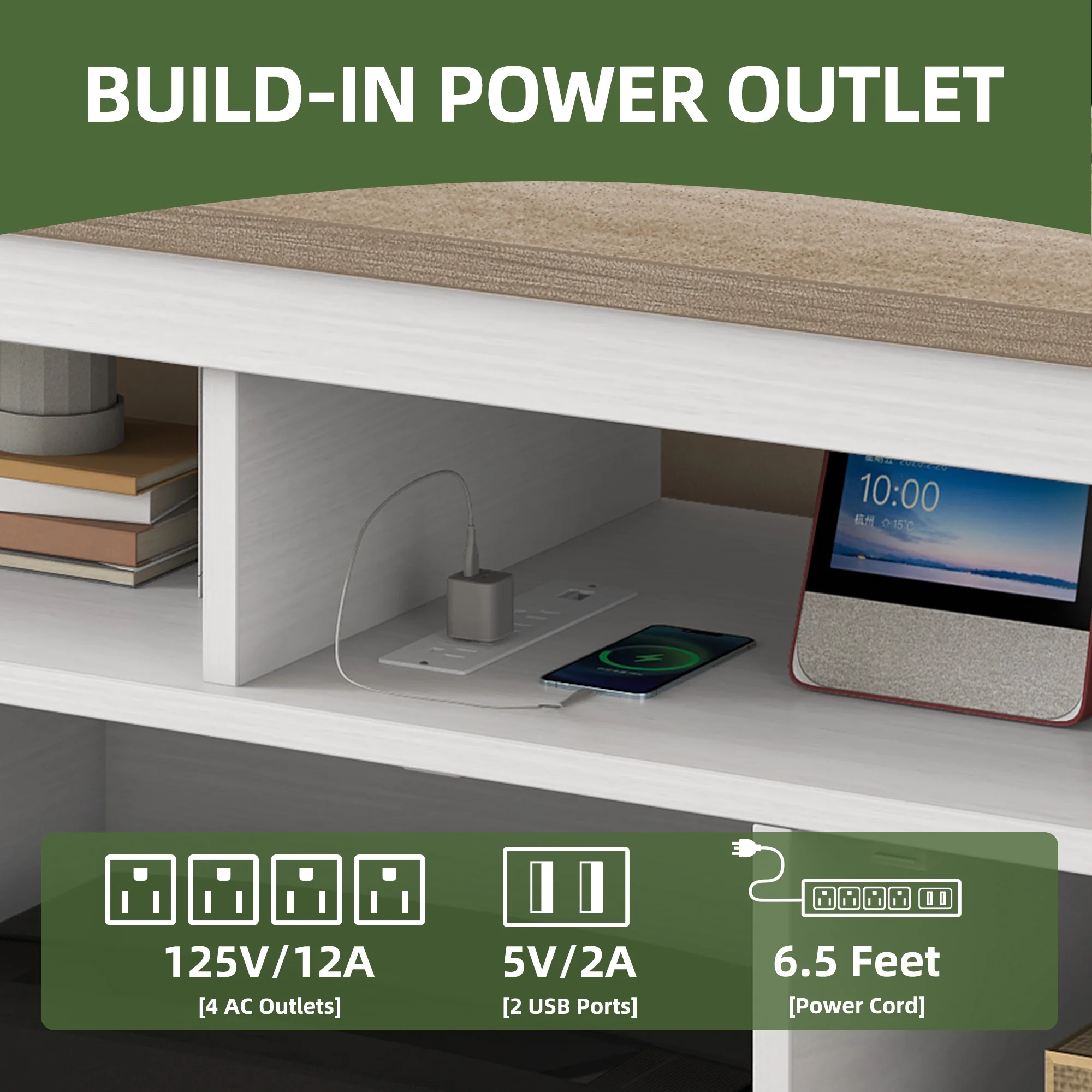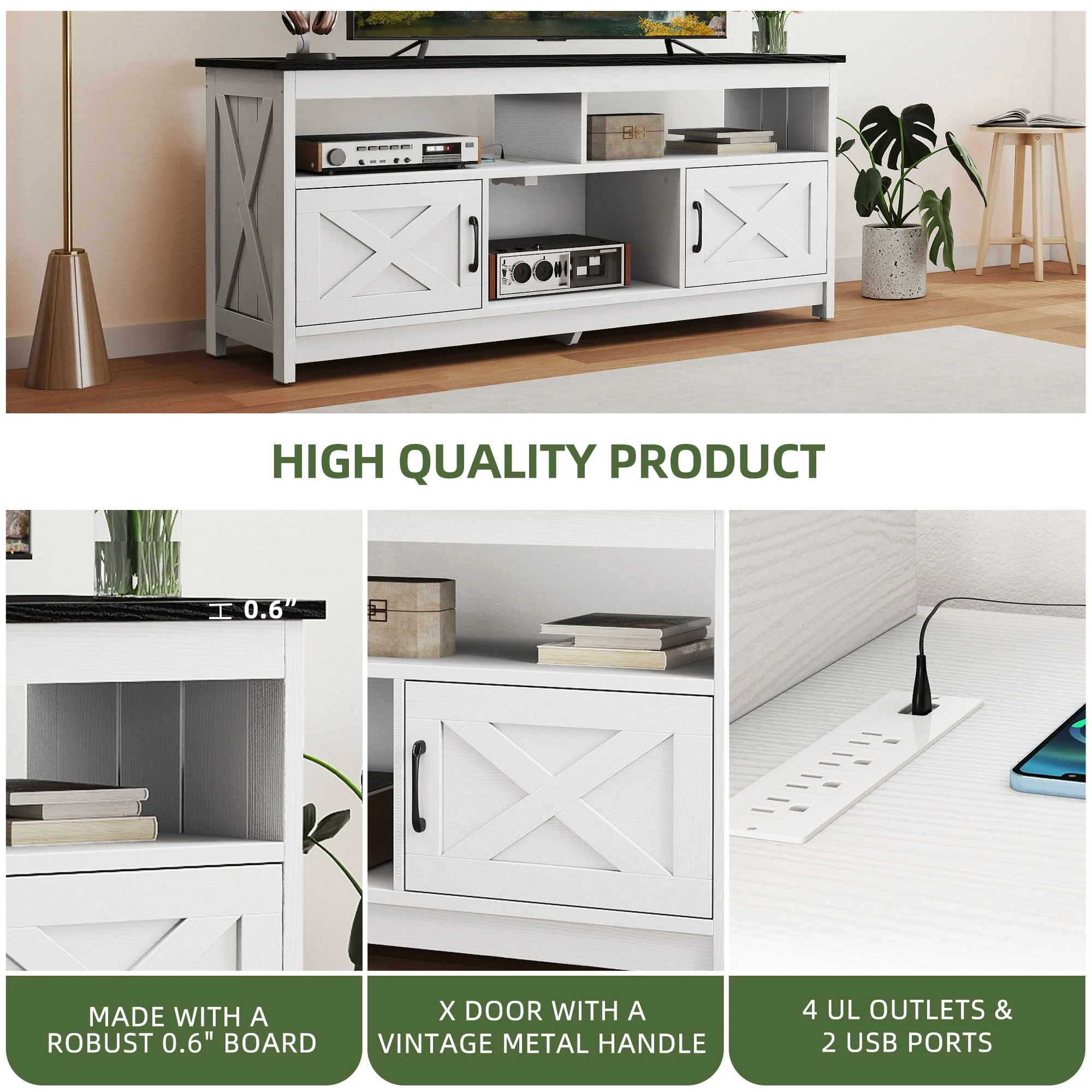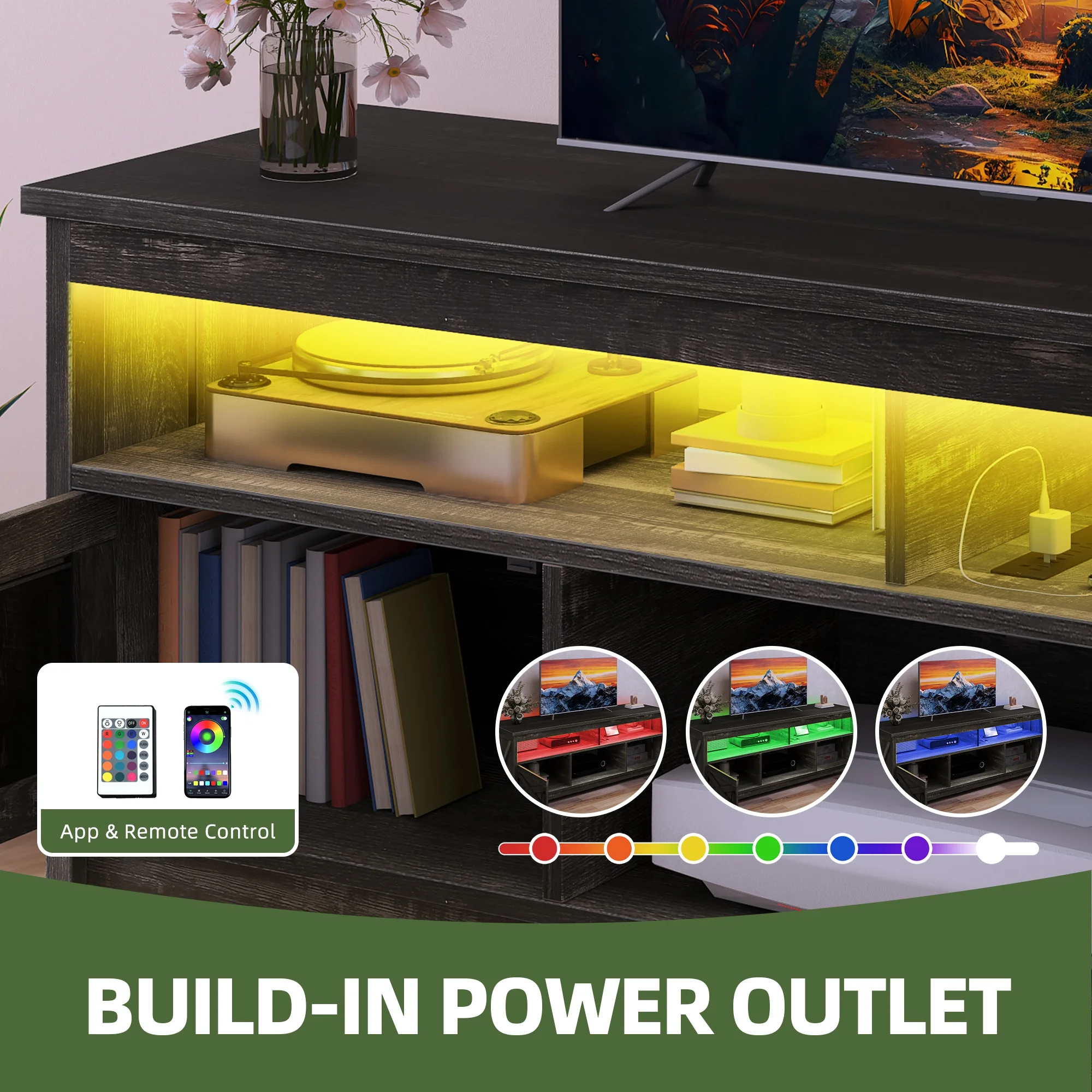 - Stay Powered Up: Say goodbye to outlet overload. With 2 USB ports and 4 standard plug outlets built into the TV stand, charge your TV, Wi-Fi router, DVD player, and more in one spot. No more searching for an outlet when you need it most.