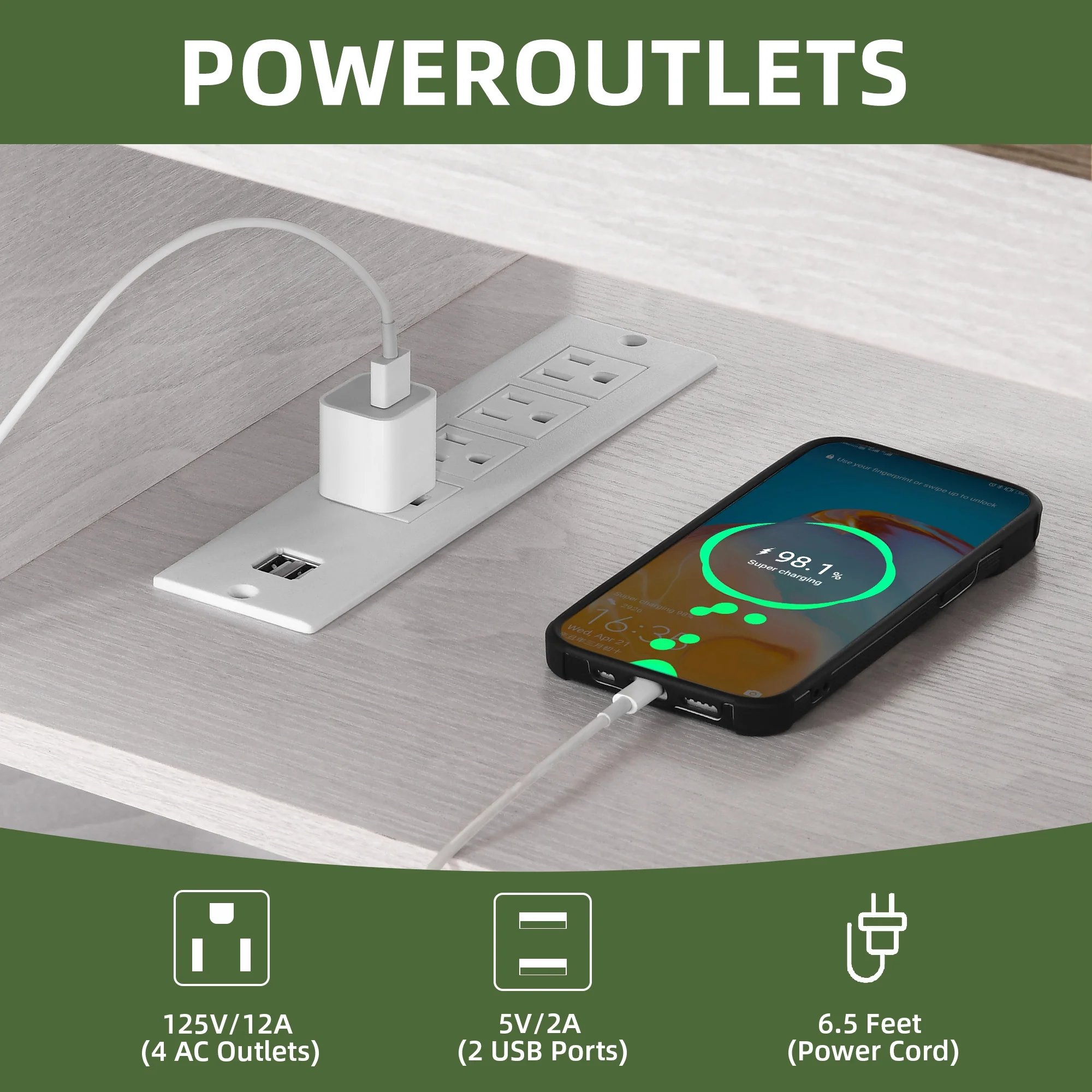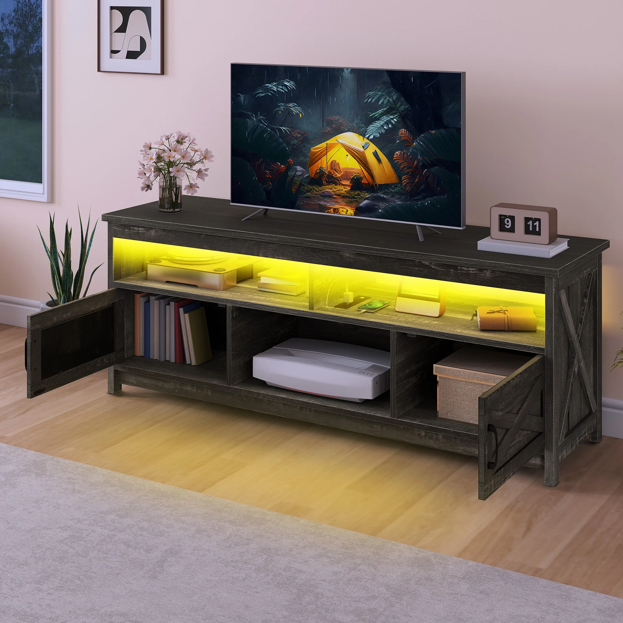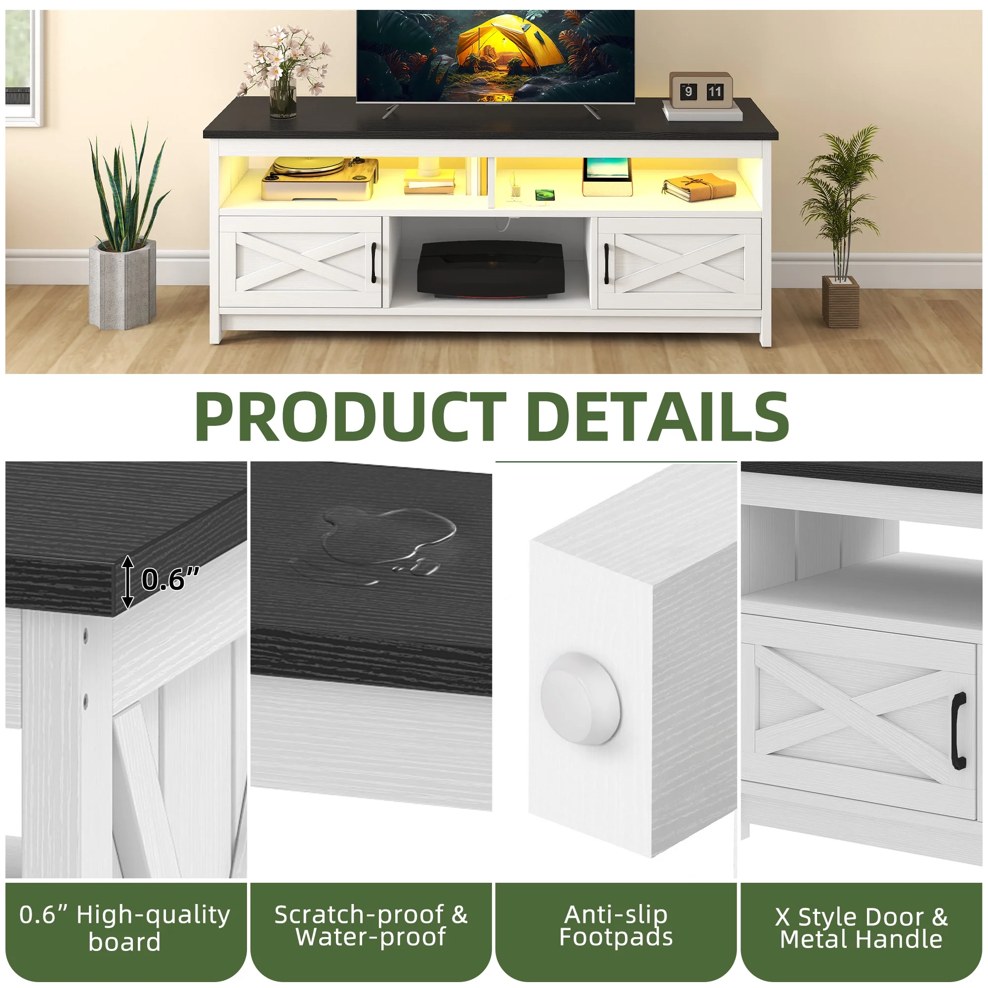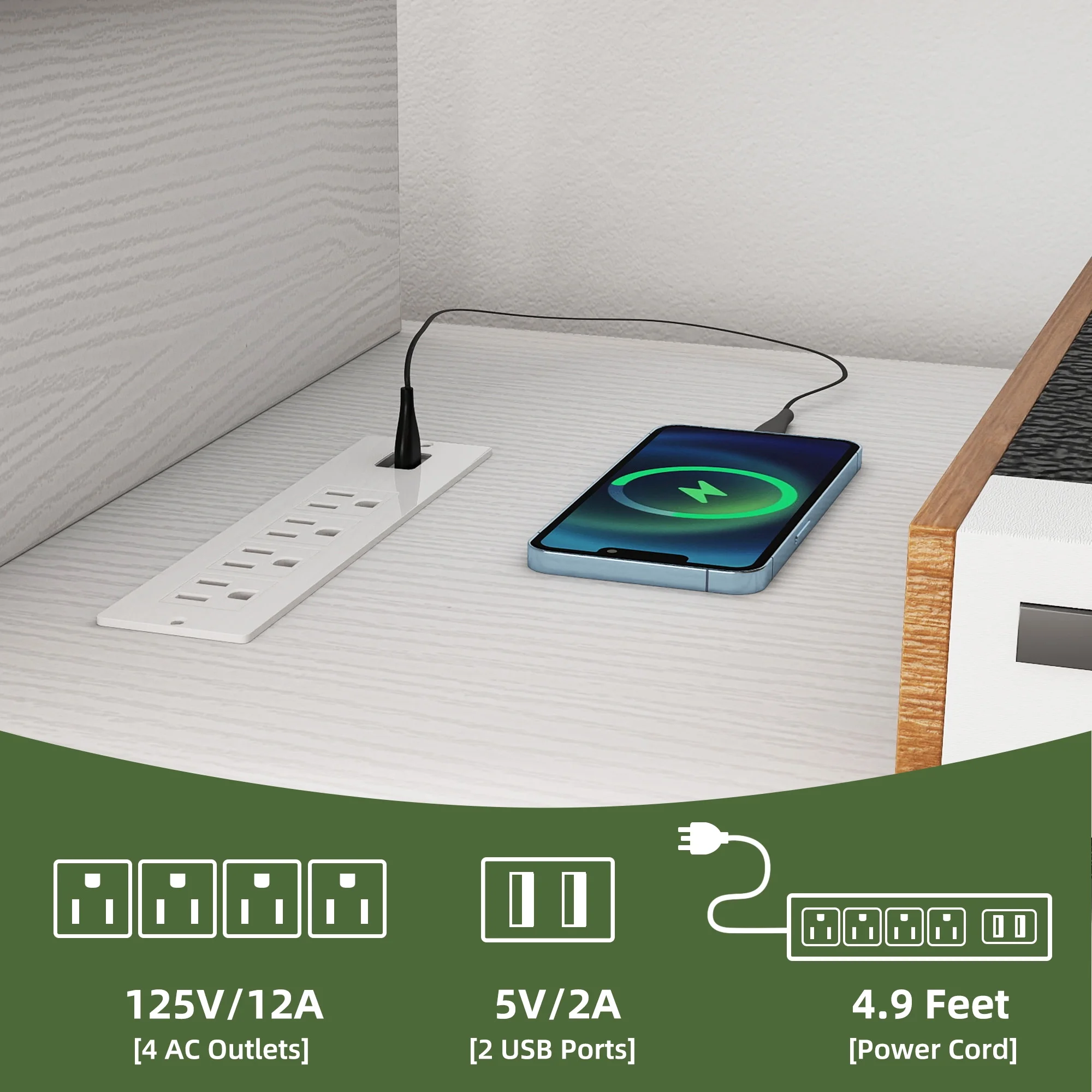 - Stay Powered Up: Say goodbye to outlet overload. With 2 USB ports and 4 standard plug outlets built into the TV stand, charge your TV, Wi-Fi router, DVD player, and more in one spot. No more searching for an outlet when you need it most.