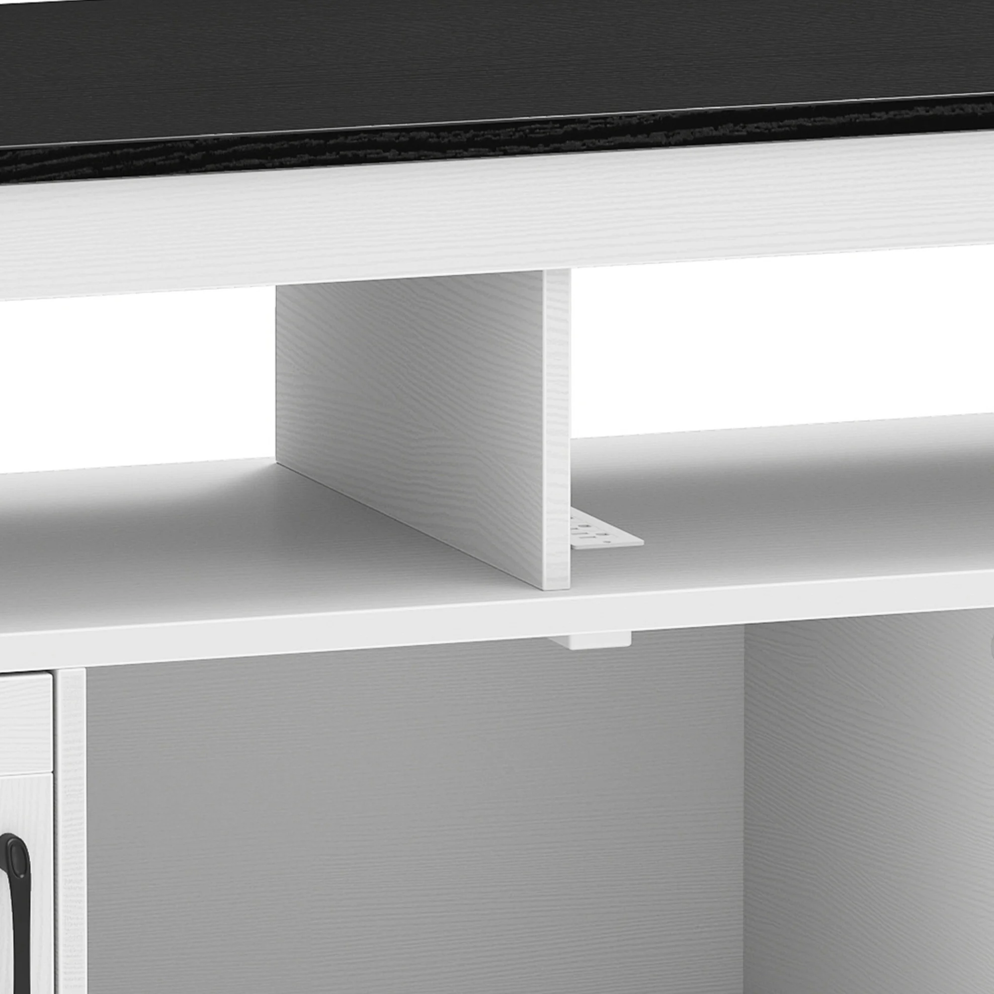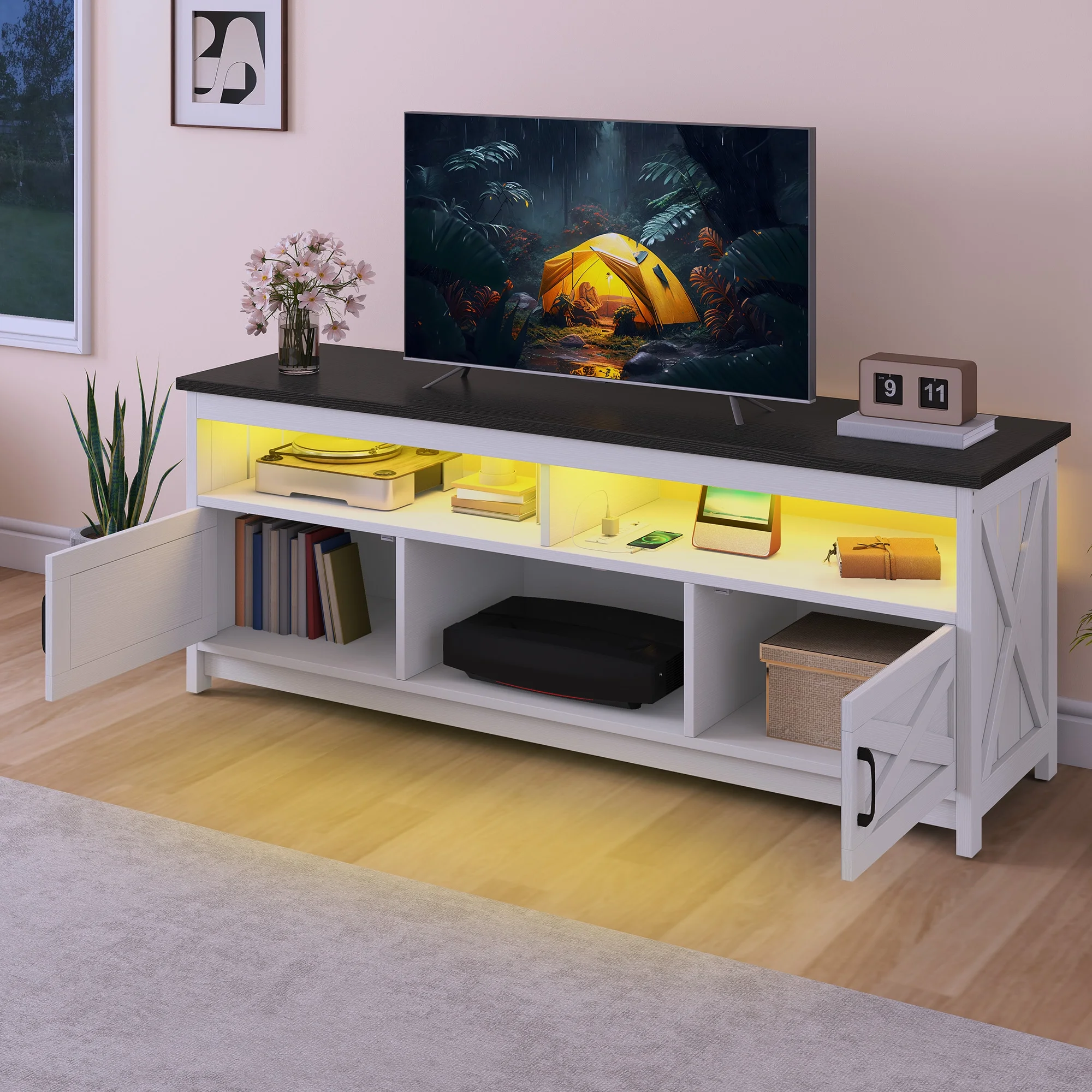 - Clever Storage, Stylish Display: With open shelves to flaunt your decor and hidden compartments to stash the mess, this TV stand keeps everything in its place. The generous cable cutout ensures your cords stay neatly tucked away for a sleek, organized look.