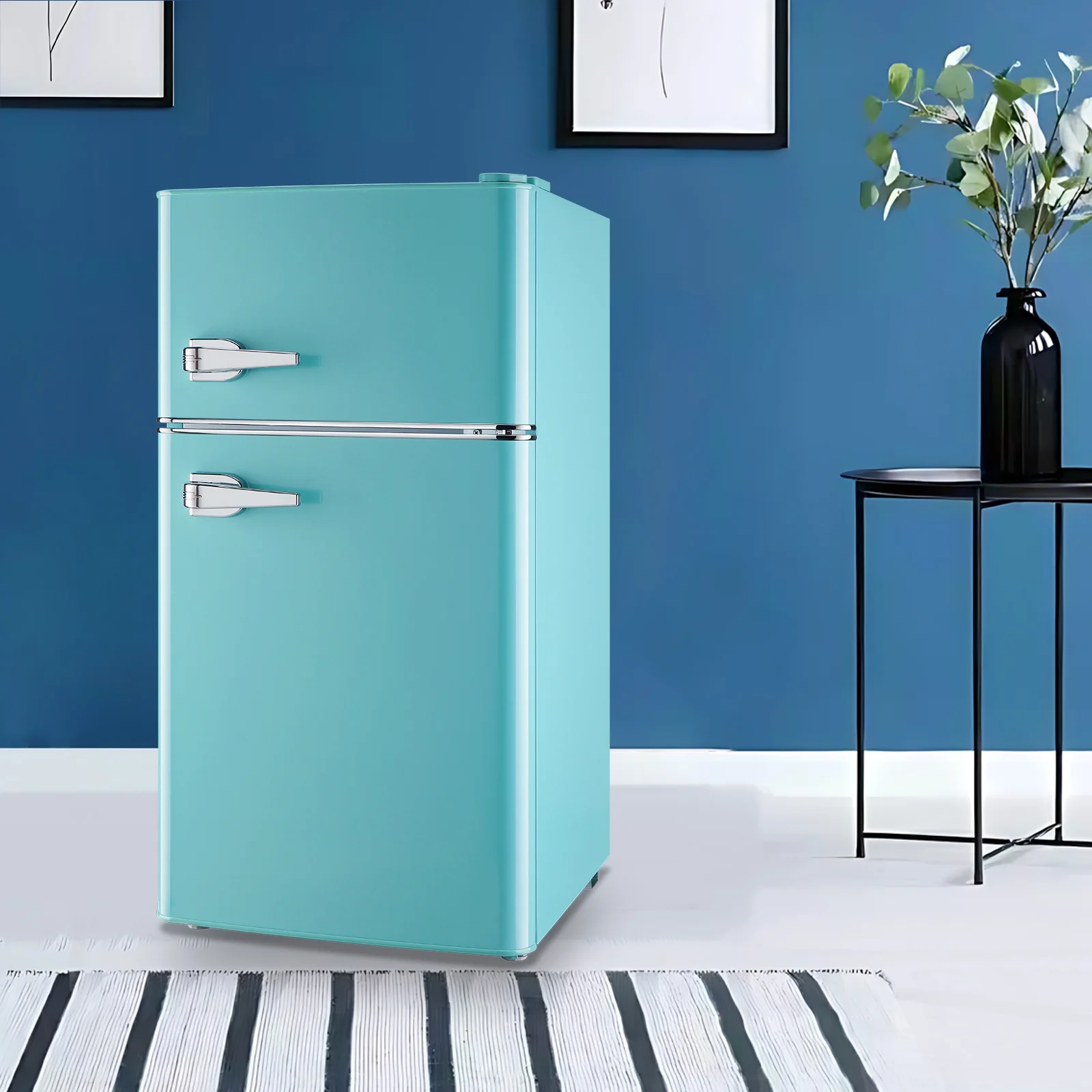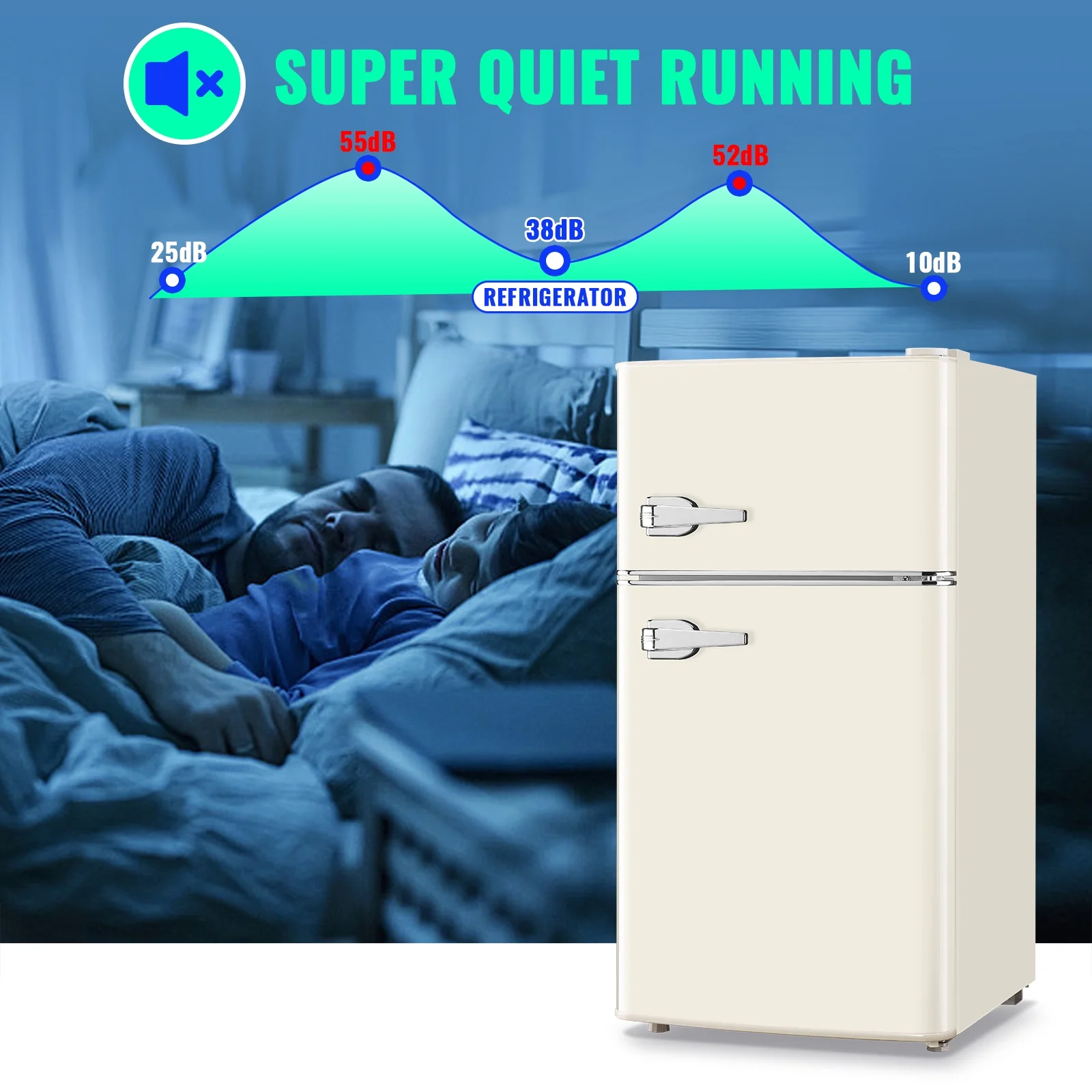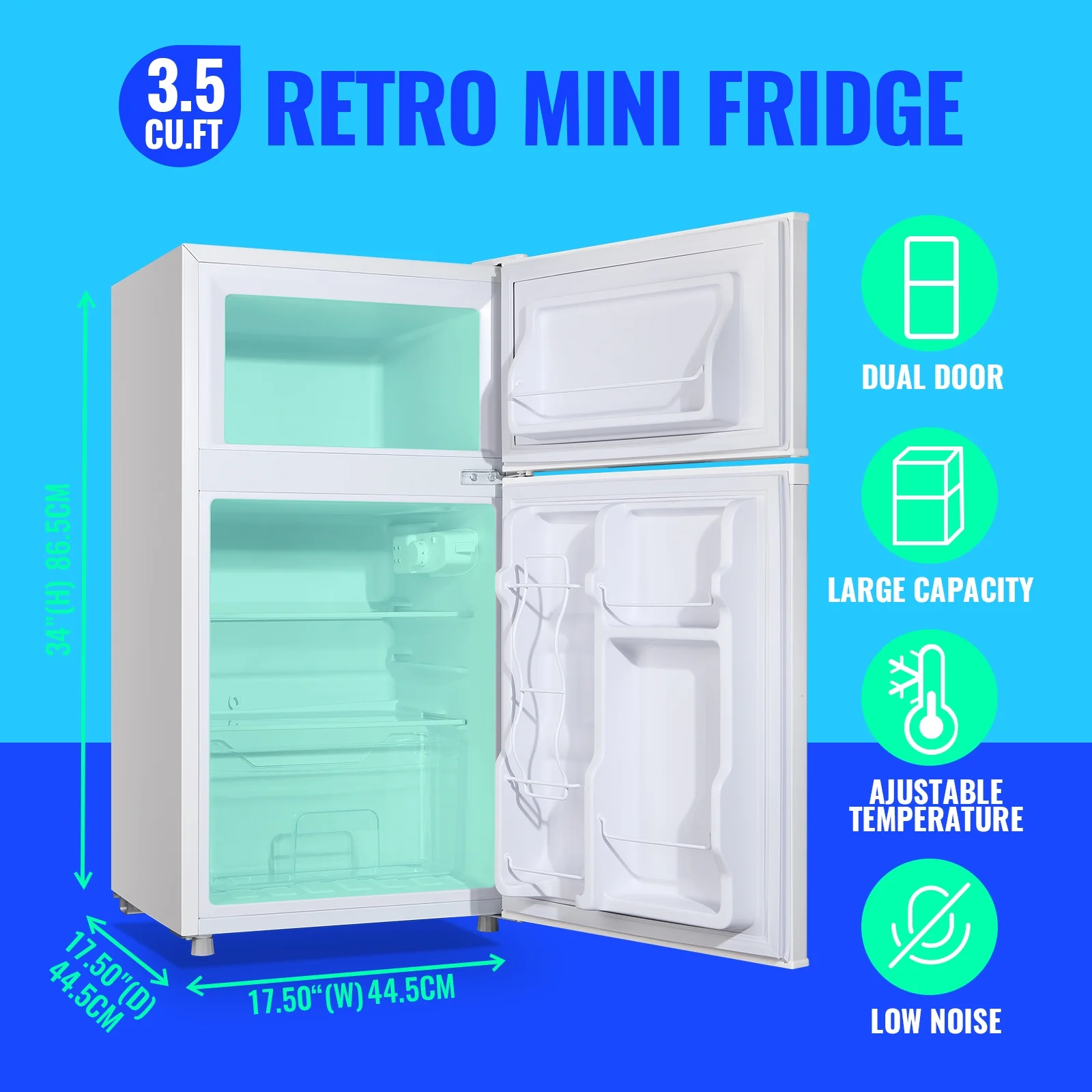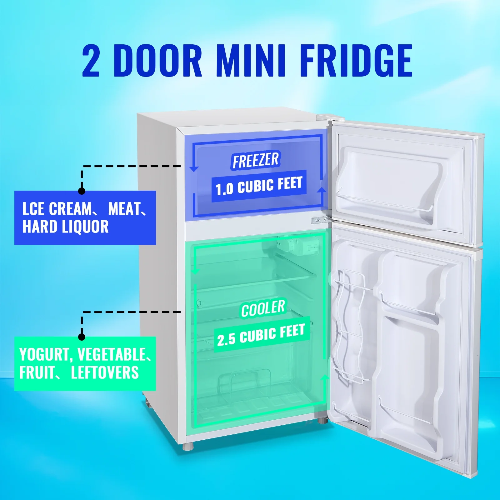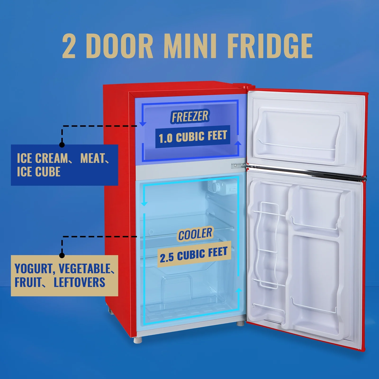 - Double Door Versatility: This mini fridge offers a double door design, featuring 1.0 Cu.Ft of refrigerator space for vegetables and a 2.5 Cu.Ft freezer section for meat and ice cream. This provides versatile storage options, allowing you to easily organize and access your fresh and frozen foods, catering to all your refrigeration needs in one convenient unit.
