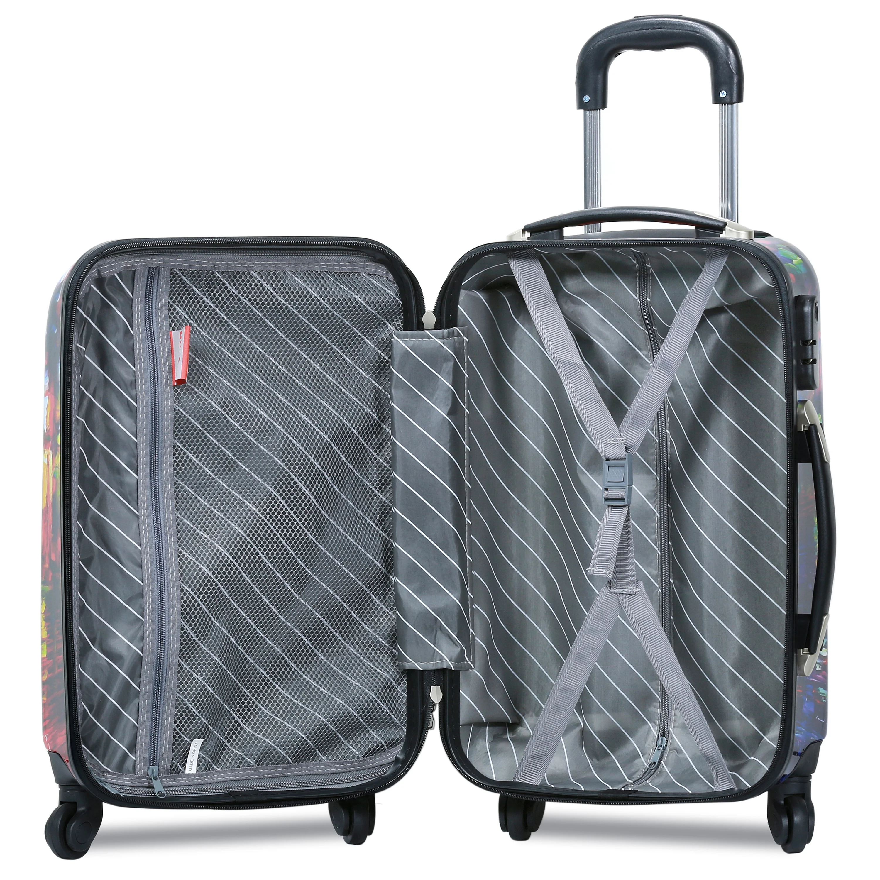 - Polycarbonate hard side shell, fully lined interior features a zipper divider, accessory pocket and compression straps
