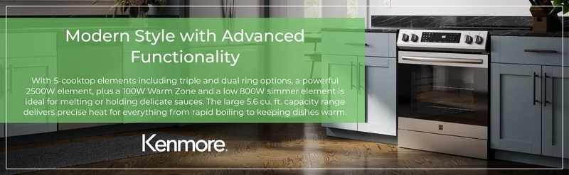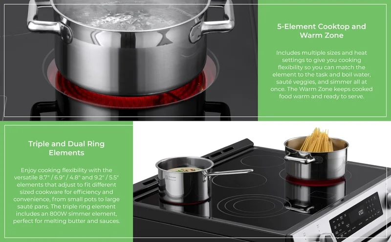 - 5-ELEMENT COOKTOP AND WARM ZONE: Includes multiple sizes and heat settings to give you cooking flexibility so you can match the element to the task; the Warm Zone keeps cooked food warm and ready to serve