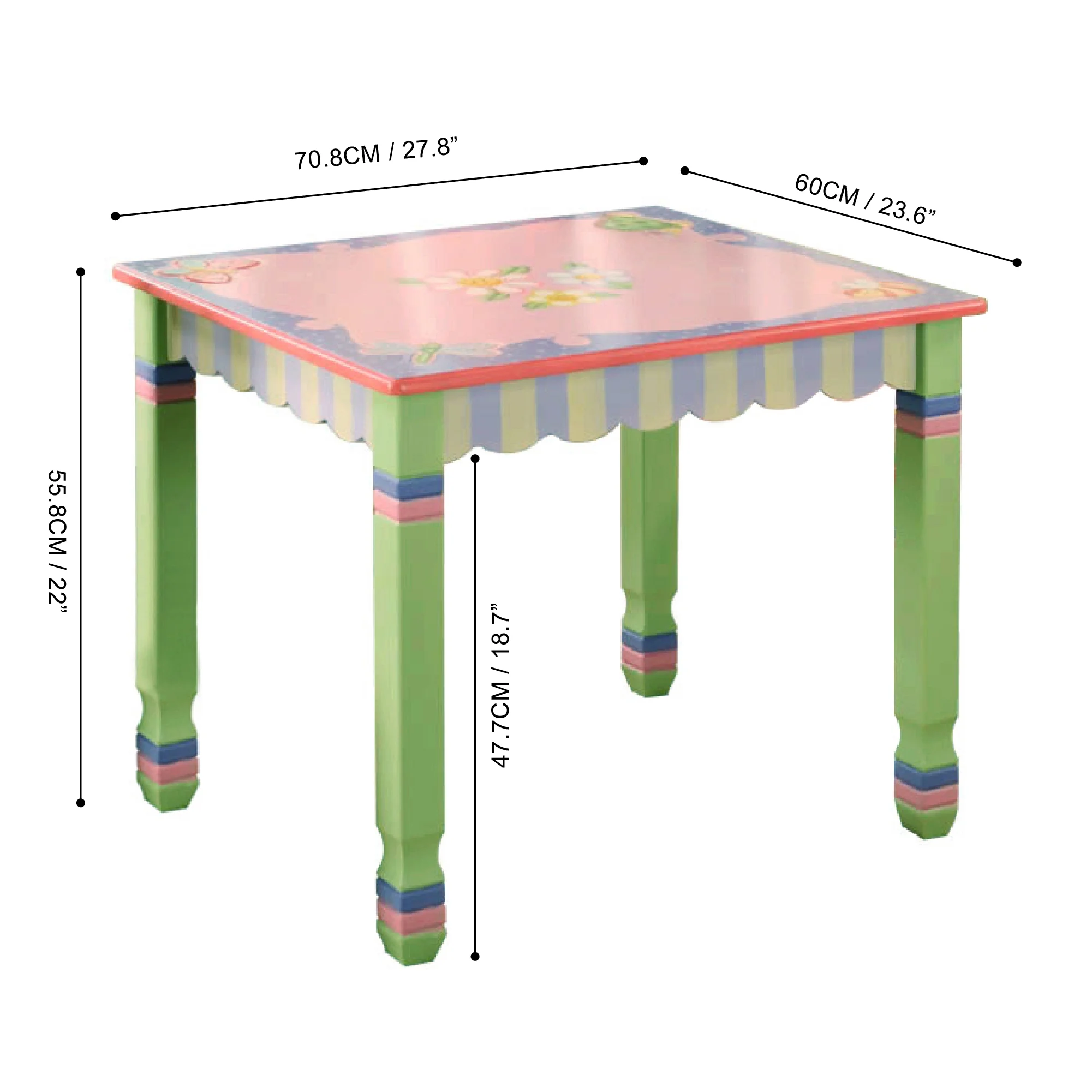 - Green square spindle legs with decorative stripes and floral tabletop