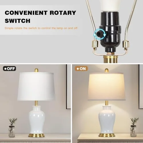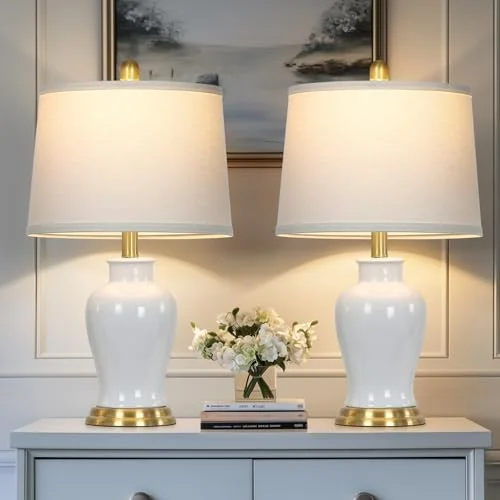 Modern Ceramic Table Lamps Set of 2, 23" White Ceramic Lamps for Living Room, Rustic Farmhouse Bedside Lamp with Ginger Jar Design, Elegant Bedroom Lamp for Nightstand Desk Side End Table Home Decor