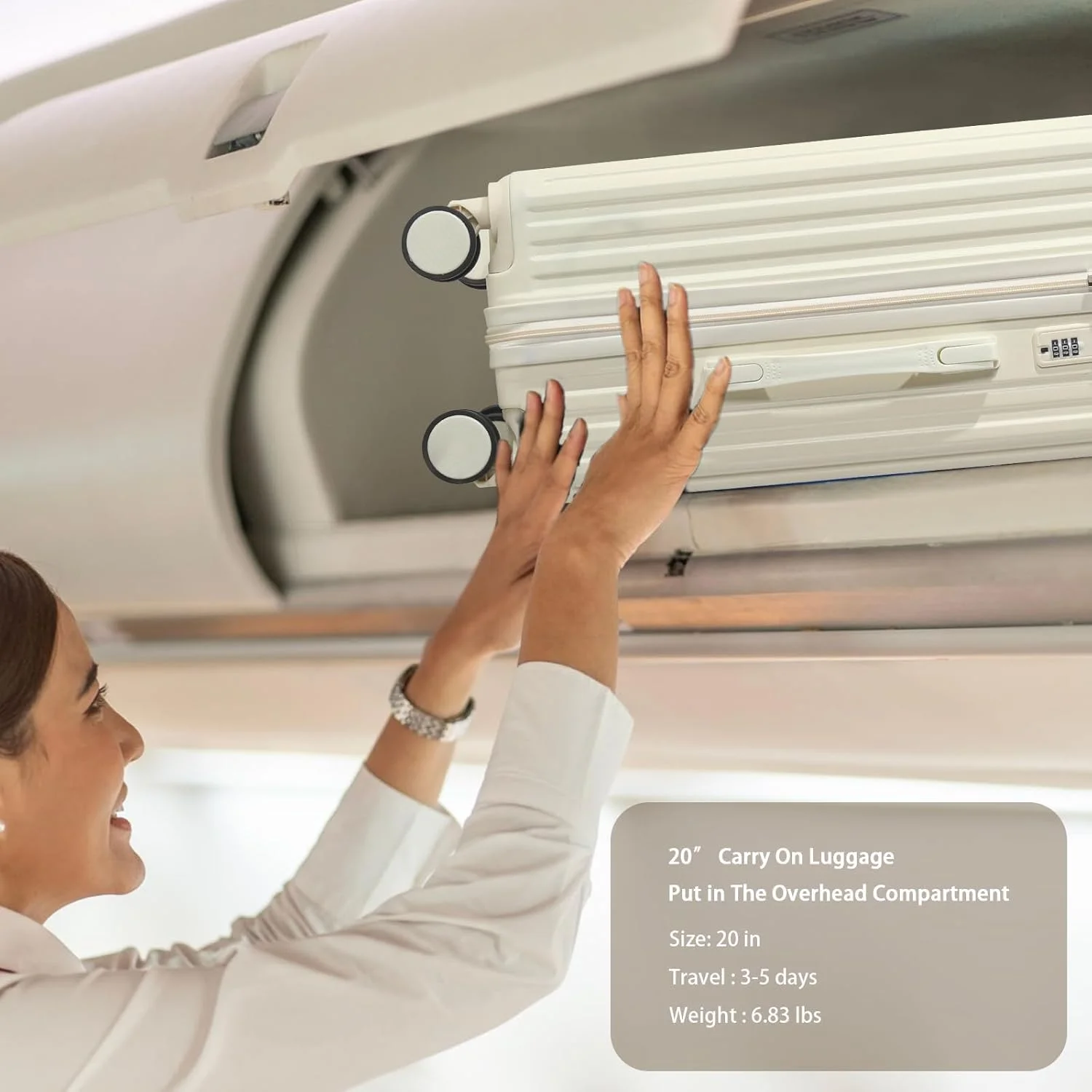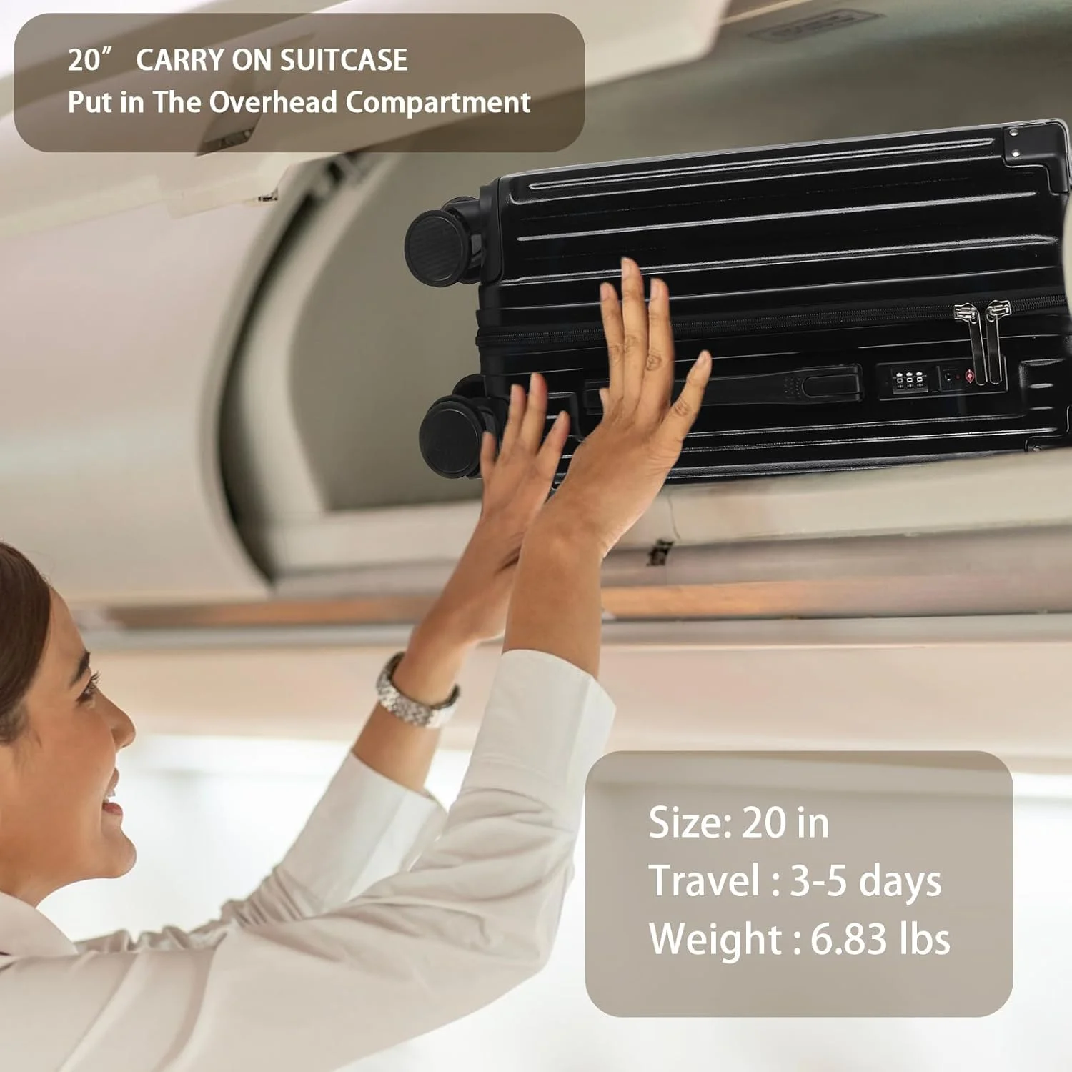 - ��Lightweight Durable Material AND Airline Approved Luggage��The luggage is crafted from PC (Polycarbonate) material, Enhance the suitcase to be even lighter yet sturdy, ensuring prolonged durability for extended use.Dimensions: 36.5x24x57cm (including wheel and handle height), weighing only 3.1kg. The 20in carry-on luggage is designed to meet the carry-on limitations of most major airlines worldwide. It fits conveniently in the overhead compartment, eliminating additional handling fees.