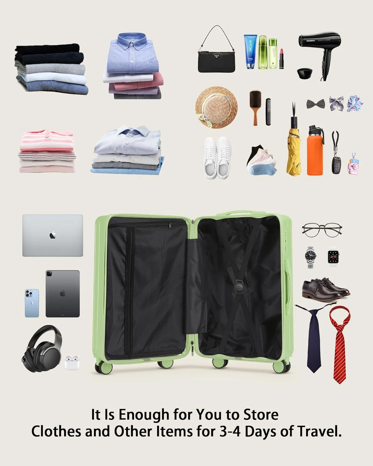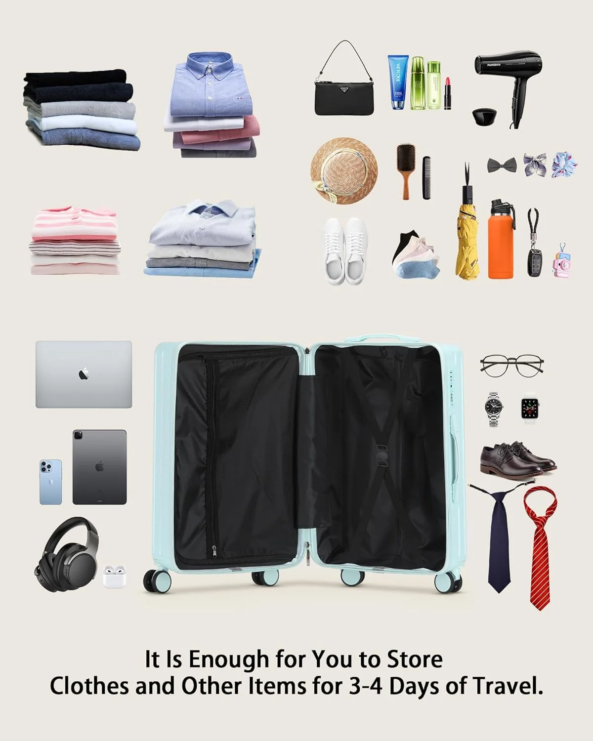 - ��Pack Smart, Pack More��Our travel suitcase optimizes your packing volume. Its twin main compartments, complete with compression straps, hold your clothes and belongings securely while reducing creases. A specially designed built-in pocket caters to smaller items. Every inch is thoughtfully designed to deliver maximum storage, so you can carry and travel more.
