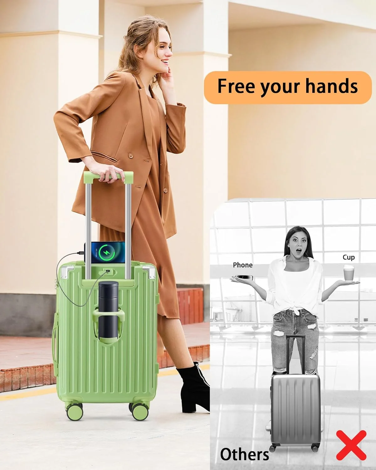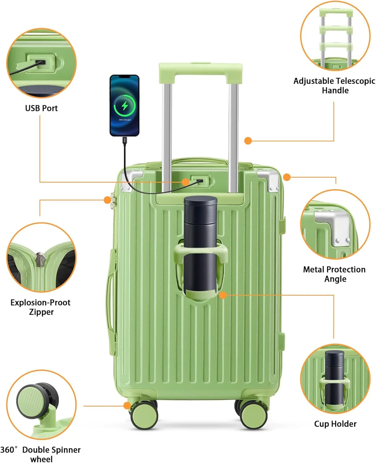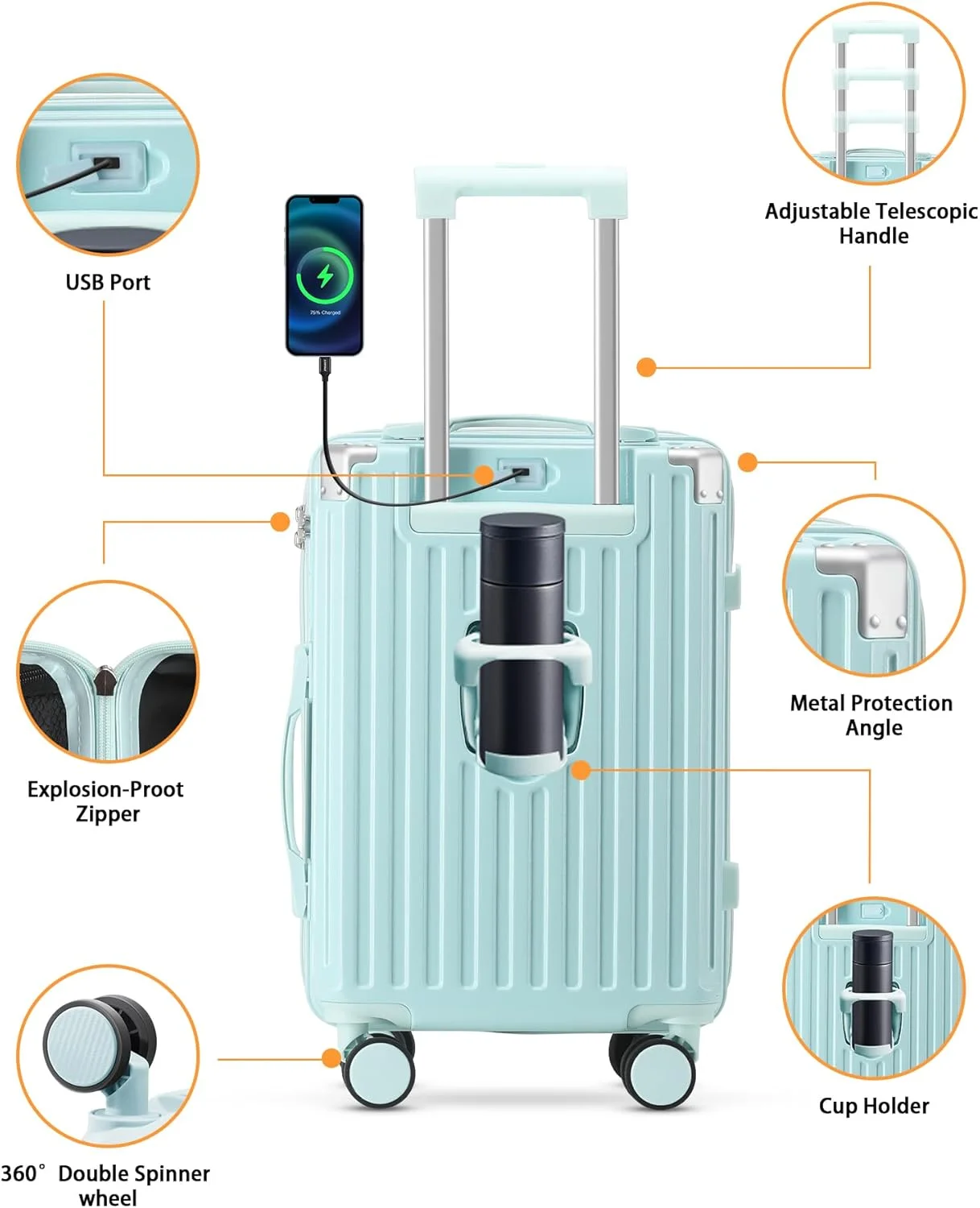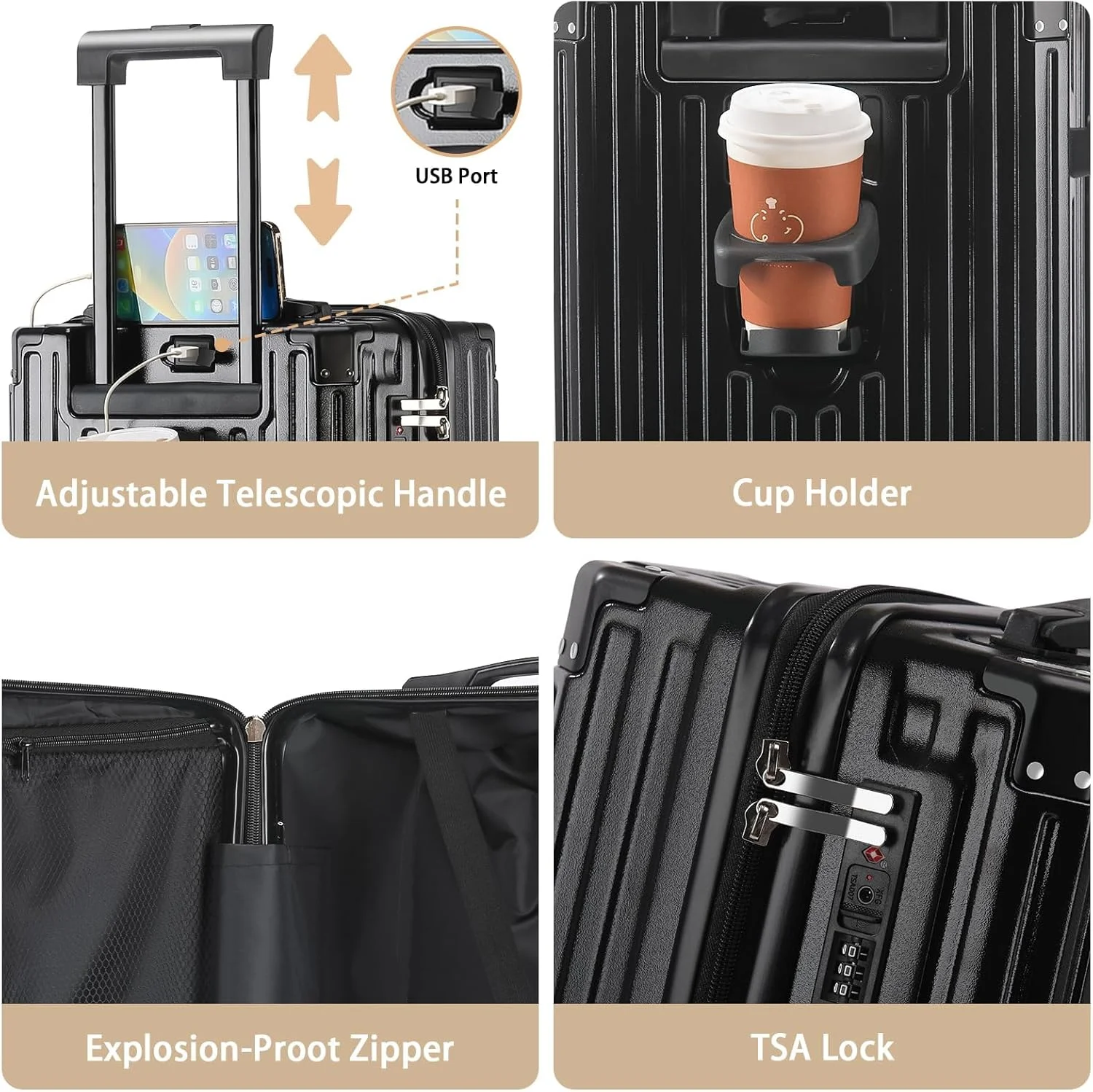 ��Multifunctional Holder Design AND Built-in USB Port��This Luggage with cup holder especially designed water cup holder and hook on the luggage case, all is to provide a comfortable and convenient travel experience.The suitcase with a built-in USB port(Power bank not included), provide quick connection to your portable electronic device for a quick charge.Not worried about the phone is out of power any more.