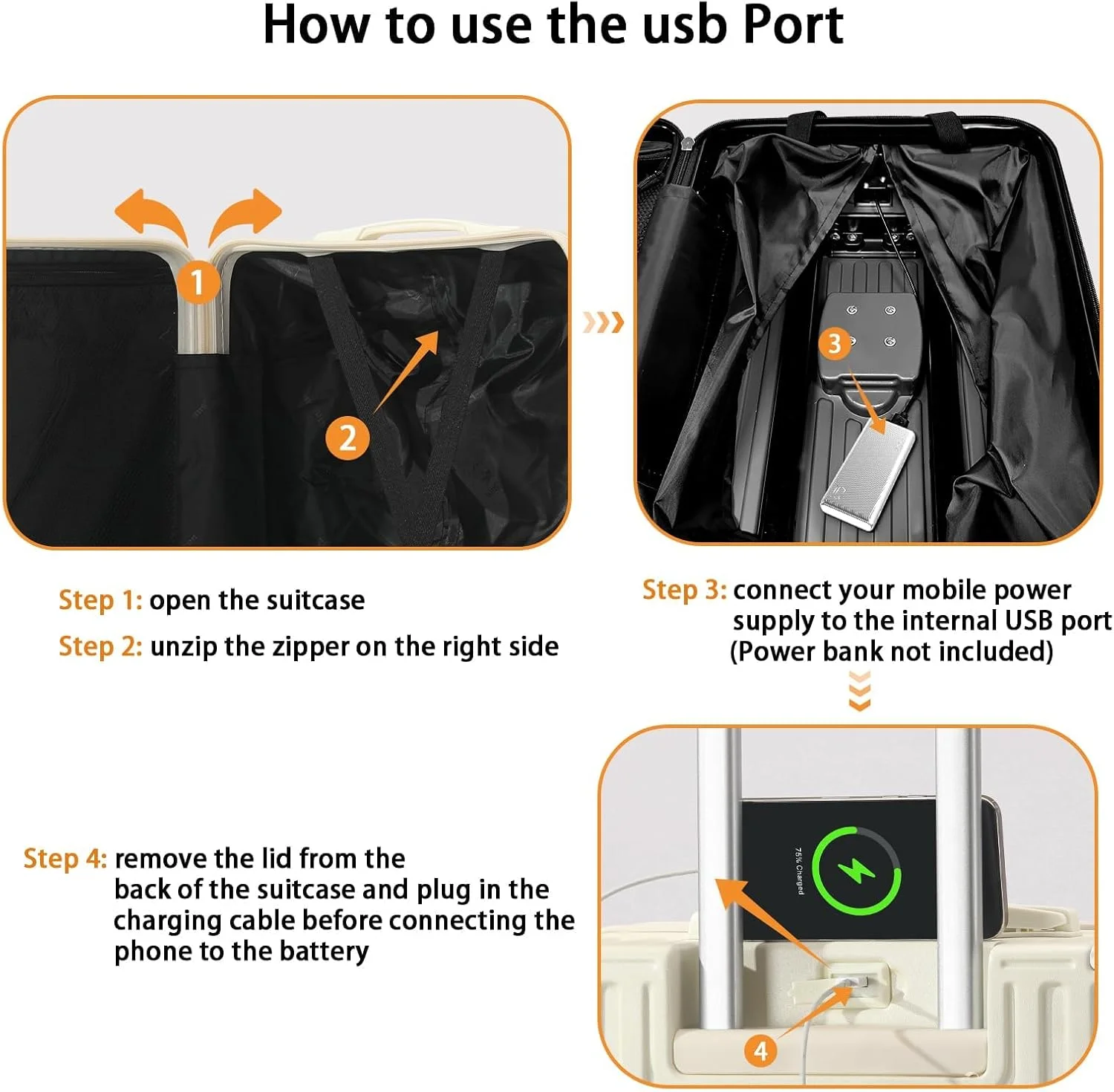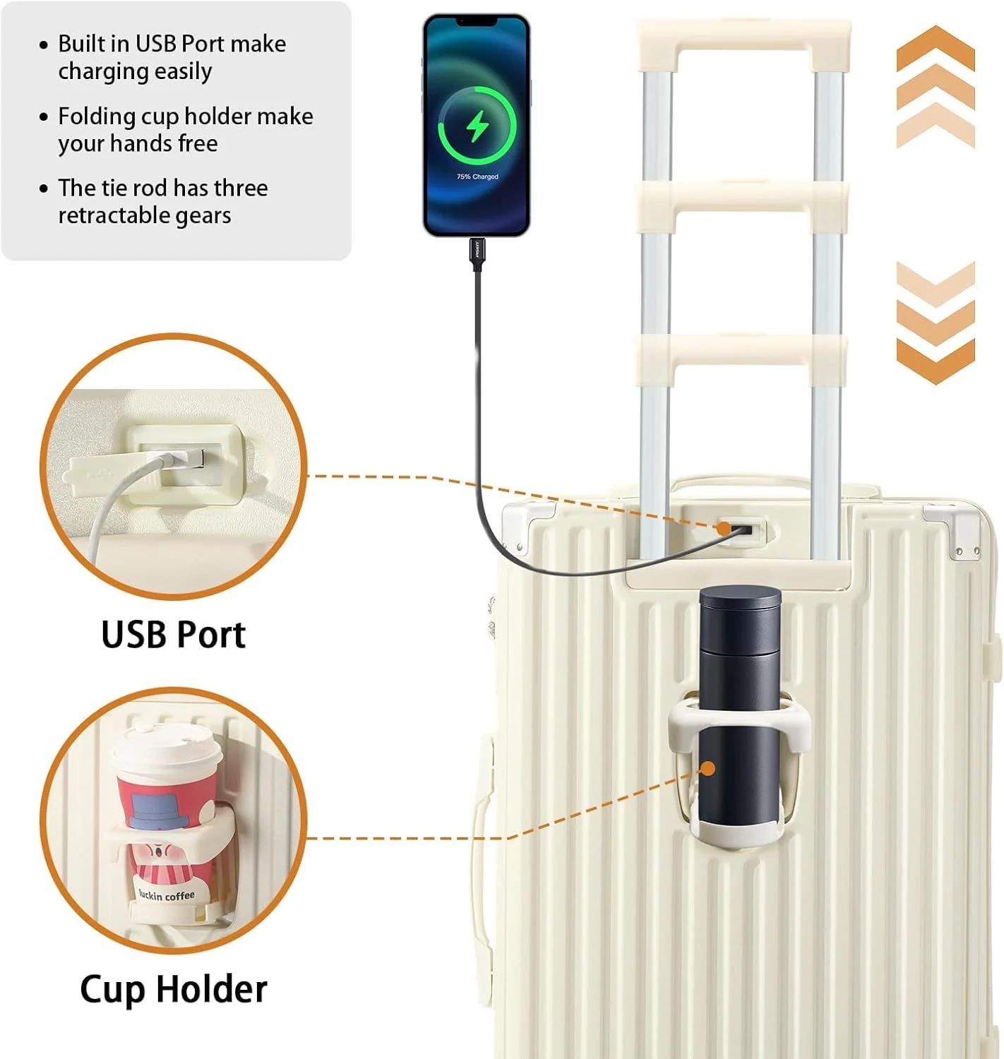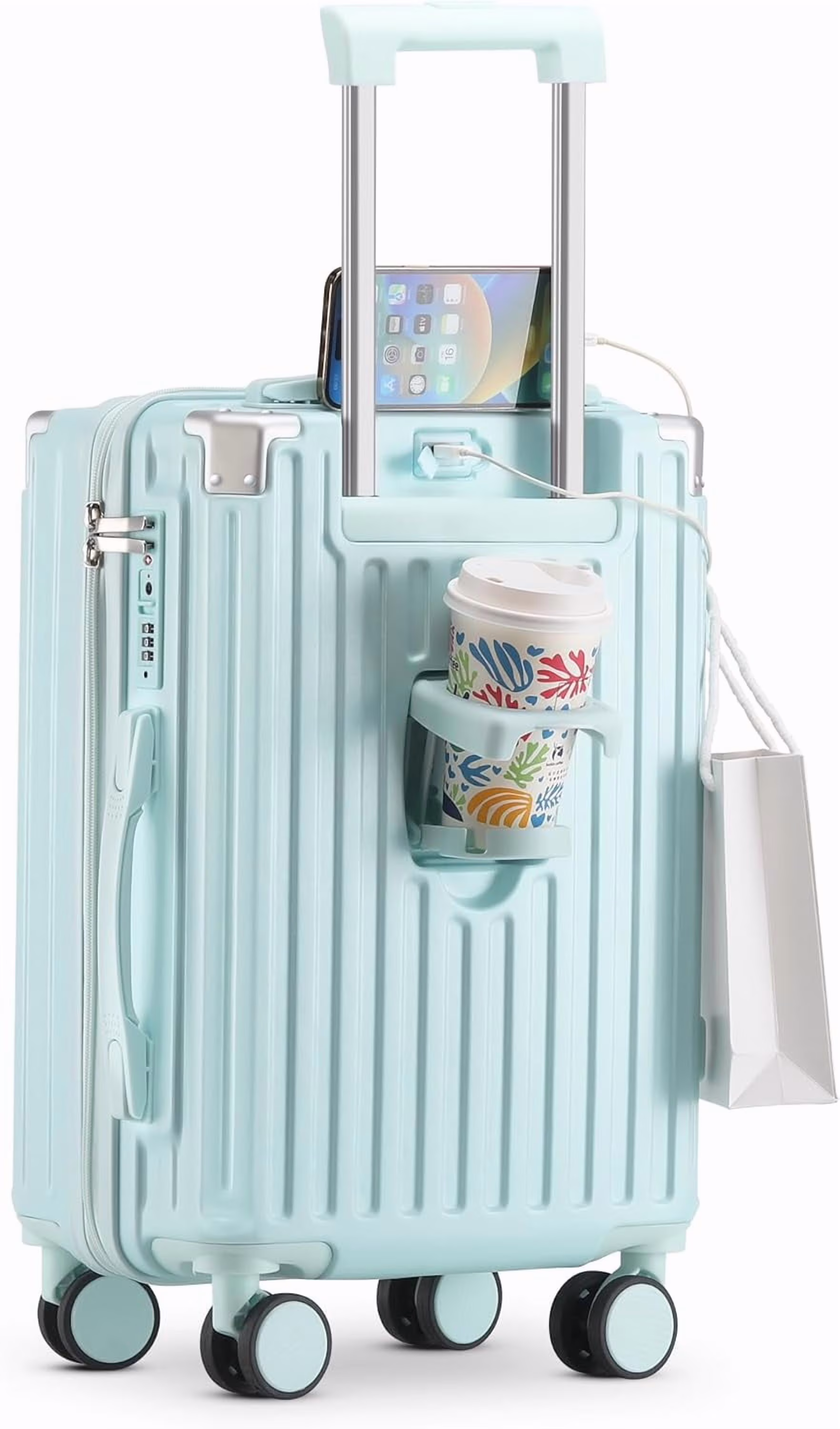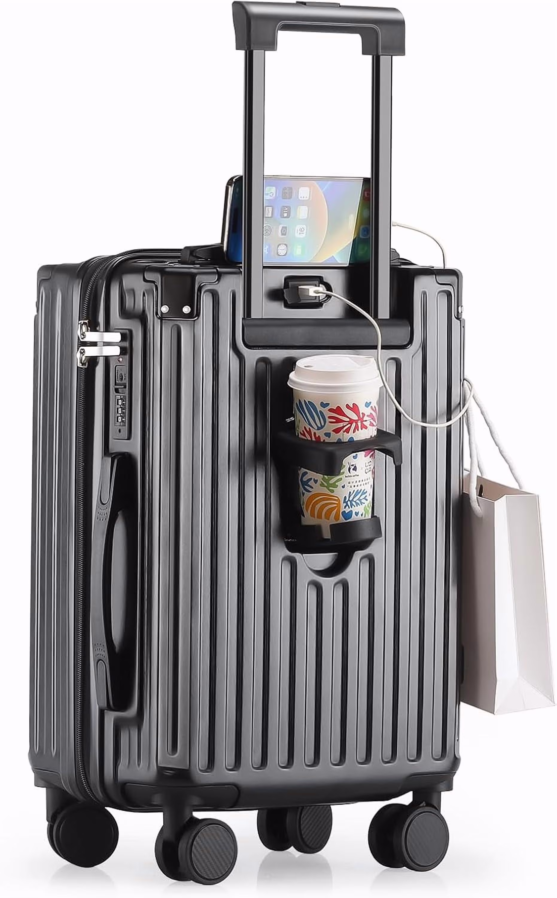 - ��Multifunctional Holder Design AND Built-in USB Port��This Luggage with cup holder especially designed water cup holder and hook on the luggage case, all is to provide a comfortable and convenient travel experience.The suitcase with a built-in USB port(Power bank not included), provide quick connection to your portable electronic device for a quick charge.Not worried about the phone is out of power any more.