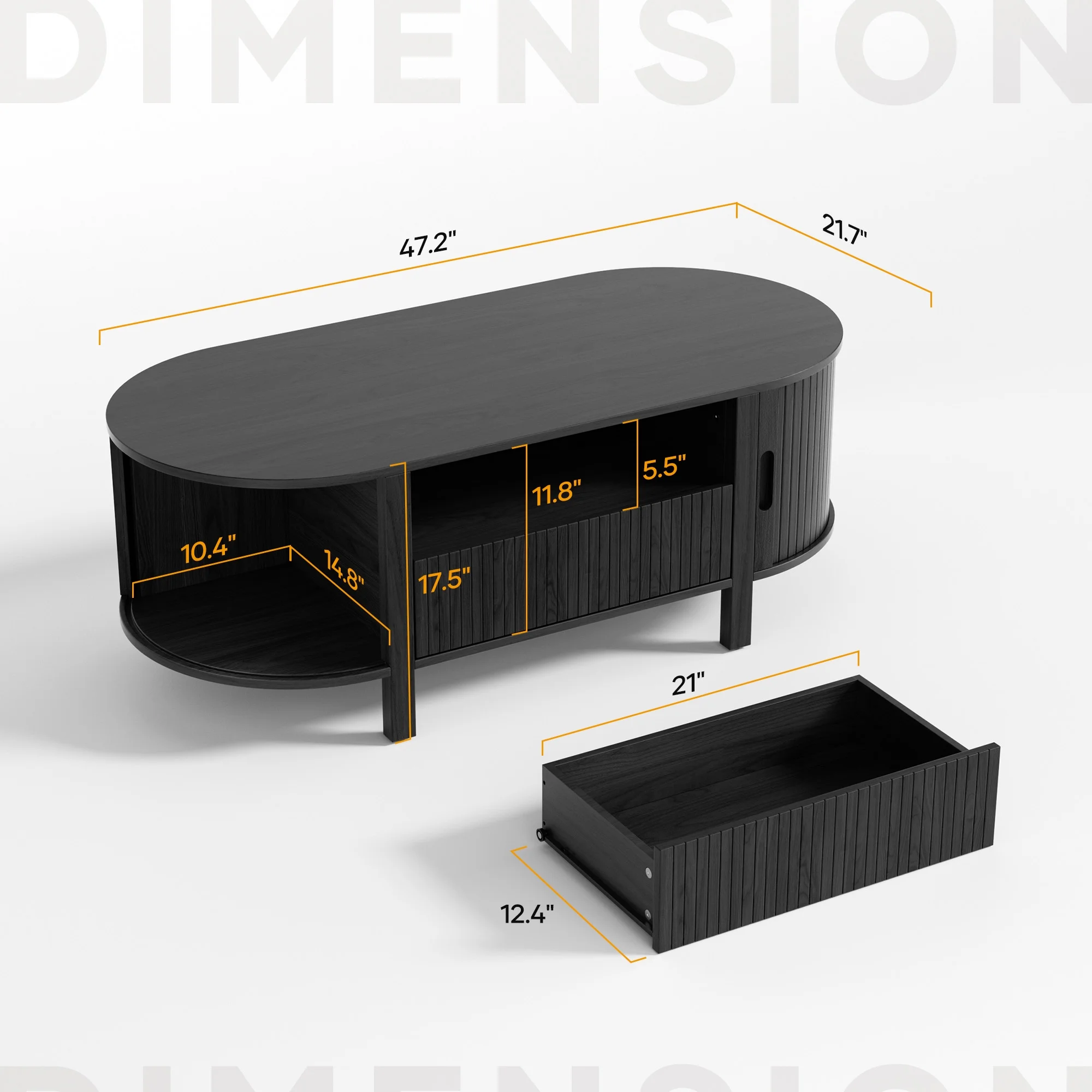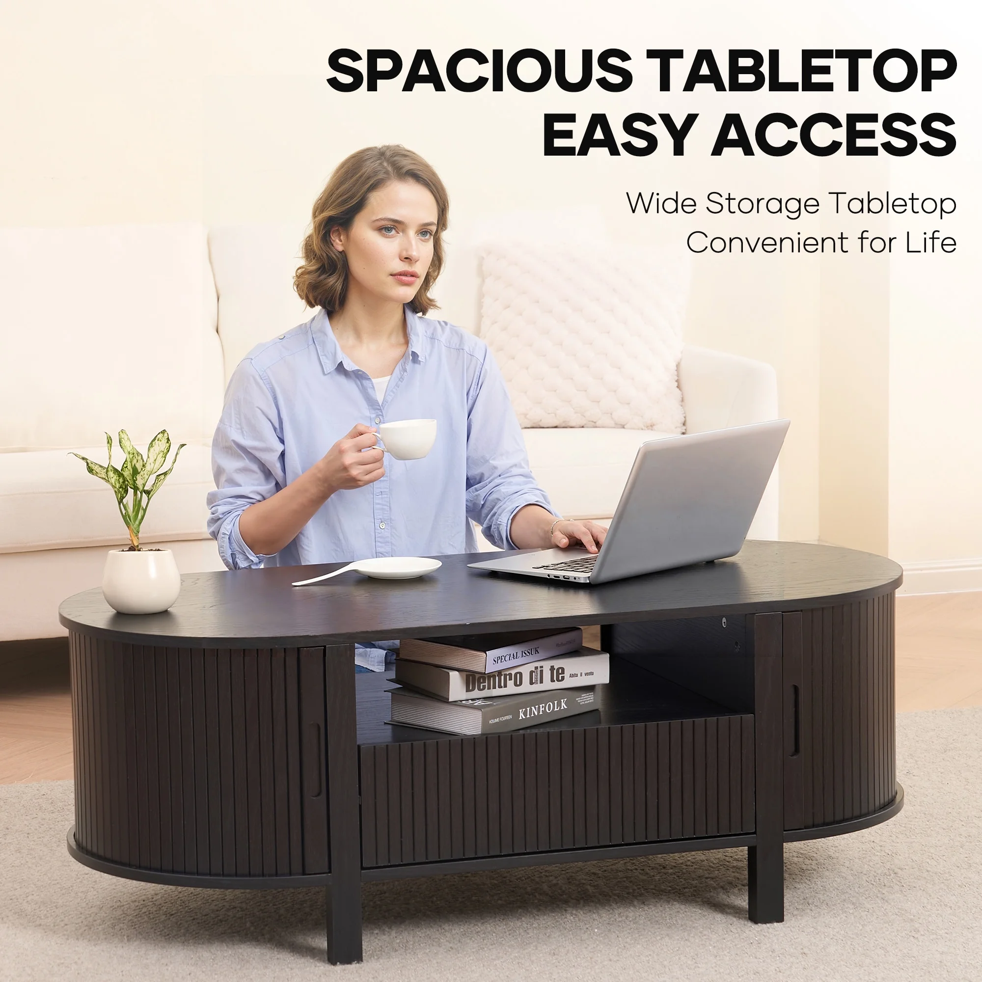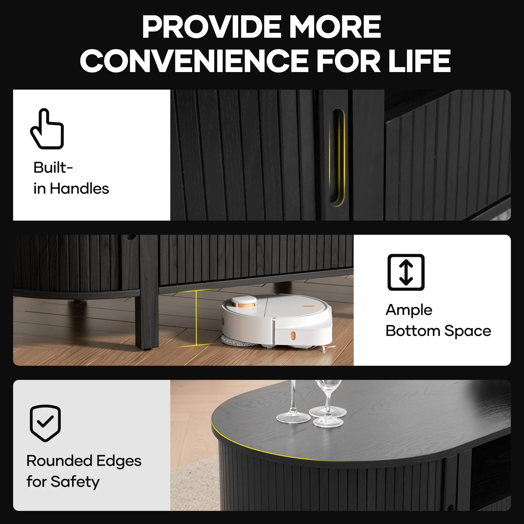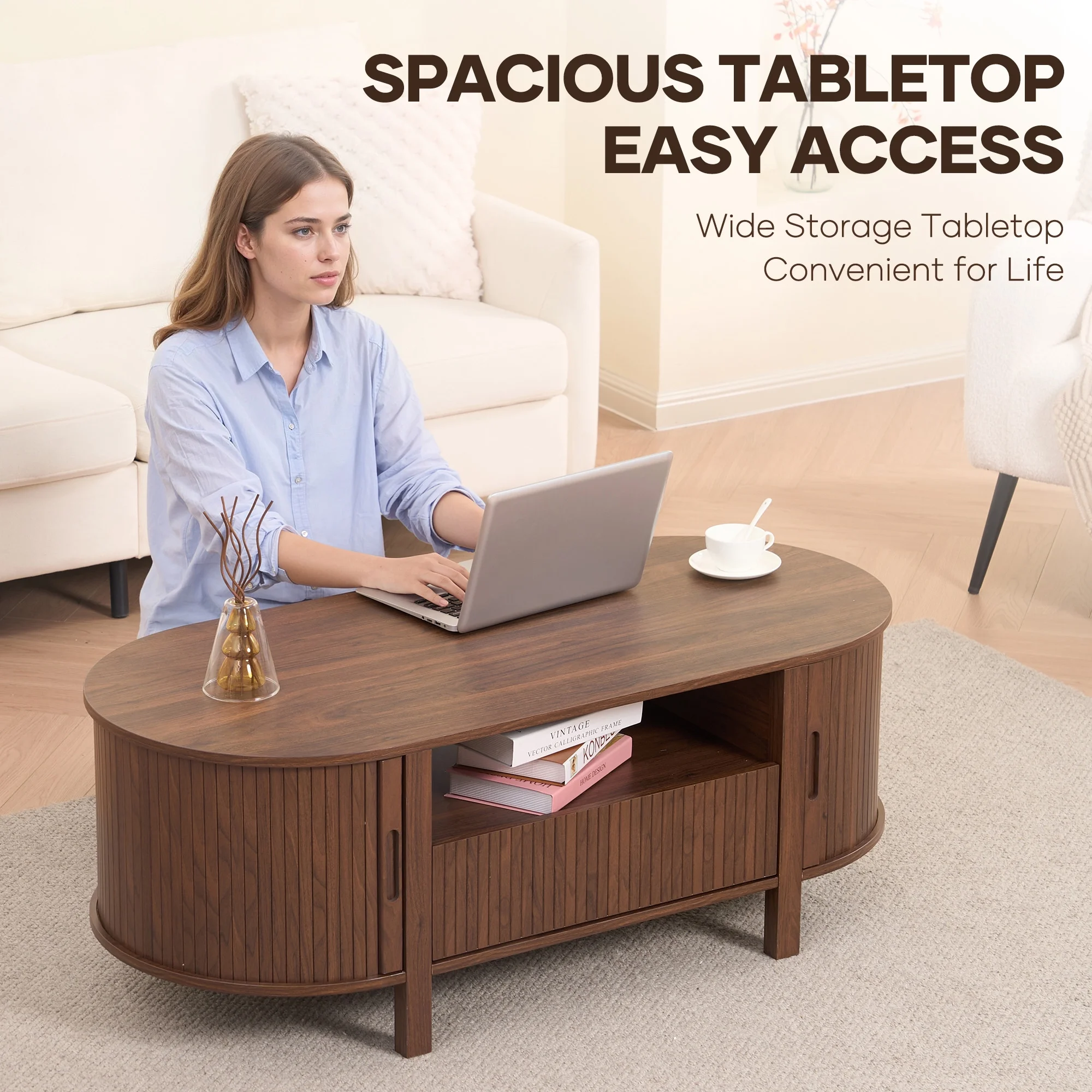 The generous 47.2"" x 21.7"" surface of sliding tambour doors coffee table provides ample room for your coffee mugs, decorative trays, or a good board game session, while the rounded corner design adds a soft touch of safety and modern aesthetics. Thoughtfully crafted with a robot-vacuum-friendly height and built-in handles, every detail is made for practical, everyday living. Whether you're hosting friends or relaxing with a book, this coffee table blends functionality with elegant design.