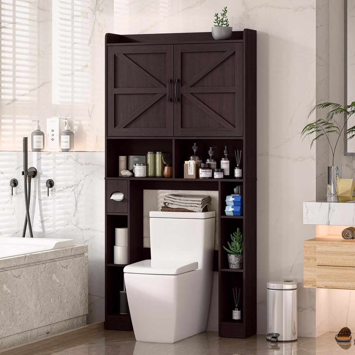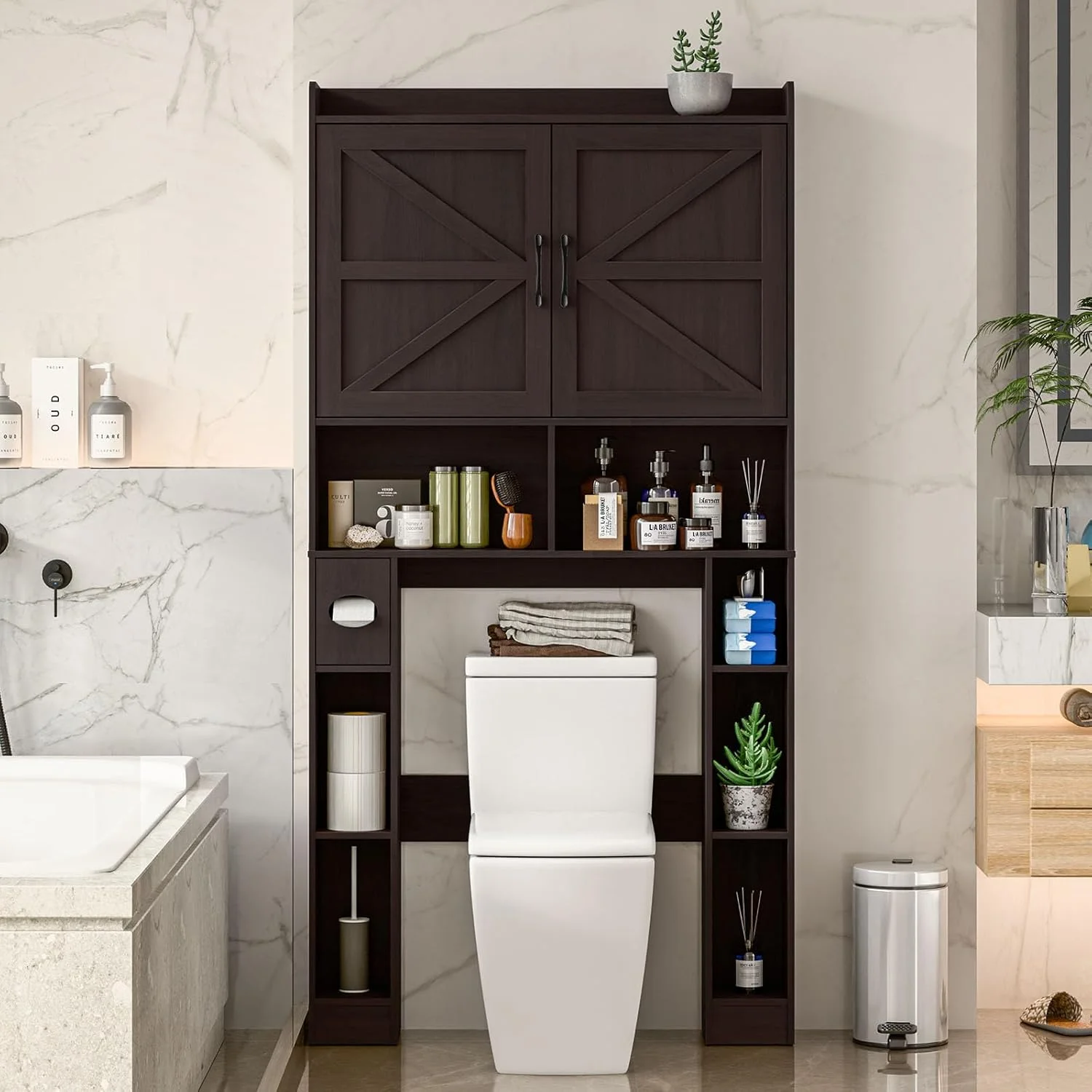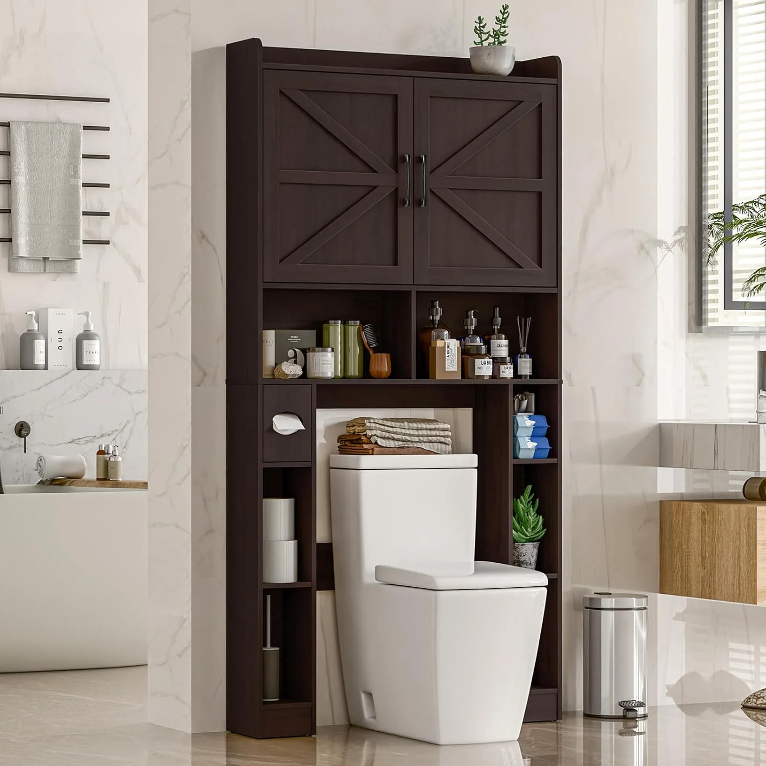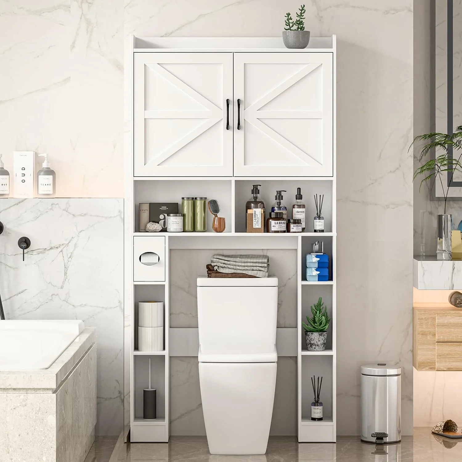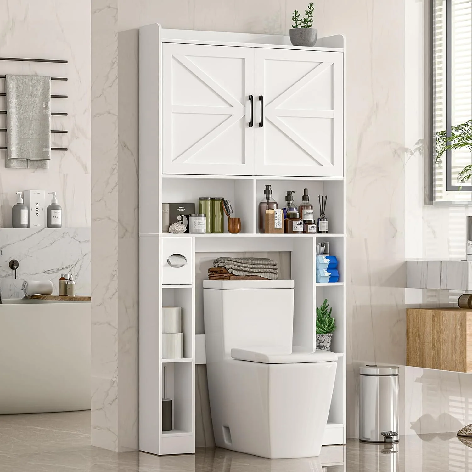 This above-the-toilet shelf features barn-door design for discreet storage of towels and toilet paper, along with open shelves for easy access to daily essentials. A specially designed vertical cabinet provides additional storage for paper rolls, keeping your bathroom organized and clutter-free. - ��Customizable Storage Space��