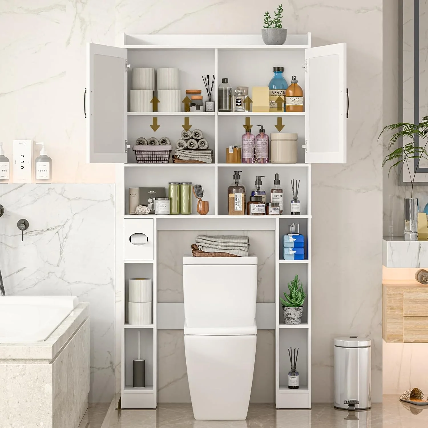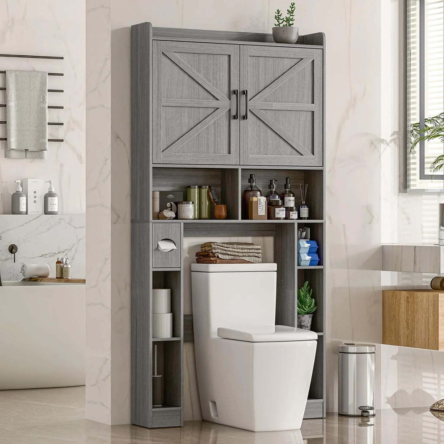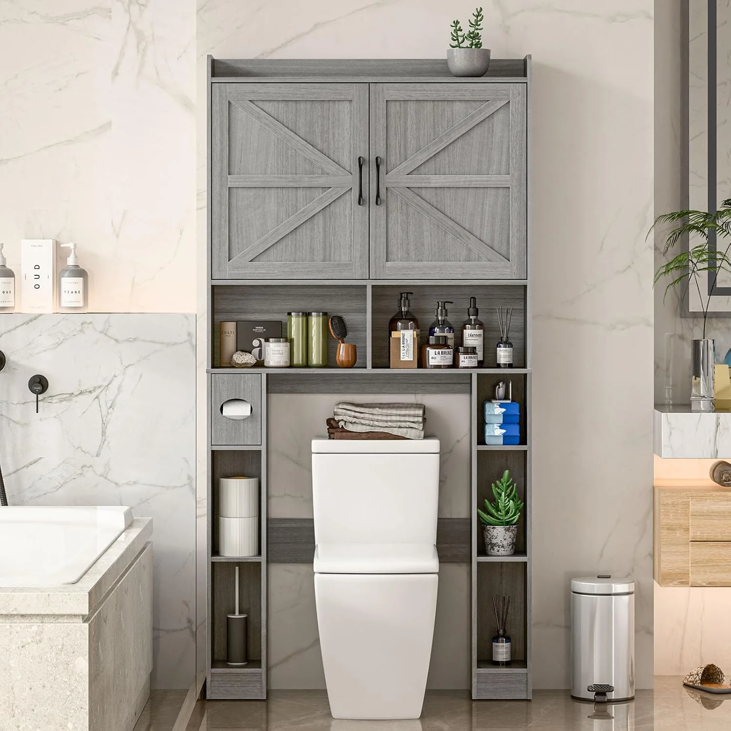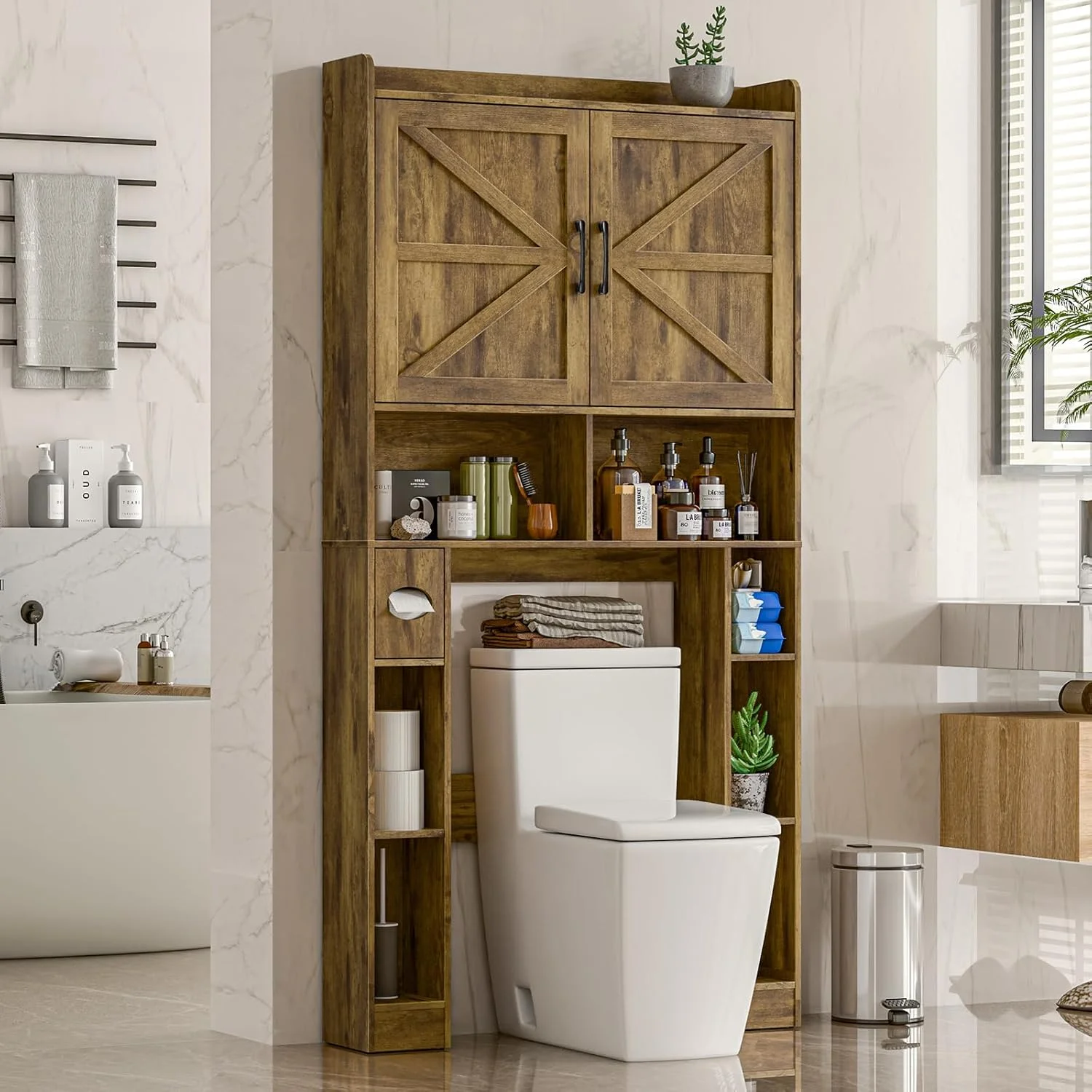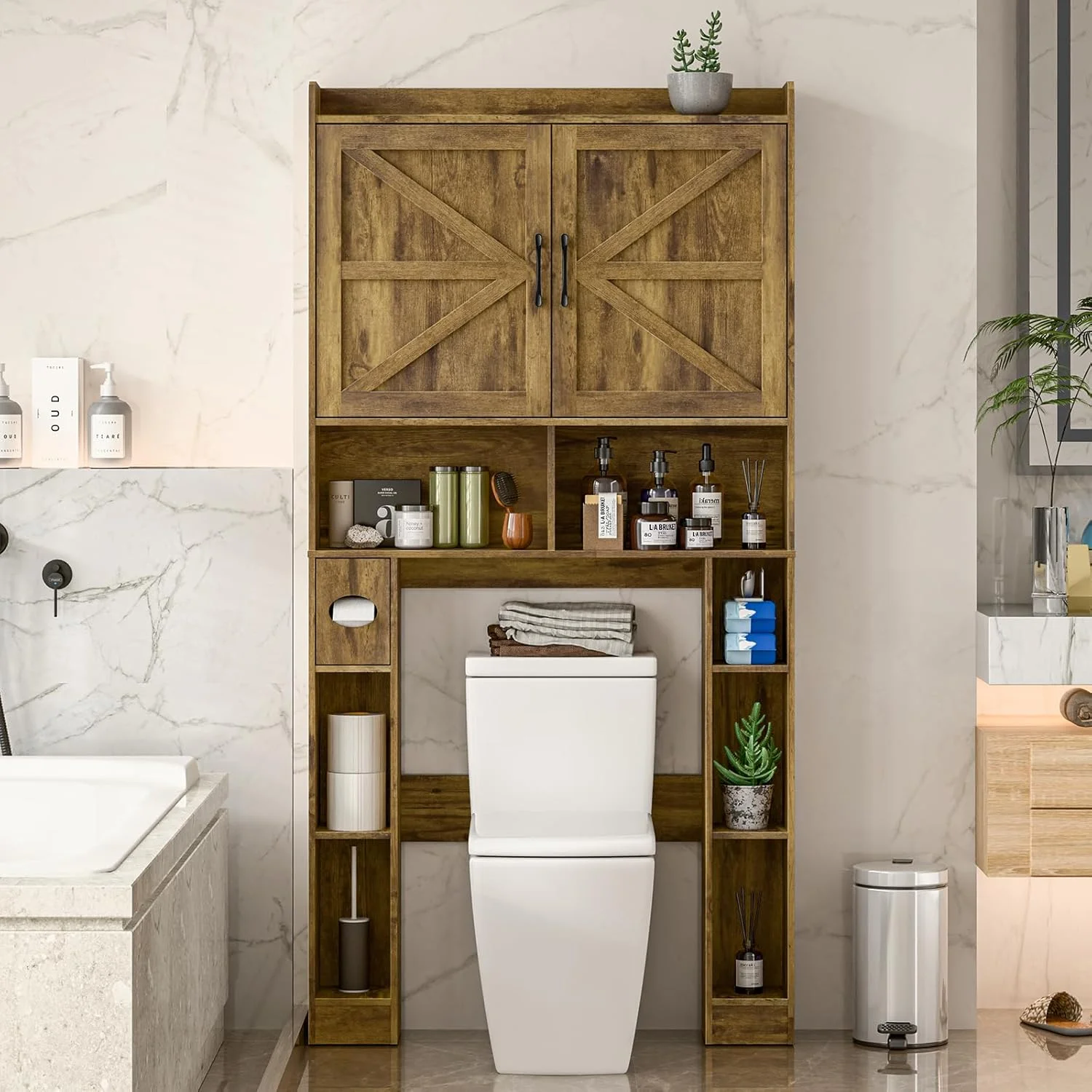 This above-the-toilet shelf features barn-door design for discreet storage of towels and toilet paper, along with open shelves for easy access to daily essentials. A specially designed vertical cabinet provides additional storage for paper rolls, keeping your bathroom organized and clutter-free. - ��Customizable Storage Space��