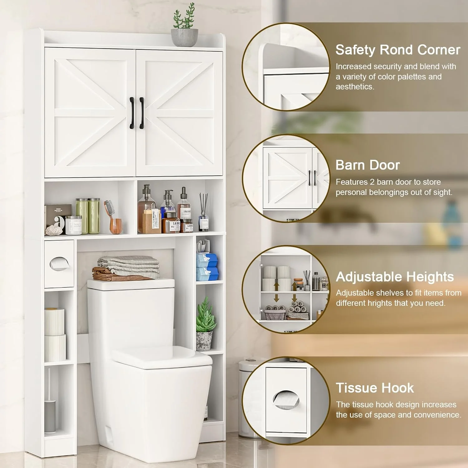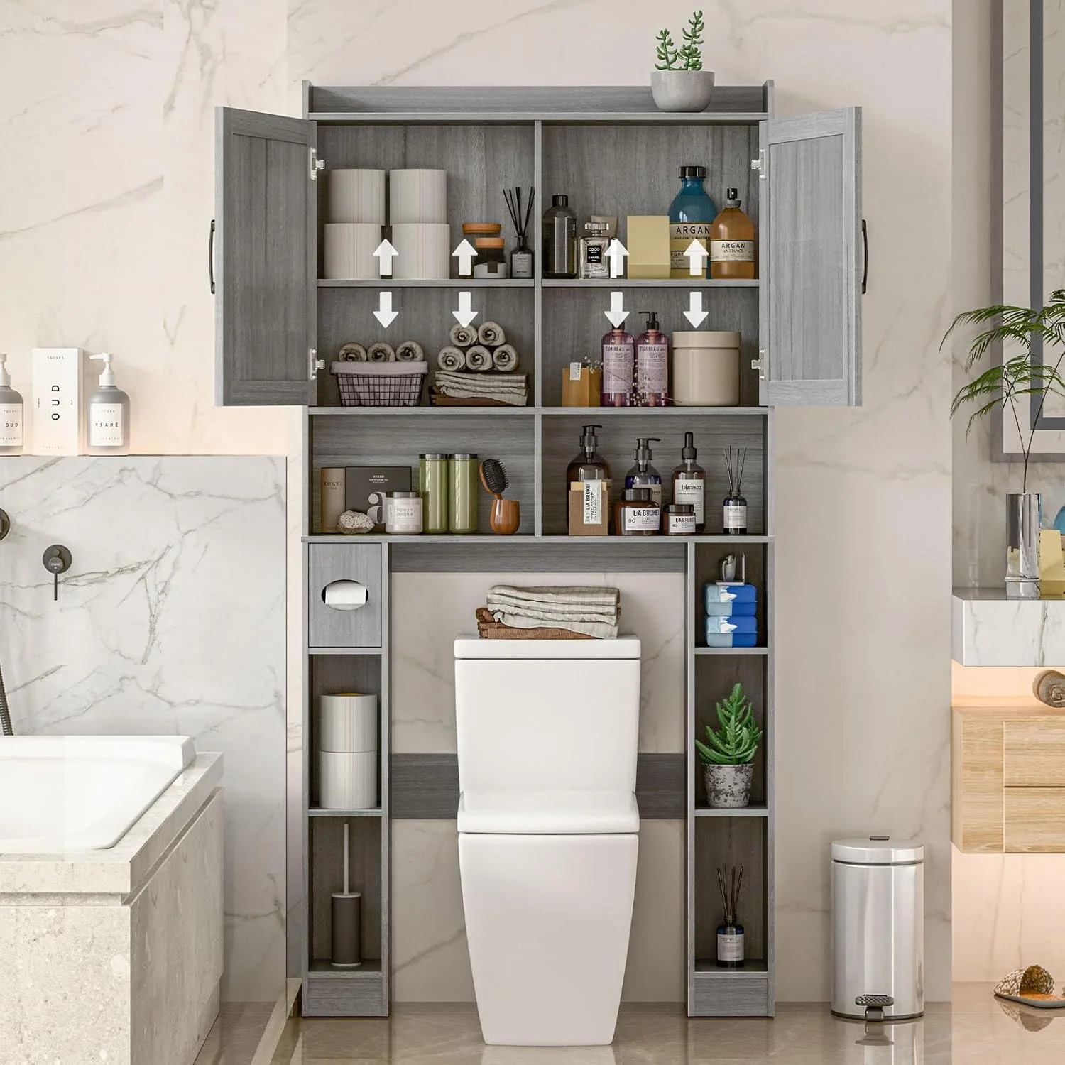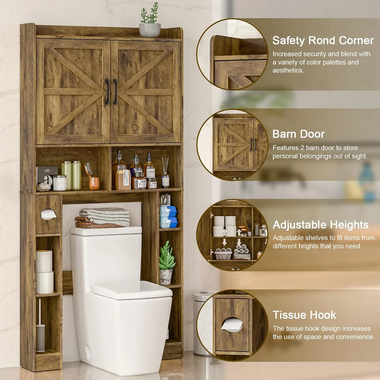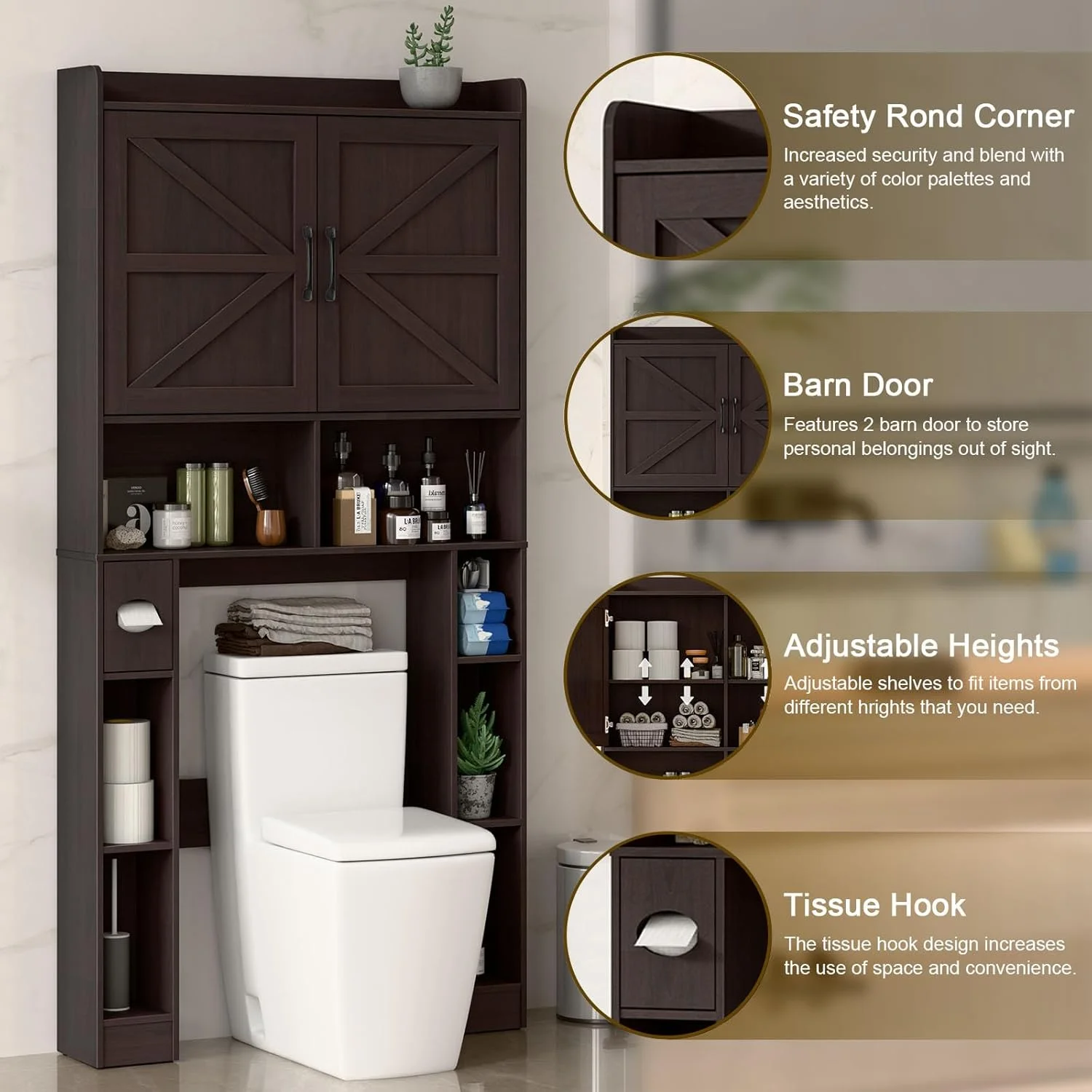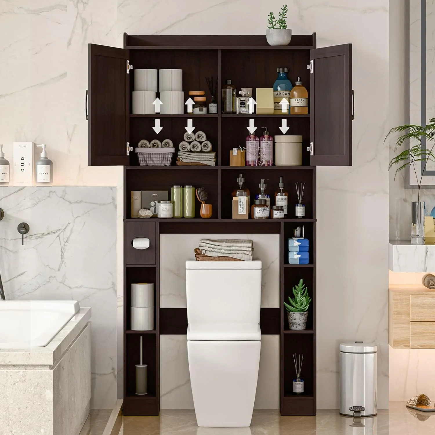This above-the-toilet shelf features barn-door design for discreet storage of towels and toilet paper, along with open shelves for easy access to daily essentials. A specially designed vertical cabinet provides additional storage for paper rolls, keeping your bathroom organized and clutter-free. - ��Customizable Storage Space��
