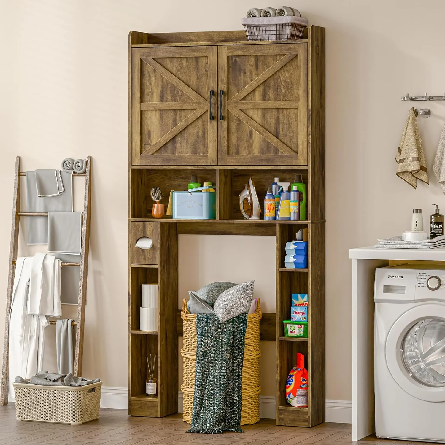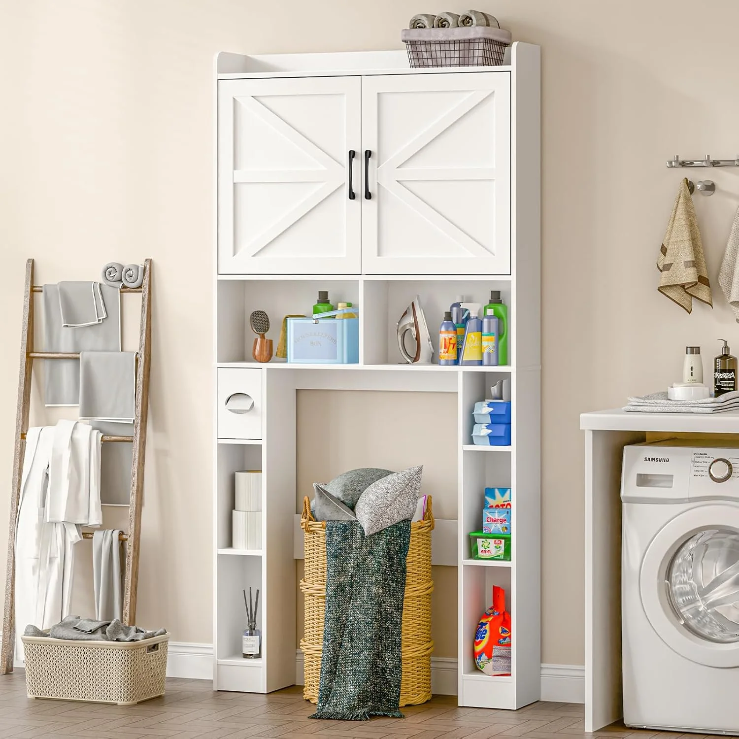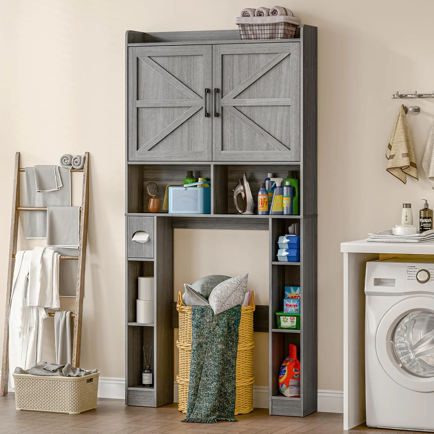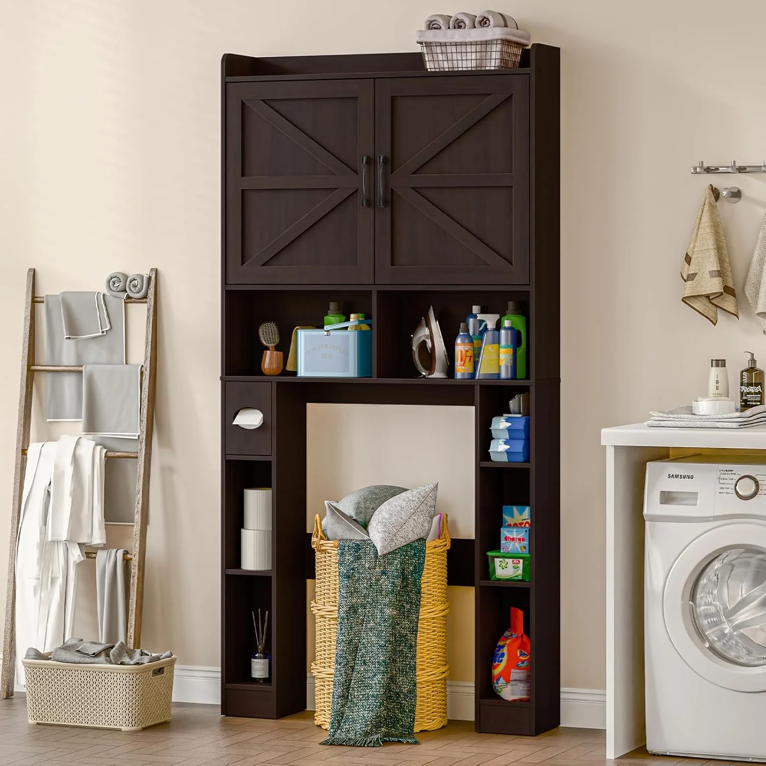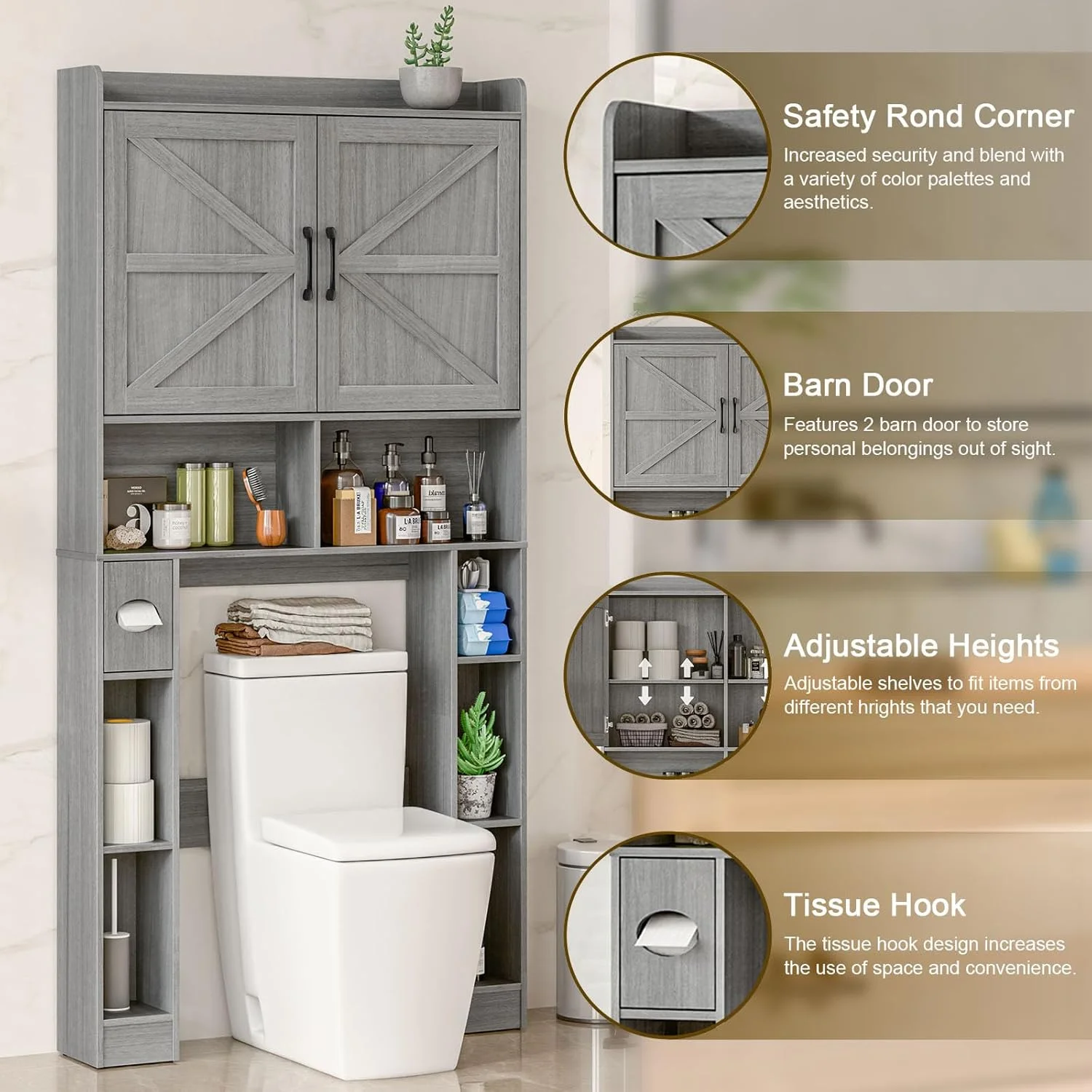 This above-the-toilet shelf features barn-door design for discreet storage of towels and toilet paper, along with open shelves for easy access to daily essentials. A specially designed vertical cabinet provides additional storage for paper rolls, keeping your bathroom organized and clutter-free. - ��Customizable Storage Space��