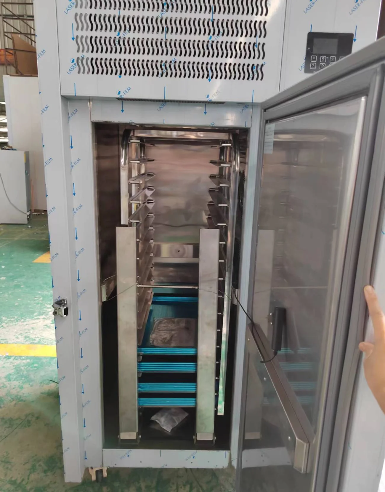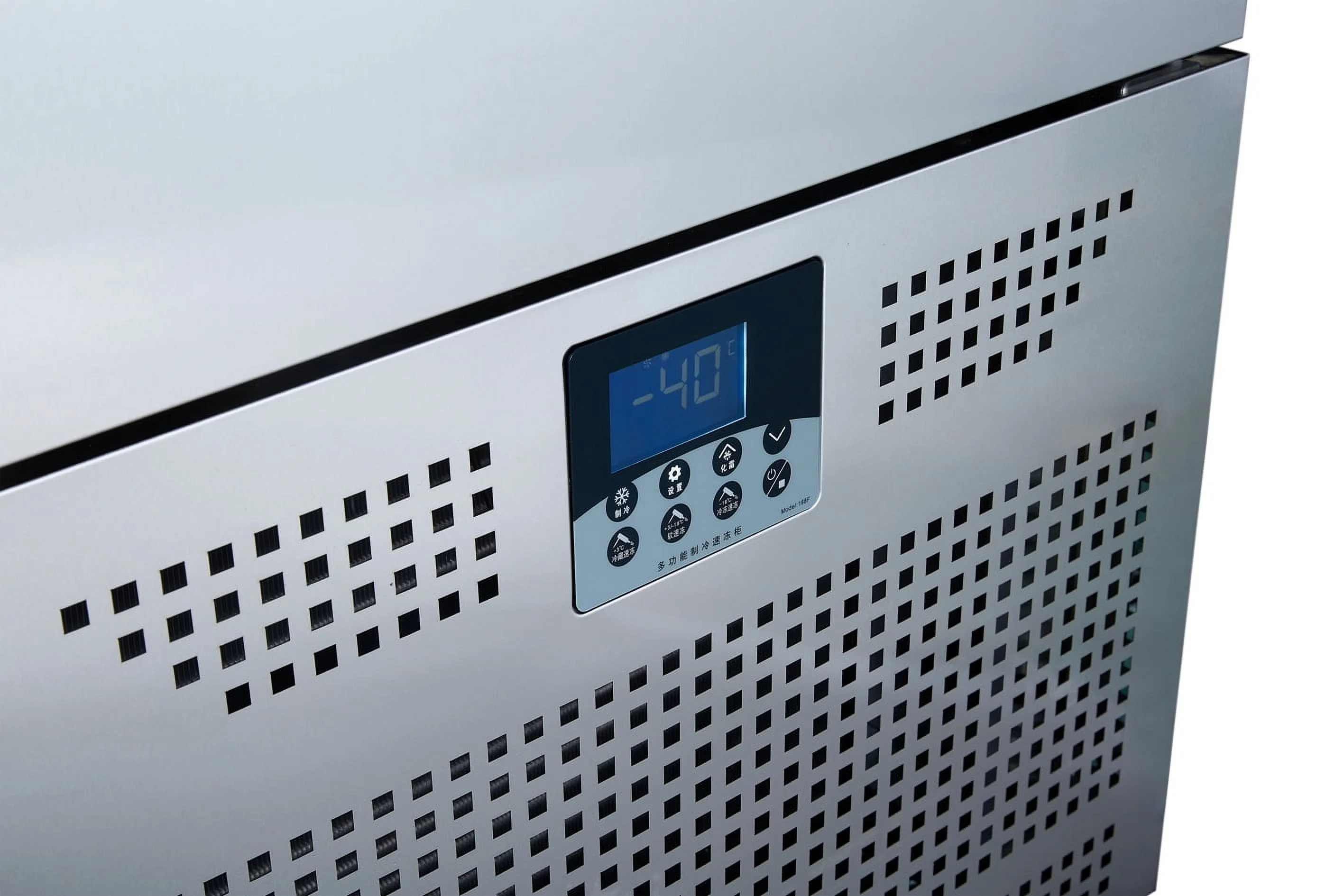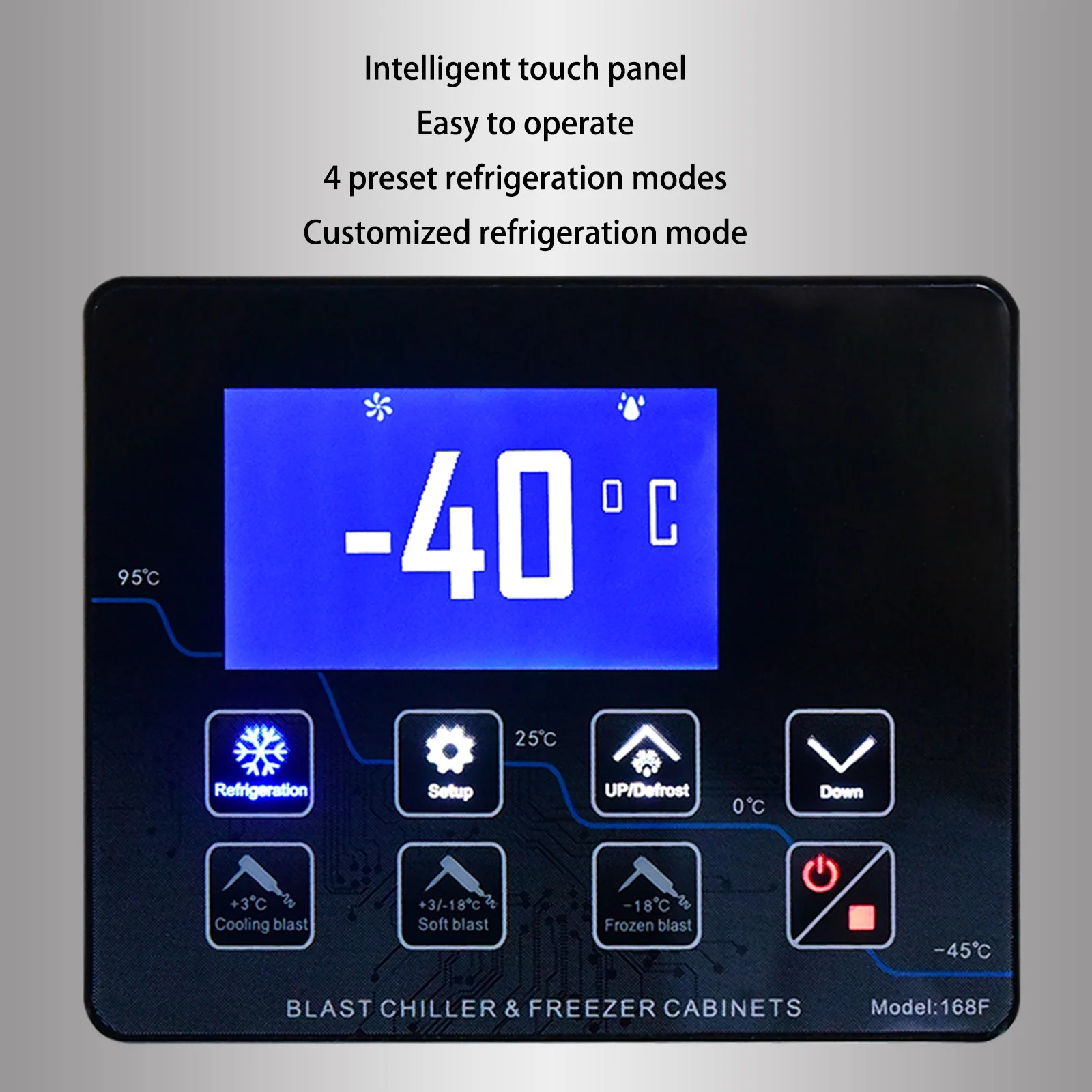 - ��Main functions��: Trolley cart included to make food transferred easily in restaurant and hotel, equipped with timer control, auto drainage and auto defrost, Haccp alarm,,EVCO smart AI temperature control, powerful fan and special large doorknob, available to sea food/meat/beef/cake preservation and ice cream hardening,multiple languages selected in control panel: English and Chinese,chilling and frozen rapidly to lock food quality and nutrition, prolongs food storage period
