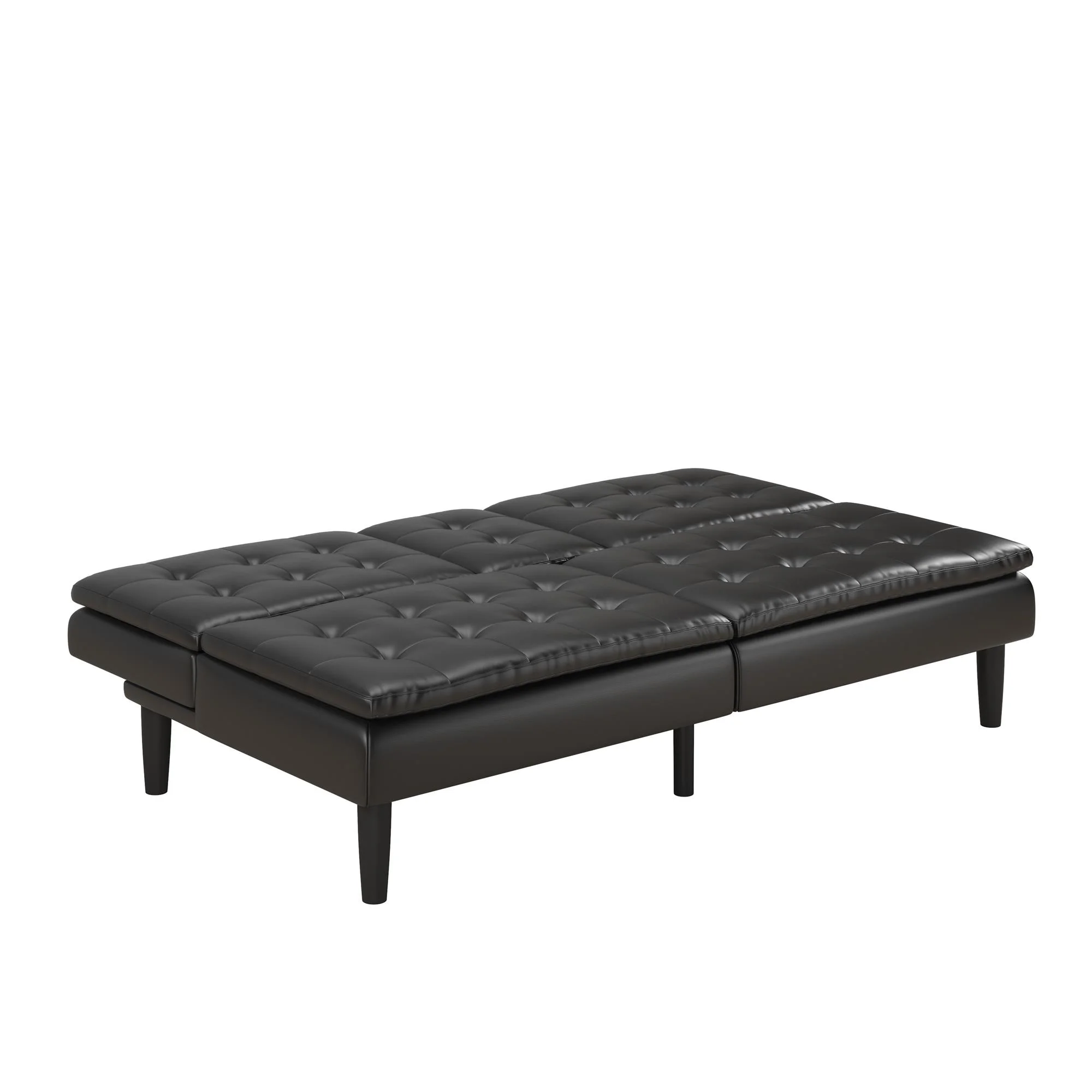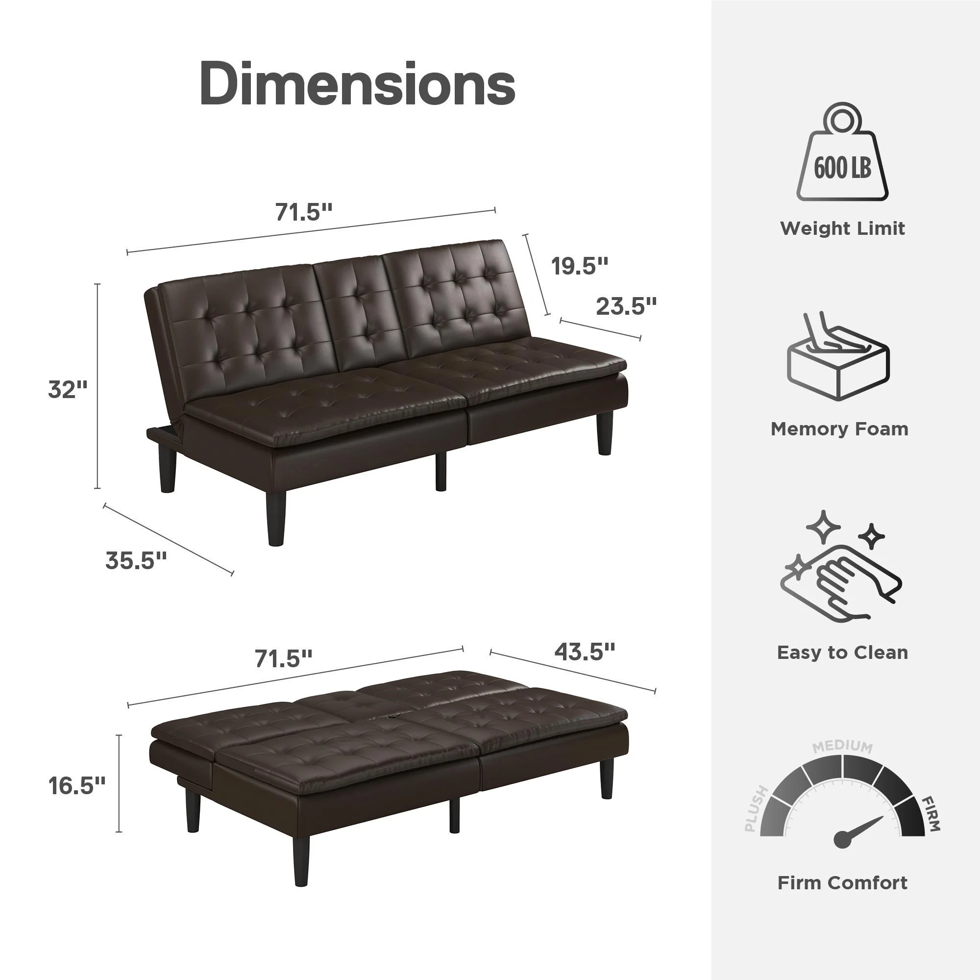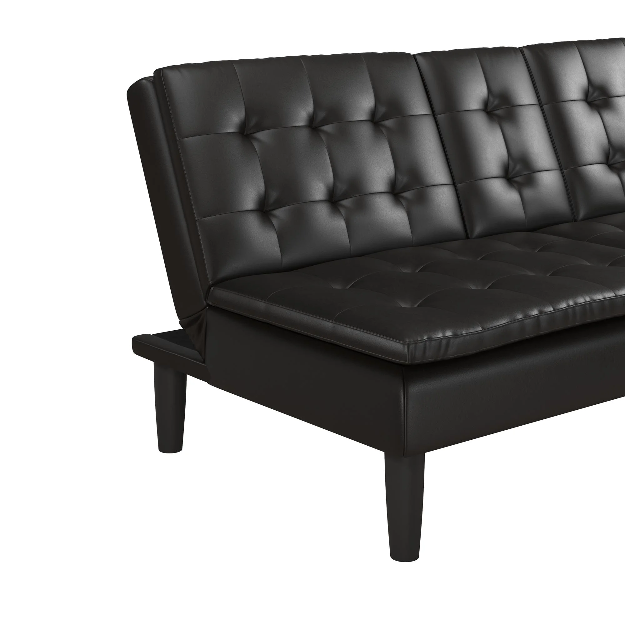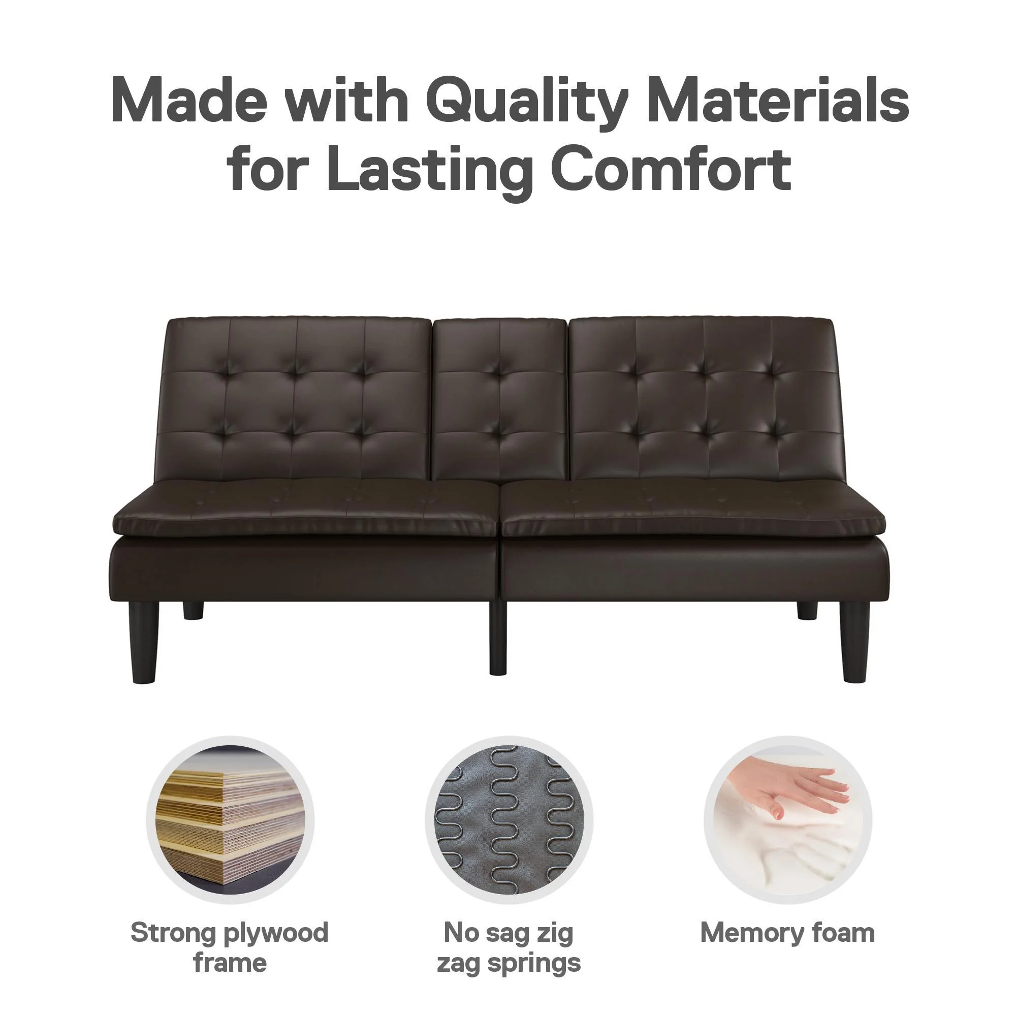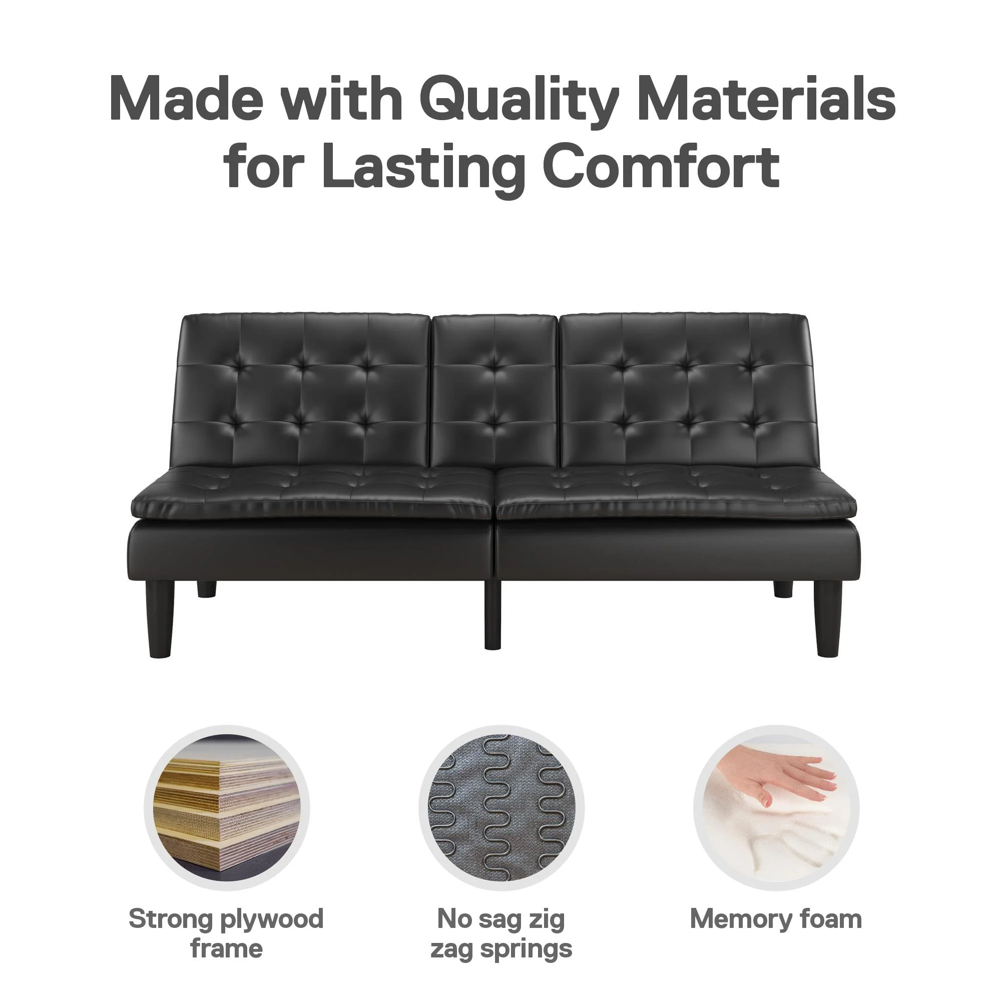 - Upholstered in faux leather, this futon is designed with a mid-century modern style. Clean lines, button-tufted detailing, and a memory foam layer pillow top seat ensure stylish body-hugging comfort sitting, lounging, or laying flat.