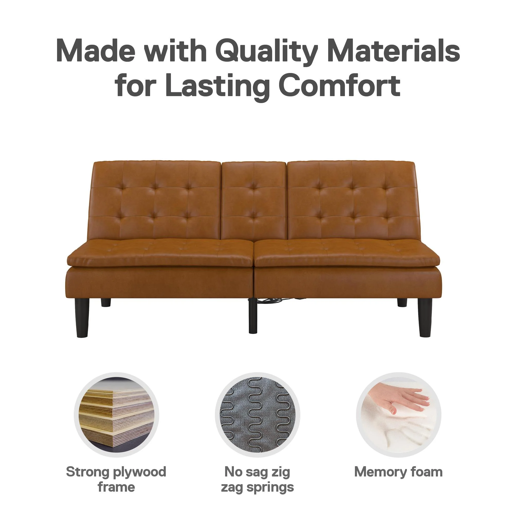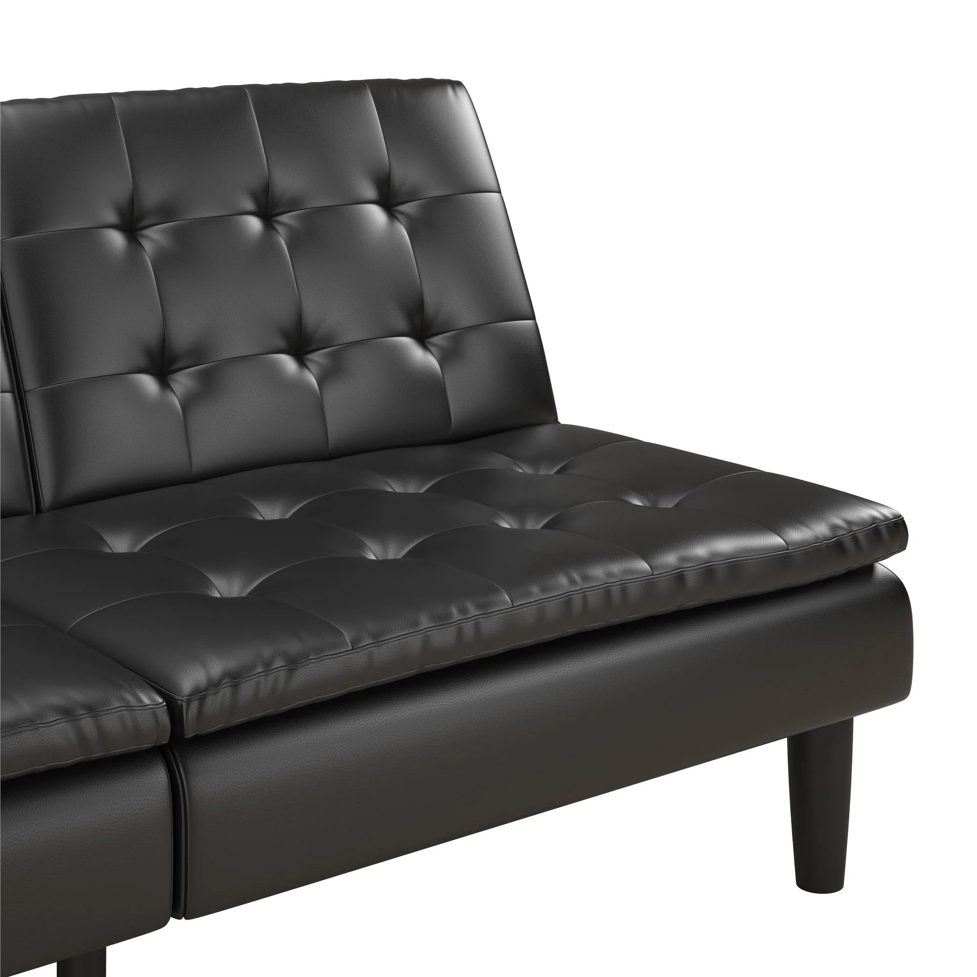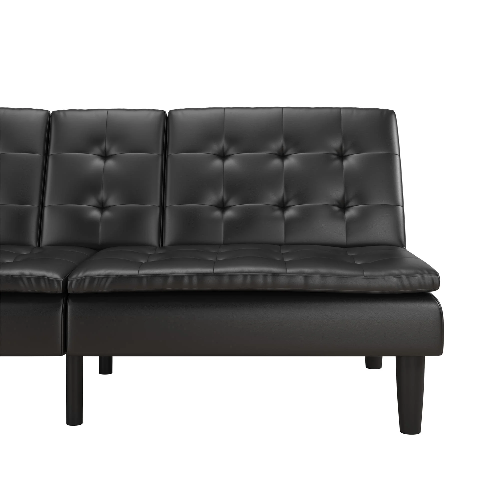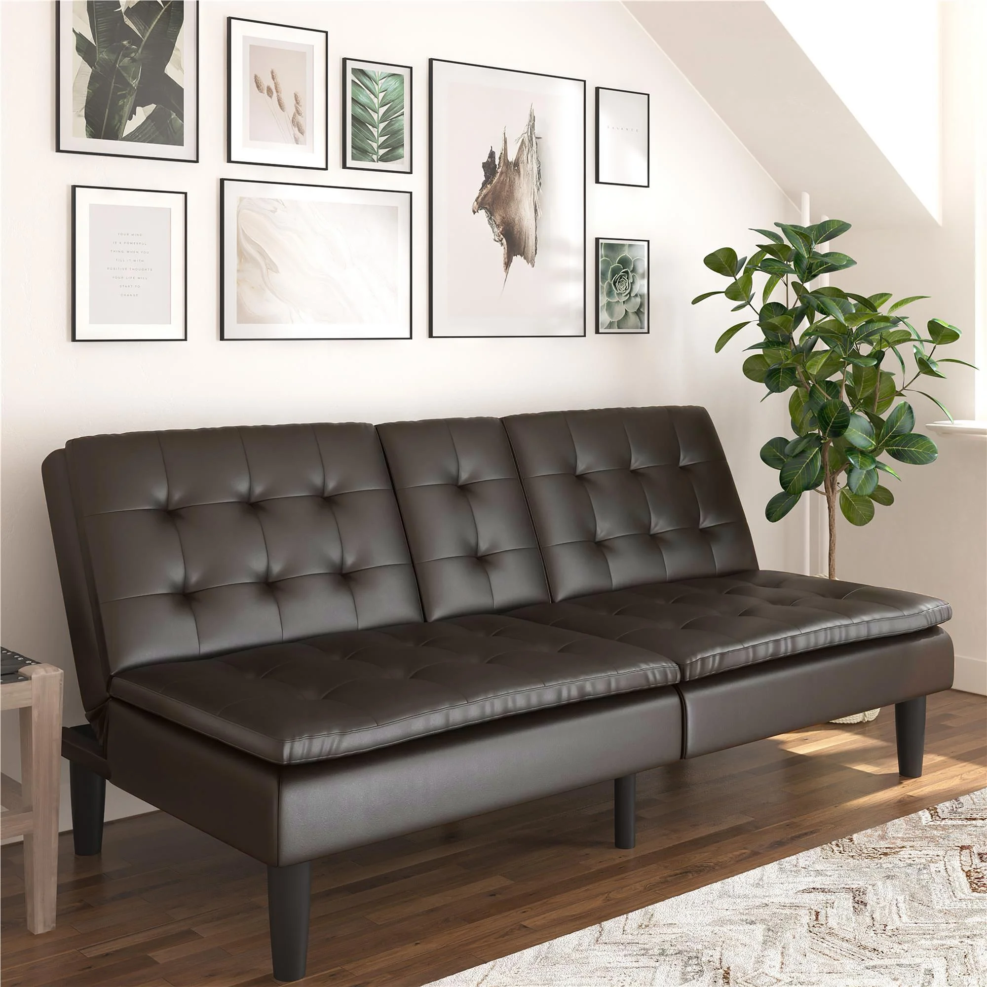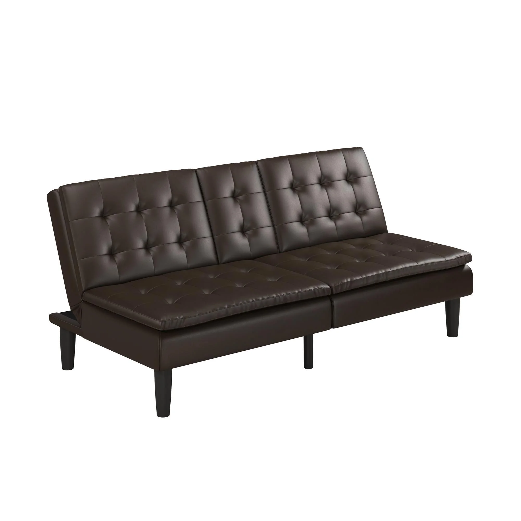 - Upholstered in faux leather, this futon is designed with a mid-century modern style. Clean lines, button-tufted detailing, and a memory foam layer pillow top seat ensure stylish body-hugging comfort sitting, lounging, or laying flat.