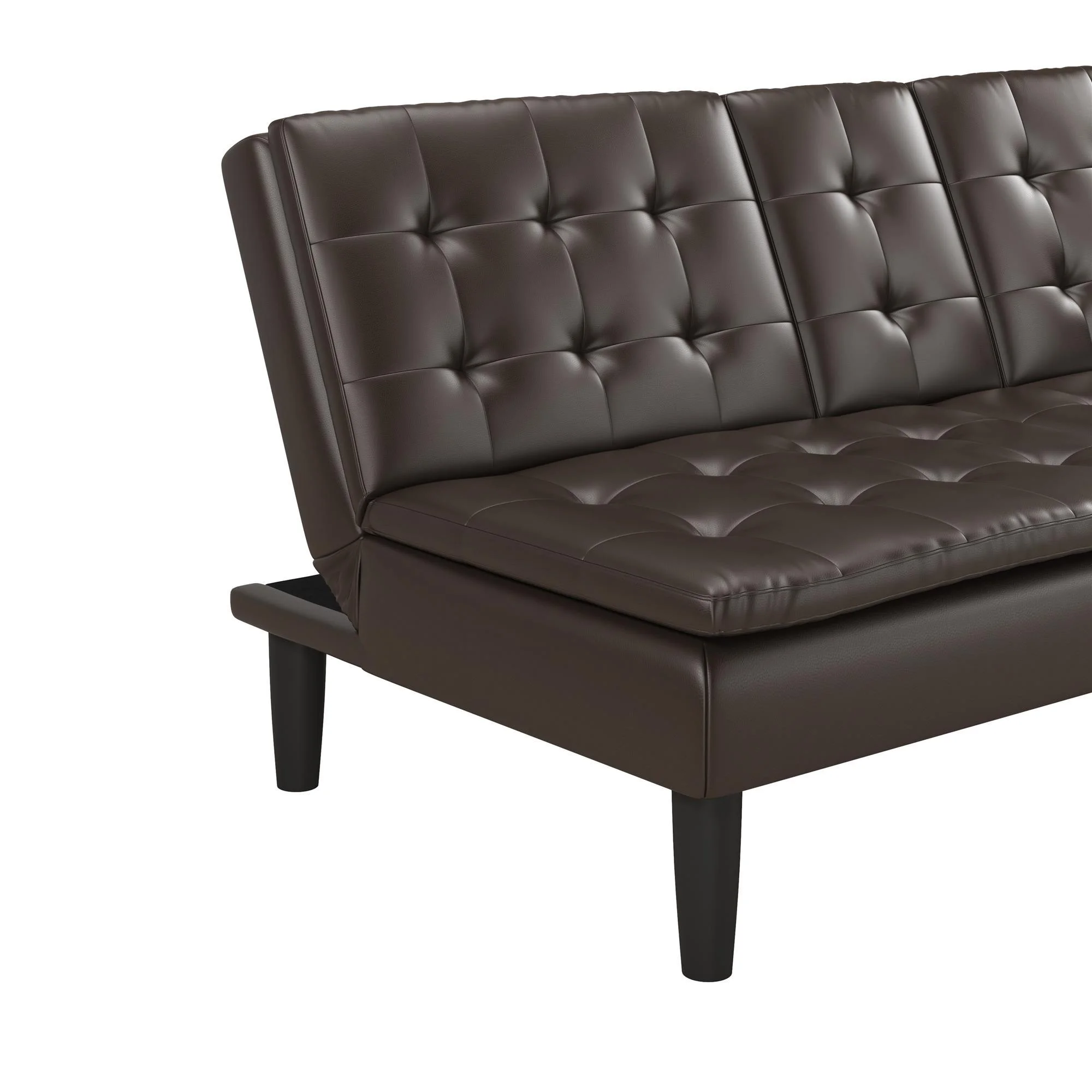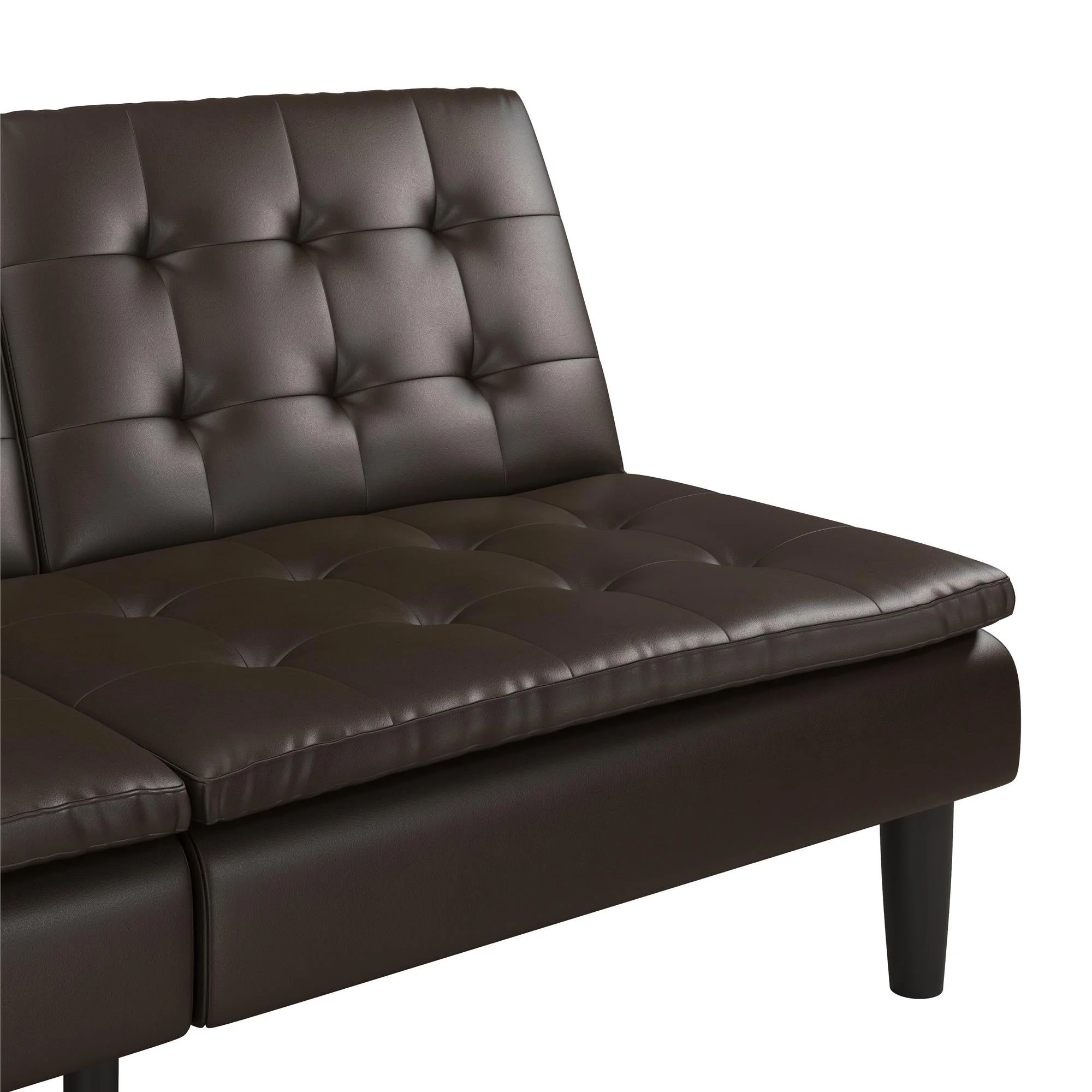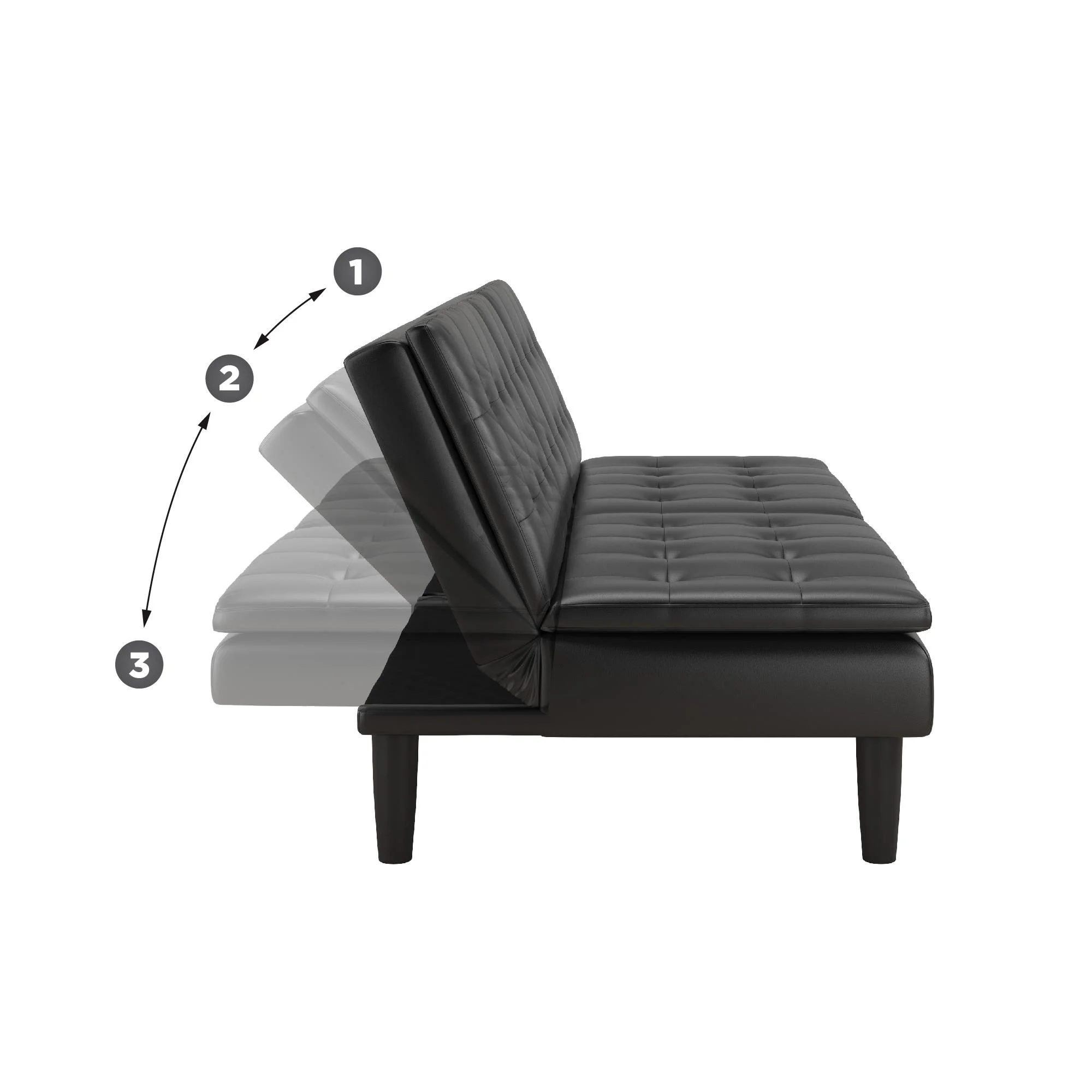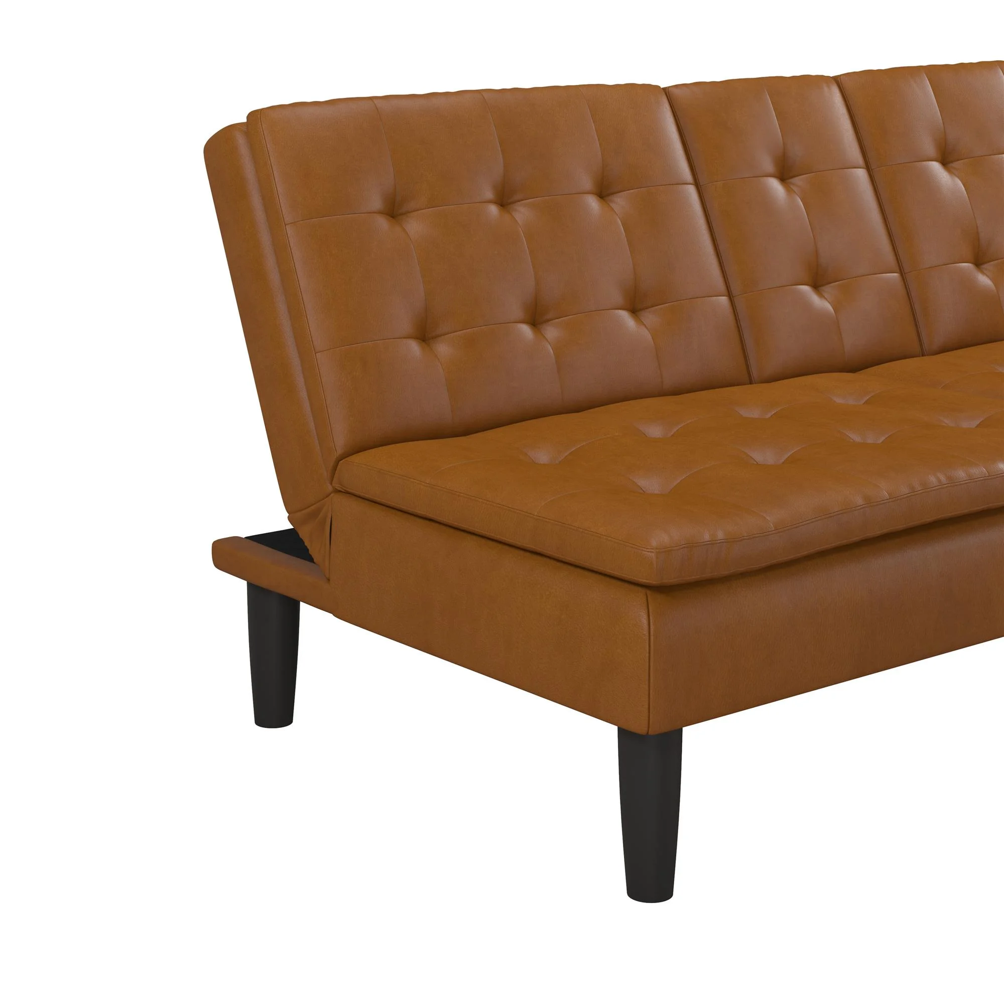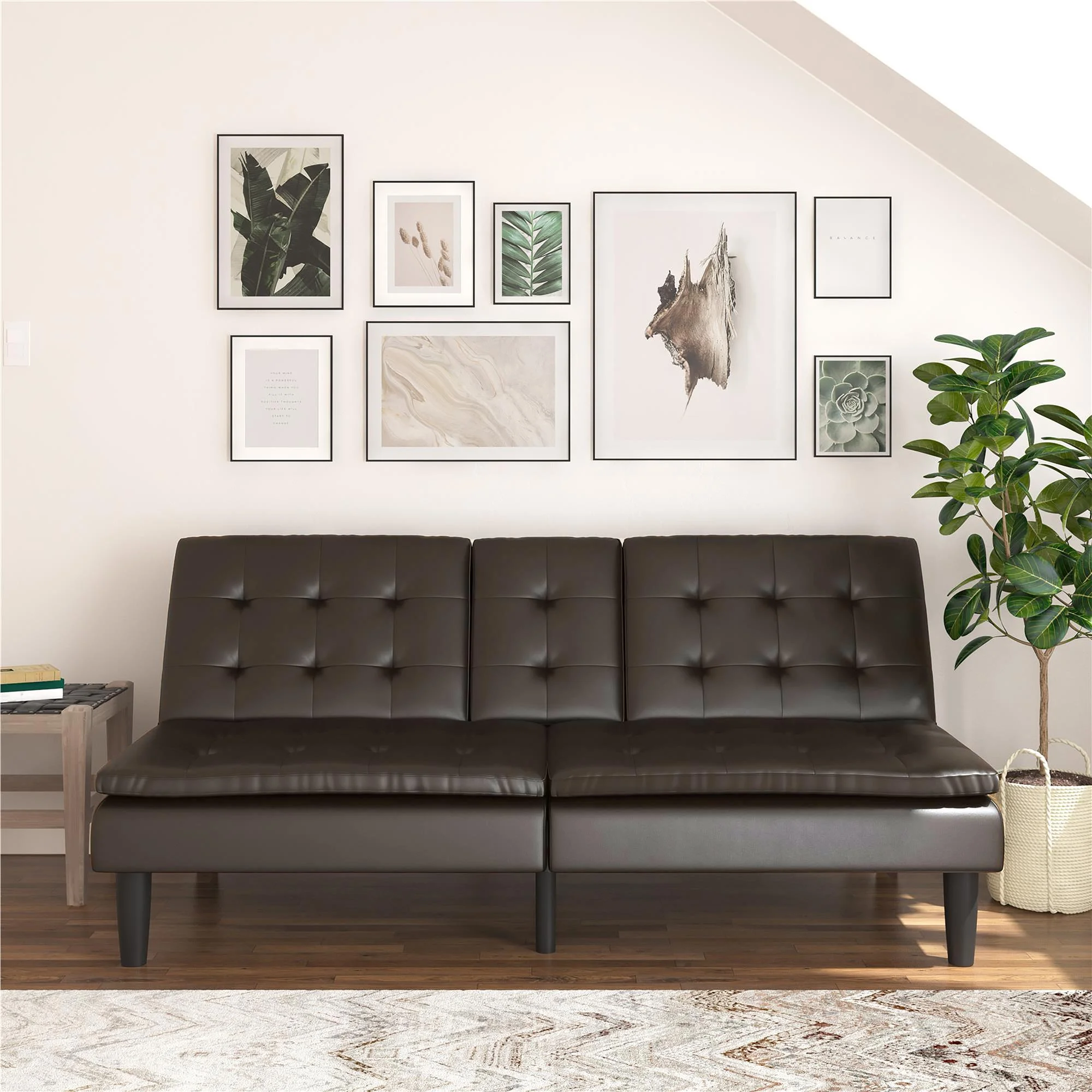 - Upholstered in faux leather, this futon is designed with a mid-century modern style. Clean lines, button-tufted detailing, and a memory foam layer pillow top seat ensure stylish body-hugging comfort sitting, lounging, or laying flat.