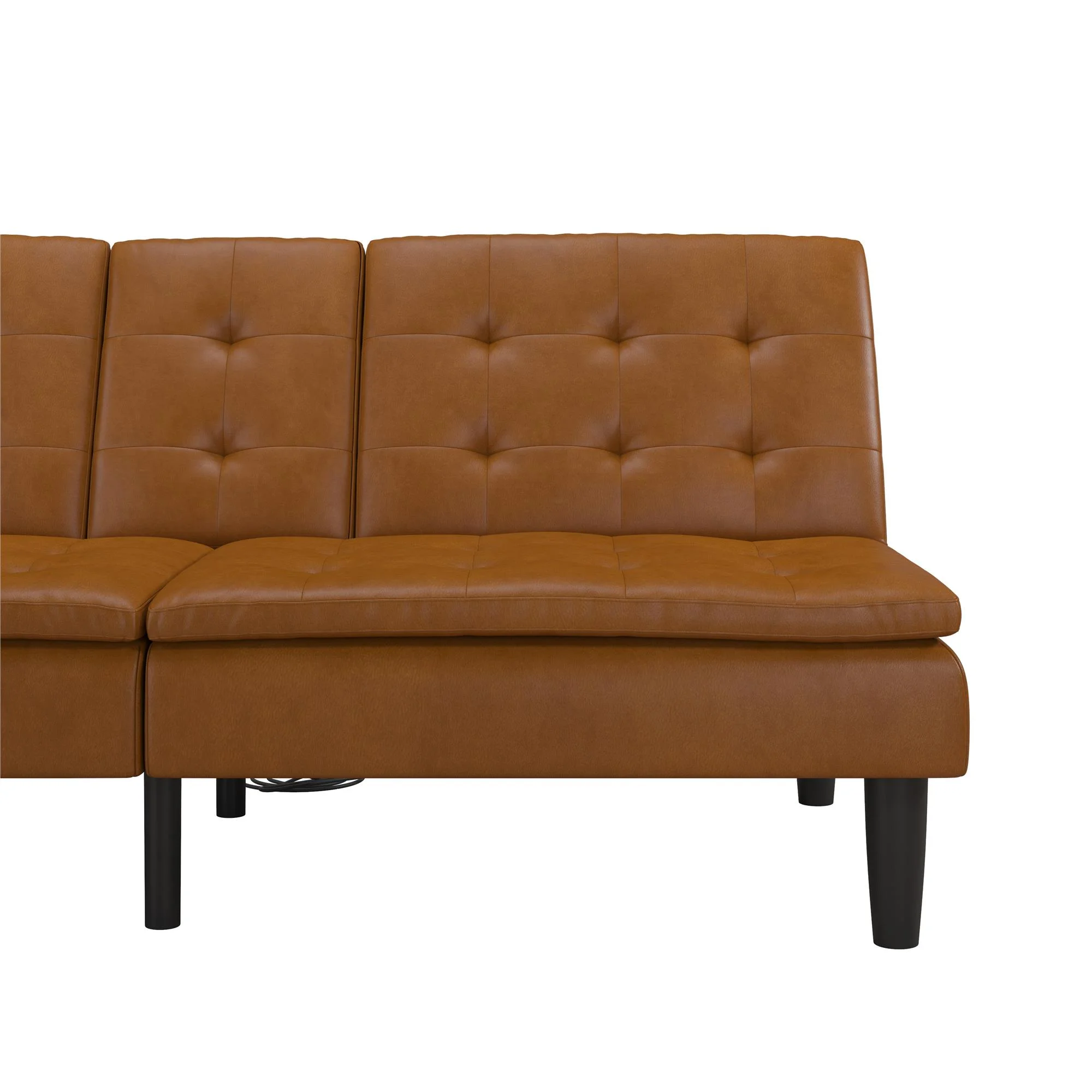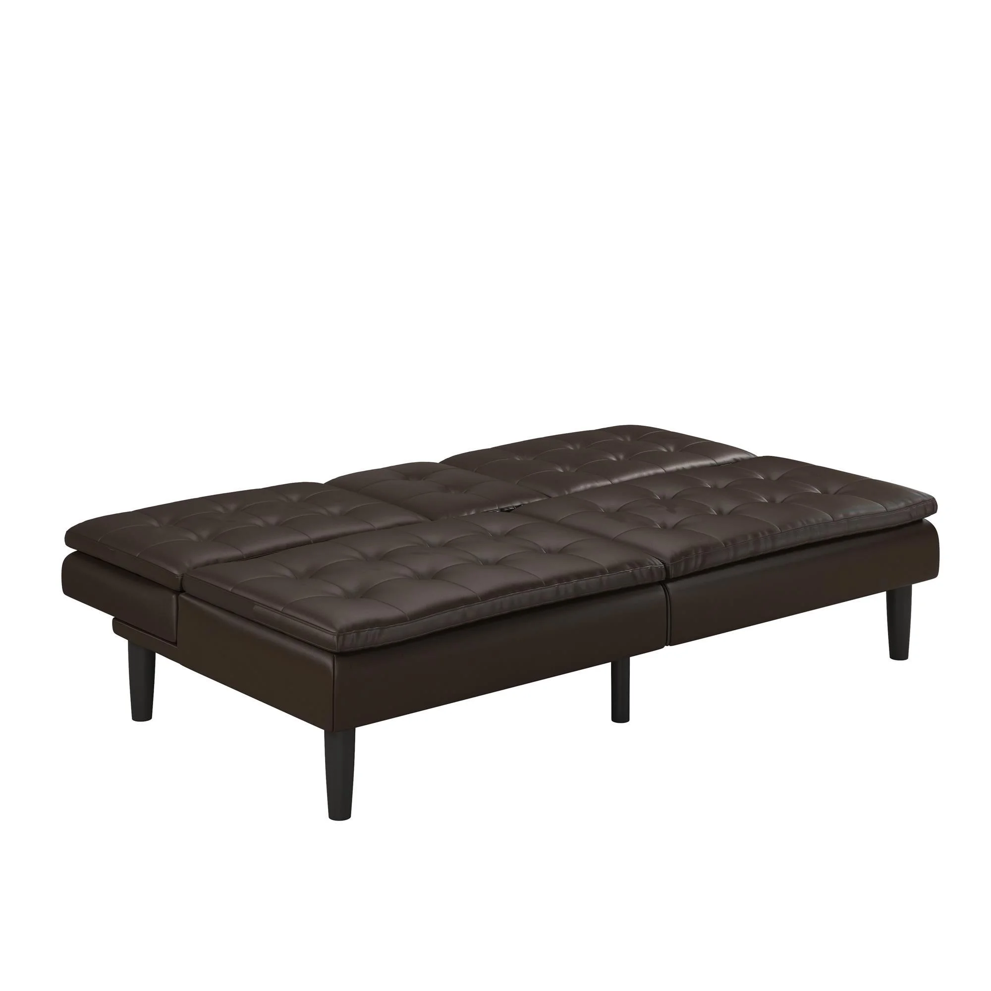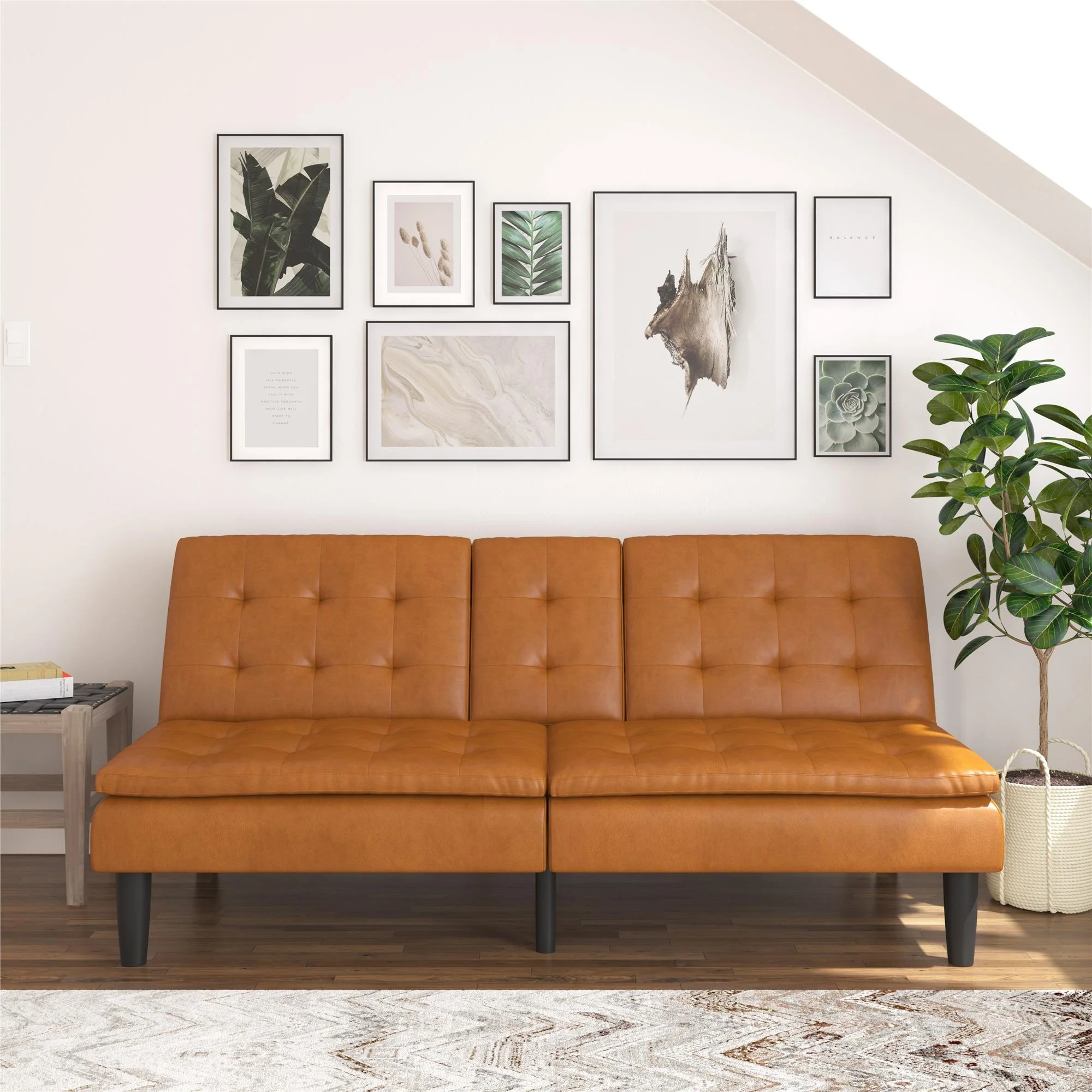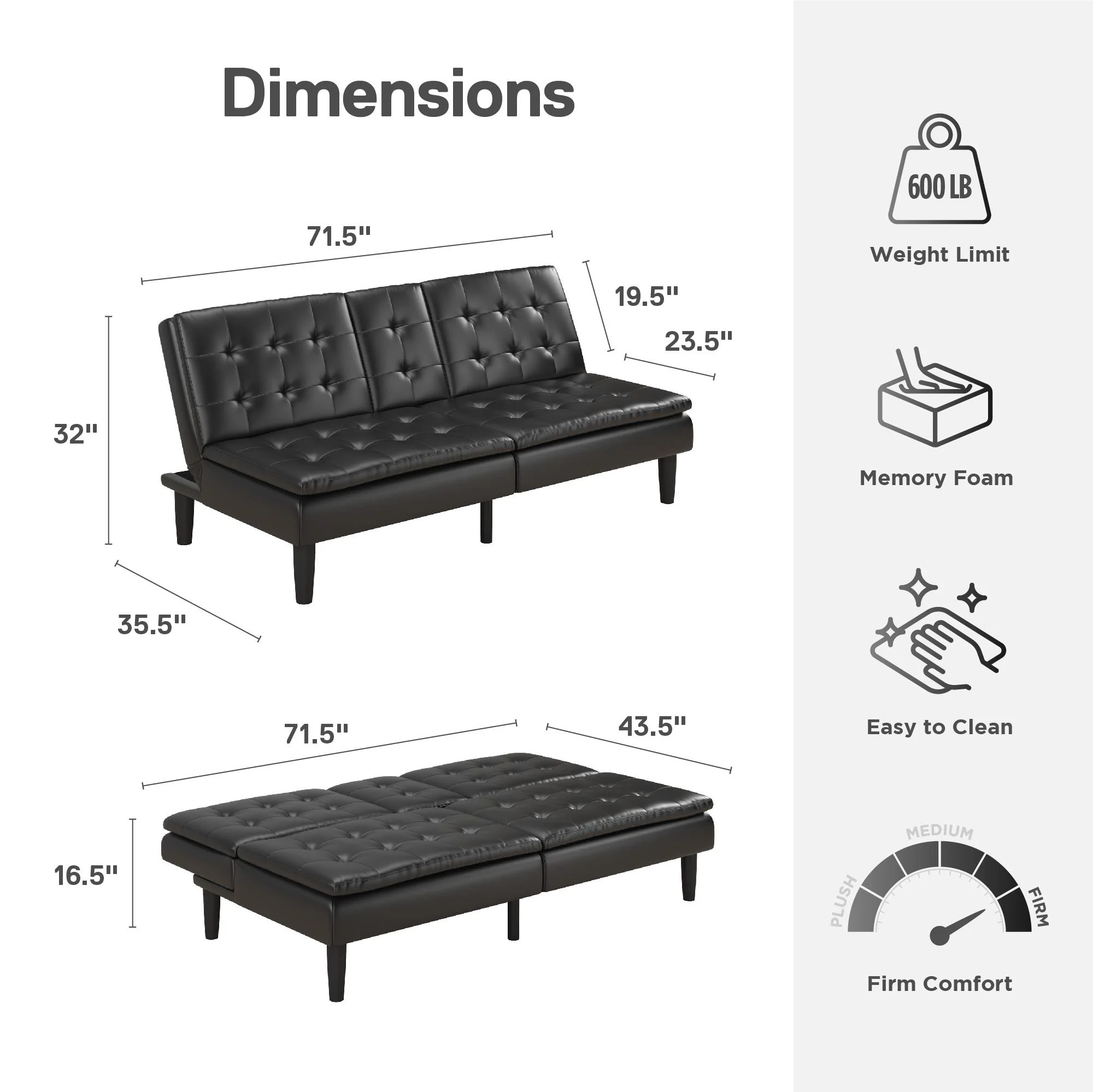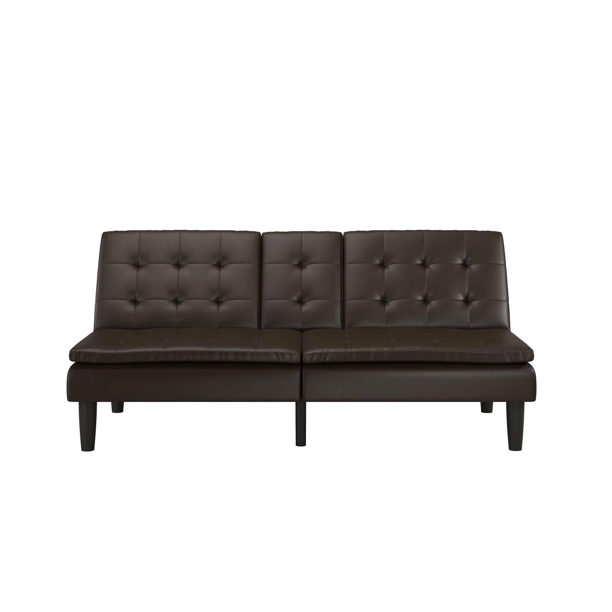 - Upholstered in faux leather, this futon is designed with a mid-century modern style. Clean lines, button-tufted detailing, and a memory foam layer pillow top seat ensure stylish body-hugging comfort sitting, lounging, or laying flat.