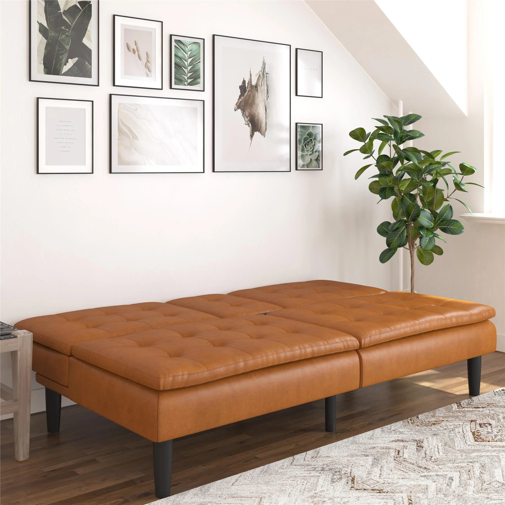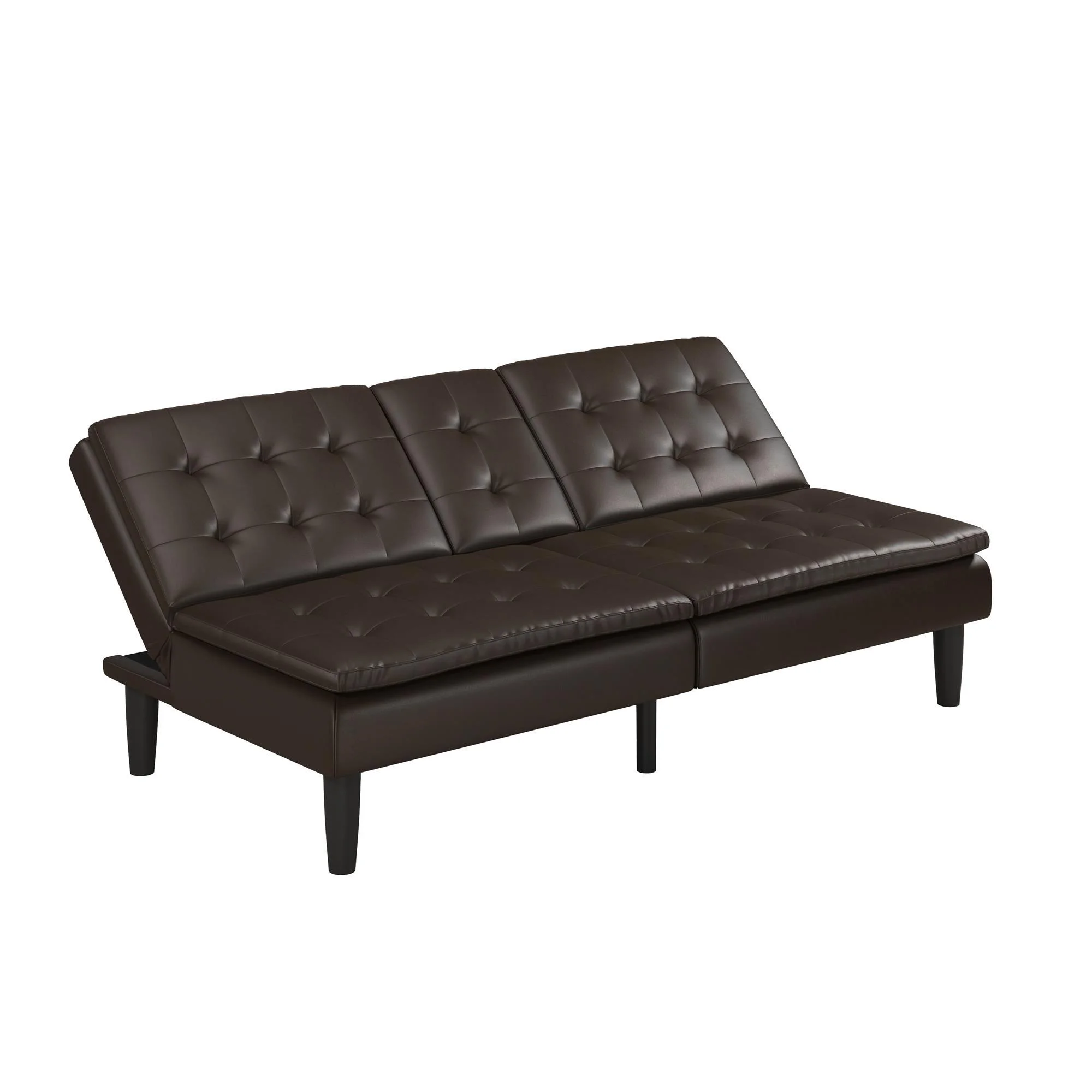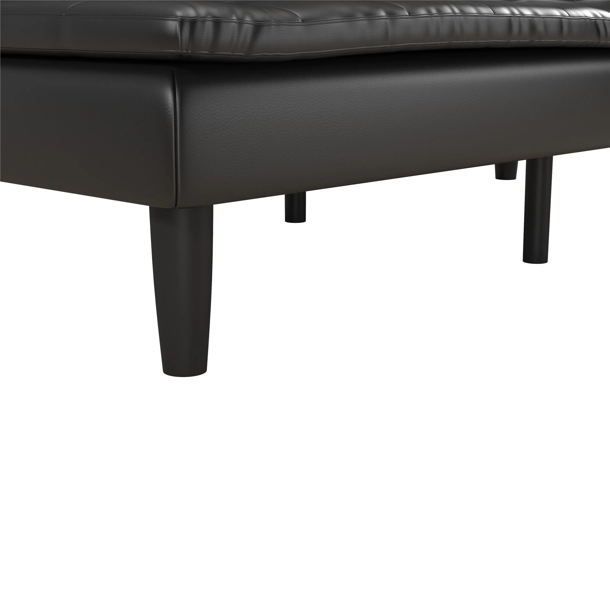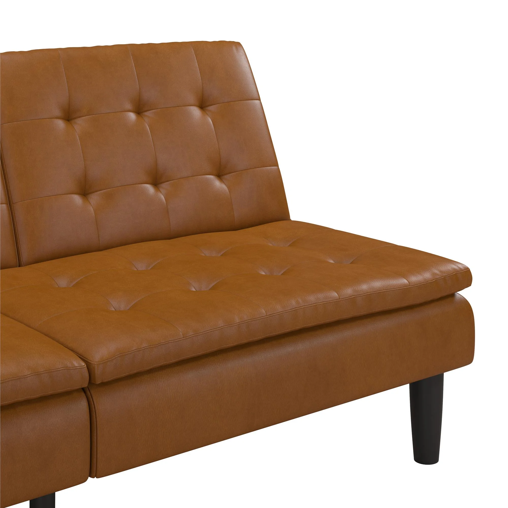 - Upholstered in faux leather, this futon is designed with a mid-century modern style. Clean lines, button-tufted detailing, and a memory foam layer pillow top seat ensure stylish body-hugging comfort sitting, lounging, or laying flat.