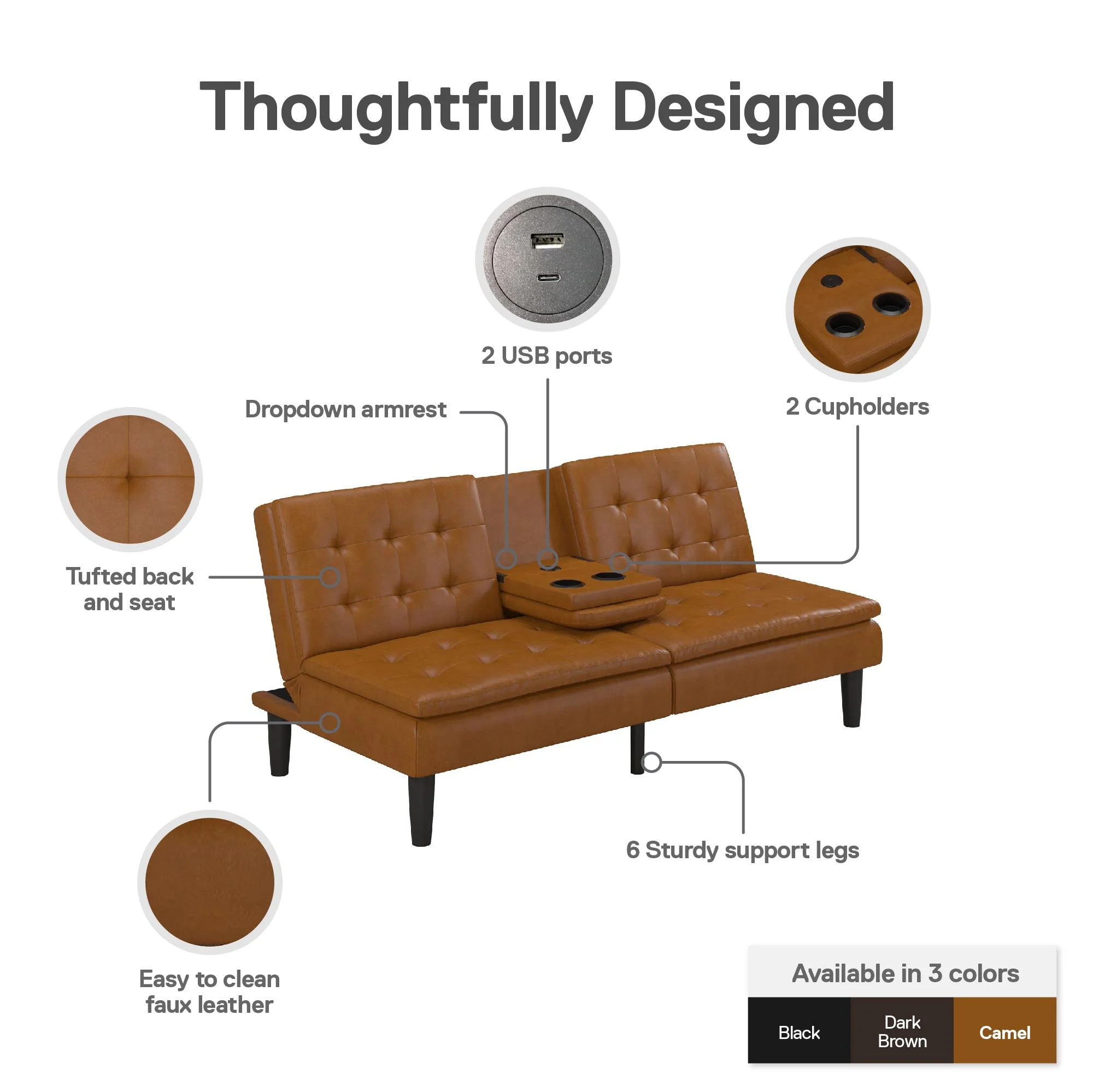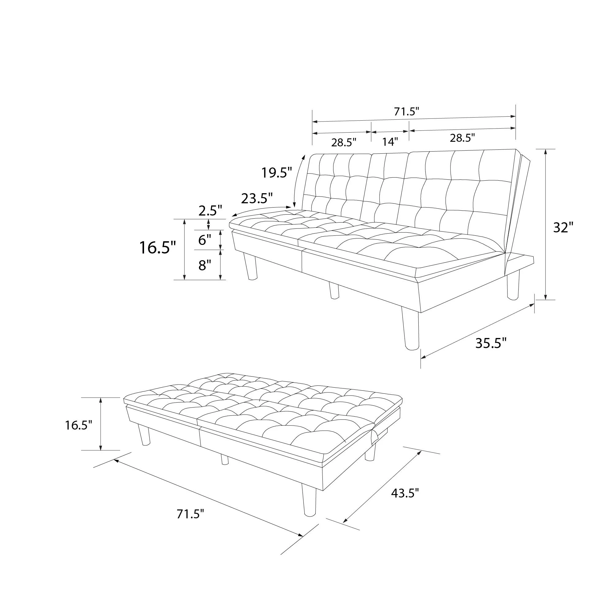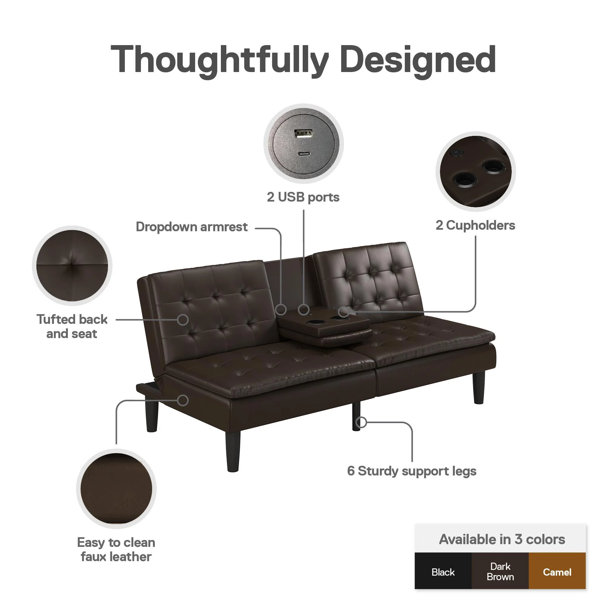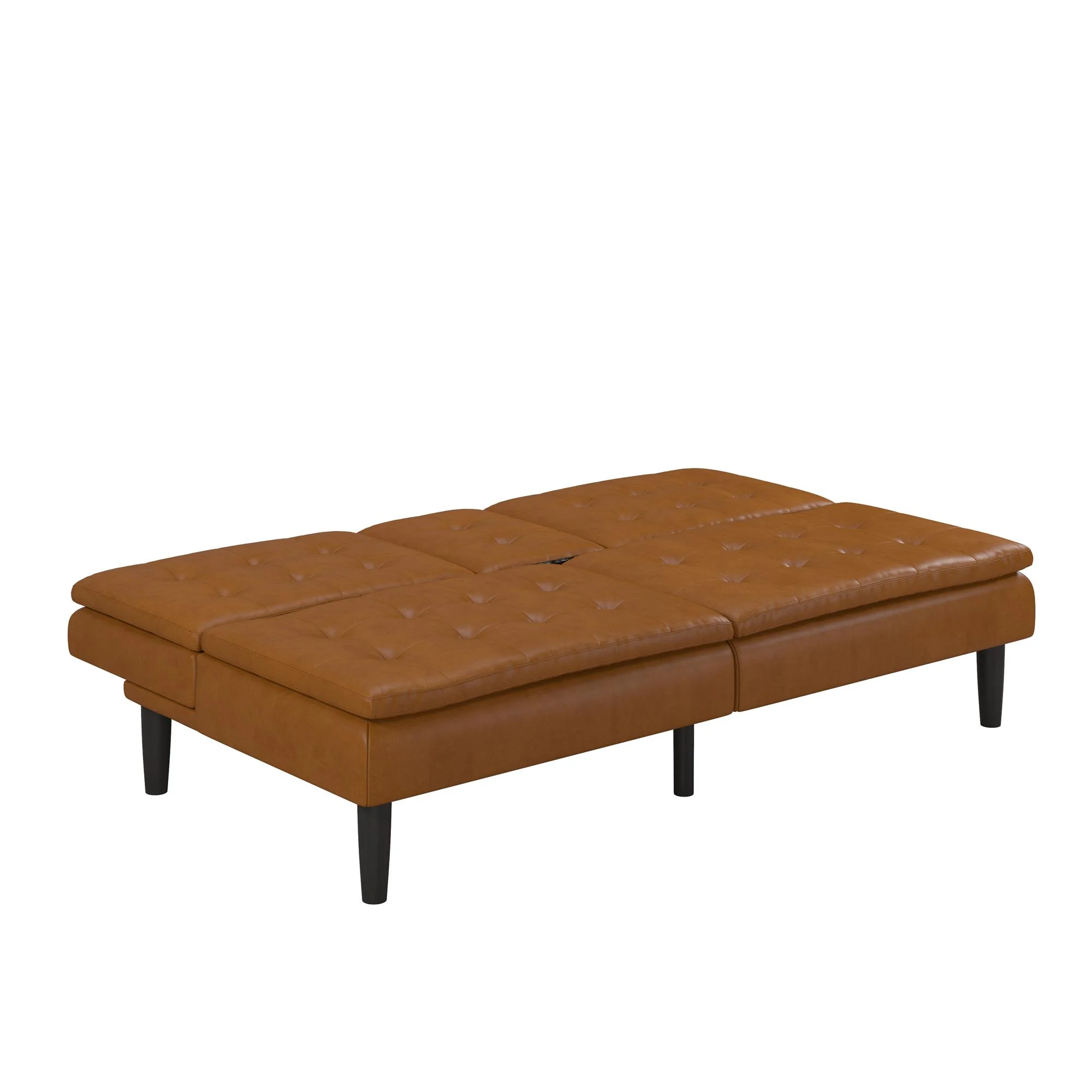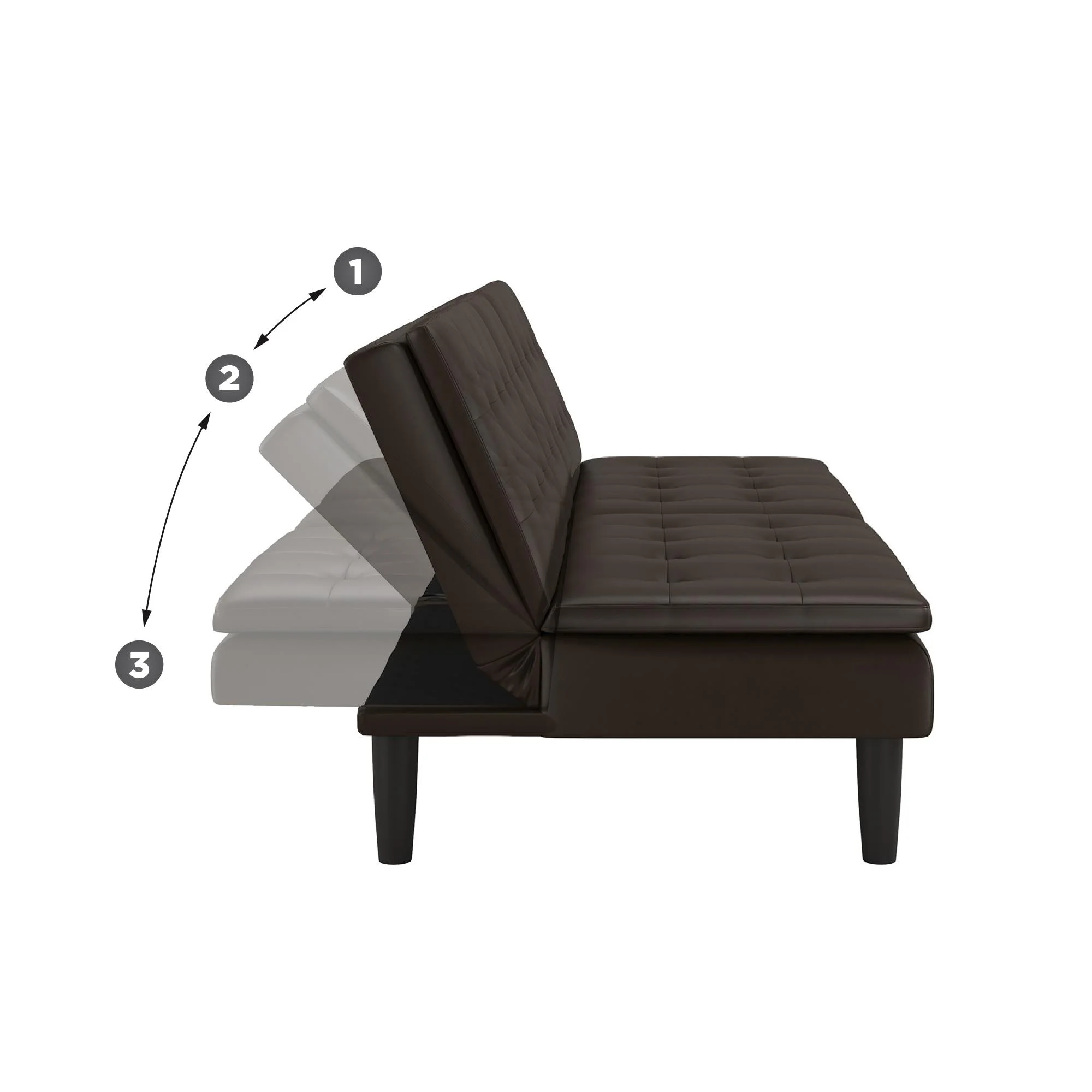 - Upholstered in faux leather, this futon is designed with a mid-century modern style. Clean lines, button-tufted detailing, and a memory foam layer pillow top seat ensure stylish body-hugging comfort sitting, lounging, or laying flat.