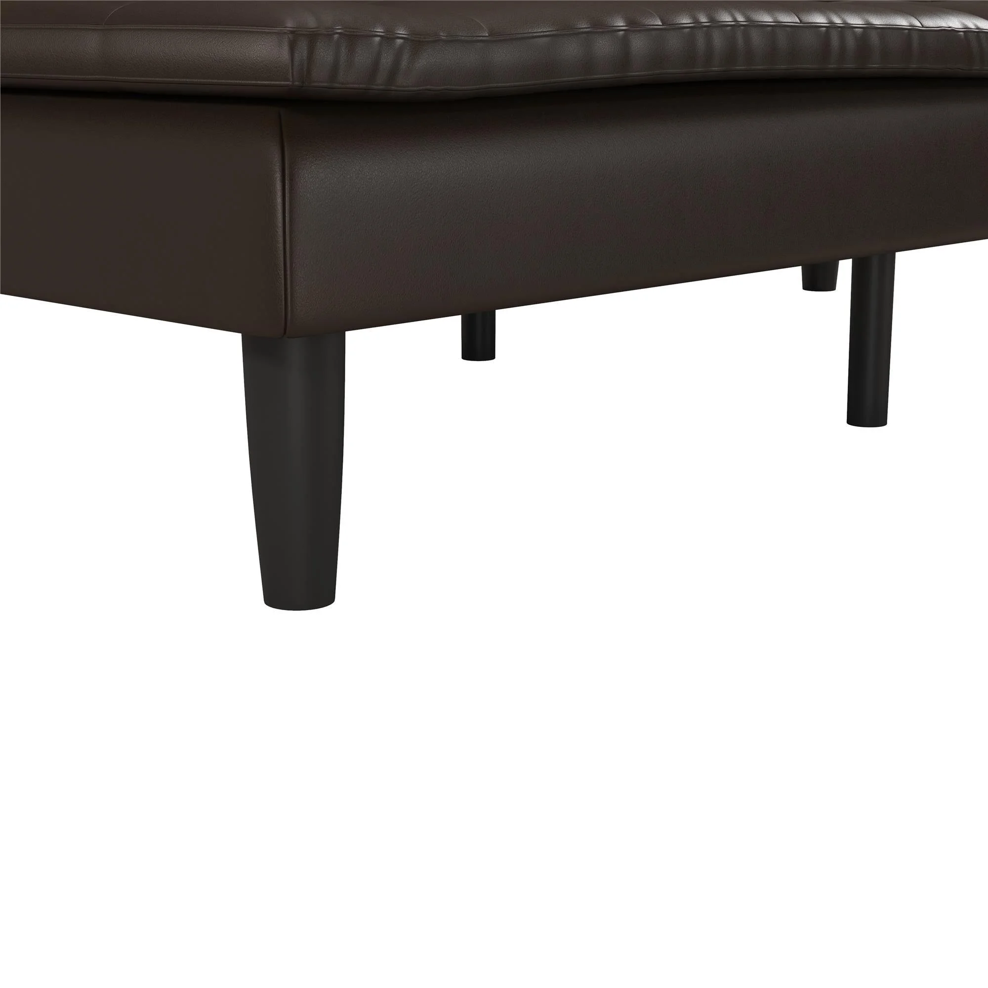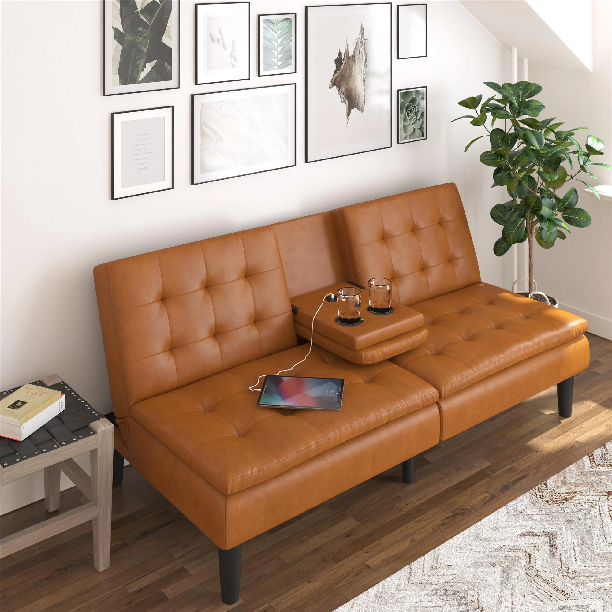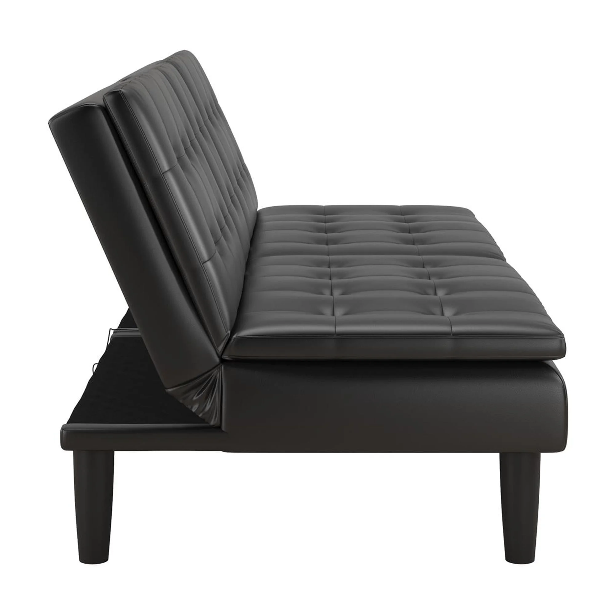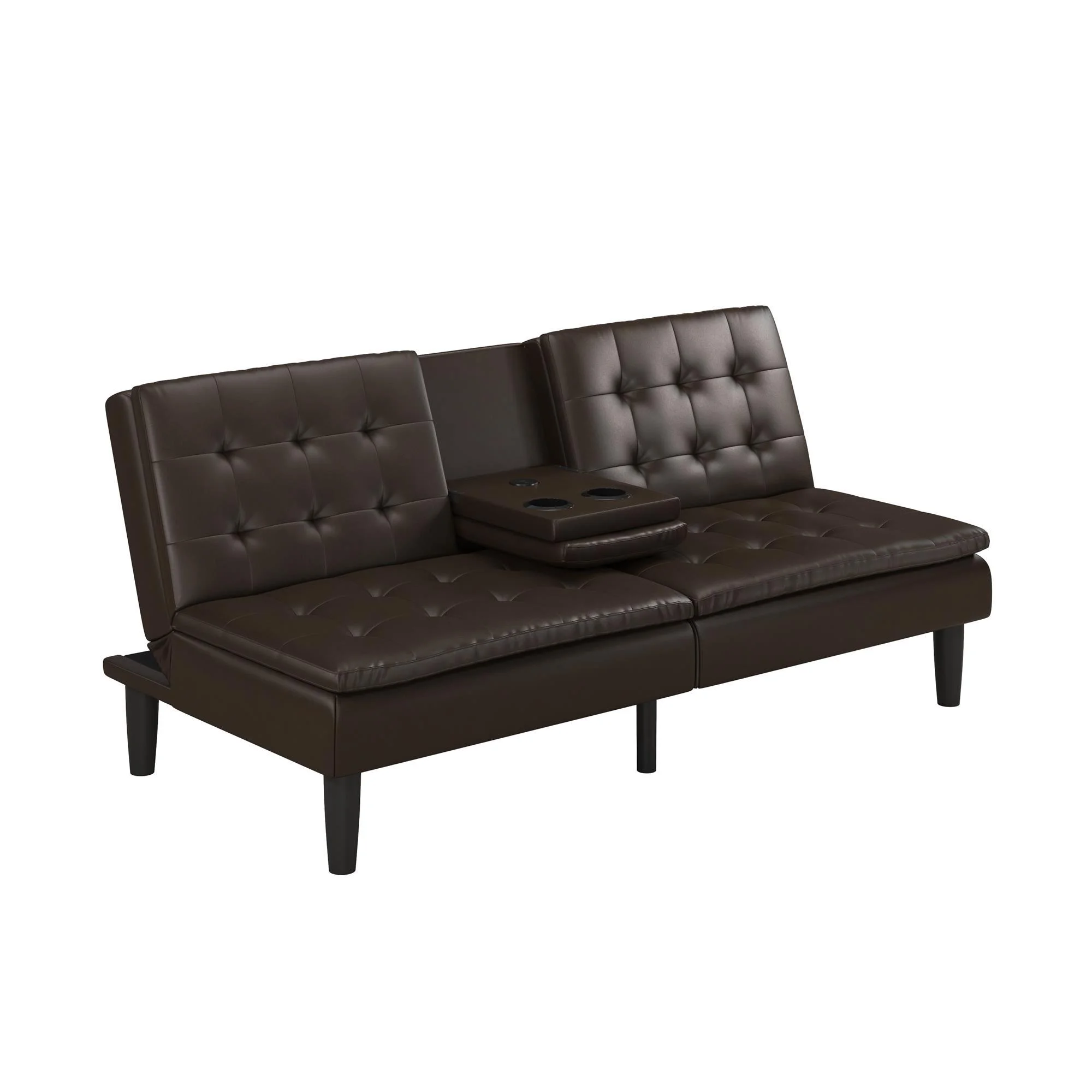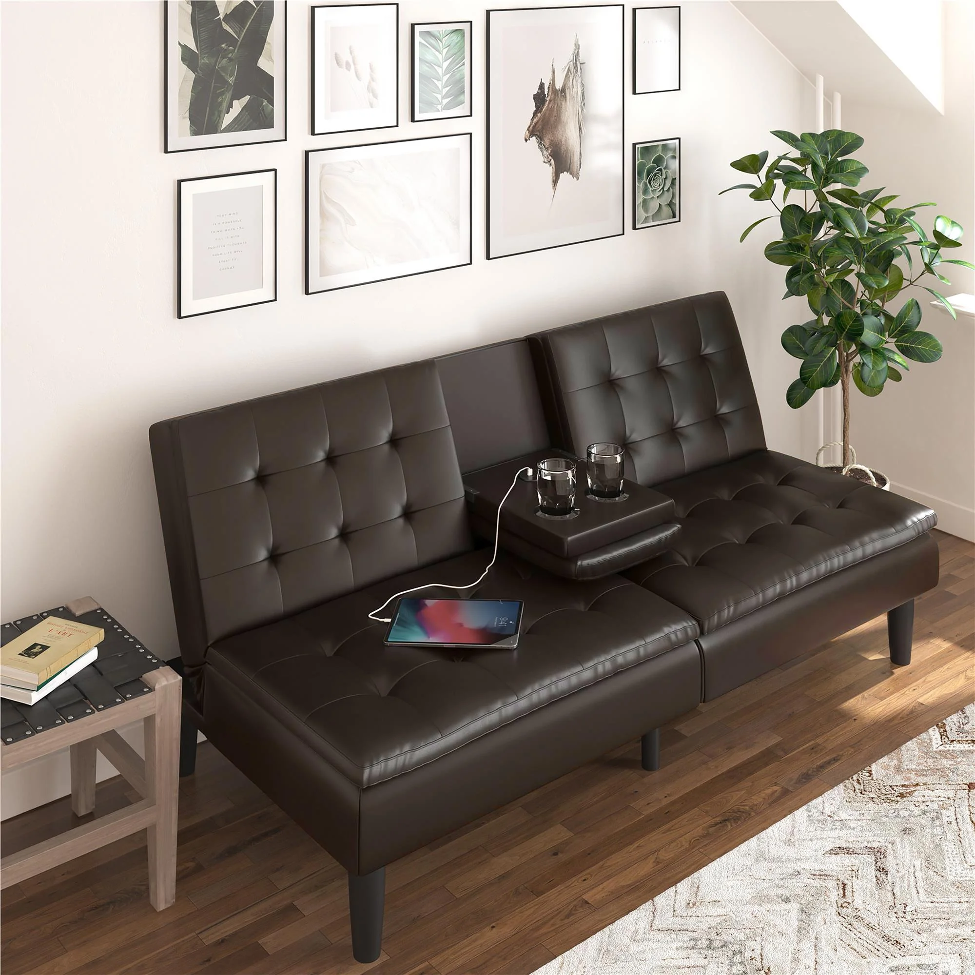 - Upholstered in faux leather, this futon is designed with a mid-century modern style. Clean lines, button-tufted detailing, and a memory foam layer pillow top seat ensure stylish body-hugging comfort sitting, lounging, or laying flat.