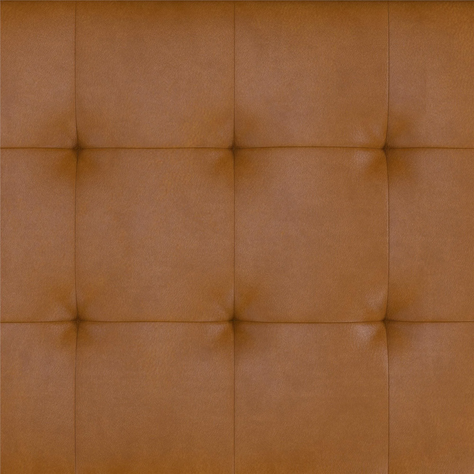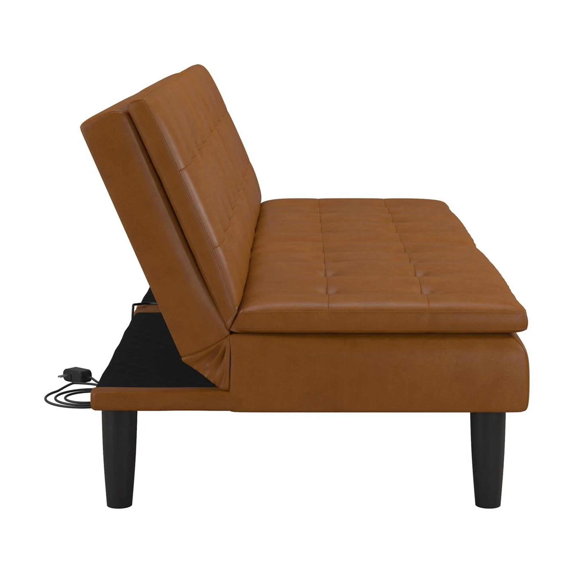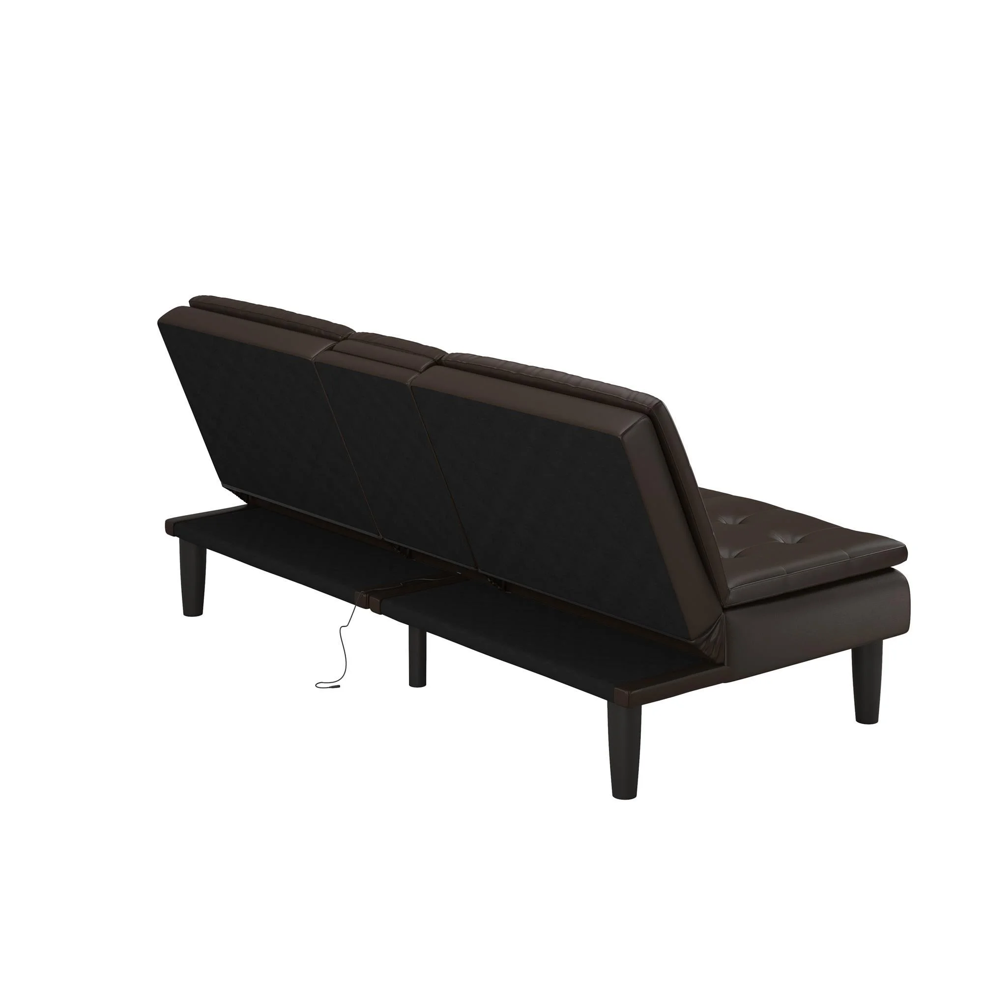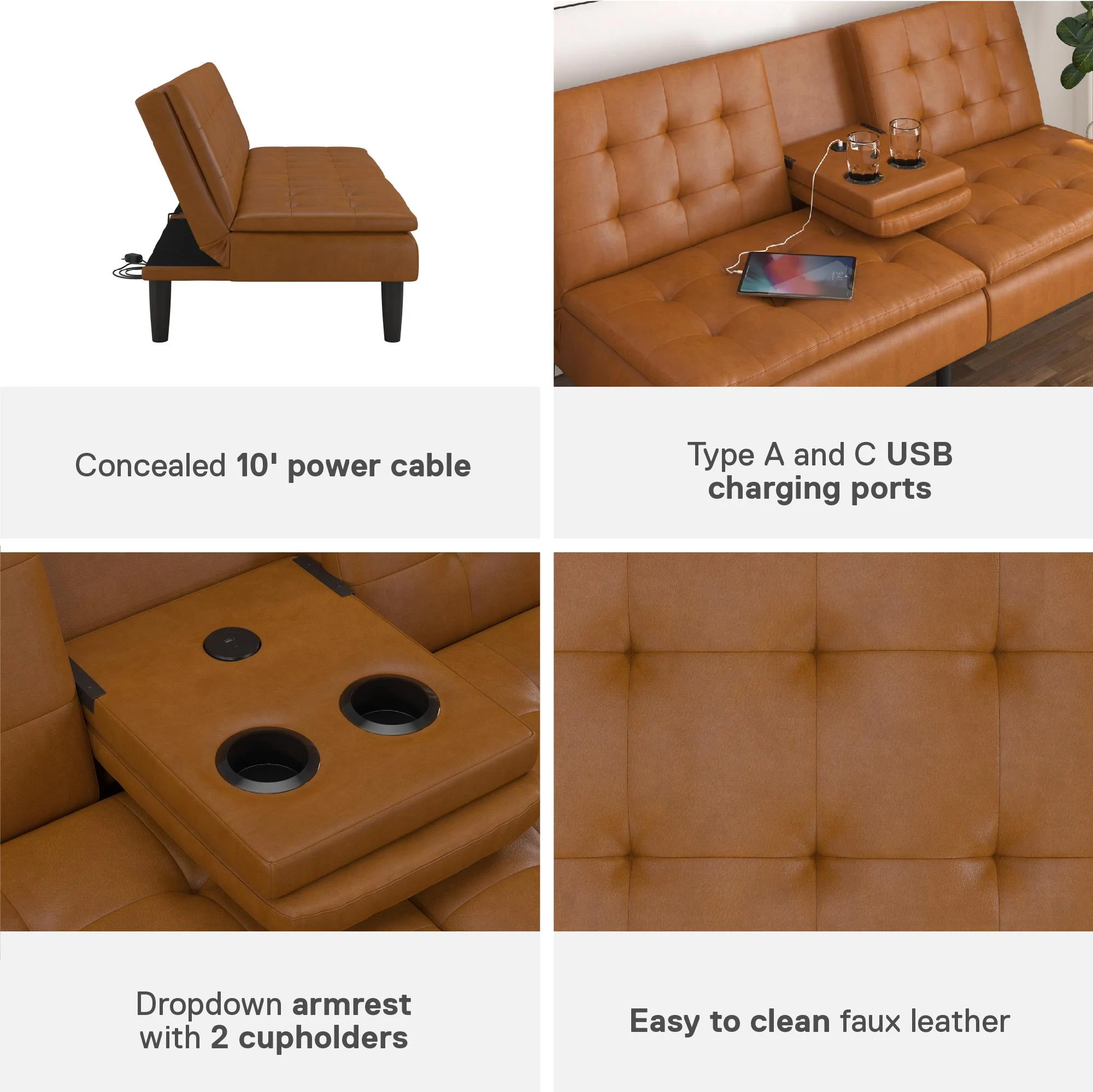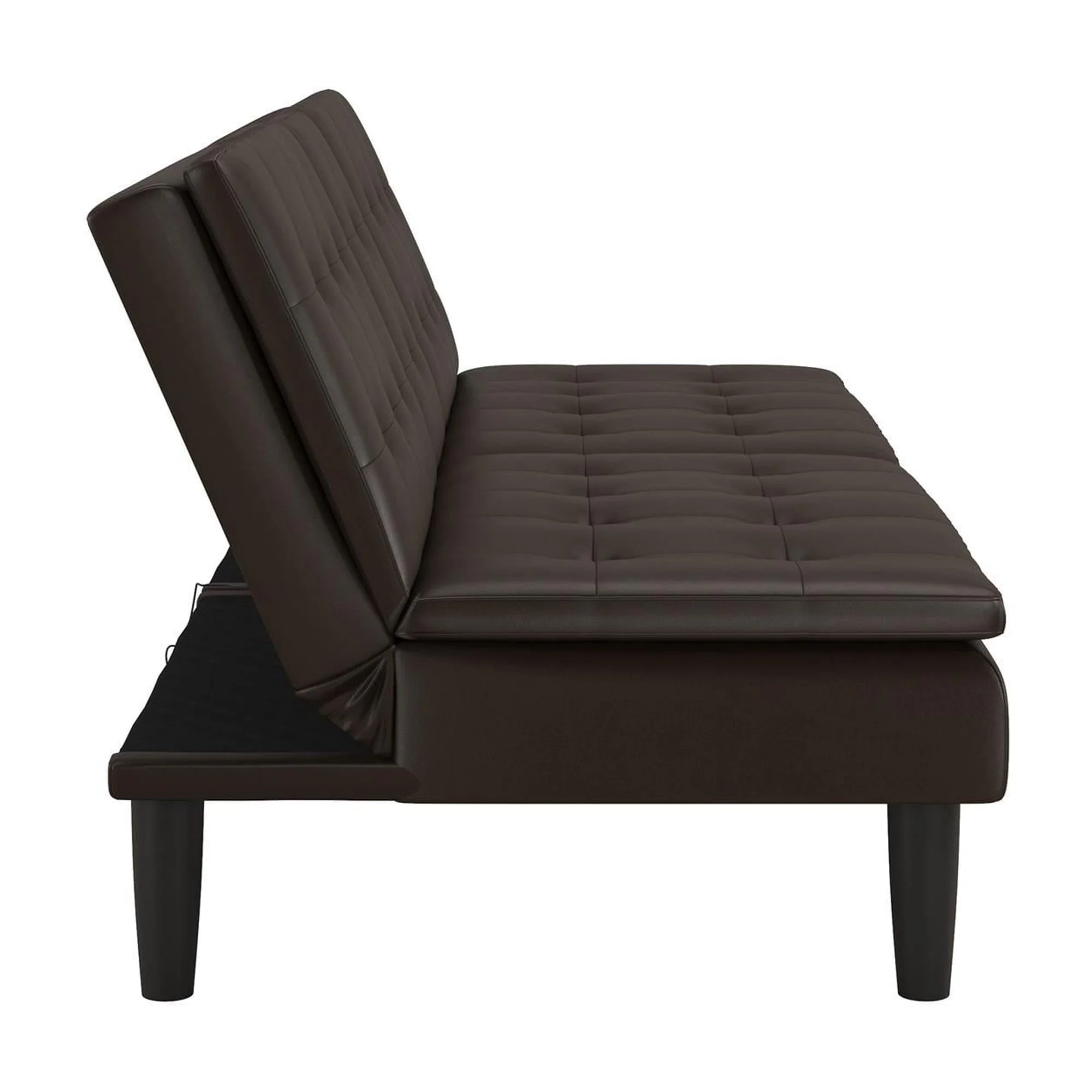 - Upholstered in faux leather, this futon is designed with a mid-century modern style. Clean lines, button-tufted detailing, and a memory foam layer pillow top seat ensure stylish body-hugging comfort sitting, lounging, or laying flat.