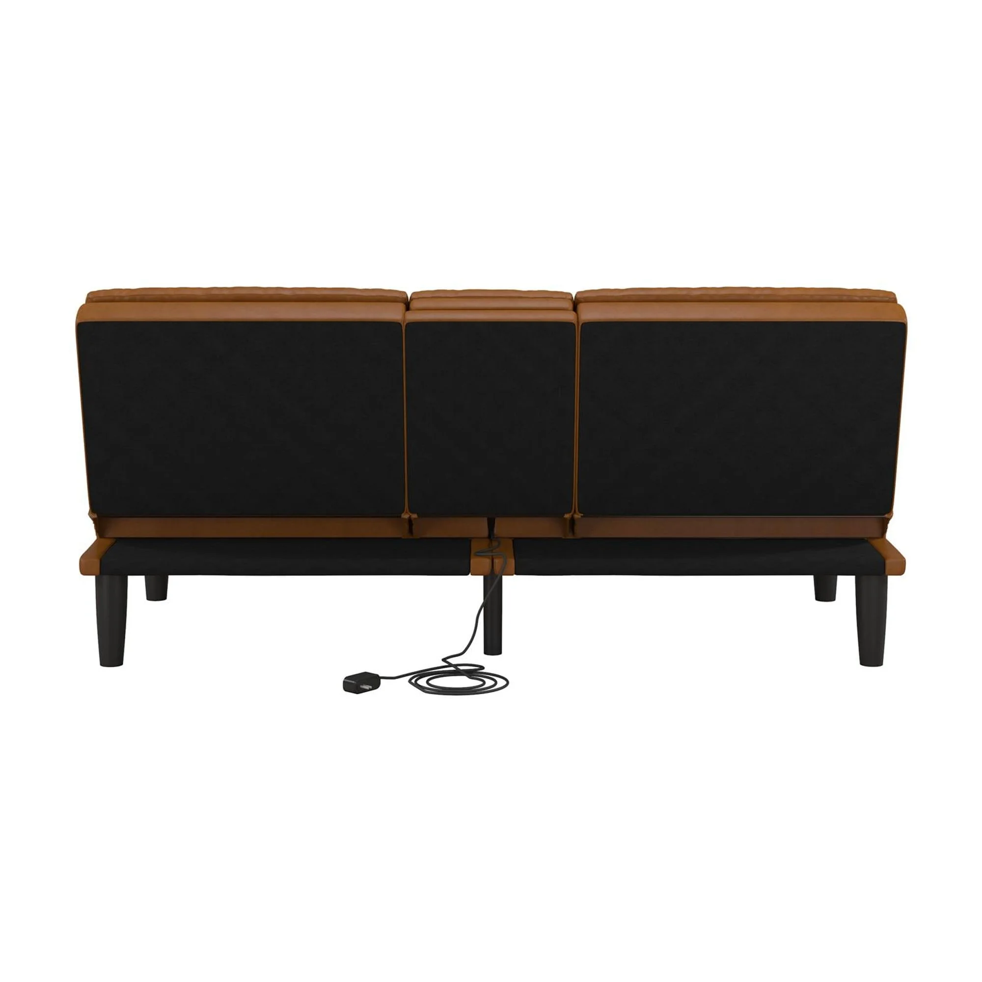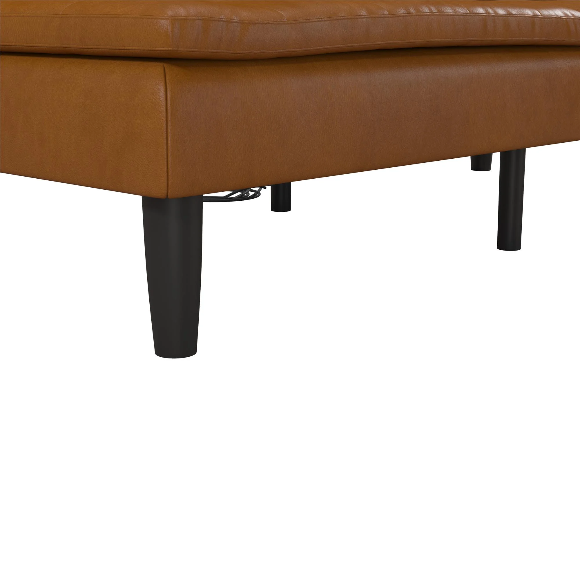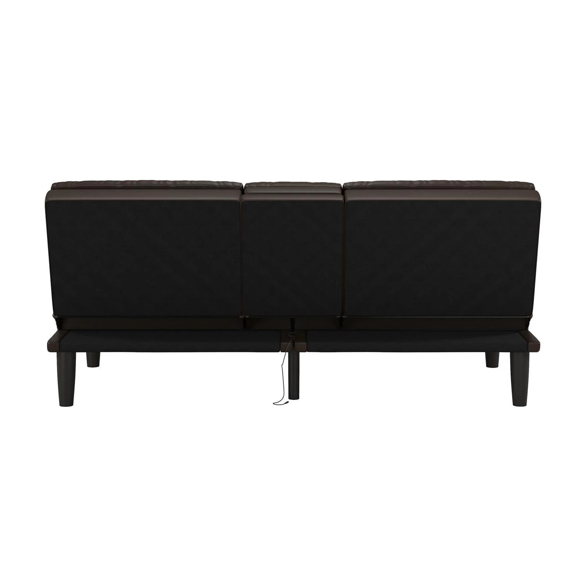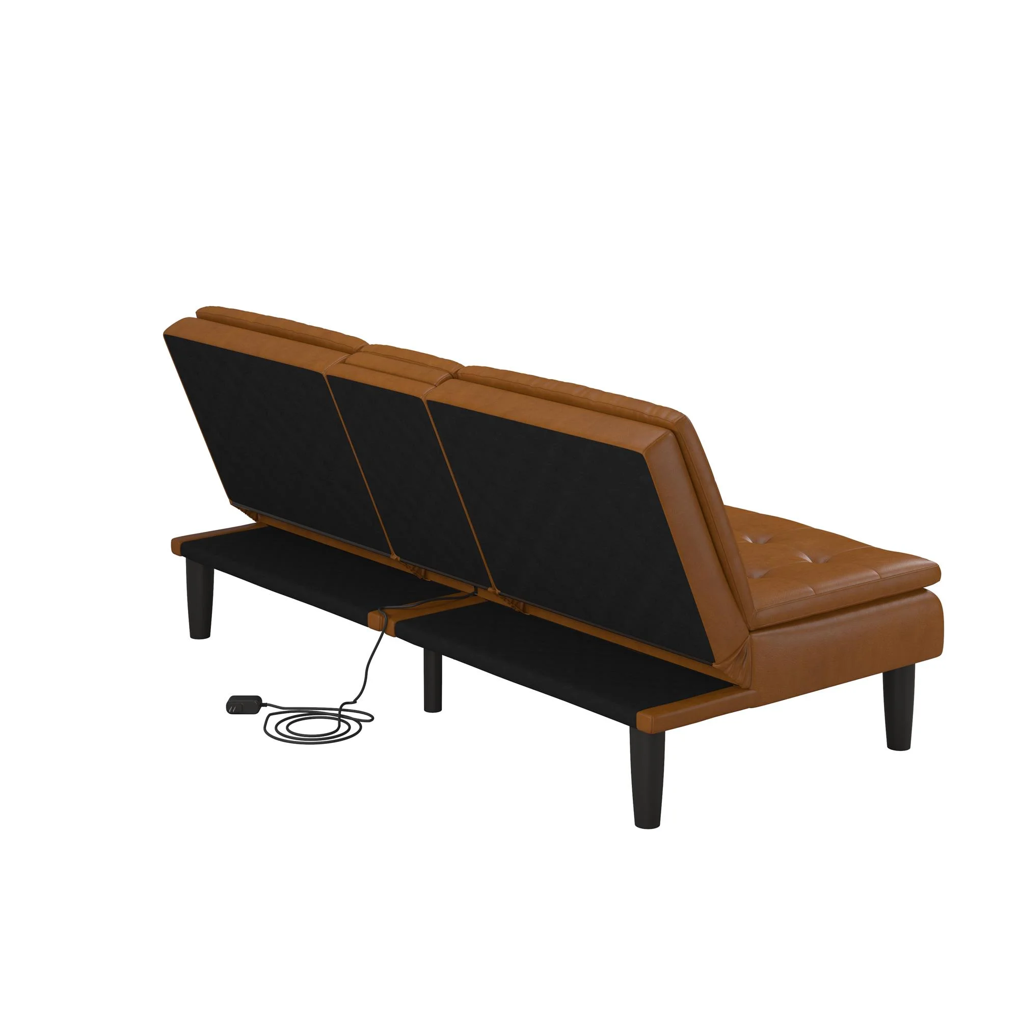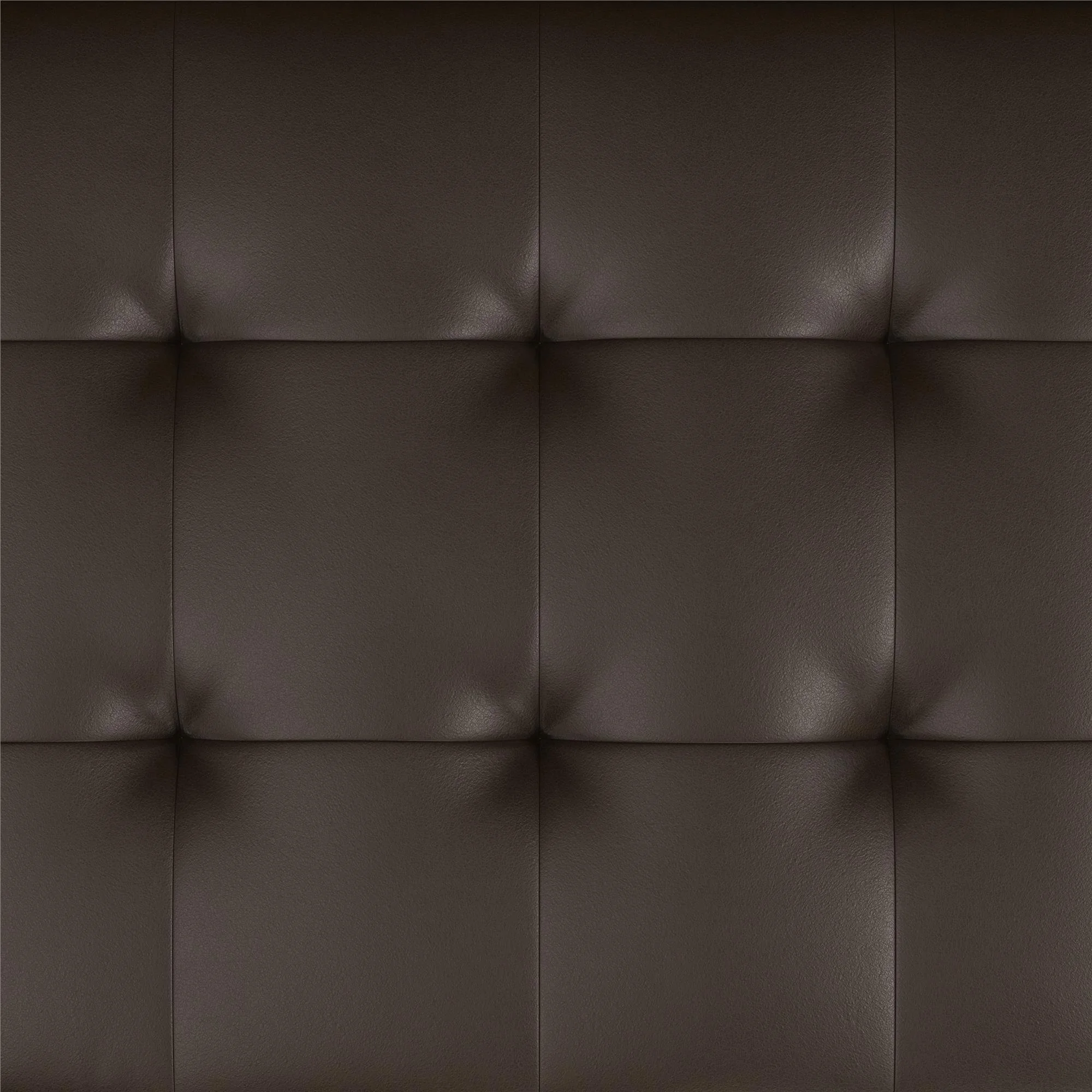 - Upholstered in faux leather, this futon is designed with a mid-century modern style. Clean lines, button-tufted detailing, and a memory foam layer pillow top seat ensure stylish body-hugging comfort sitting, lounging, or laying flat.
