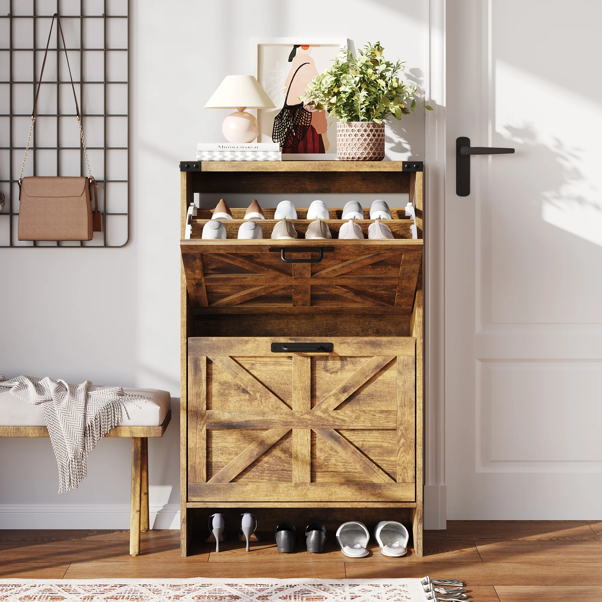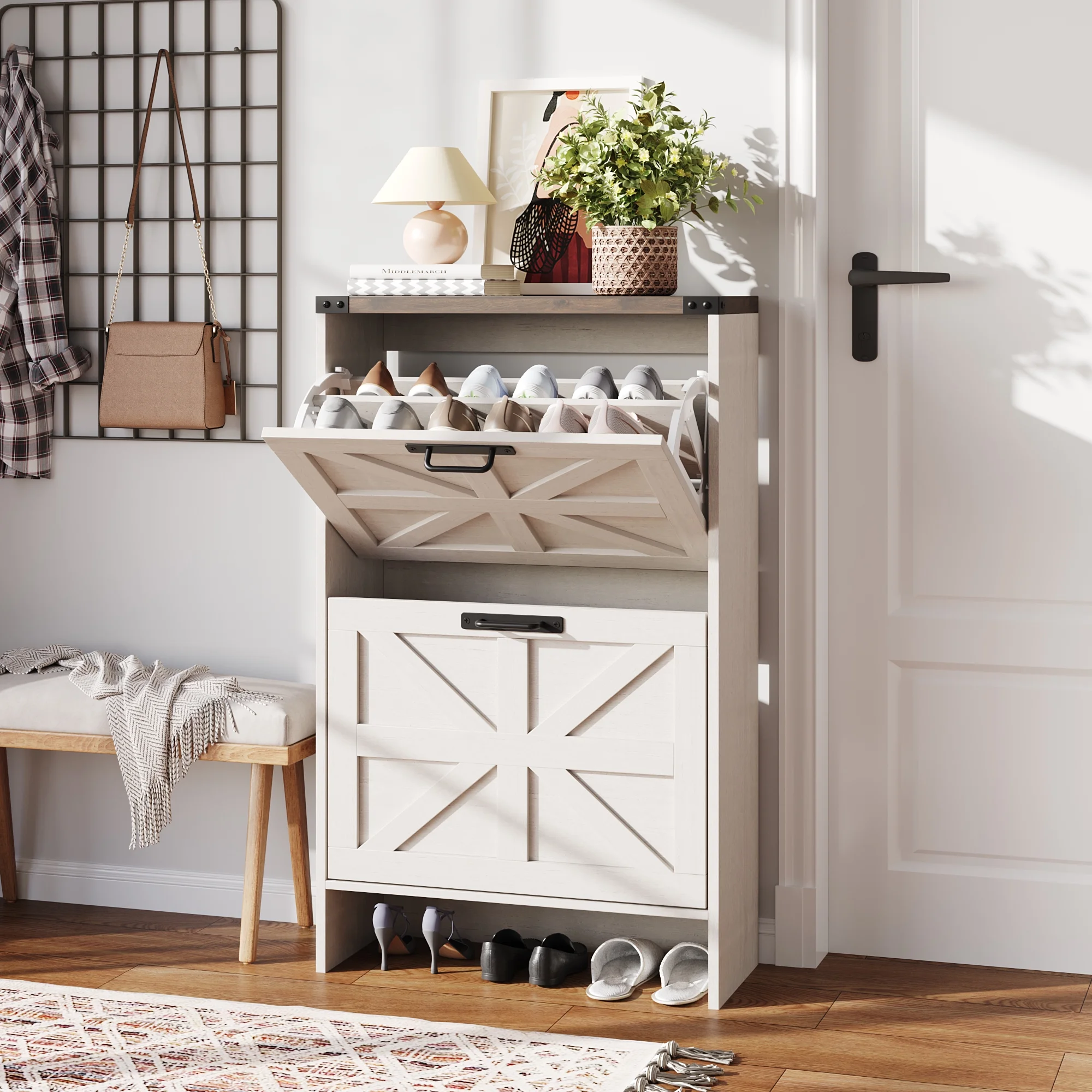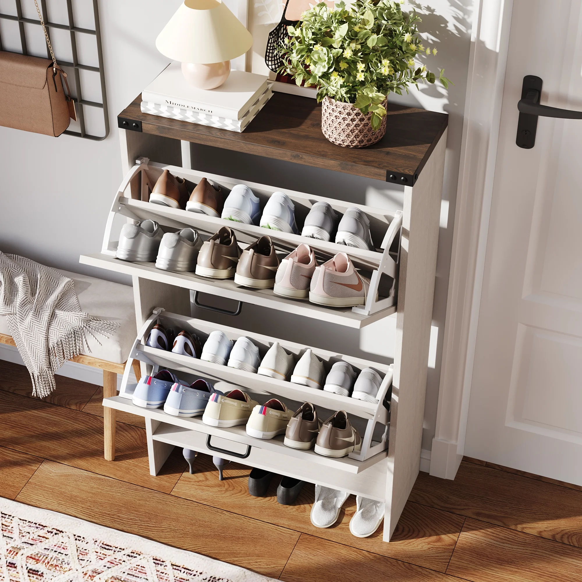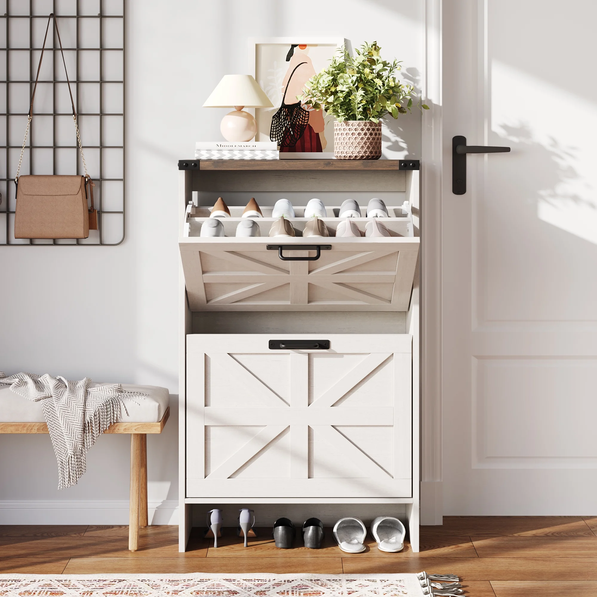 - ??��2 Flip Drawers��This slim shoe cabinet with 2 flip drawers and removable dividers offers efficient storage for shoes without taking up much space, with additional room for slippers at the base.