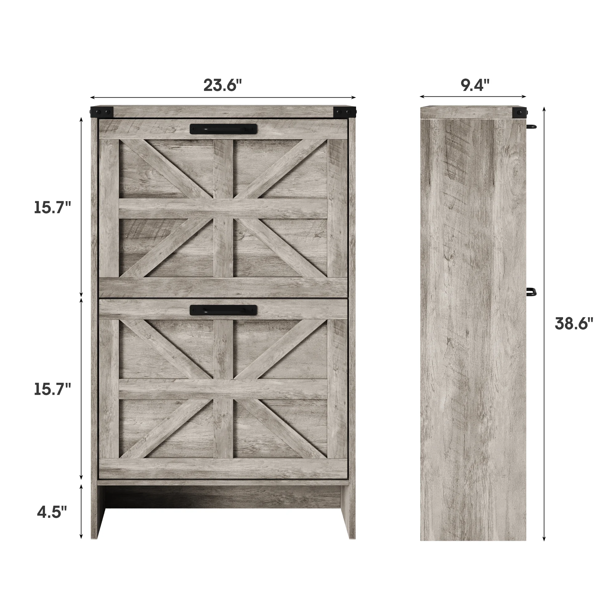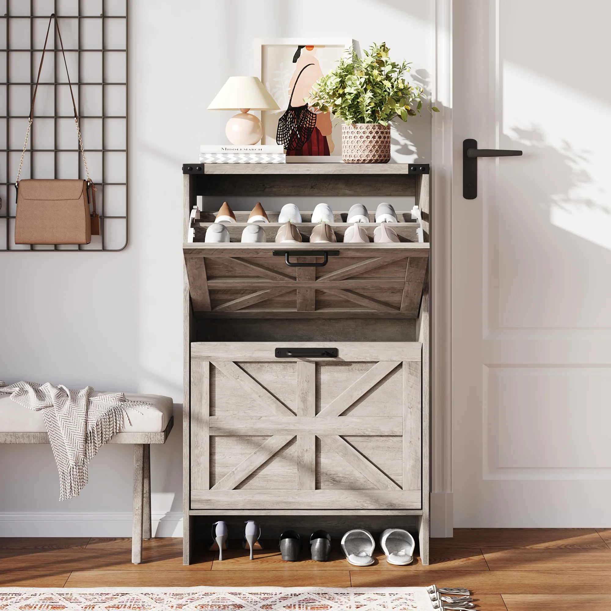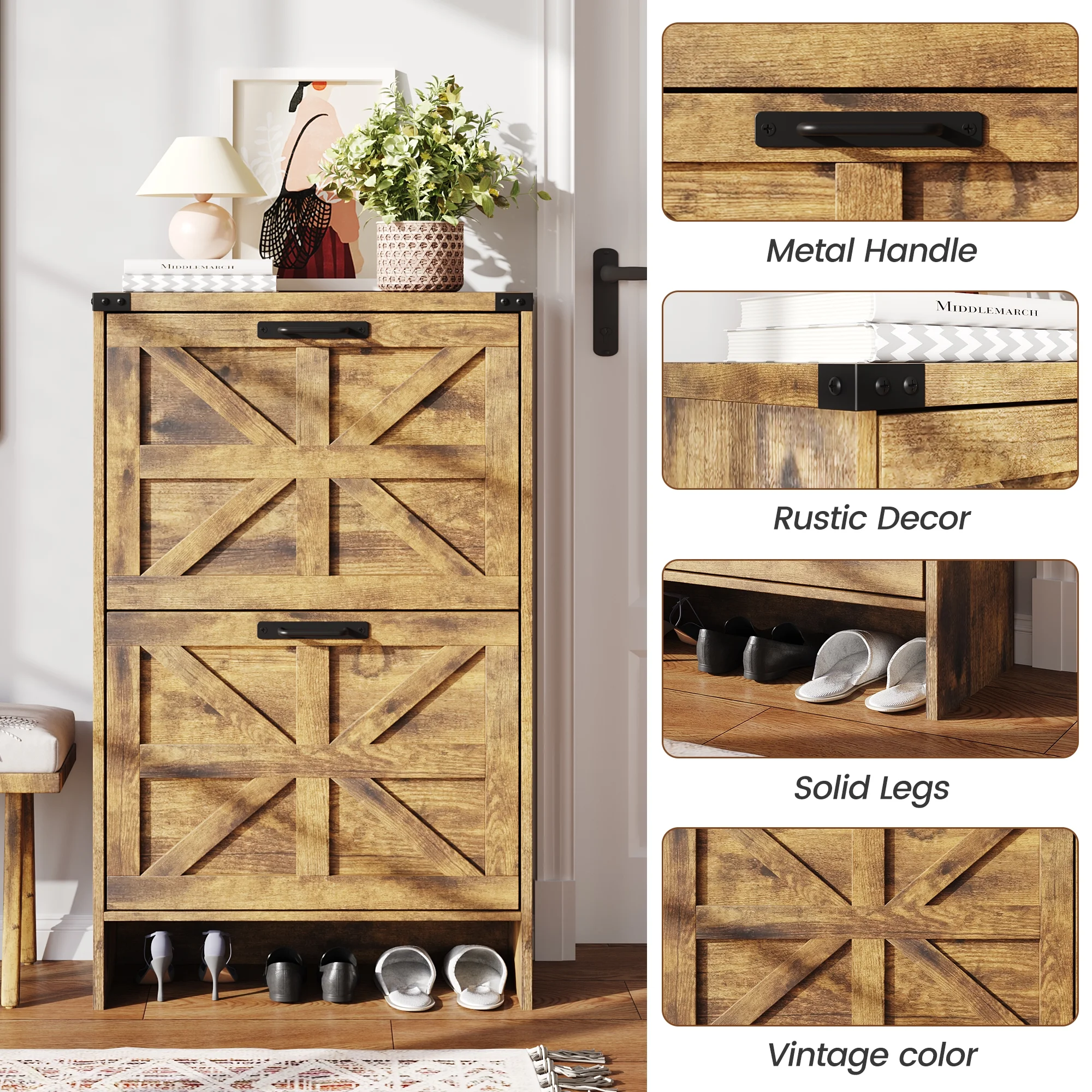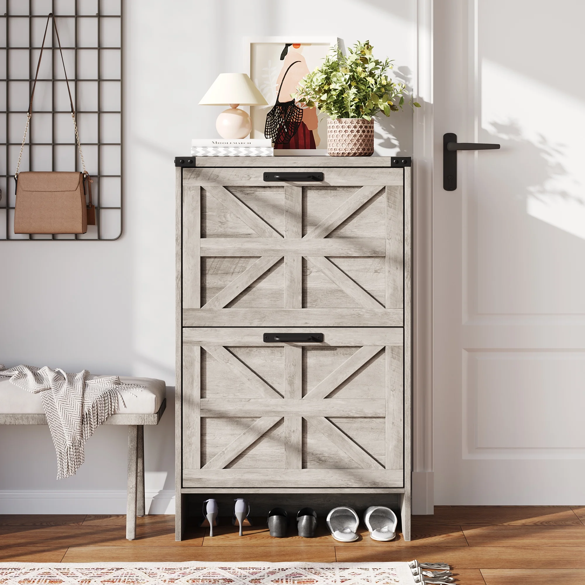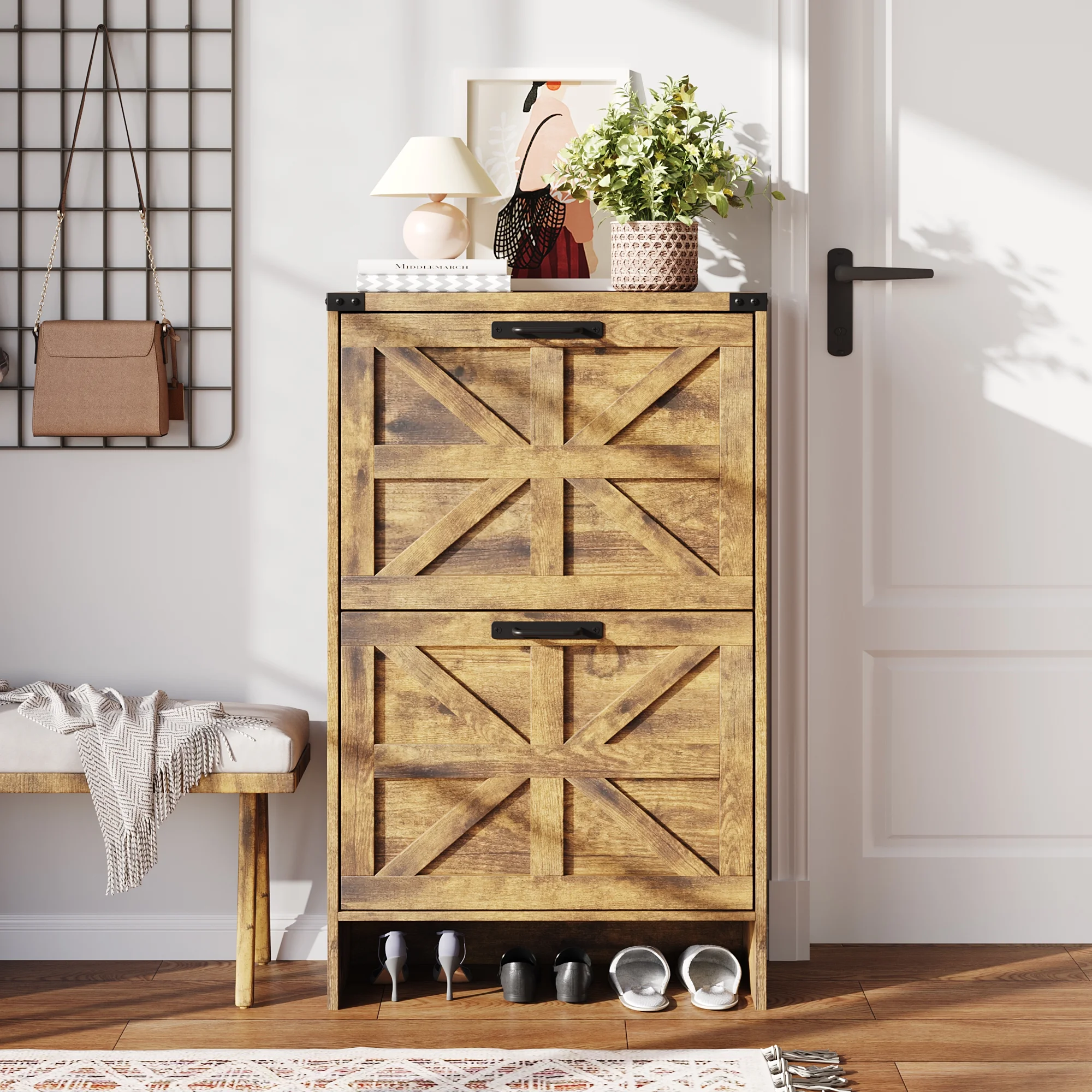 - ??��2 Flip Drawers��This slim shoe cabinet with 2 flip drawers and removable dividers offers efficient storage for shoes without taking up much space, with additional room for slippers at the base.