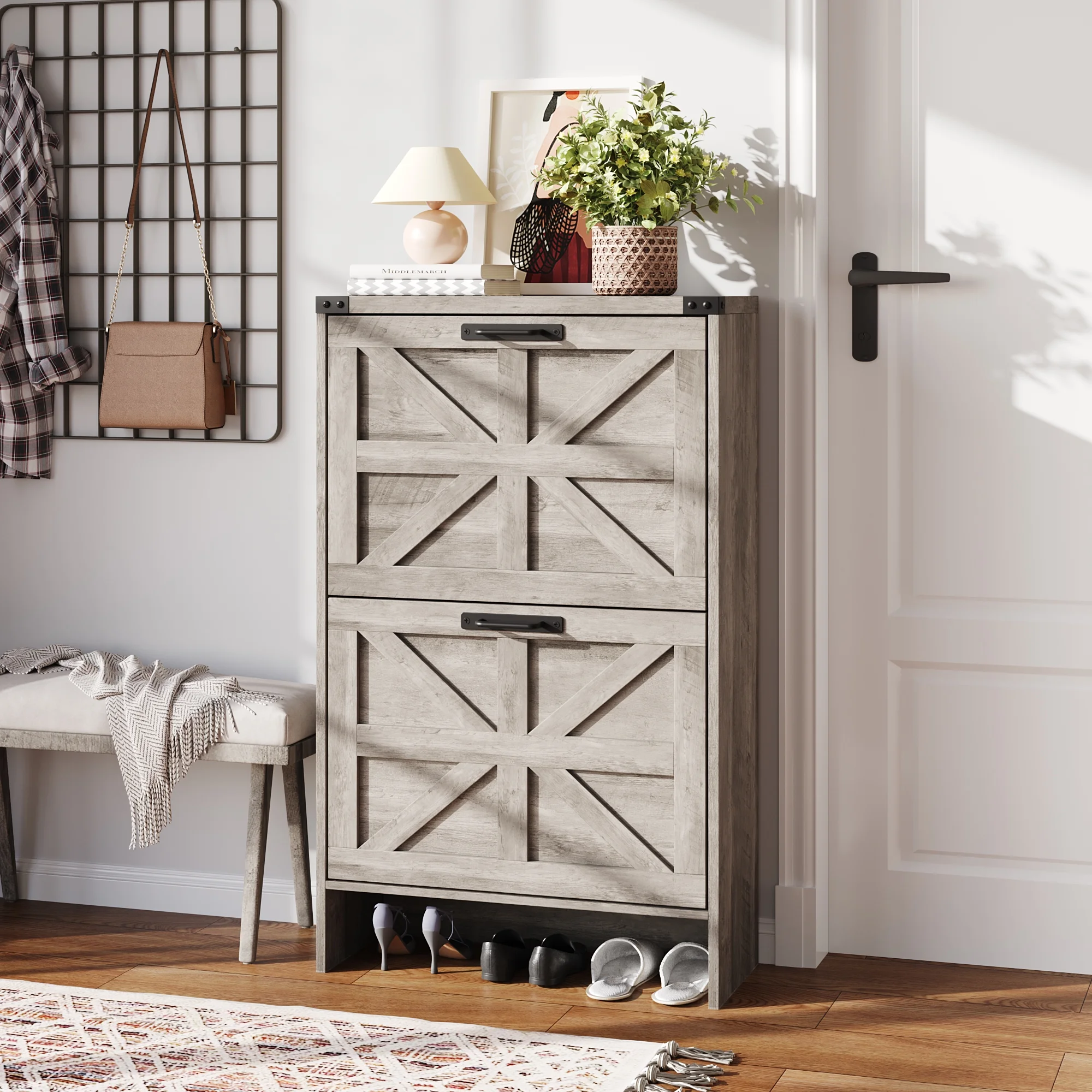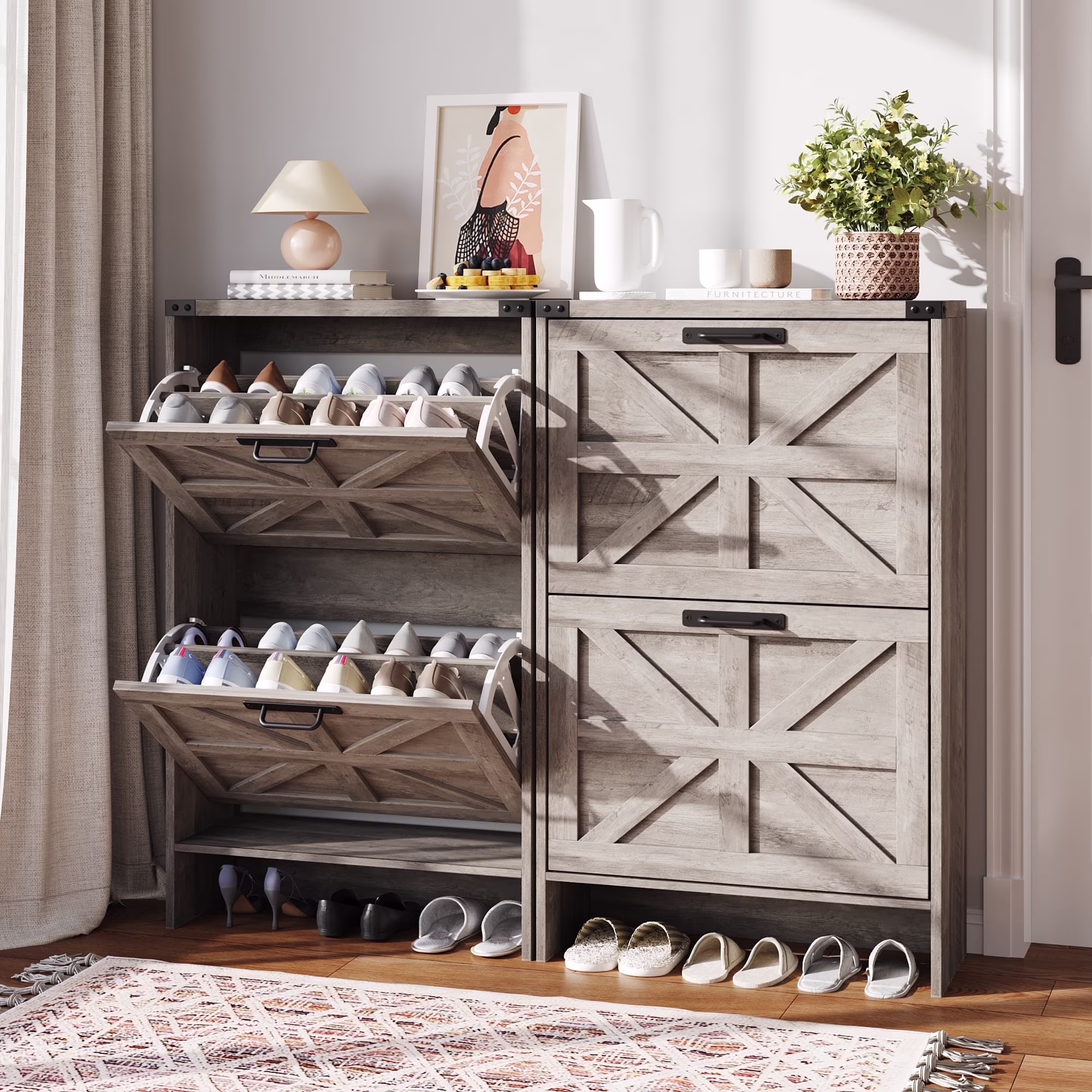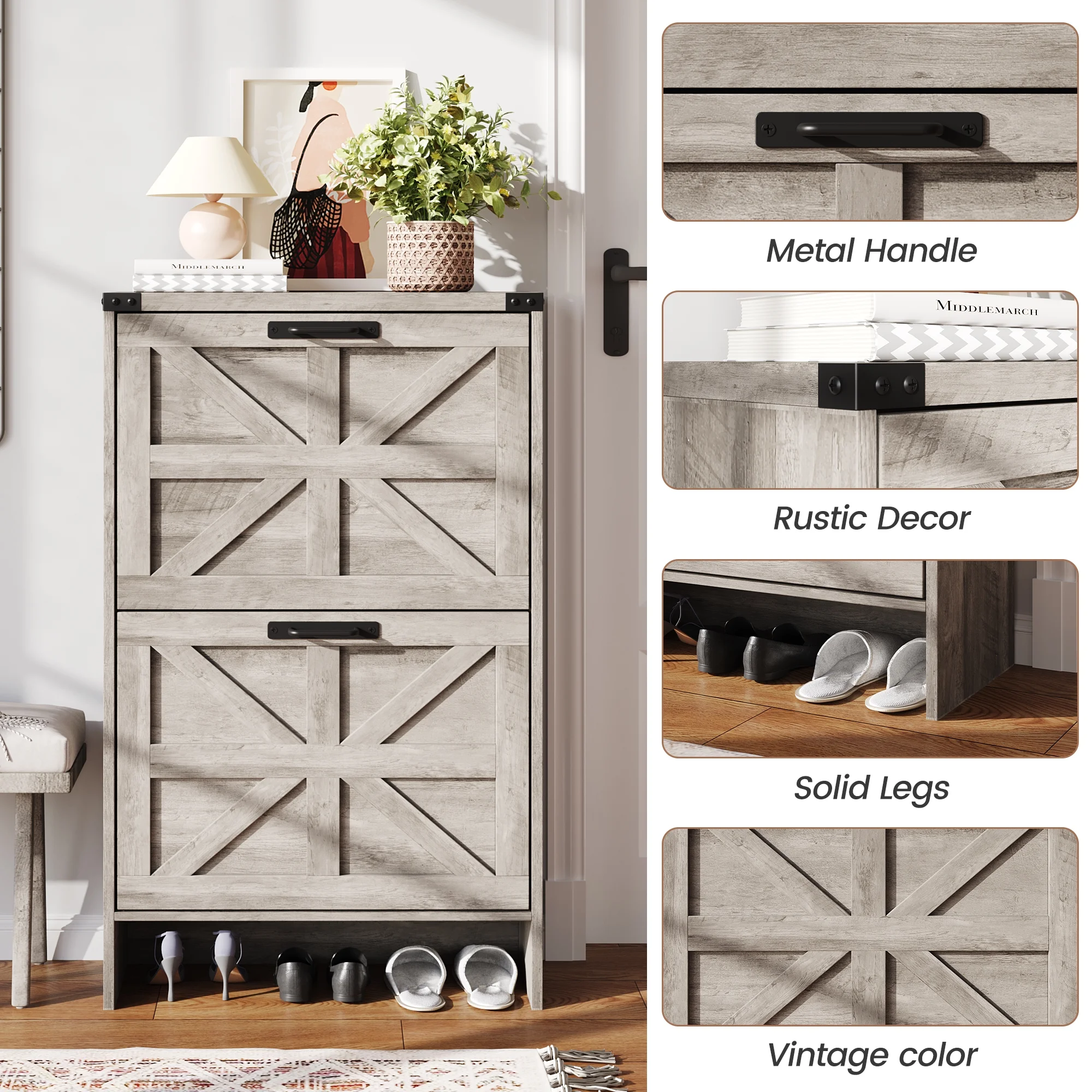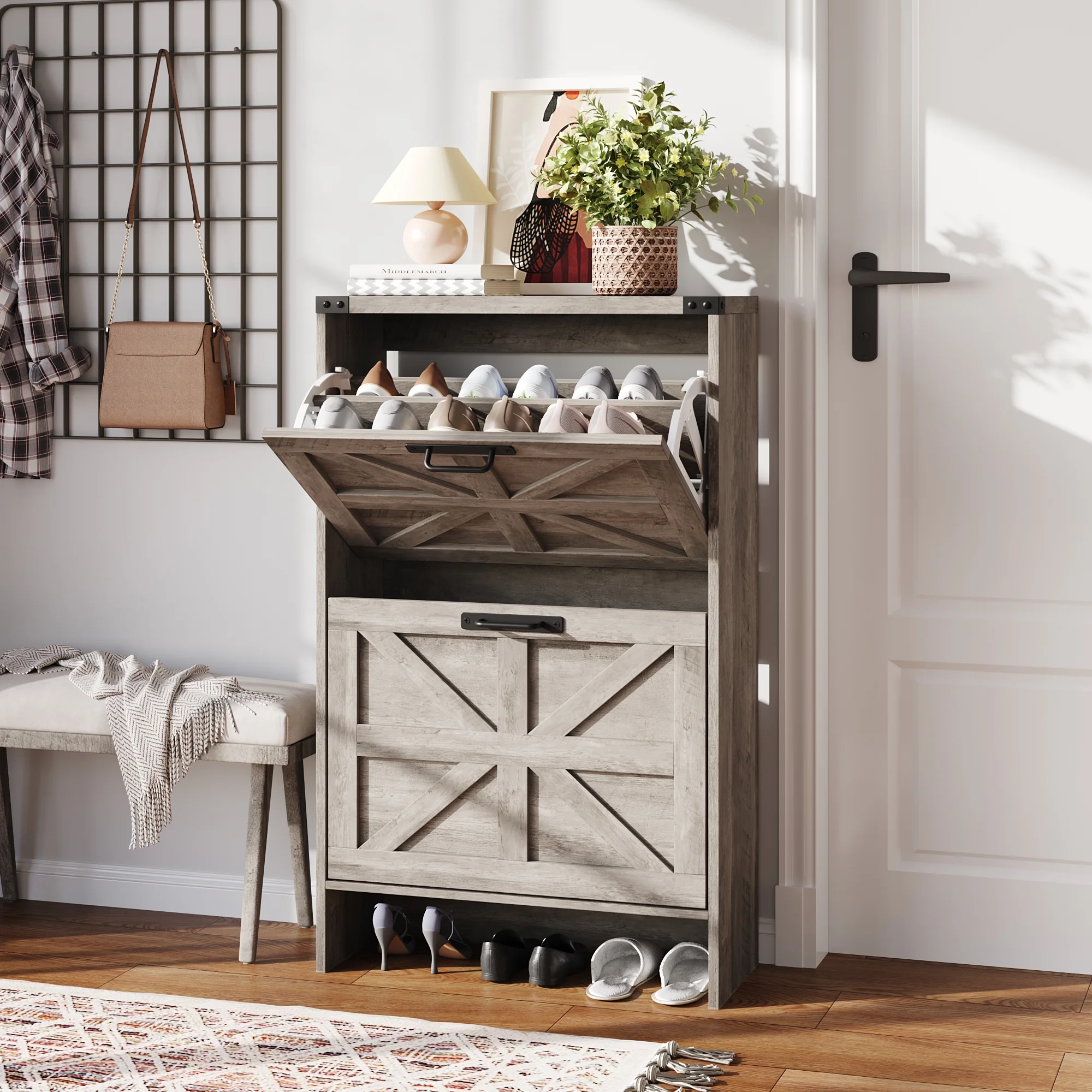 - ??��2 Flip Drawers��This slim shoe cabinet with 2 flip drawers and removable dividers offers efficient storage for shoes without taking up much space, with additional room for slippers at the base.