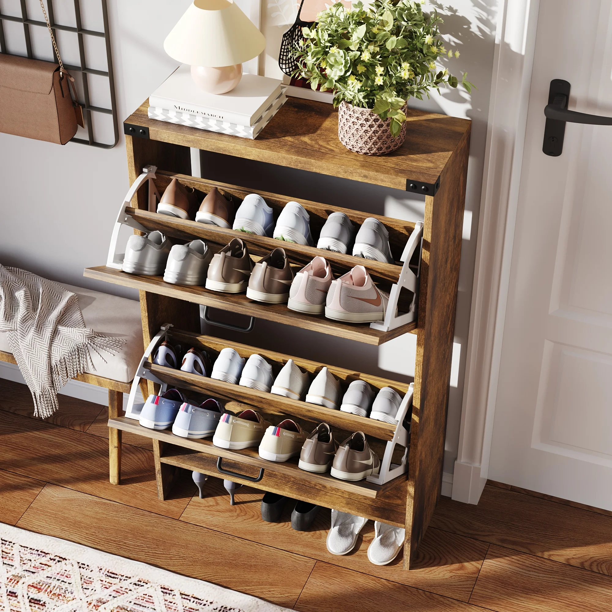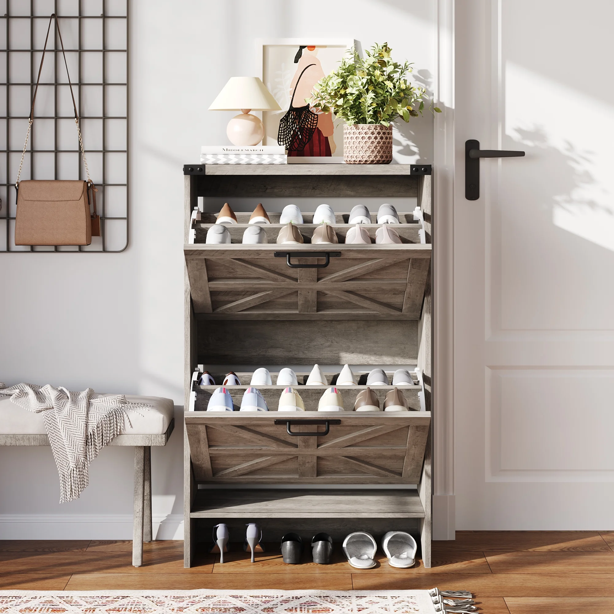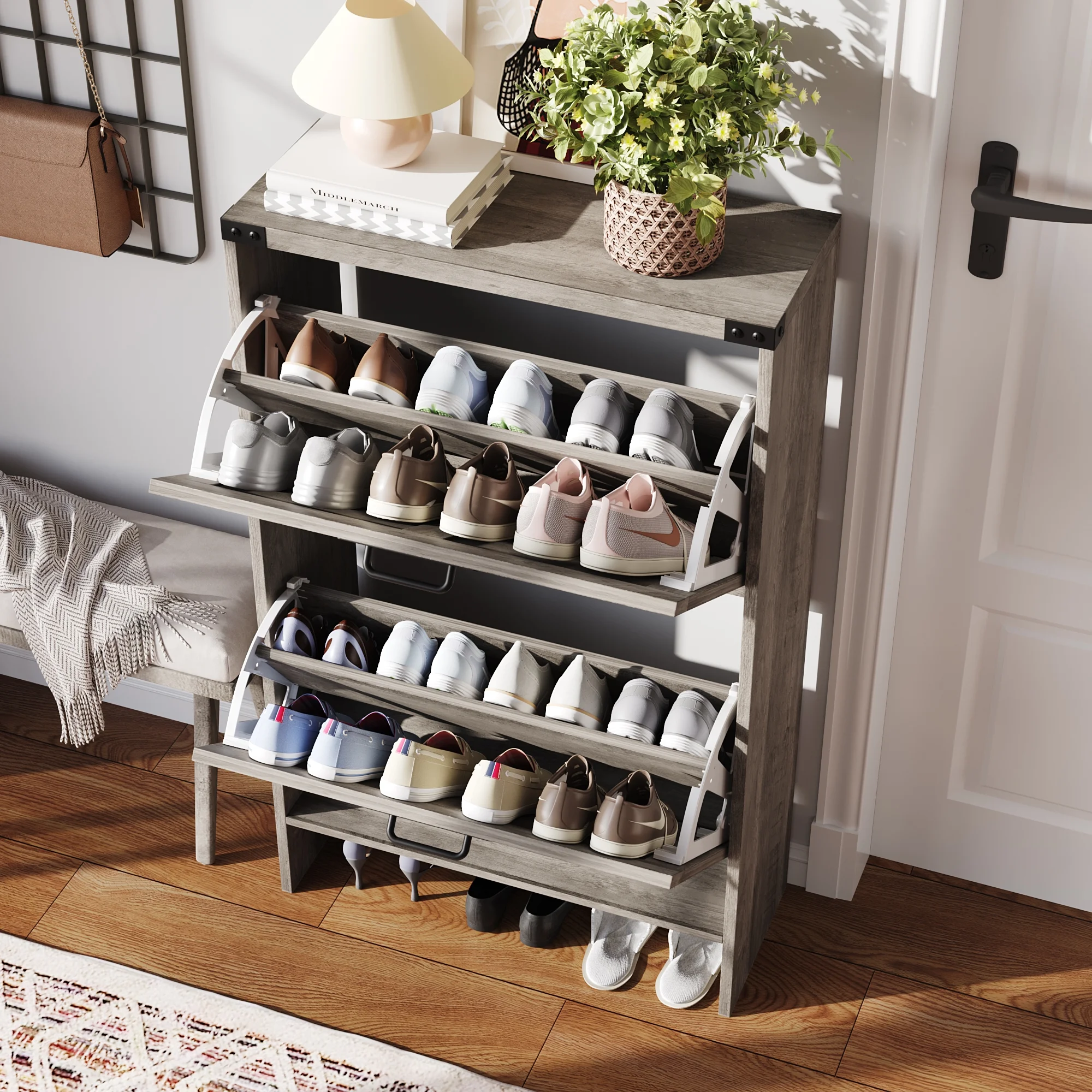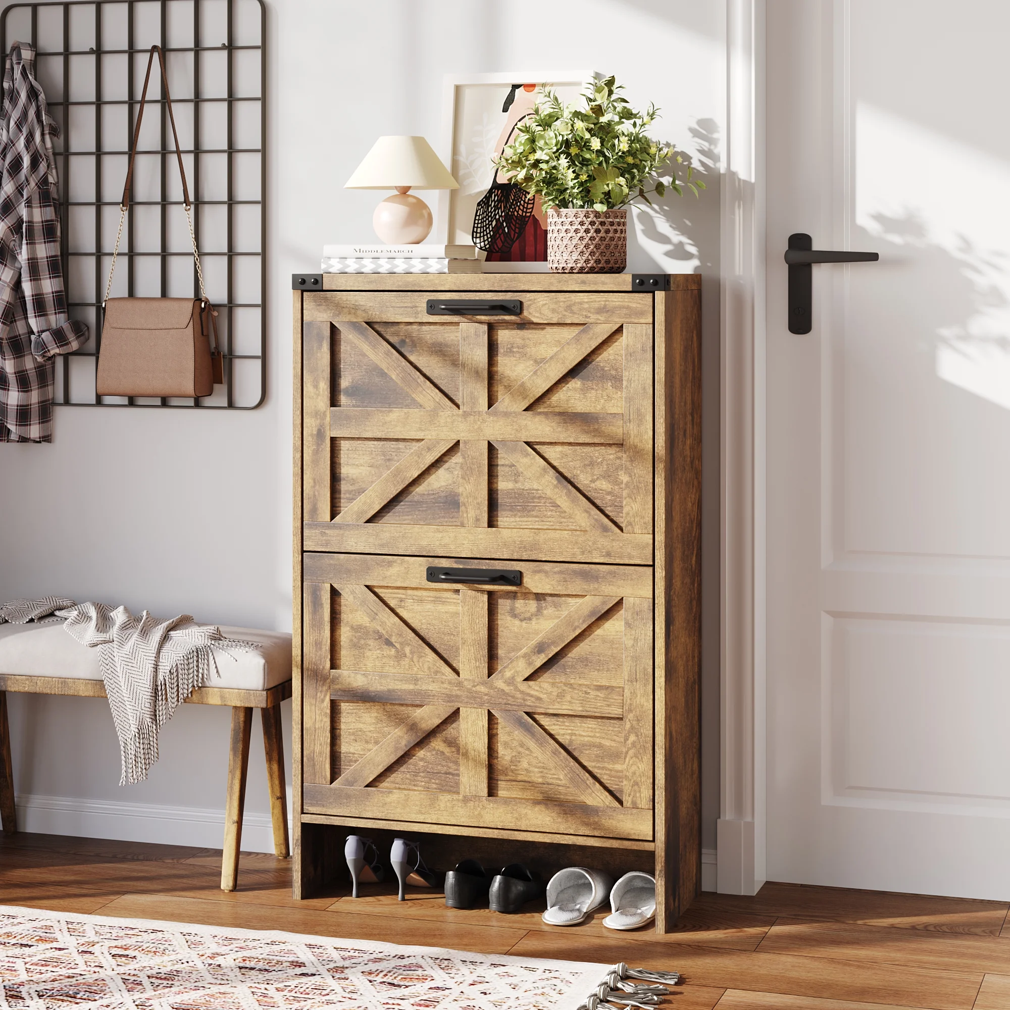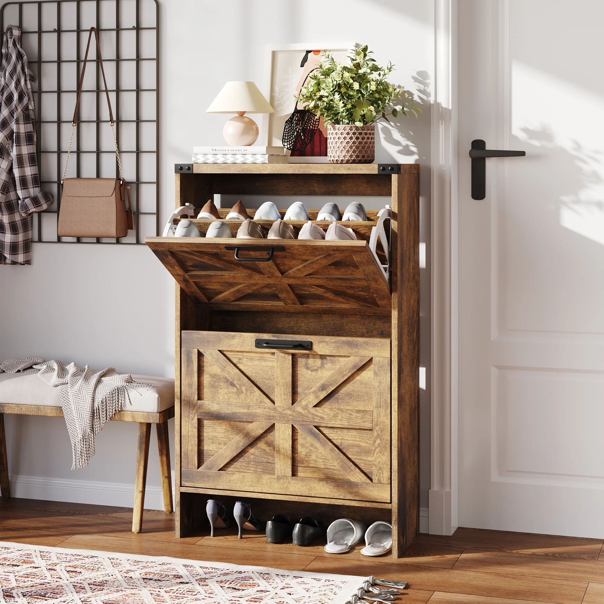 - ??��2 Flip Drawers��This slim shoe cabinet with 2 flip drawers and removable dividers offers efficient storage for shoes without taking up much space, with additional room for slippers at the base.