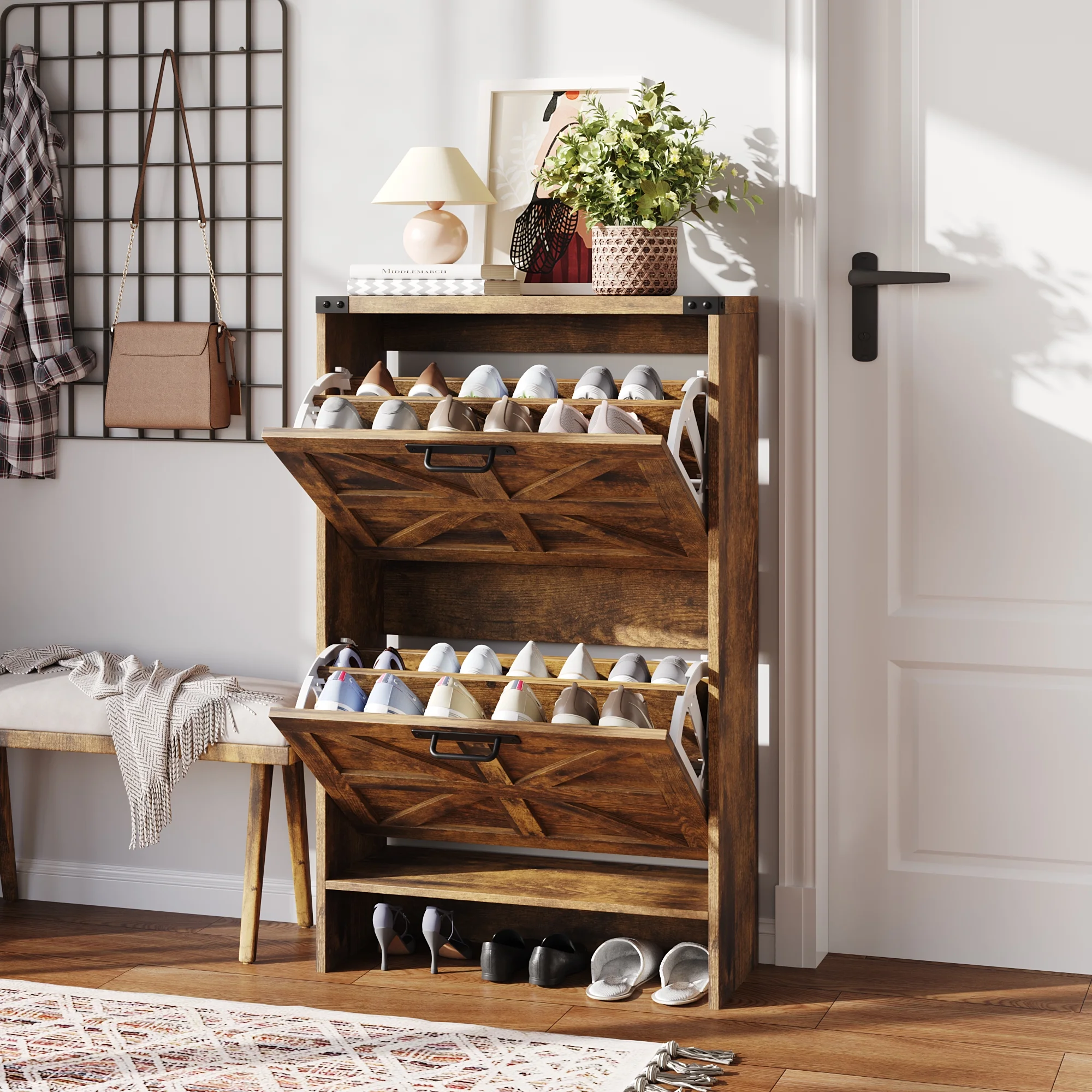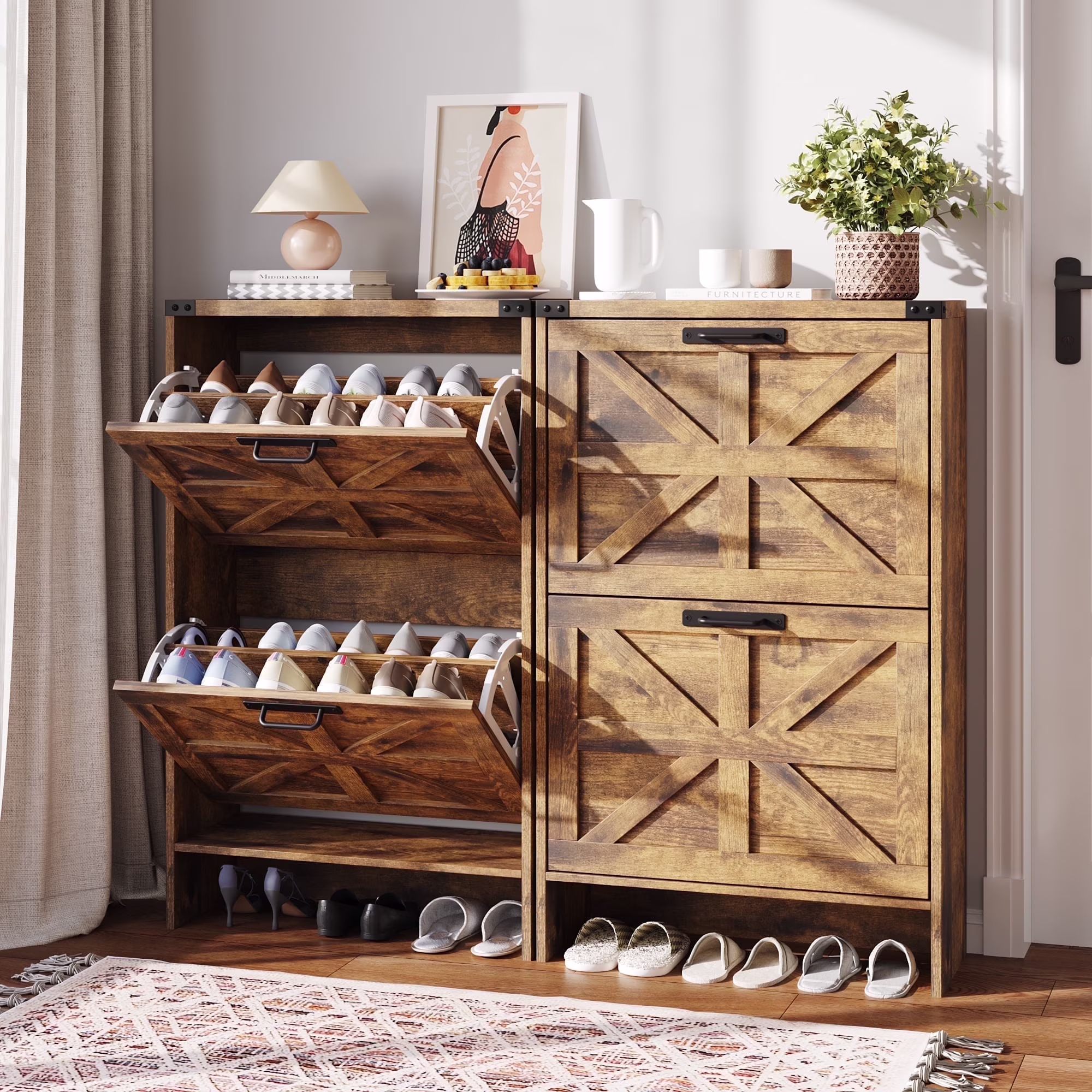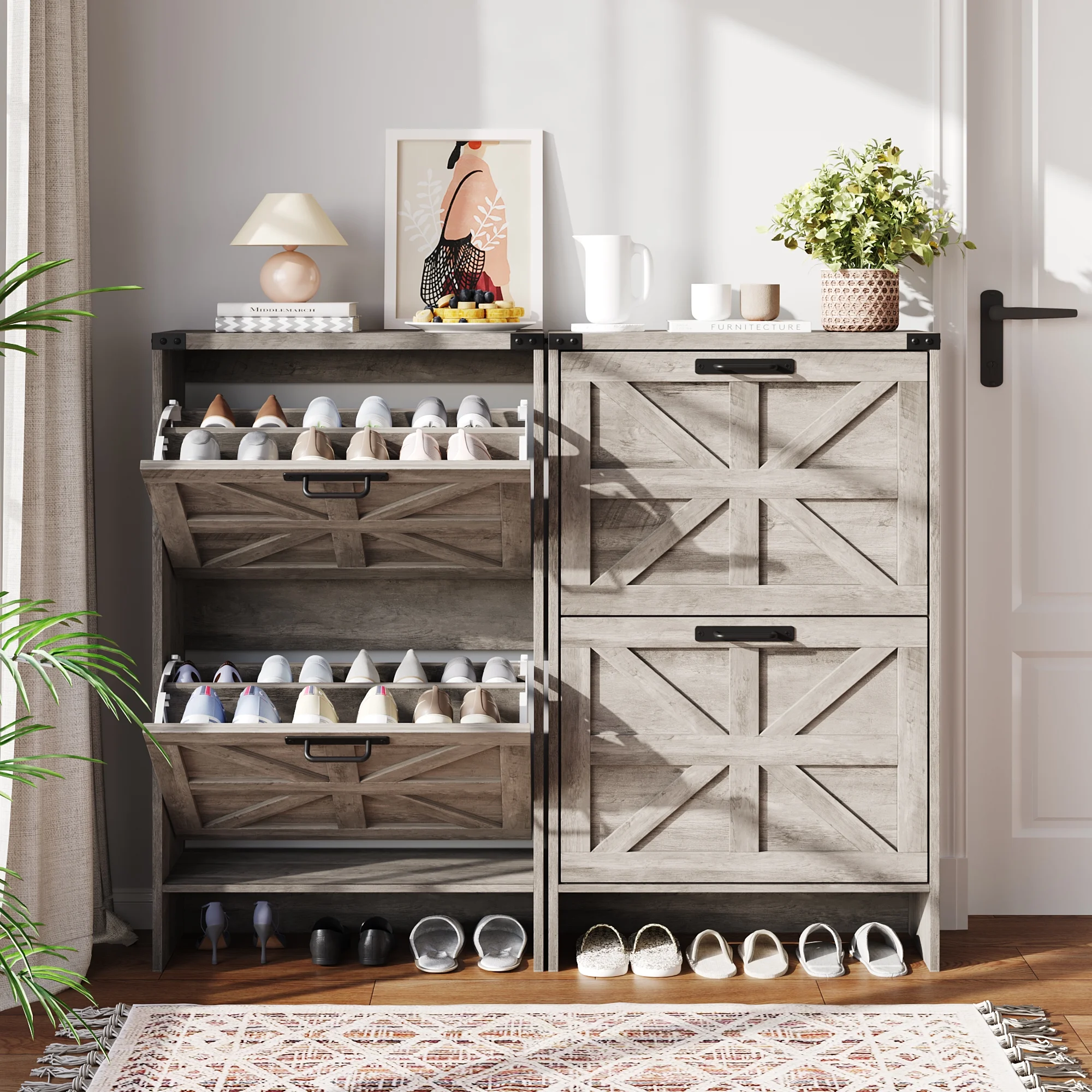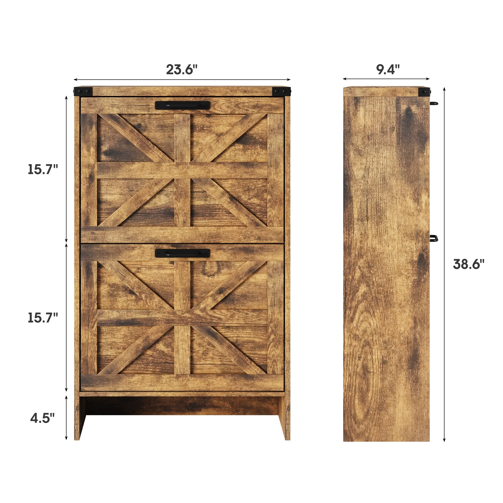 - ??��2 Flip Drawers��This slim shoe cabinet with 2 flip drawers and removable dividers offers efficient storage for shoes without taking up much space, with additional room for slippers at the base.