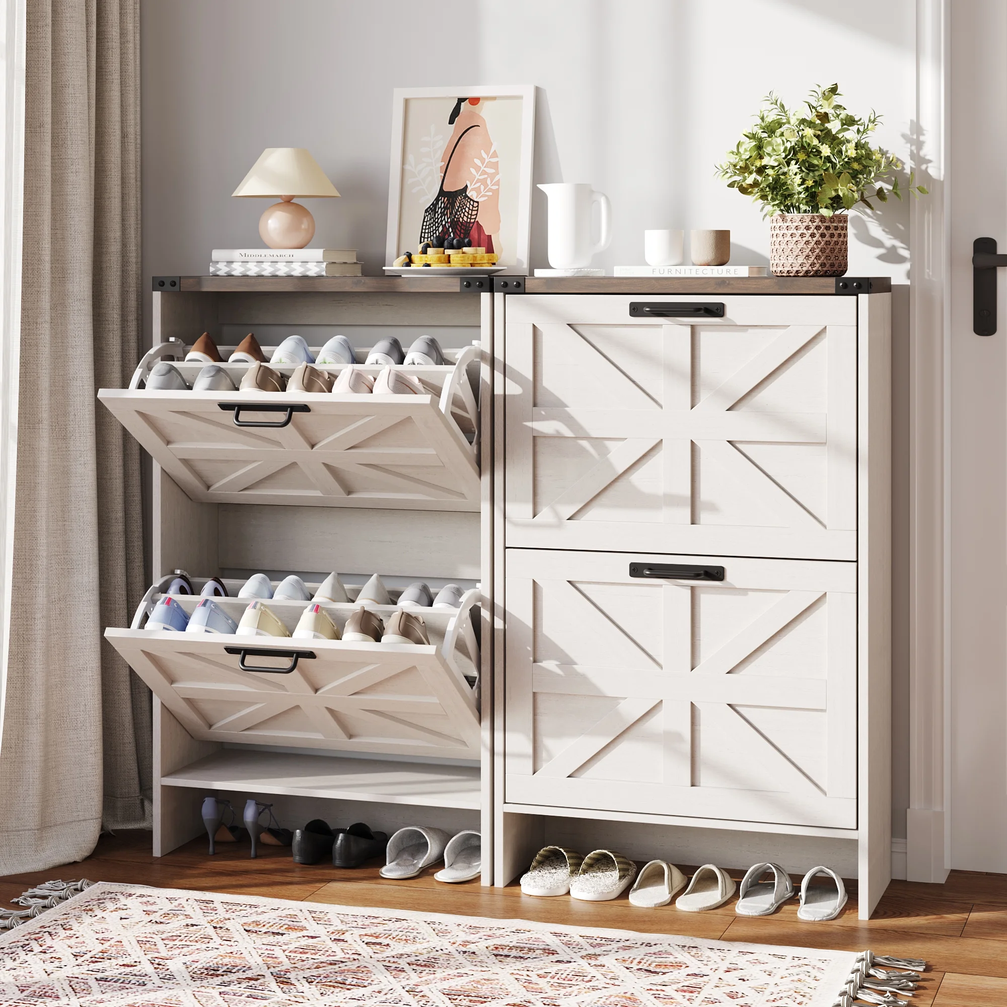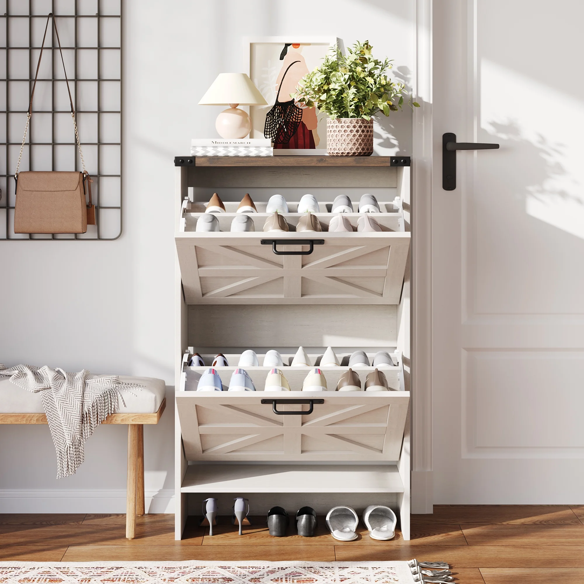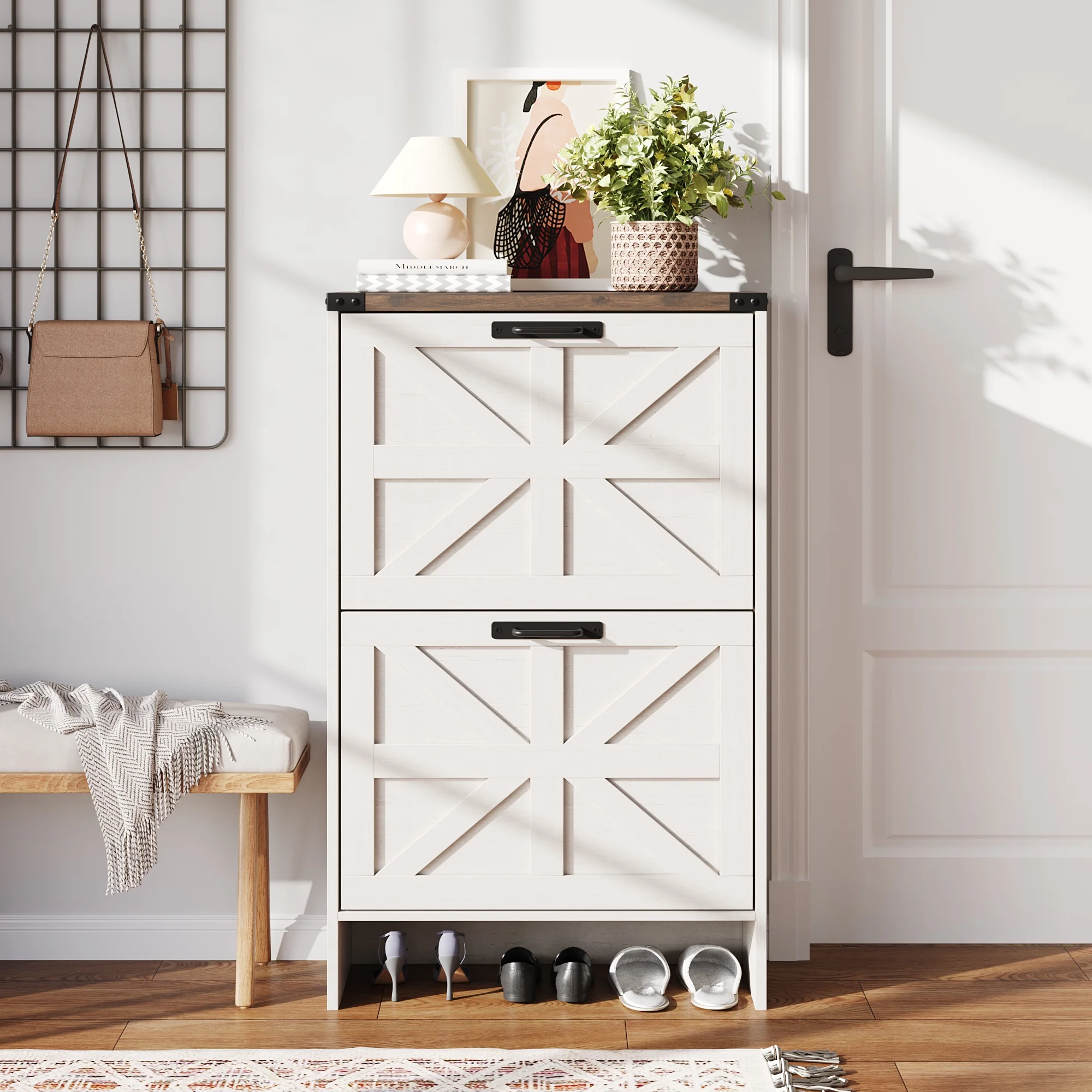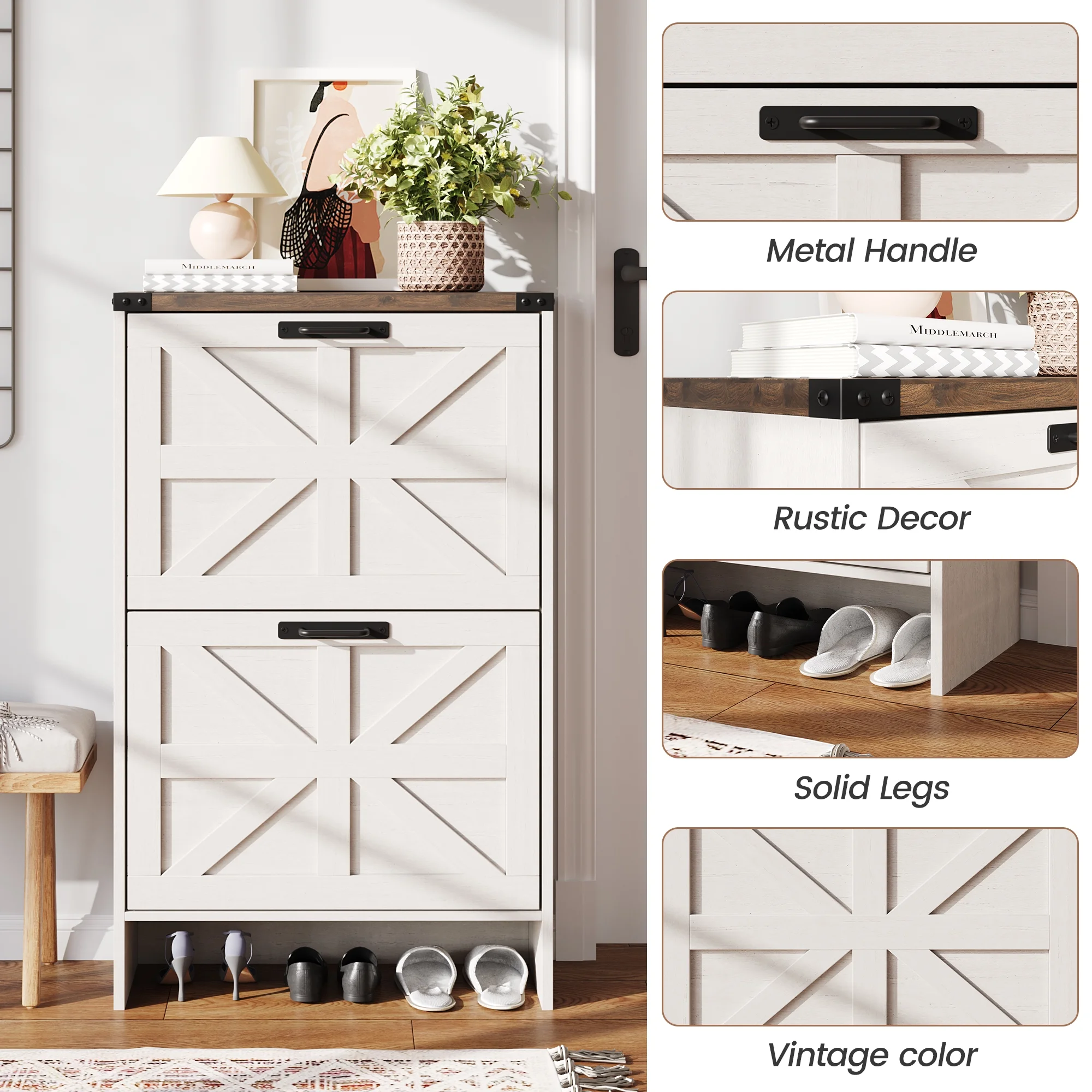 - ??��Farmhouse Design storage Cabinet��This white shoe cabinet features a rustic design with iron corner decorations and a smooth metal handle, complementing any decor style and perfect for placement in doorways, hallways, bedrooms, or living rooms.