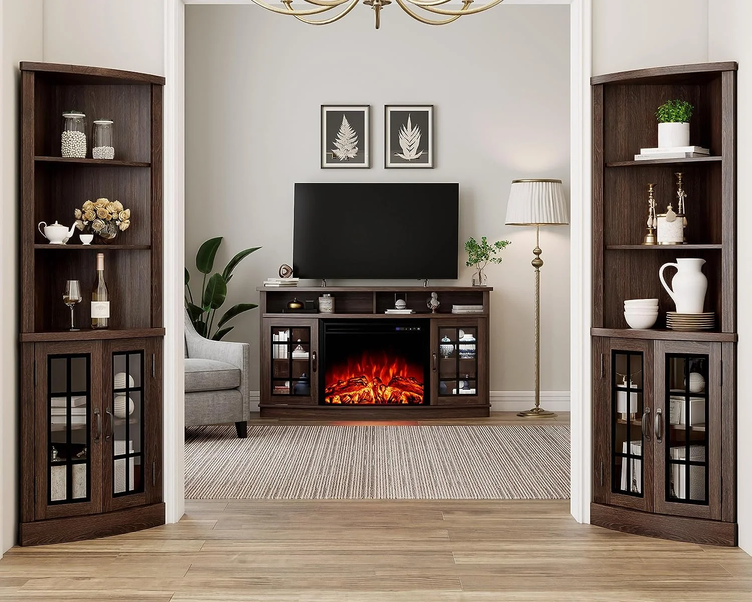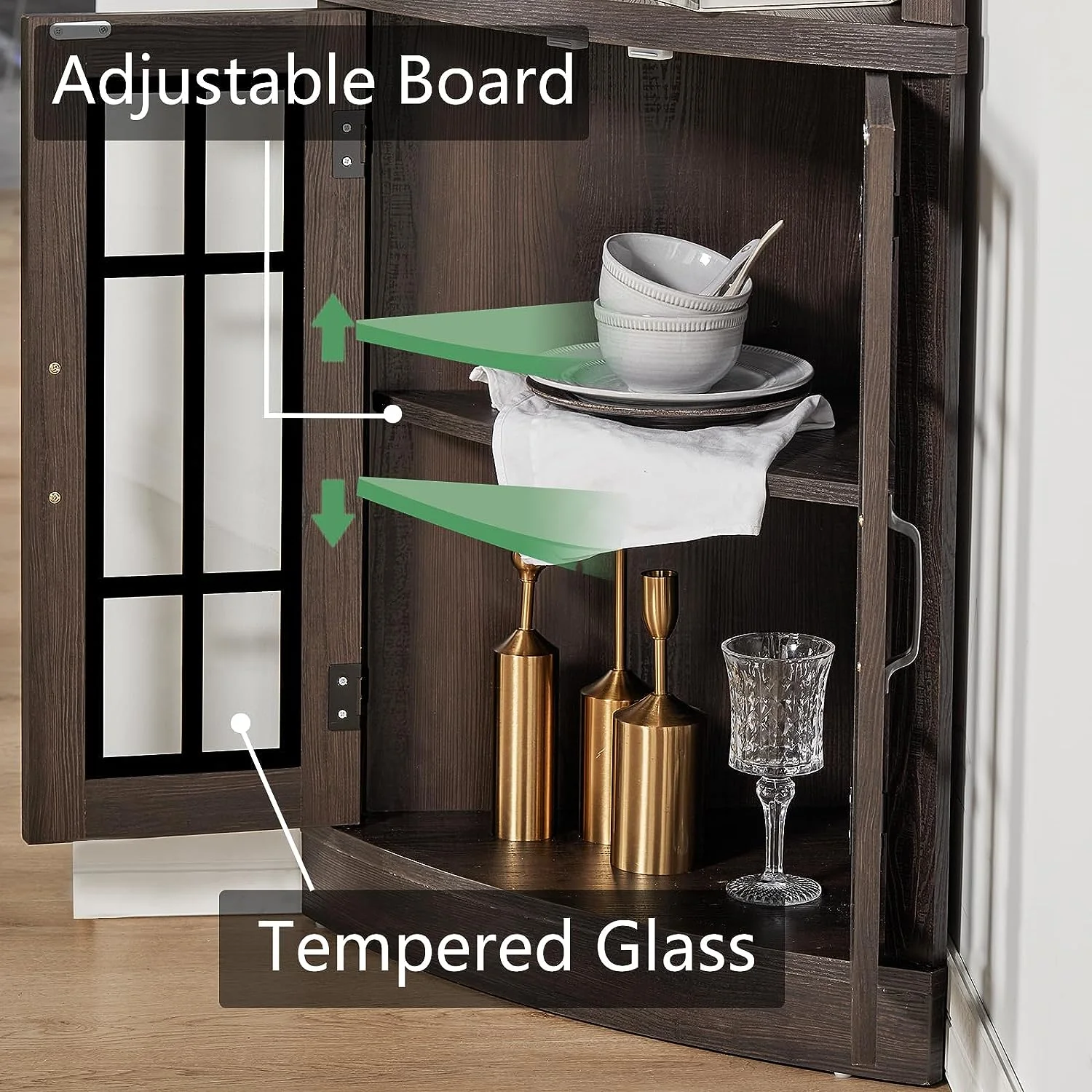- Farmhouse Rustic Style: Elegant curved appearance, antiqued glass cabinets, and clean lines show the unique romantic of rustic furniture. Besides, the adjustable board hidden inside the glass cabinet adds a sense of mystery