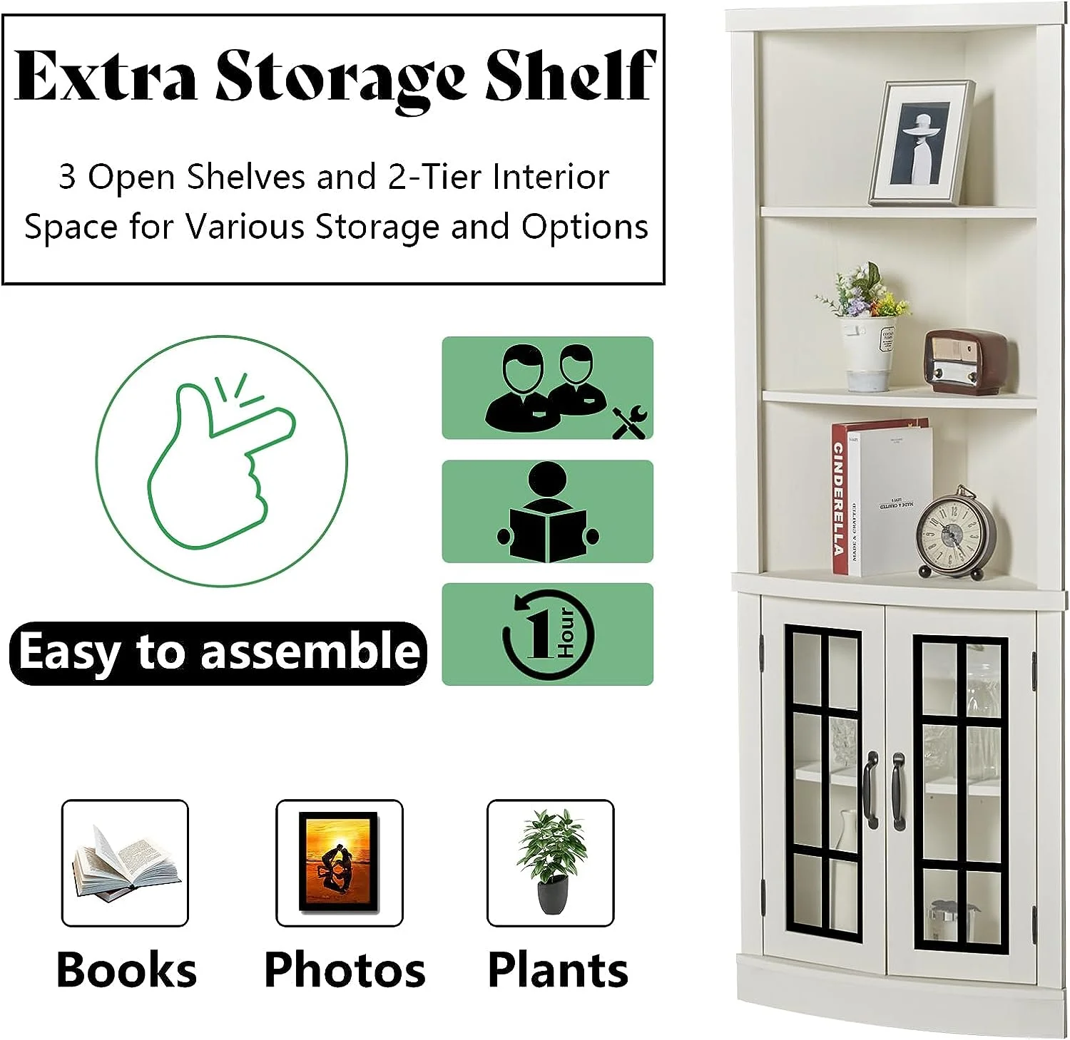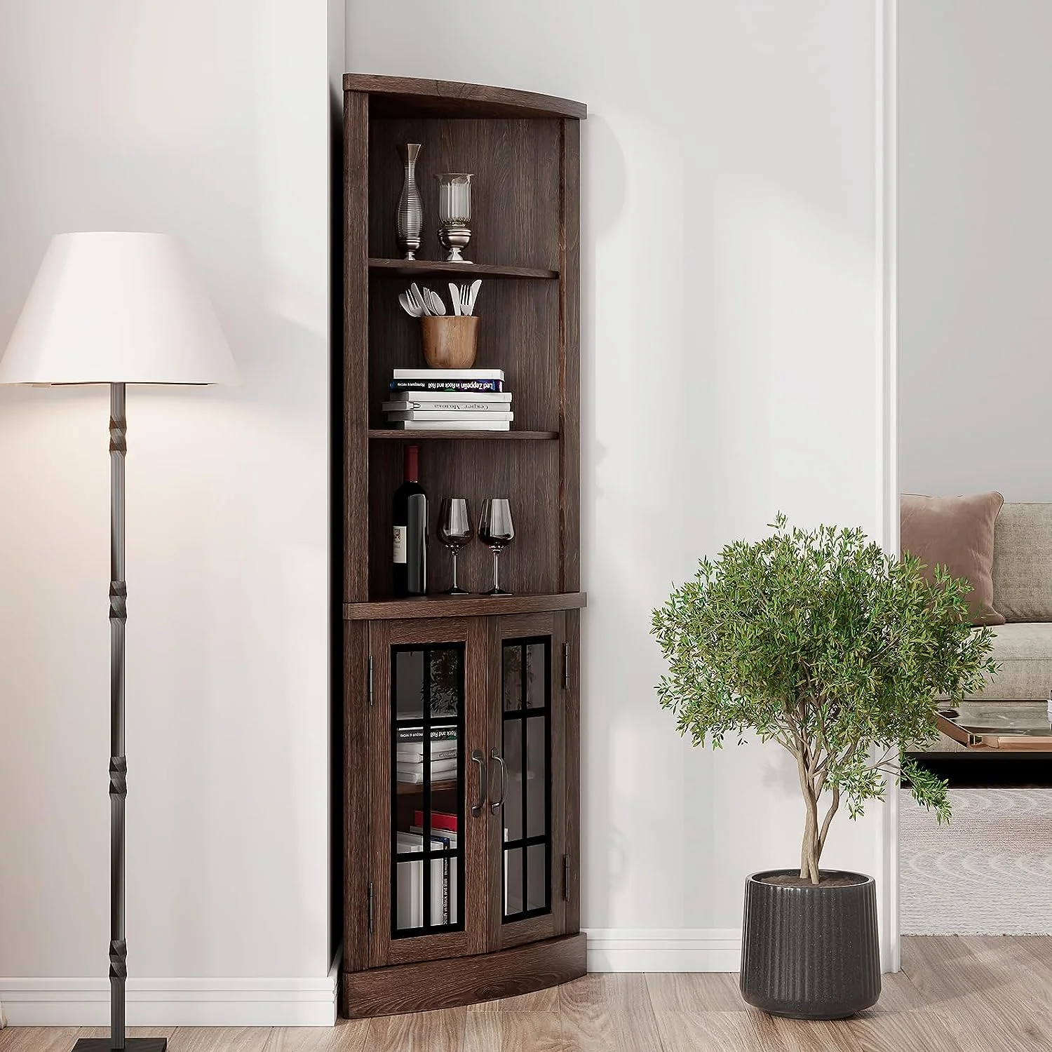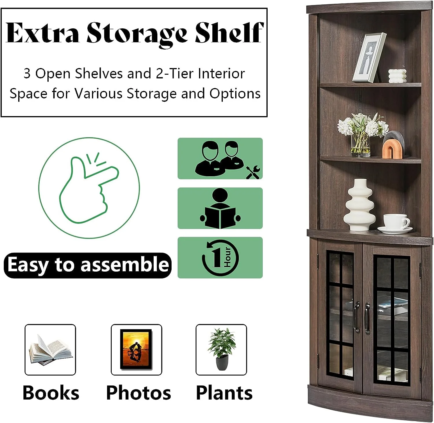 - Enlarging Space: Curved corner bookcase maximizes expanded storage space. 5-tier shelves cabinet plenty for storing more books, plants, and delicate decorations displayed inside the below glass doors