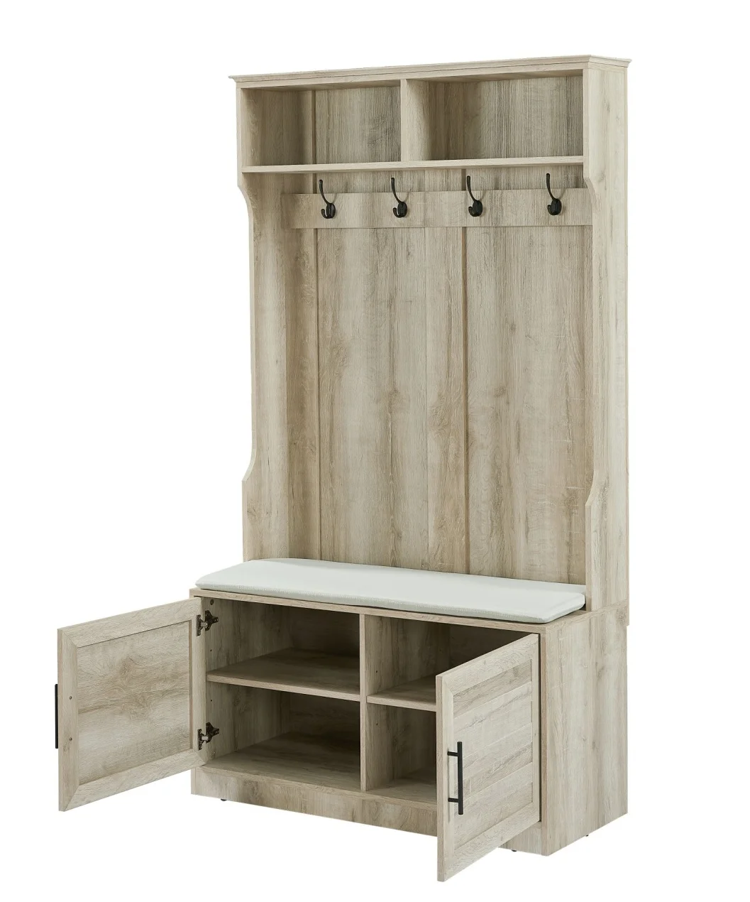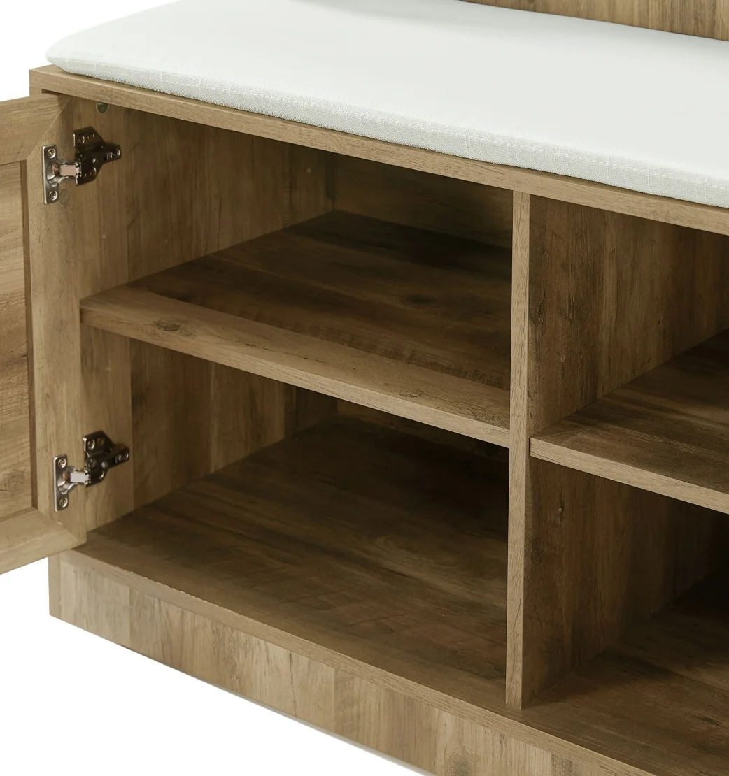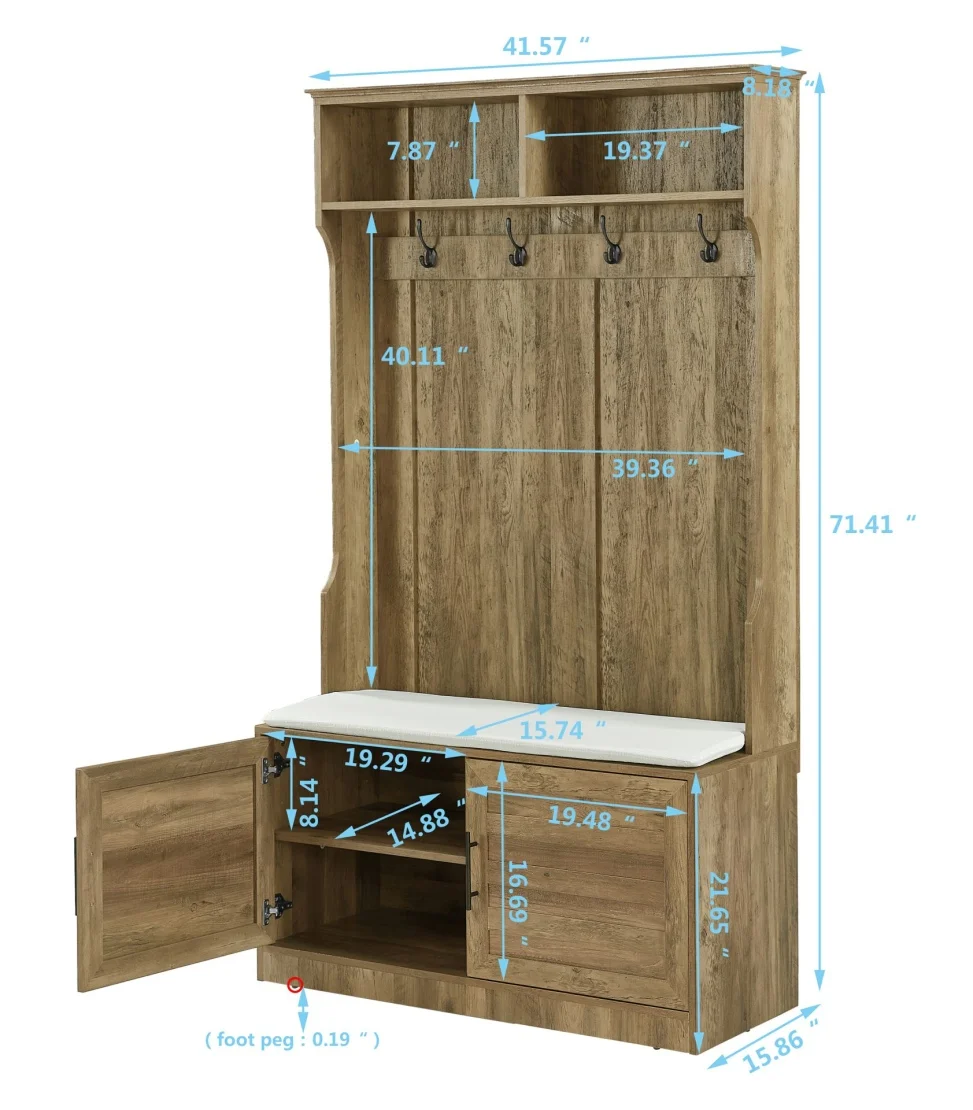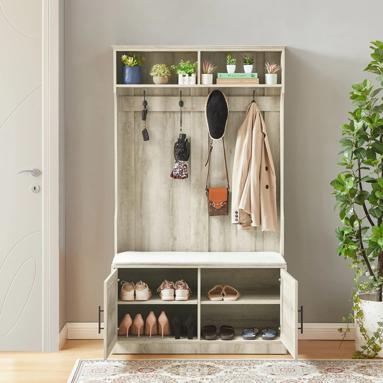 - [Versatile Storage Options]: The storage bench comes with a comfortable sponge pad, allowing you to sit down and put on or take off your shoes with ease. The 2-door cabinet provides hidden storage for items you want to keep out of sight, while the coat rack with 4 dual hooks offers a convenient place to hang coats, hats, scarves, and more.